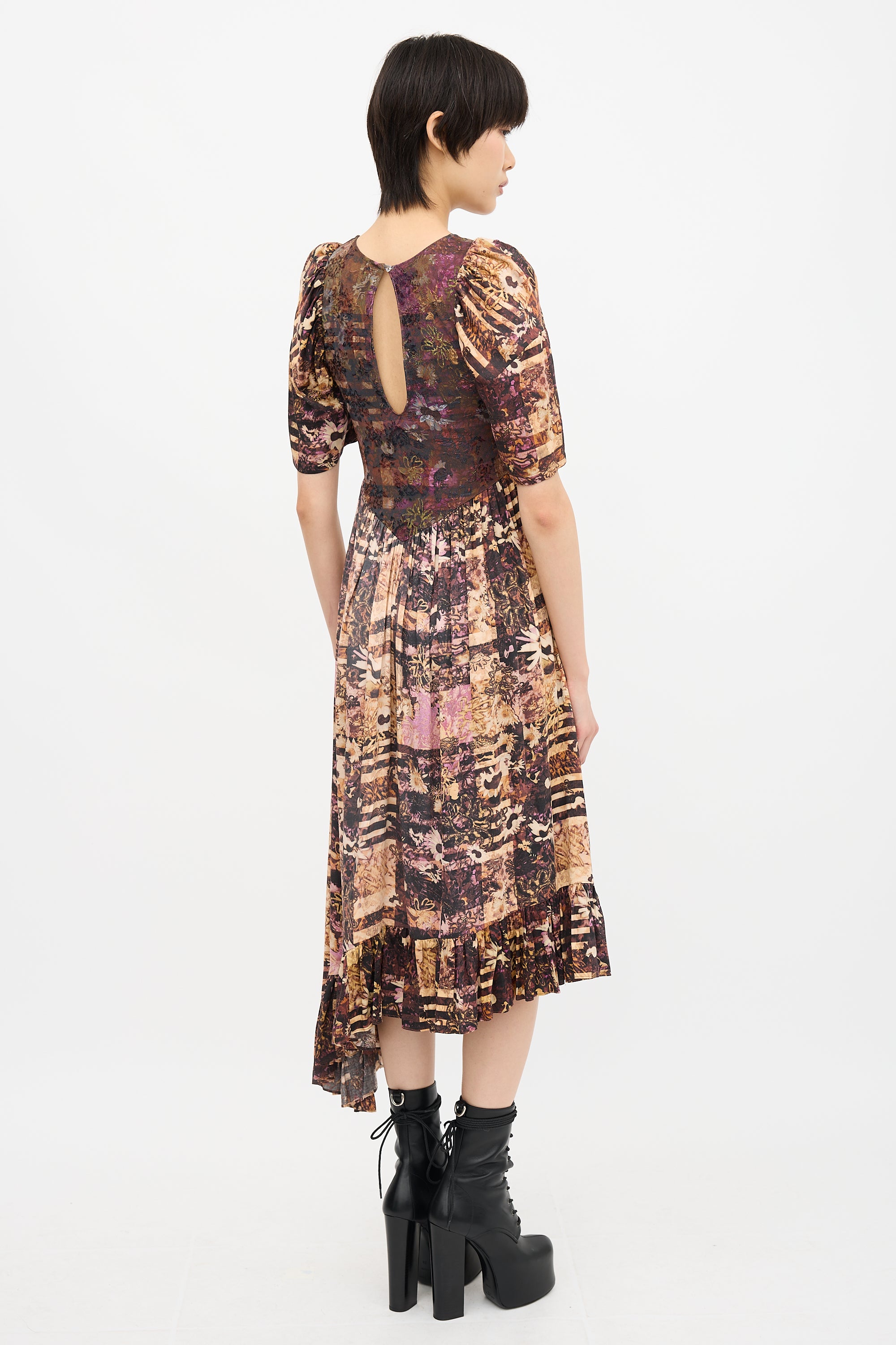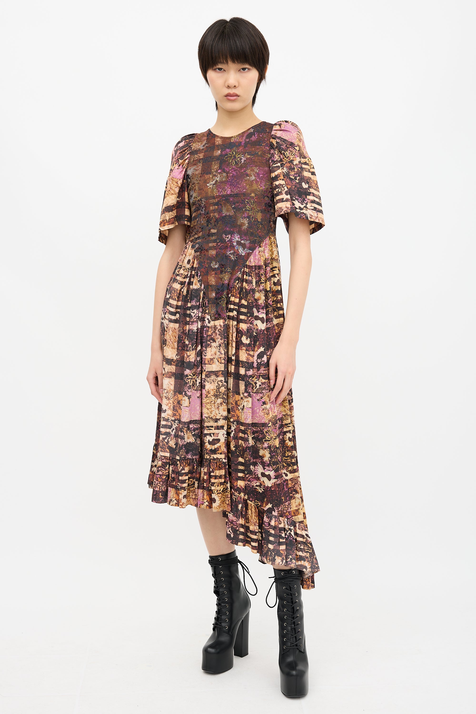 Pre-owned Collina Strada purple, brown, and multicolour Pollinate midi dress featuring floral and check print, round neckline, back keyhole with button closure, gathered waist, asymmetric ruffle hem, and puff sleeves. Lined bodice.