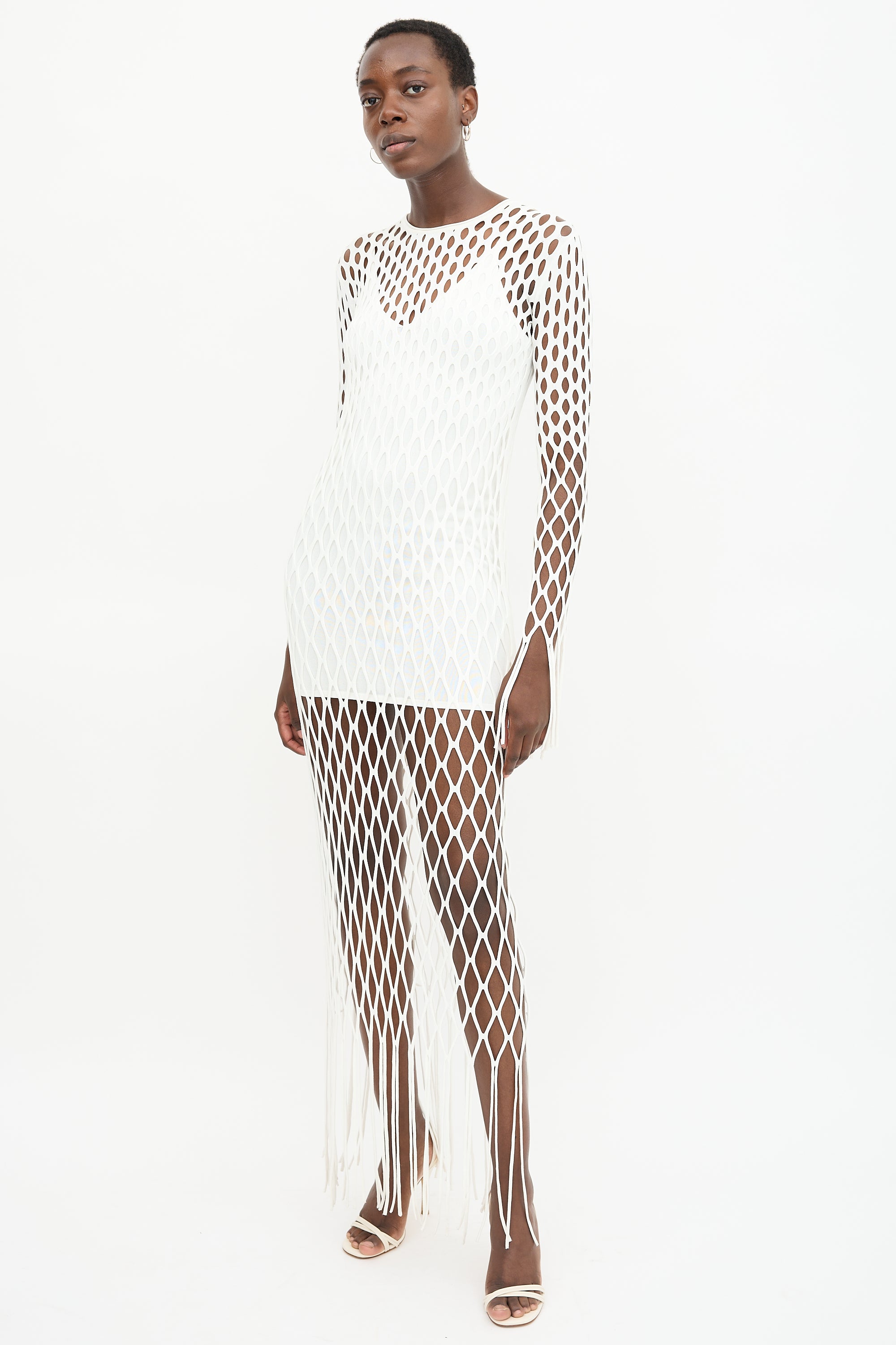 Pre-owned Dion Lee white knit mesh dress featuring round neckline and fringe trim. Comes with slip.