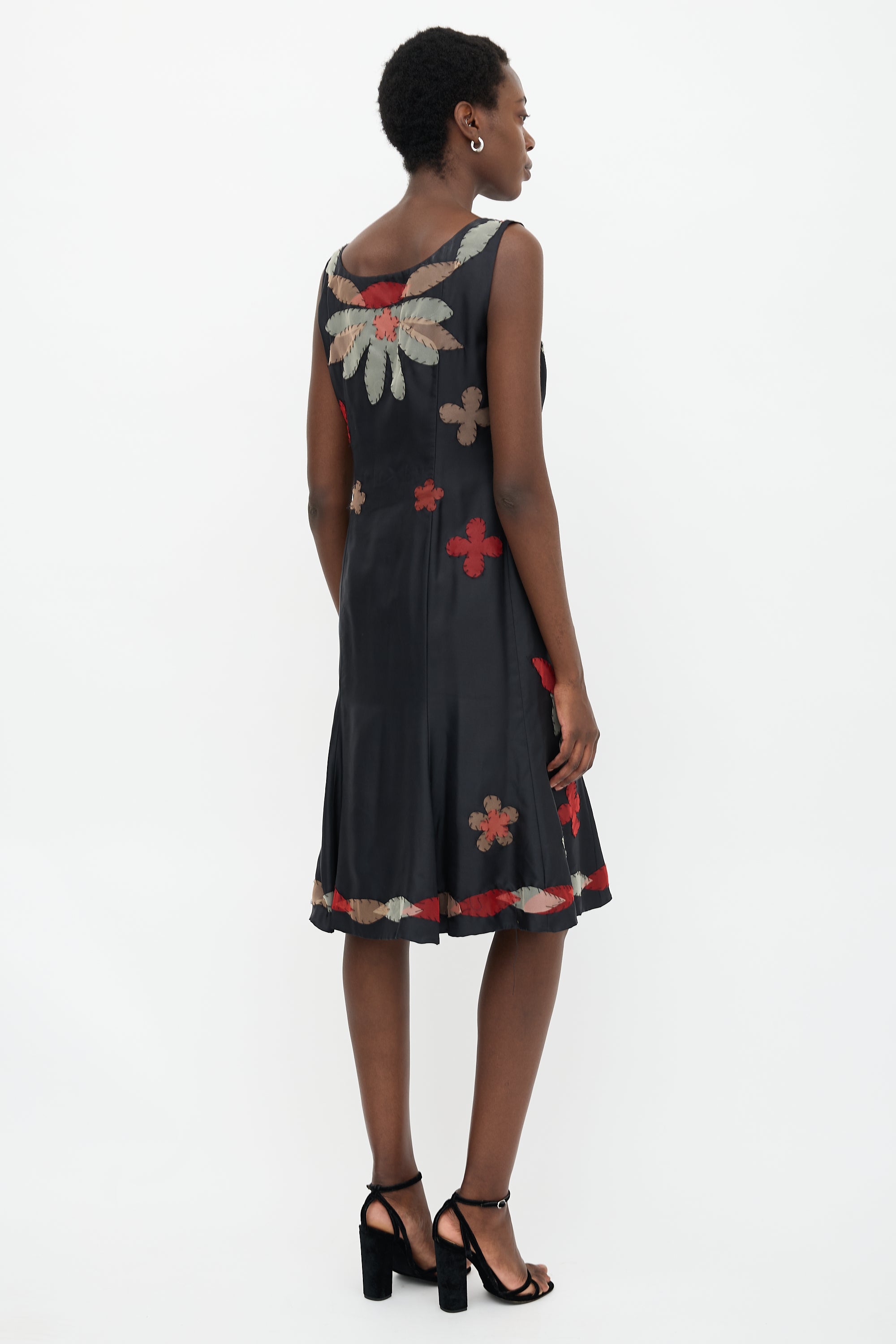 Pre-owned Moschino black silk midi dress featuring multicolour sheer floral appliques throughout, bateau neckline, and concealed side zip. Lined.