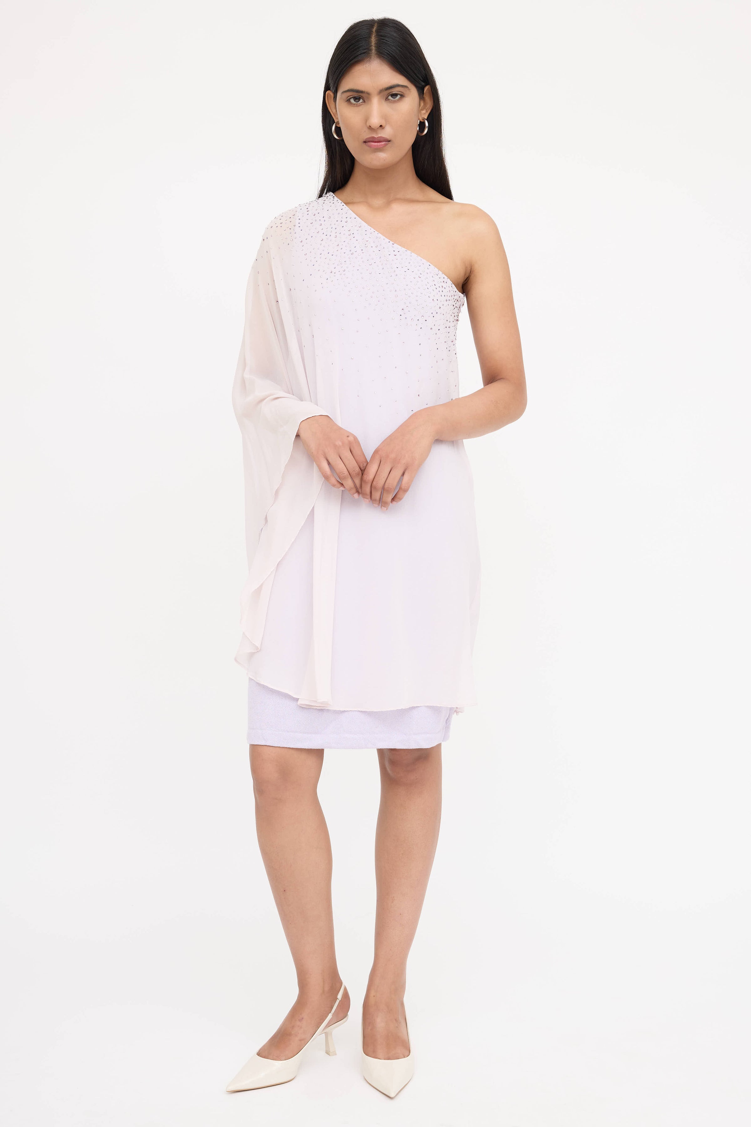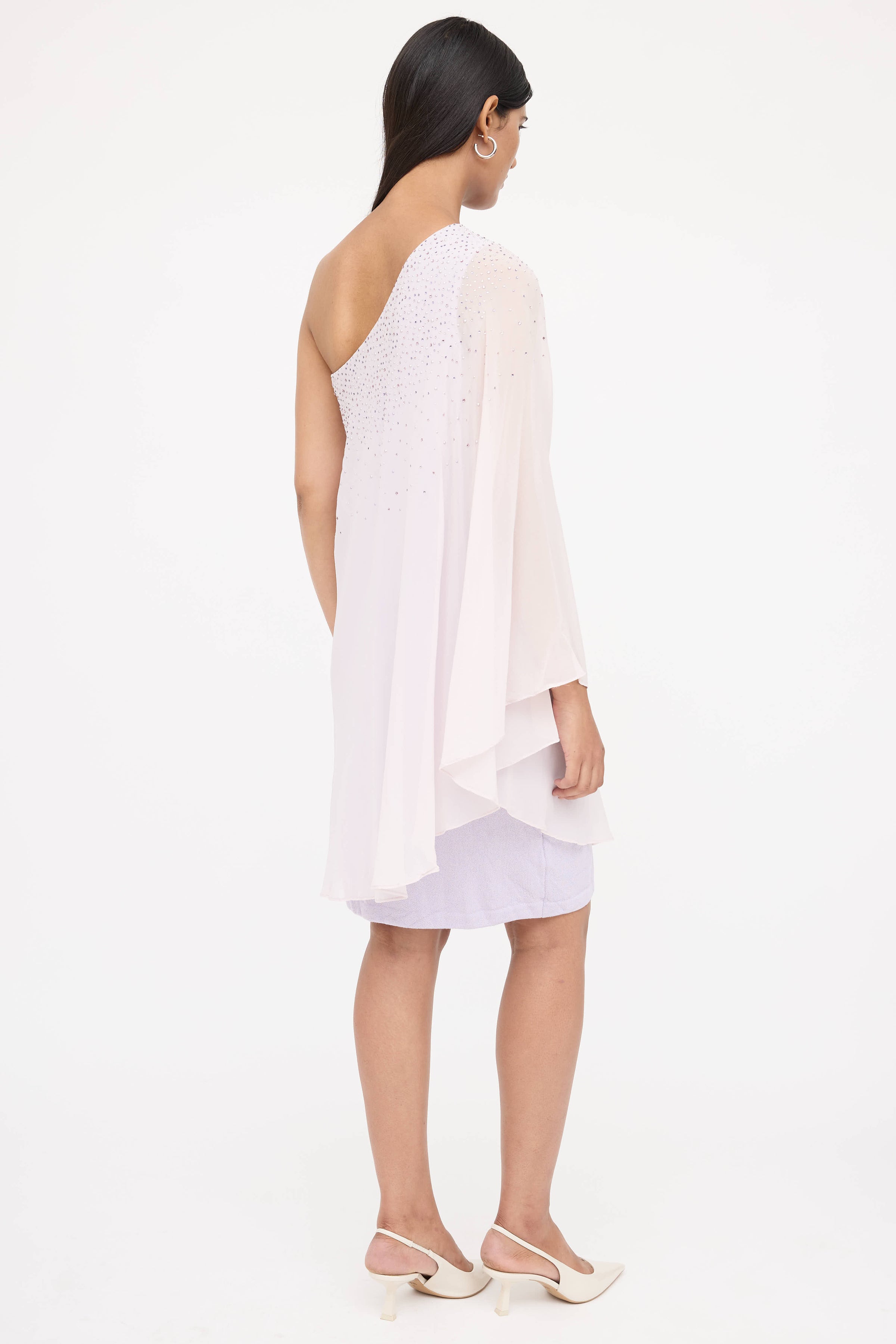 Pre-owned St. John purple dress featuring one shoulder styling, batwing sleeve, concealed zip at side, and rhinestone embellished bodice. Lined.
