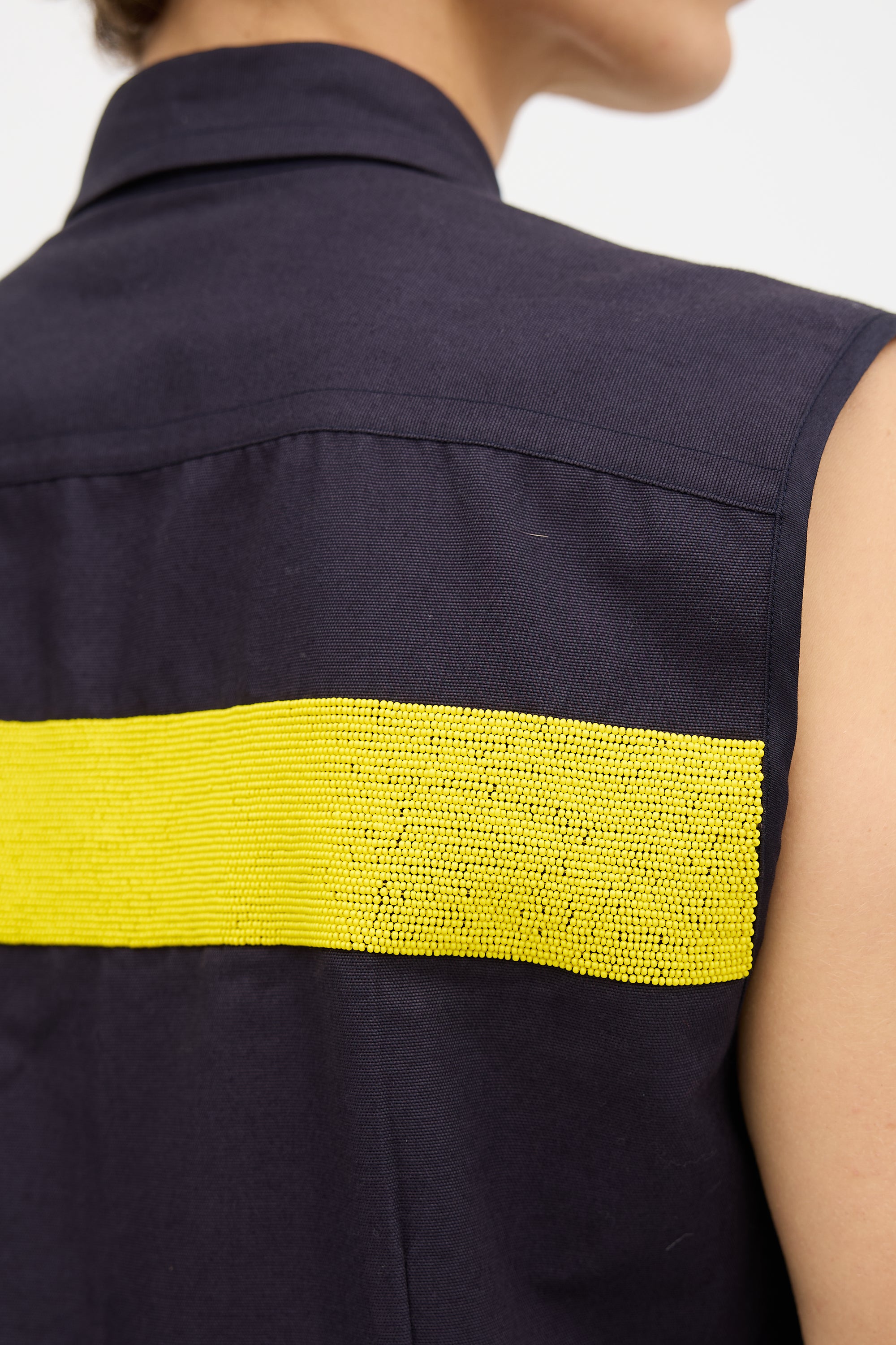 Pre-owned Dries Van Noten navy sleeveless shirt featuring point collar, button up front, yellow beaded yoke detail, and two front flap pockets.