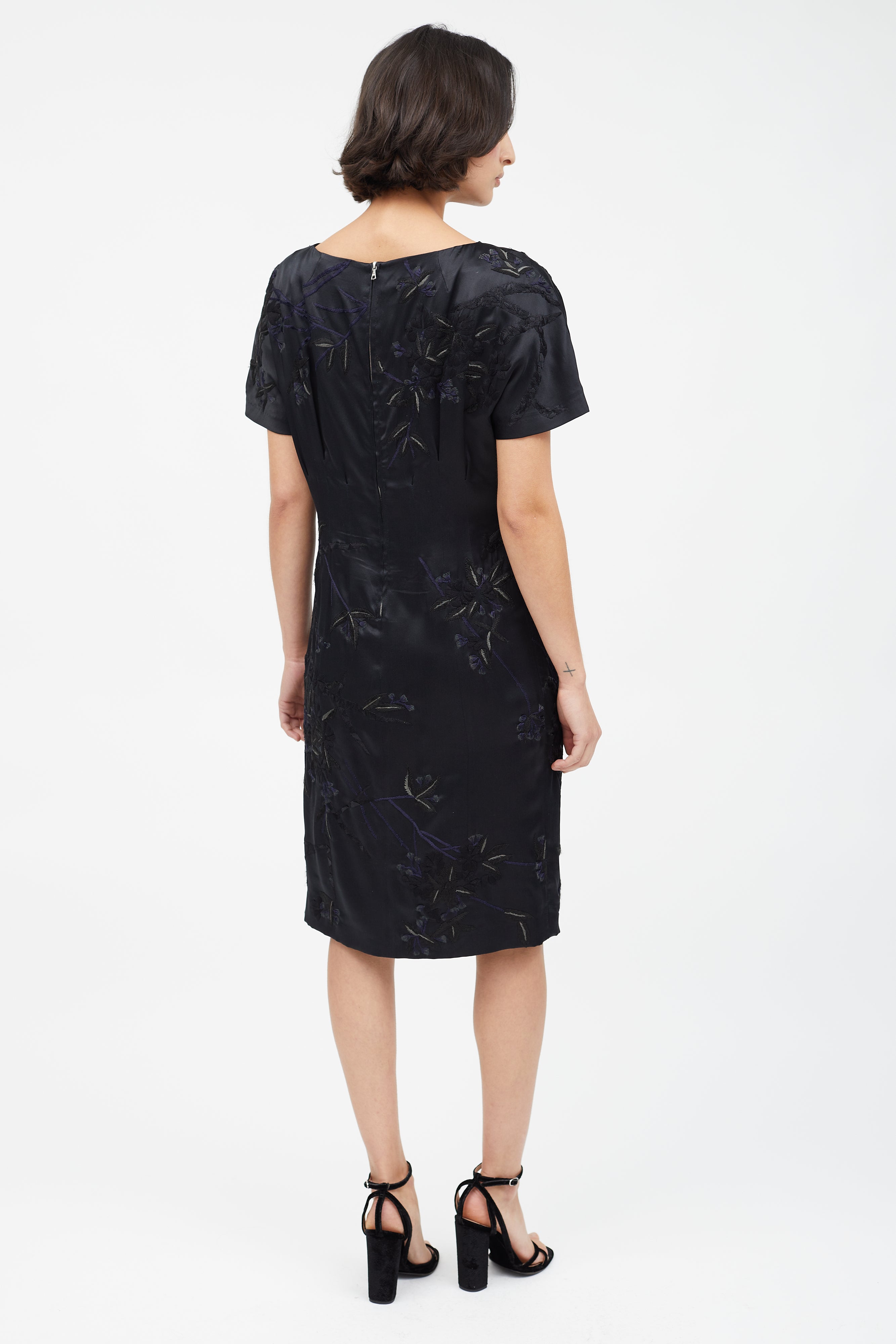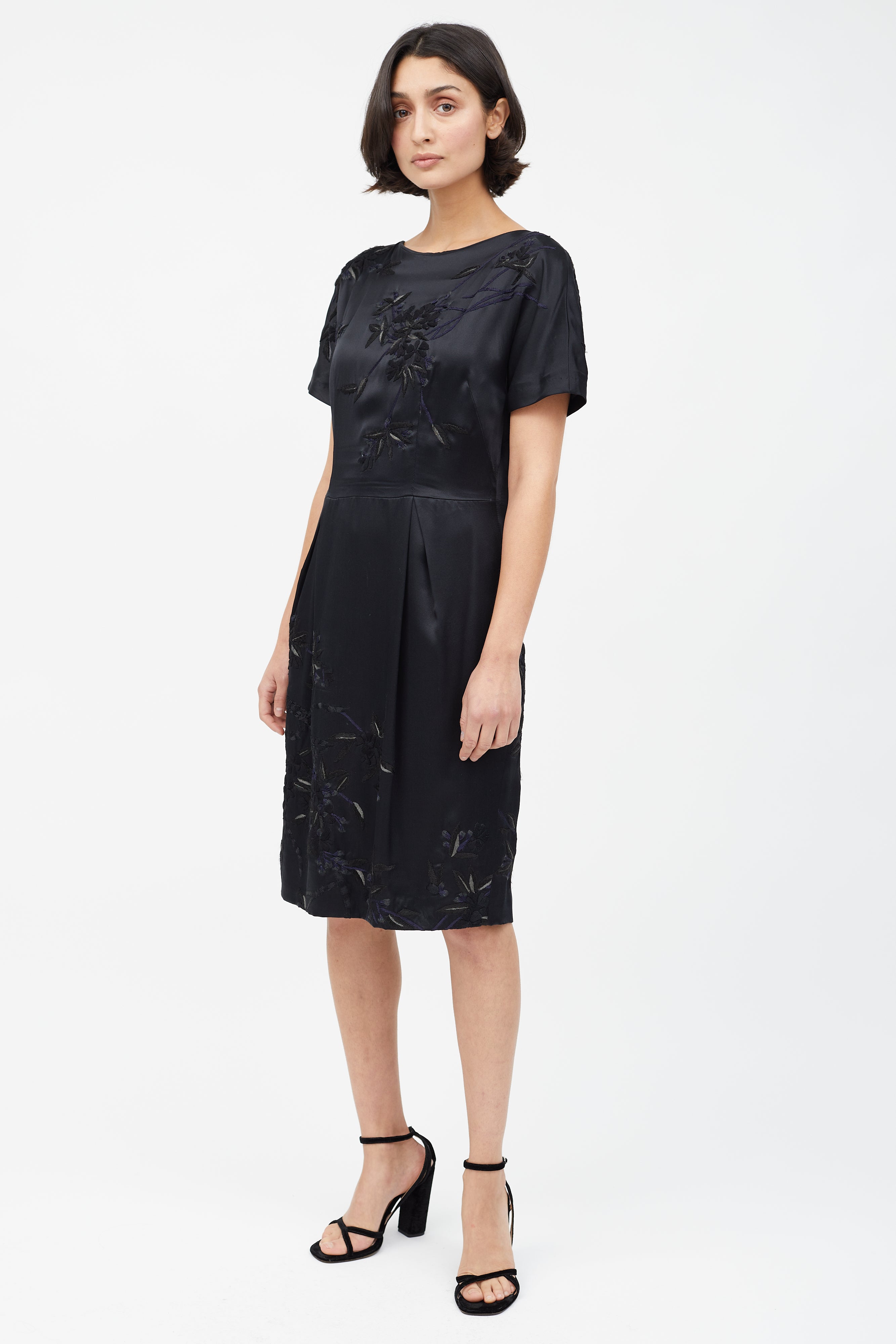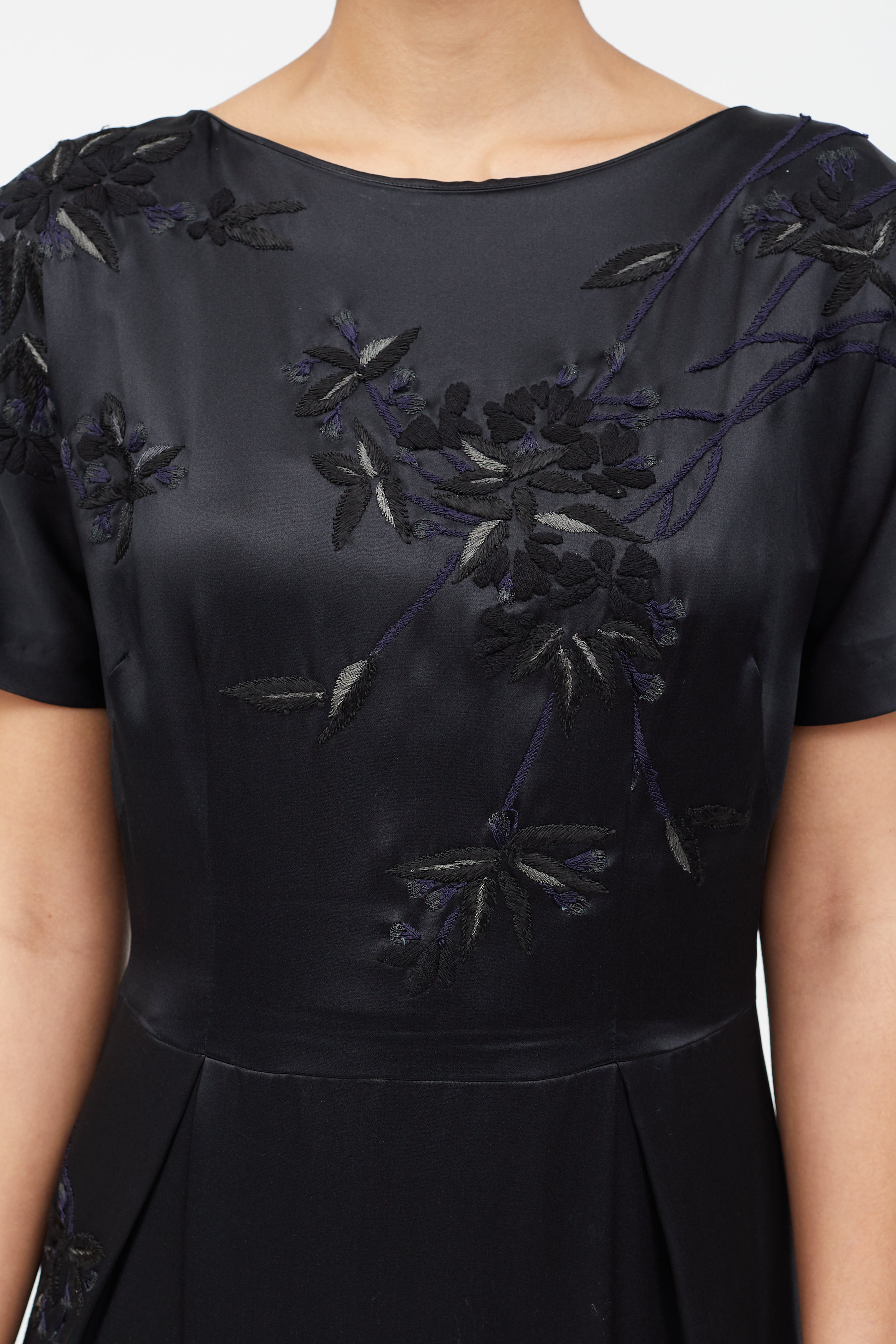 Pre-owned Dries Van Noten black dress featuring round neckline, short sleeves, drop shoulder, concealed zip closure at back, and black and navy floral embroidery throughout. Lined.