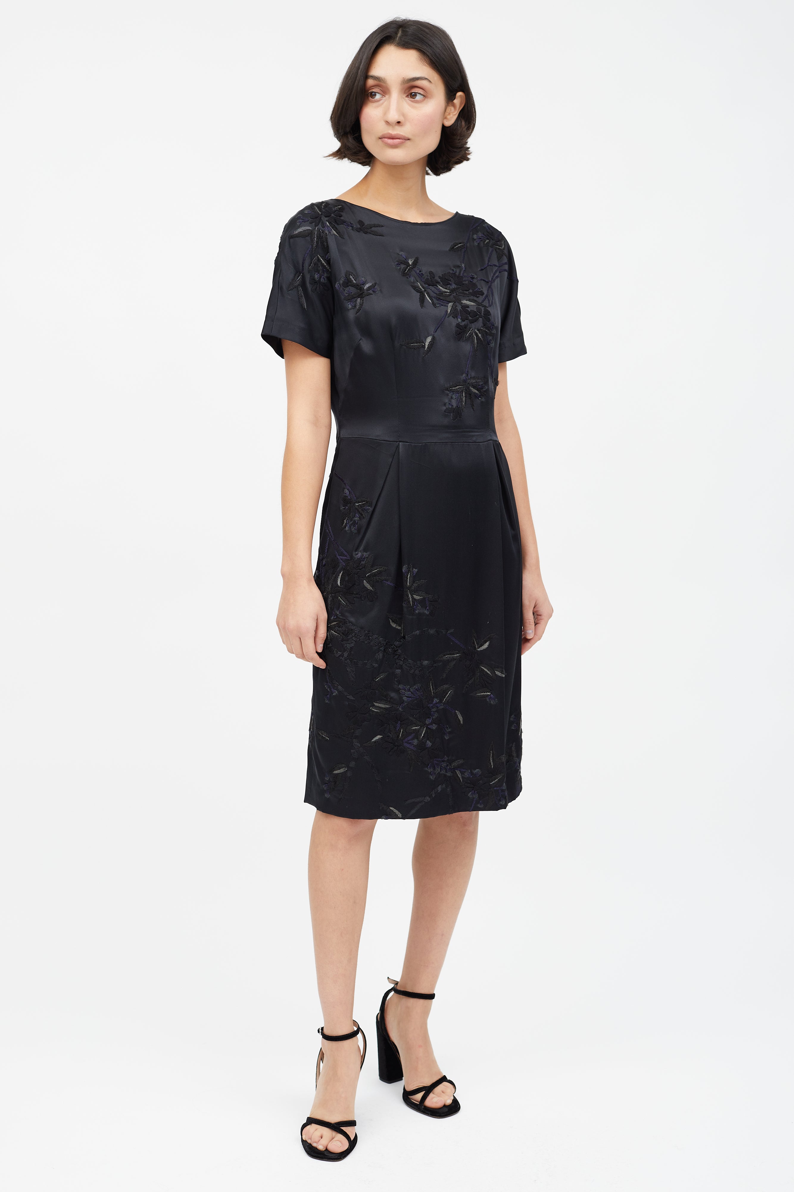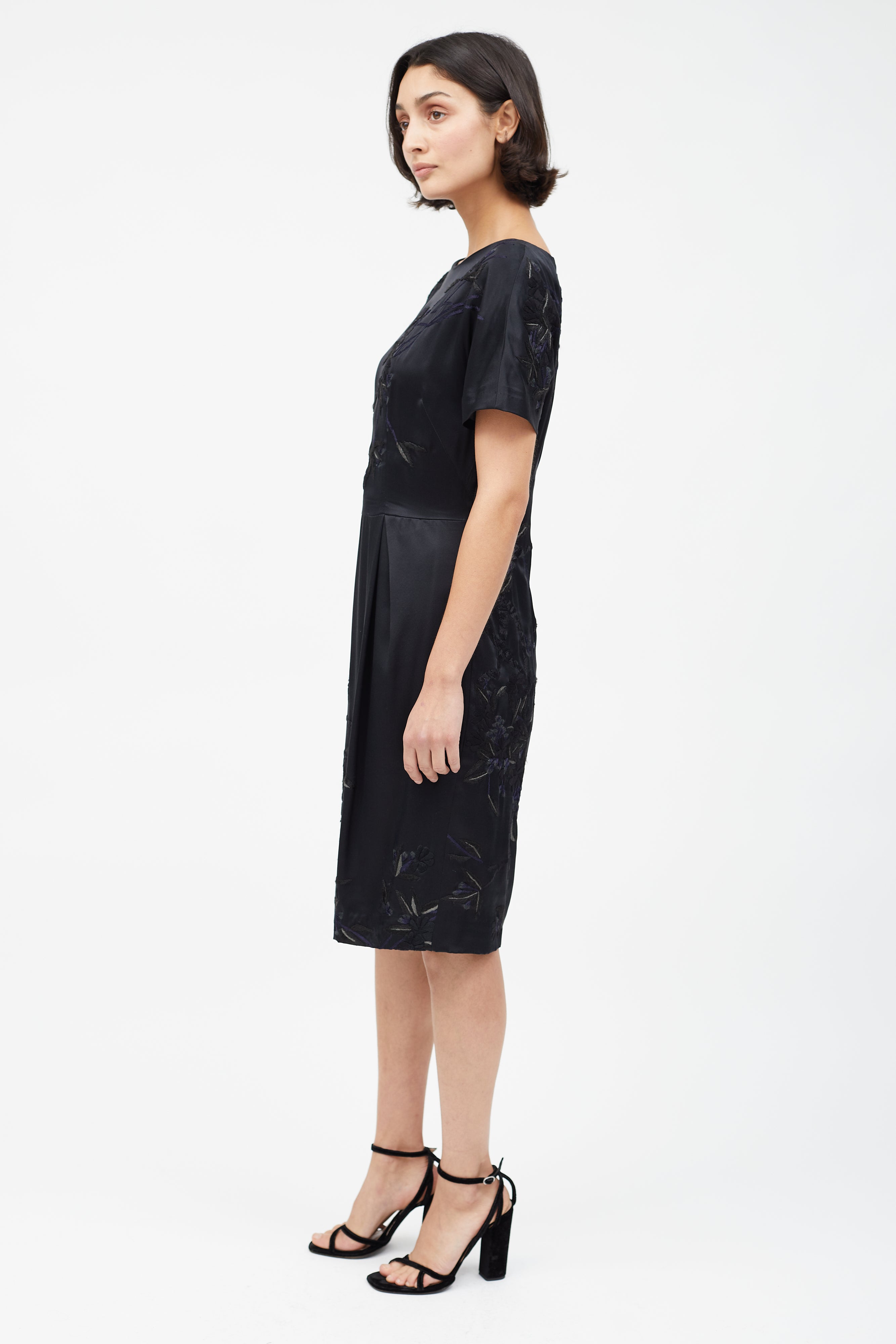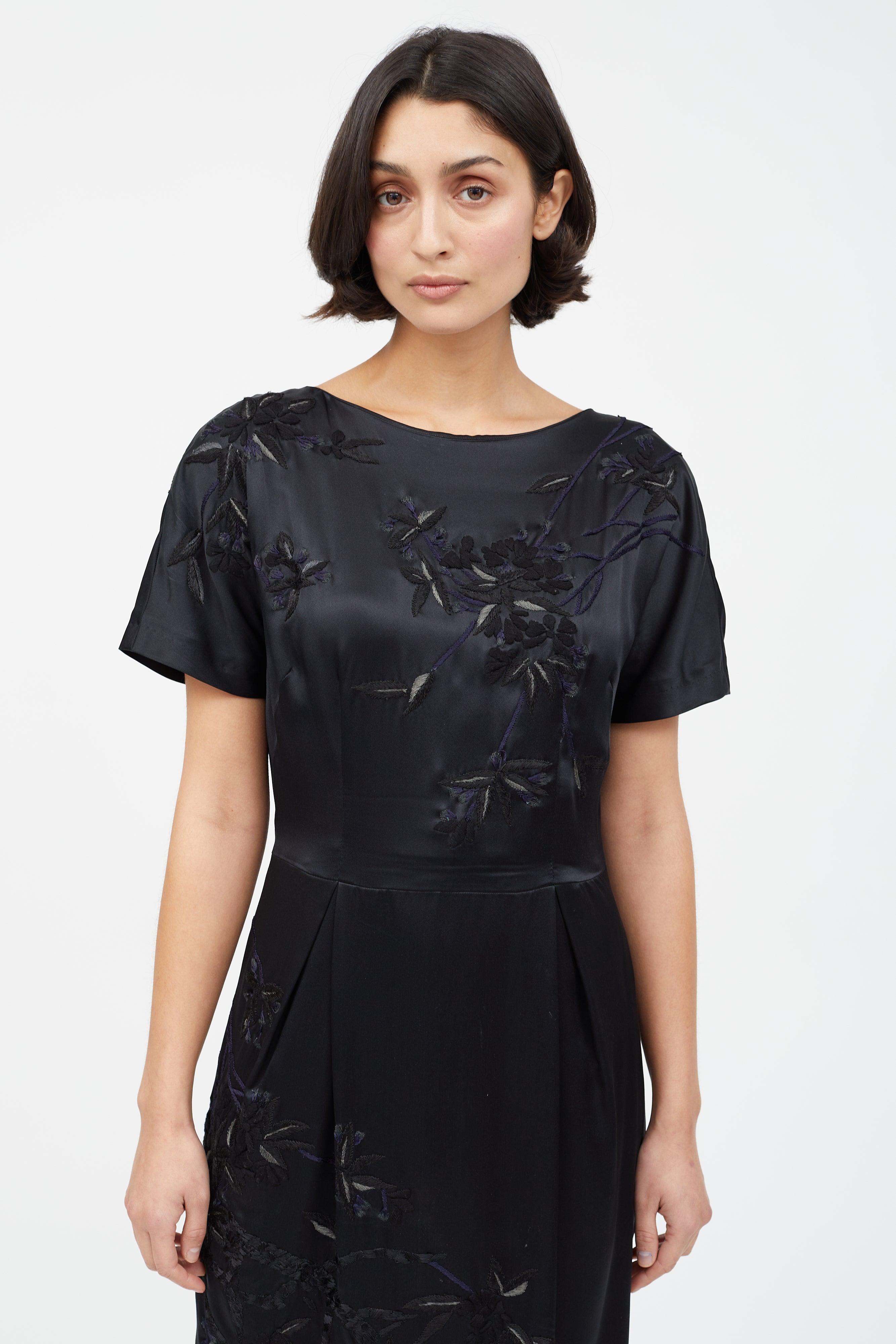 Pre-owned Dries Van Noten black dress featuring round neckline, short sleeves, drop shoulder, concealed zip closure at back, and black and navy floral embroidery throughout. Lined.
