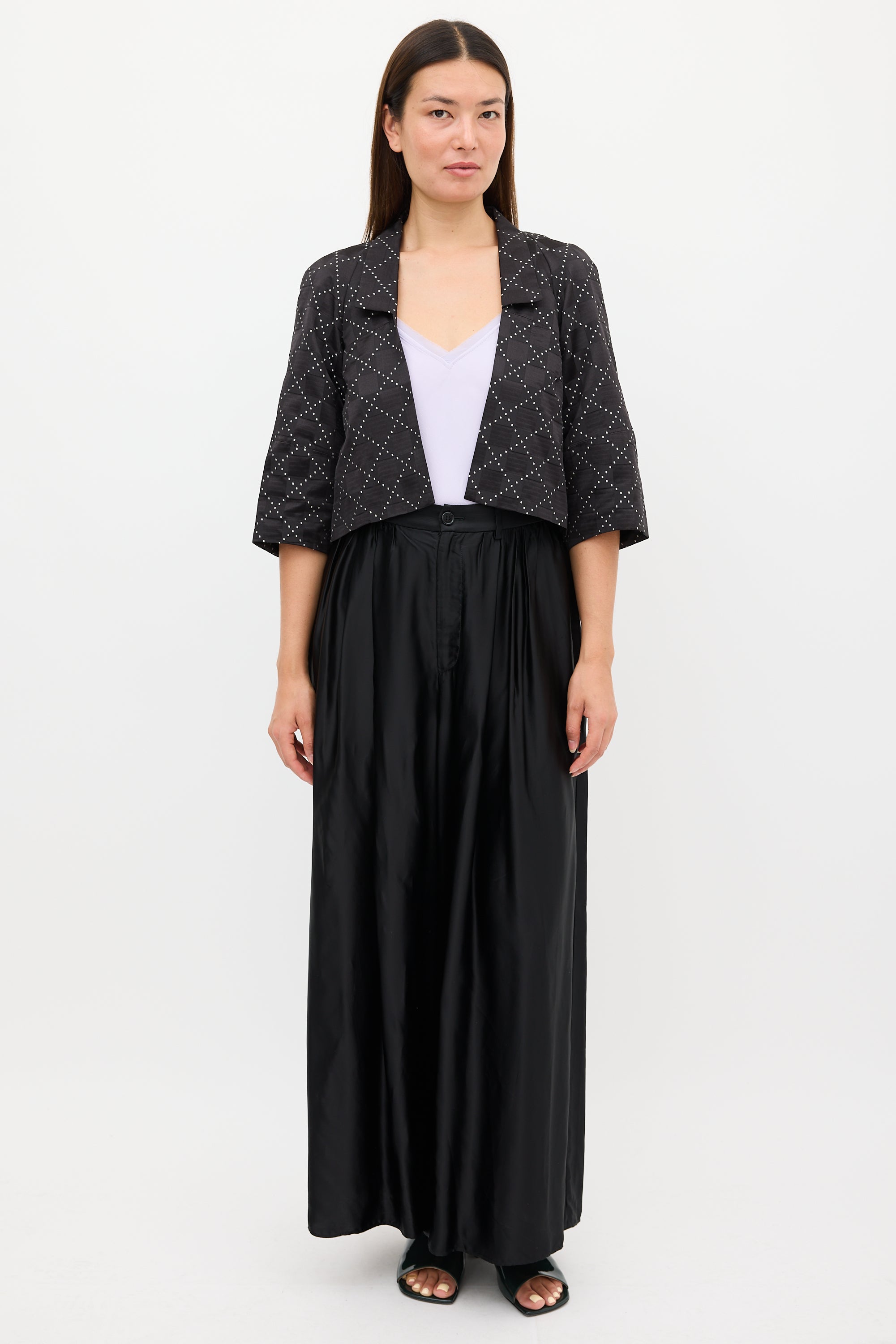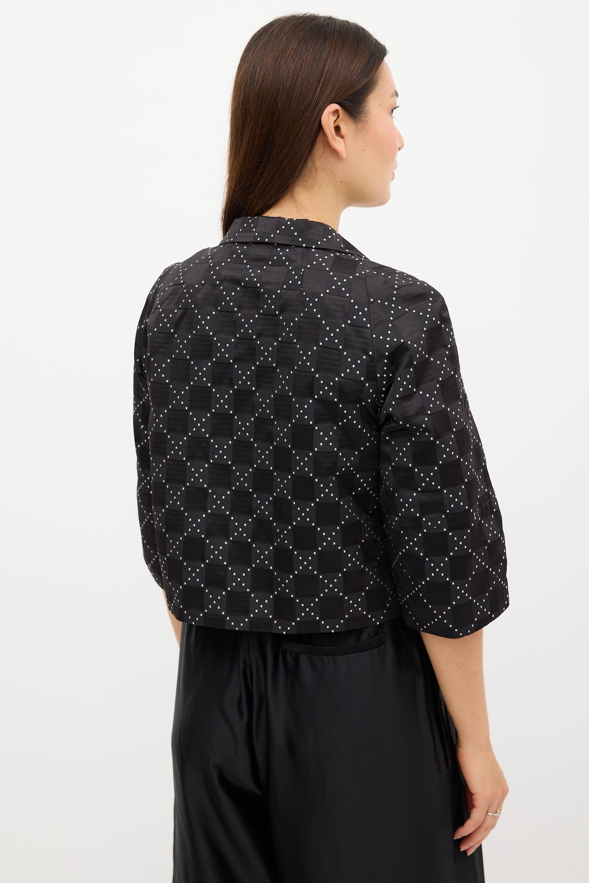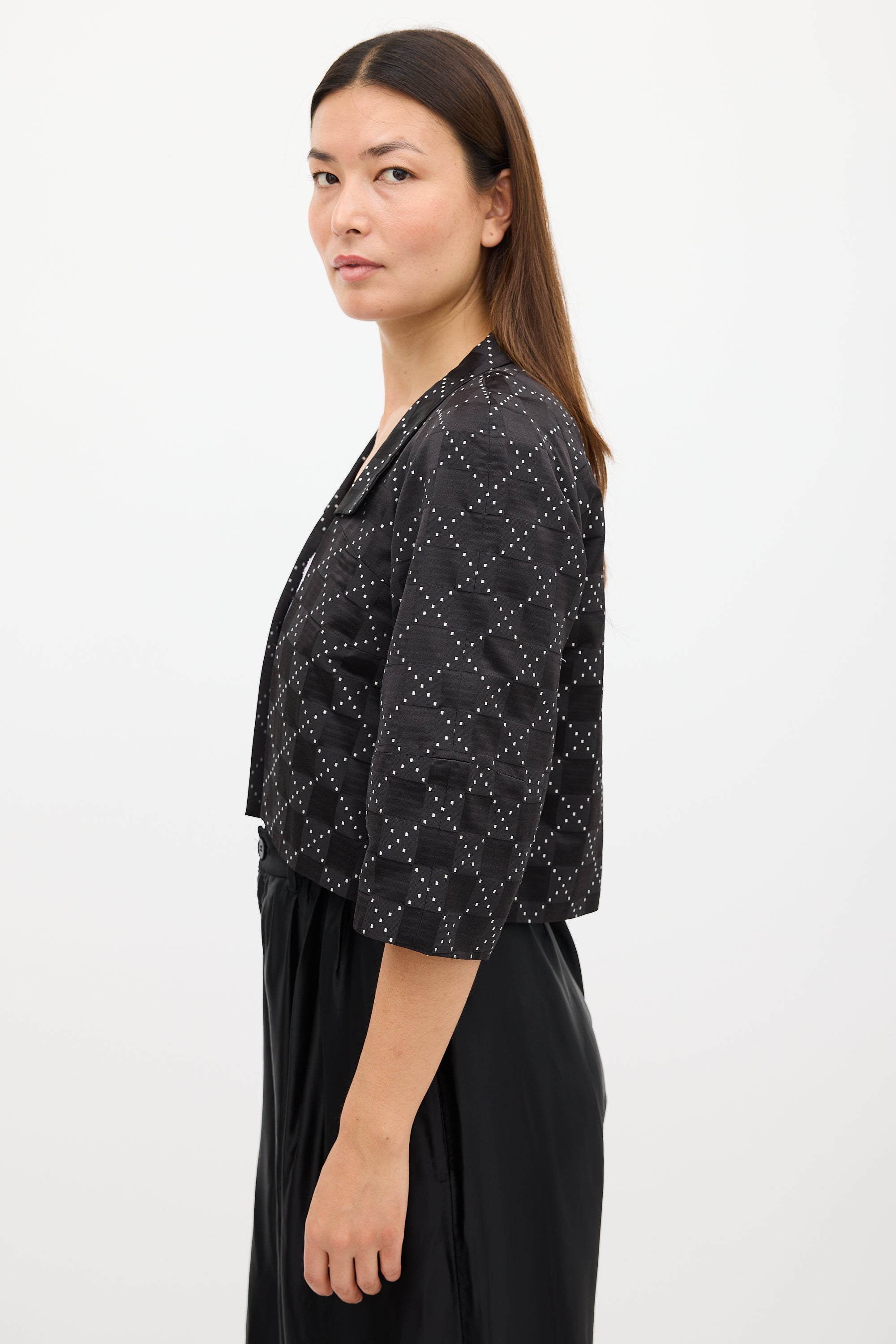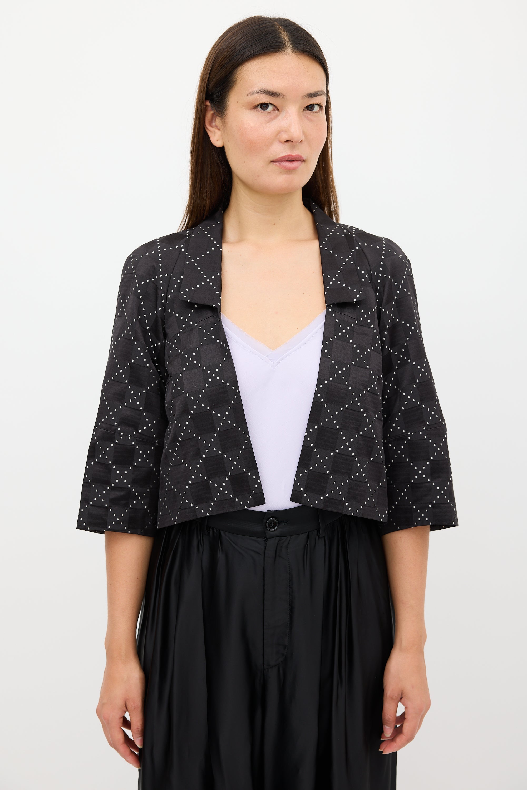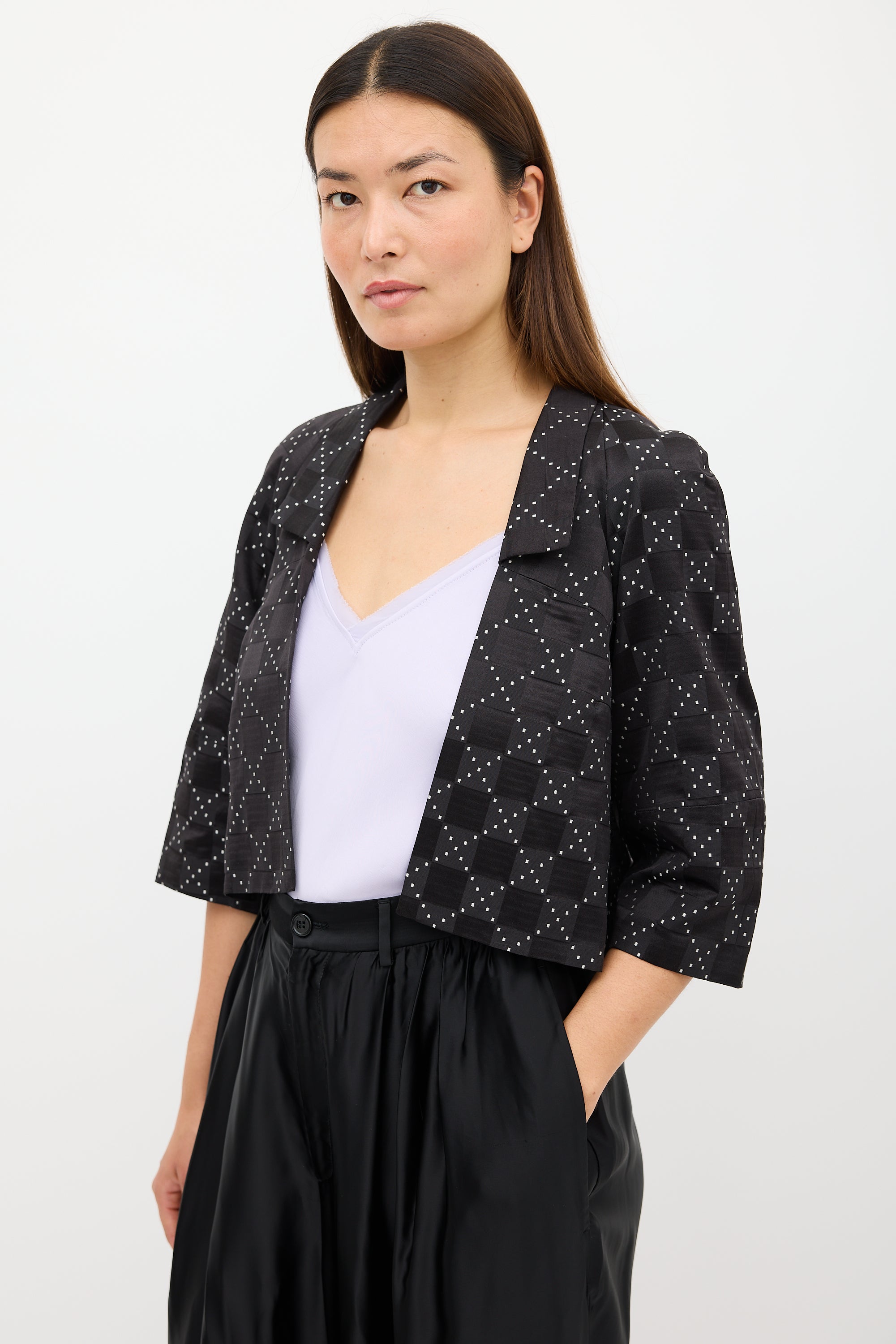 Pre-owned Dries Van Noten black and white cropped blazer featuring open front, notch lapel, geometric pattern, and wide sleeves. Lined.
