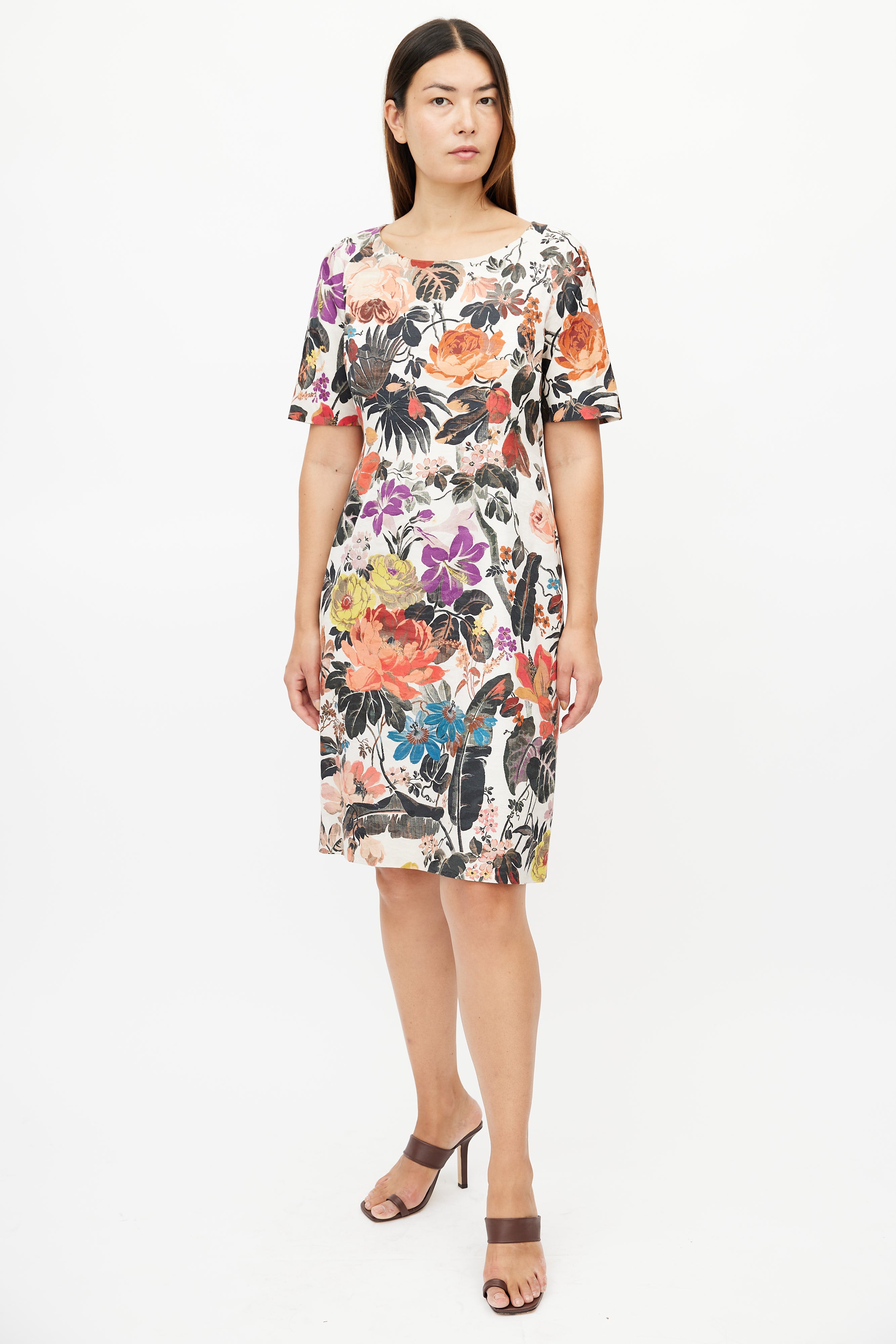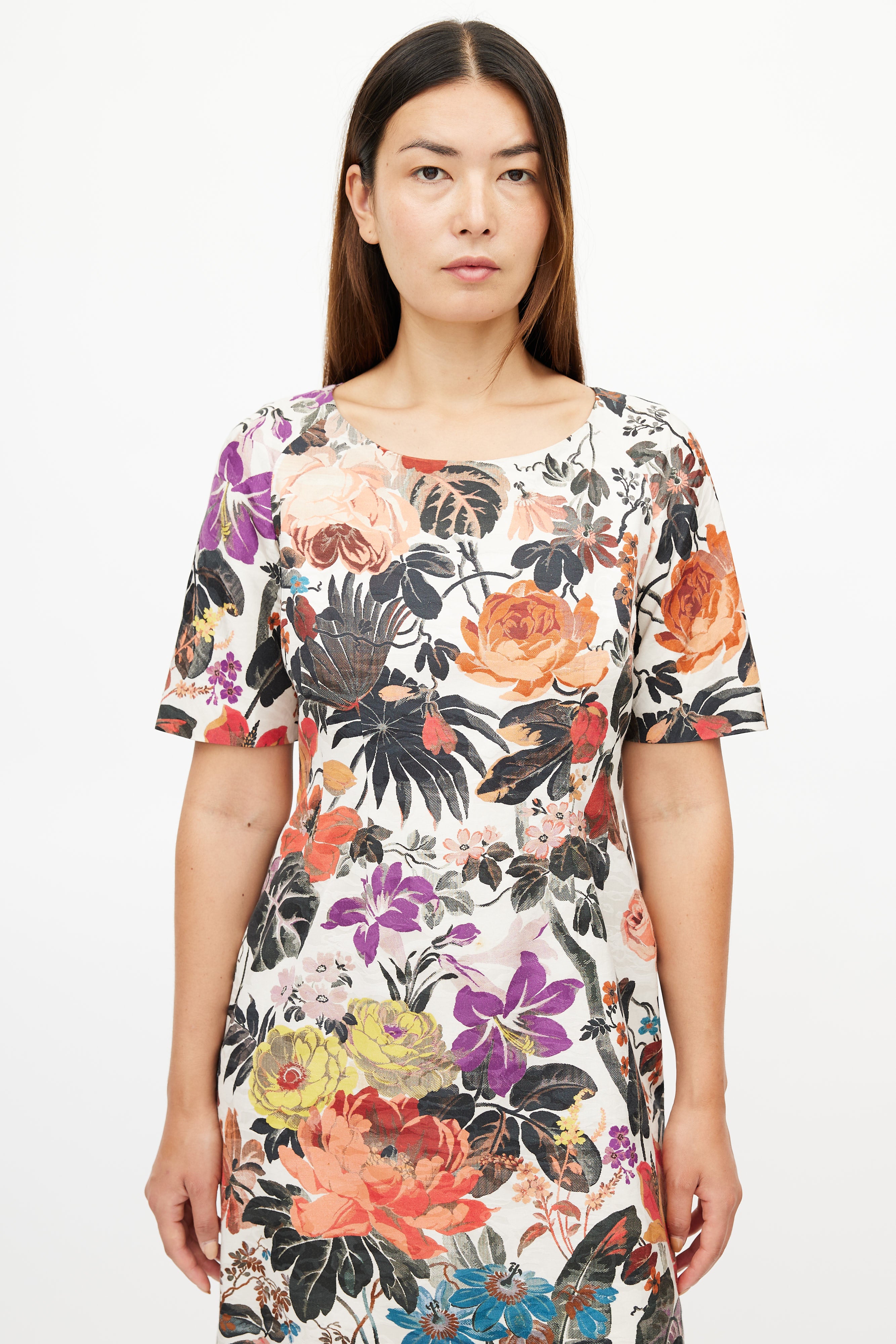 Pre-owned Dries Van Noten cream dress featuring a multicolour floral print throughout, crew neckline, short raglan sleeves, and a zip closure at back.