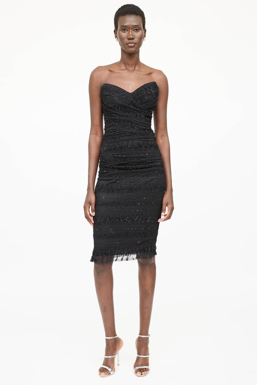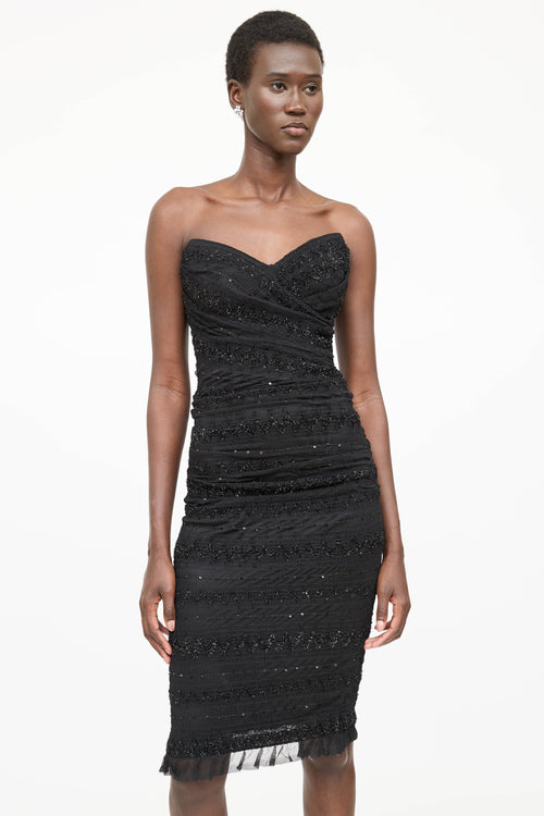 Pre-owned Dolce & Gabbana black mesh dress featuring a V-neckline, structured bust, tiered sequin detailing, and zip at back with hook and eye closure. Lined.