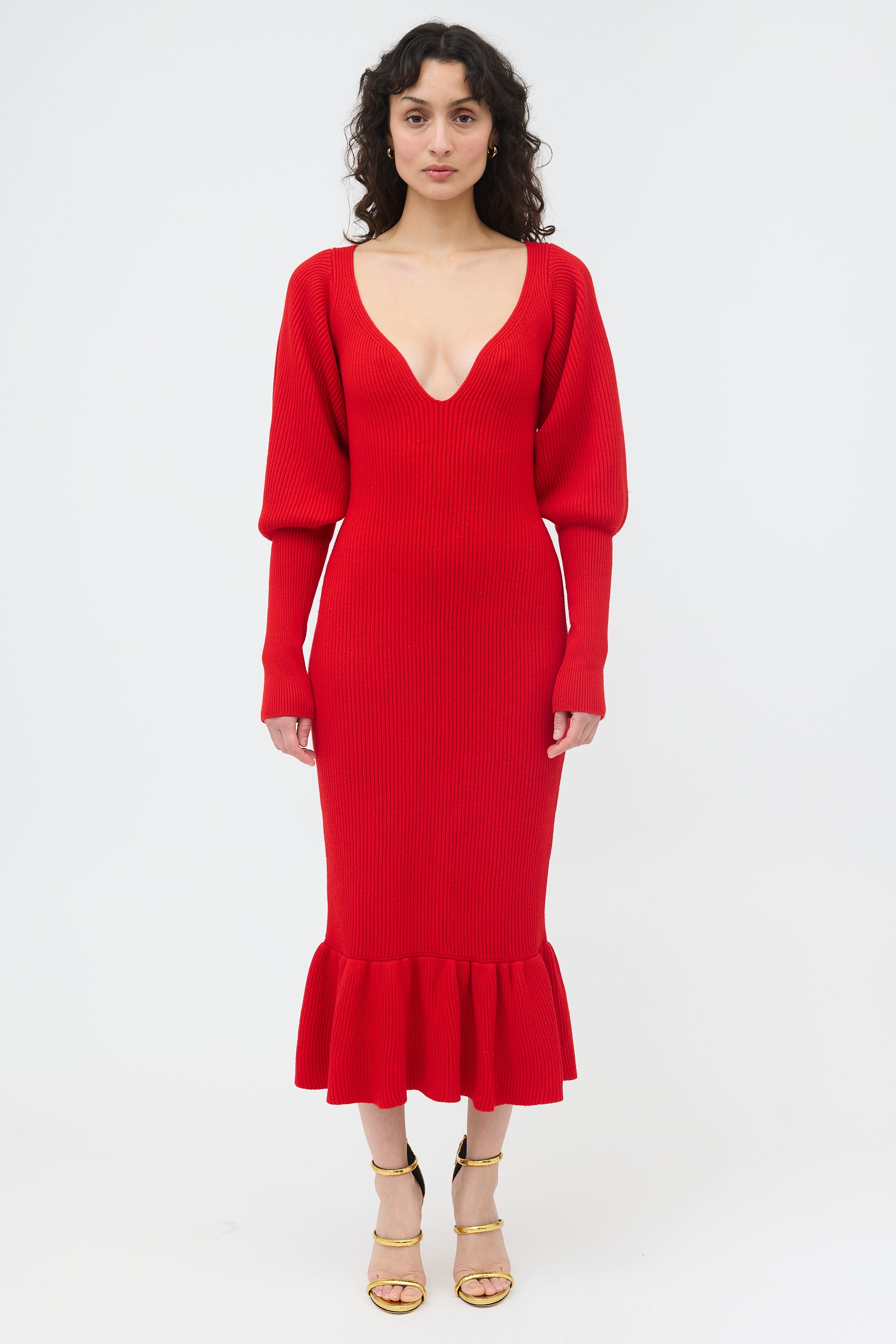 Pre-owned Khaite red merino wool Ina dress featuring a ribbed knit, sweetheart neckline, tapered puff sleeves, and ruffled hem.