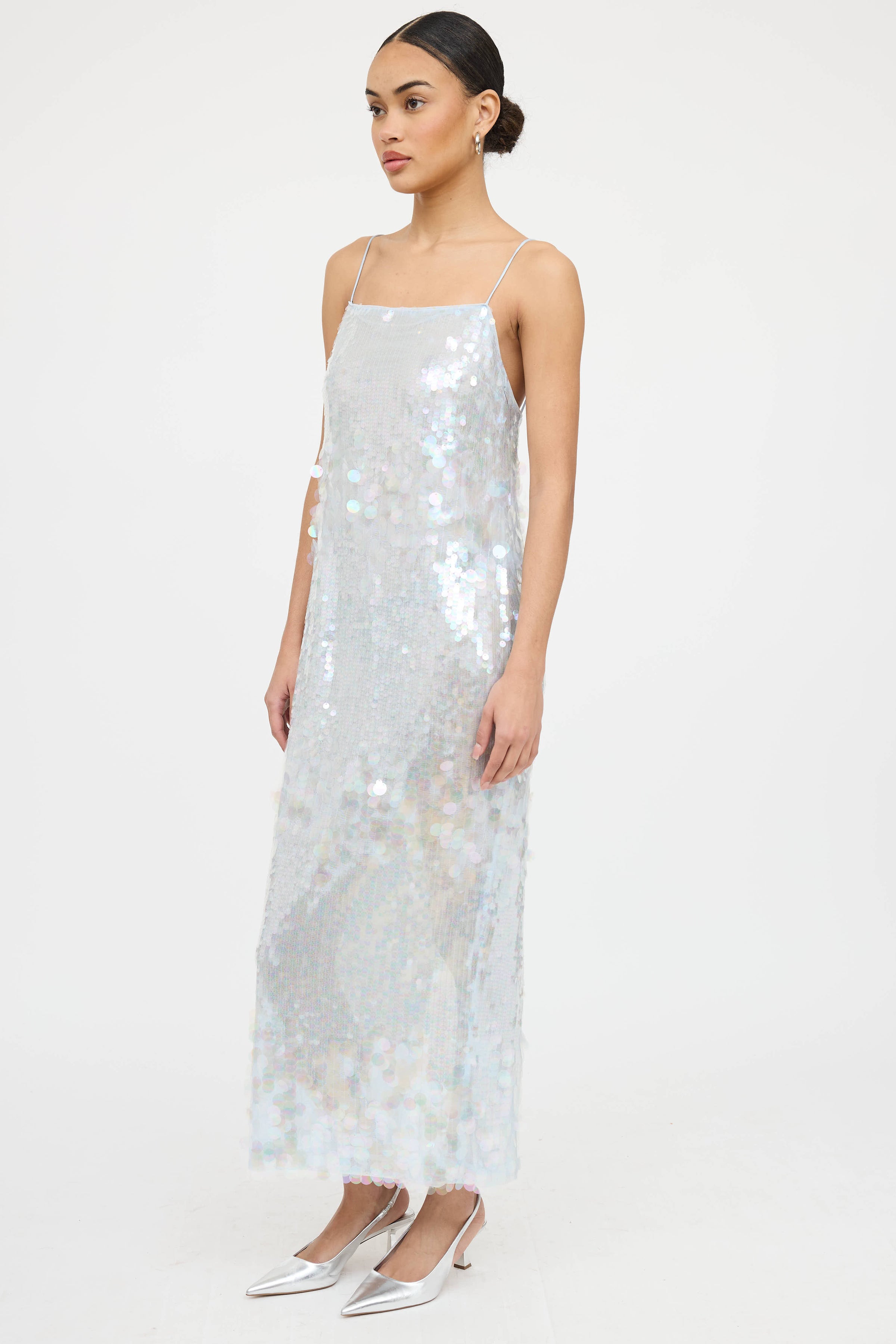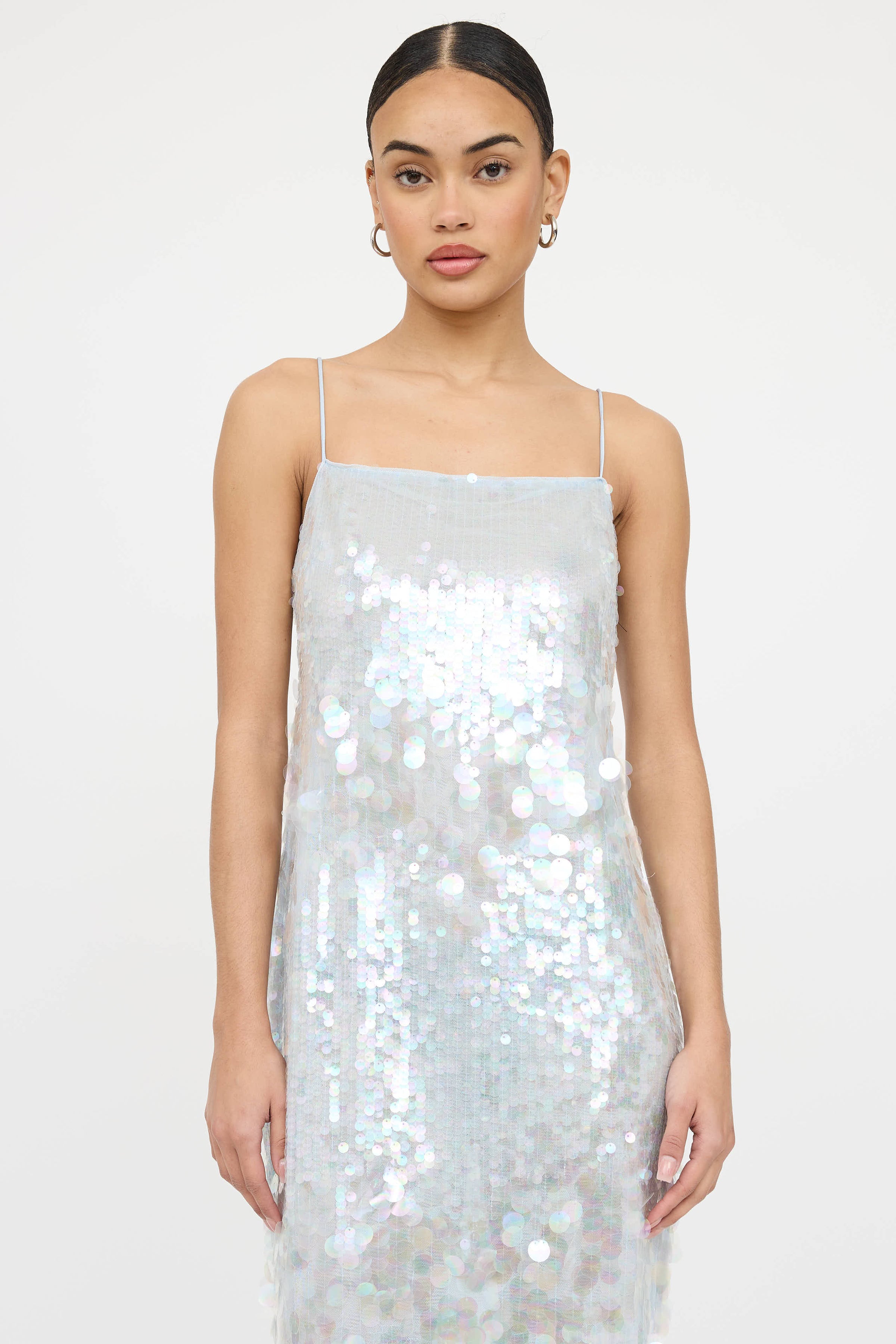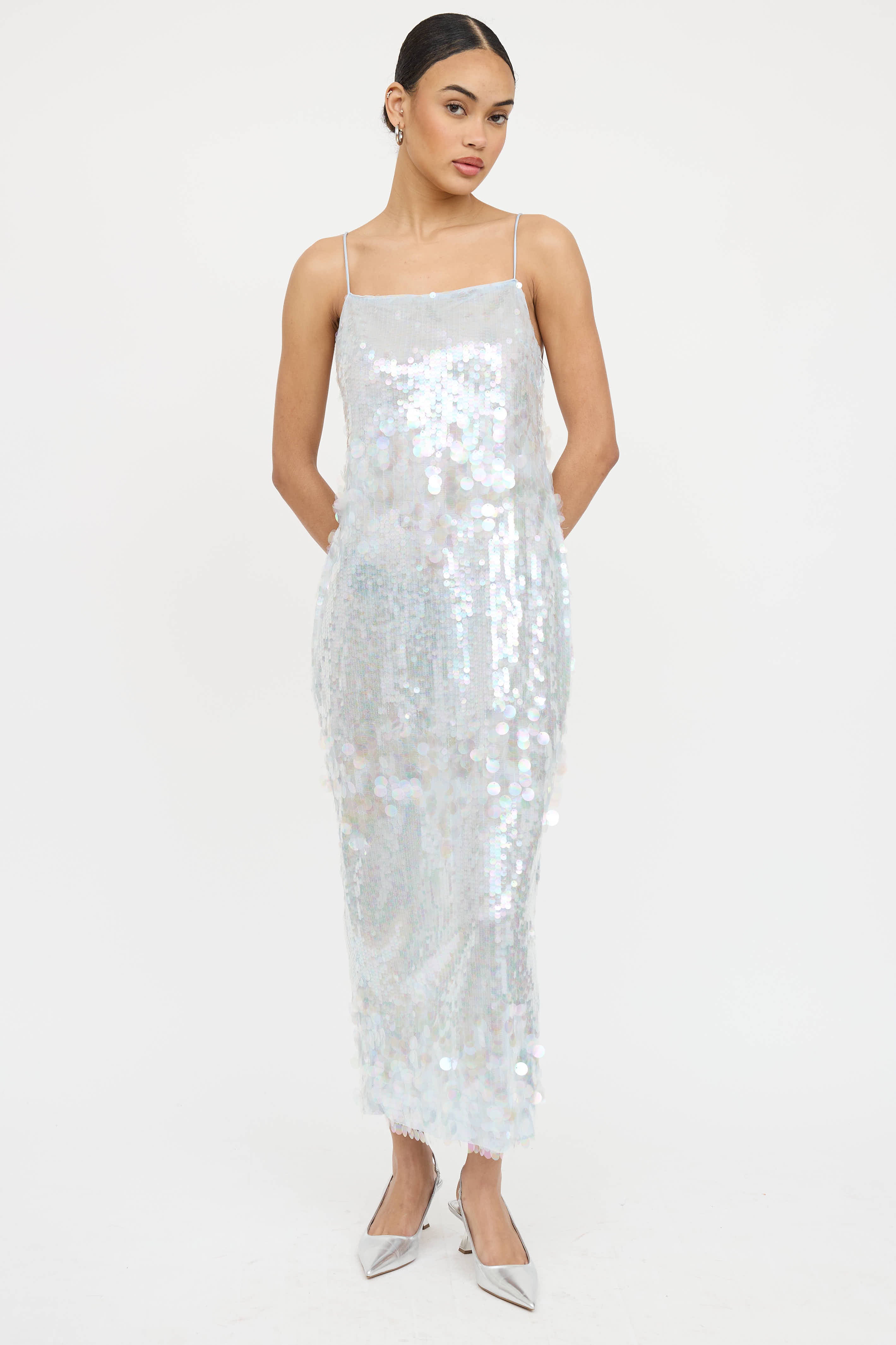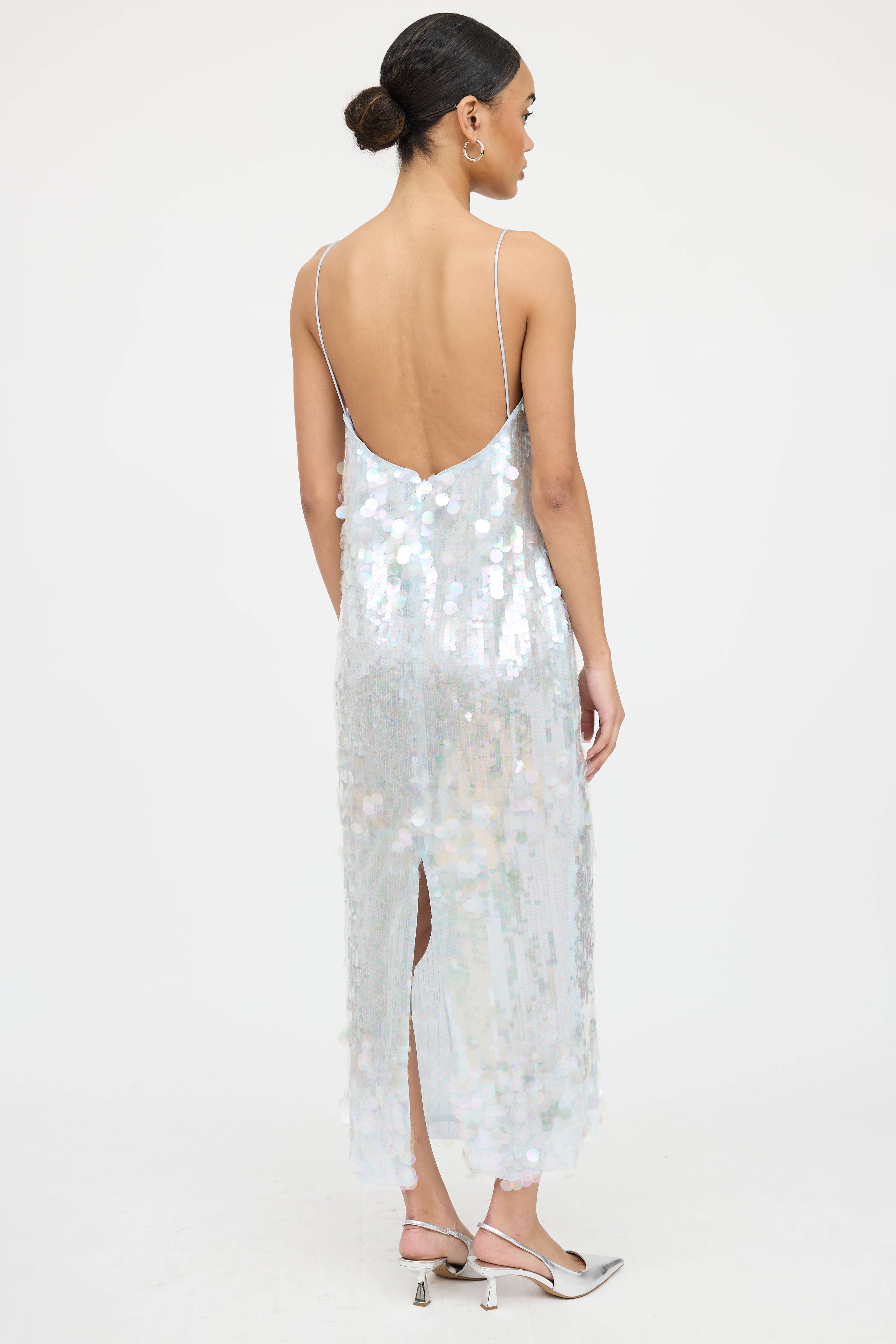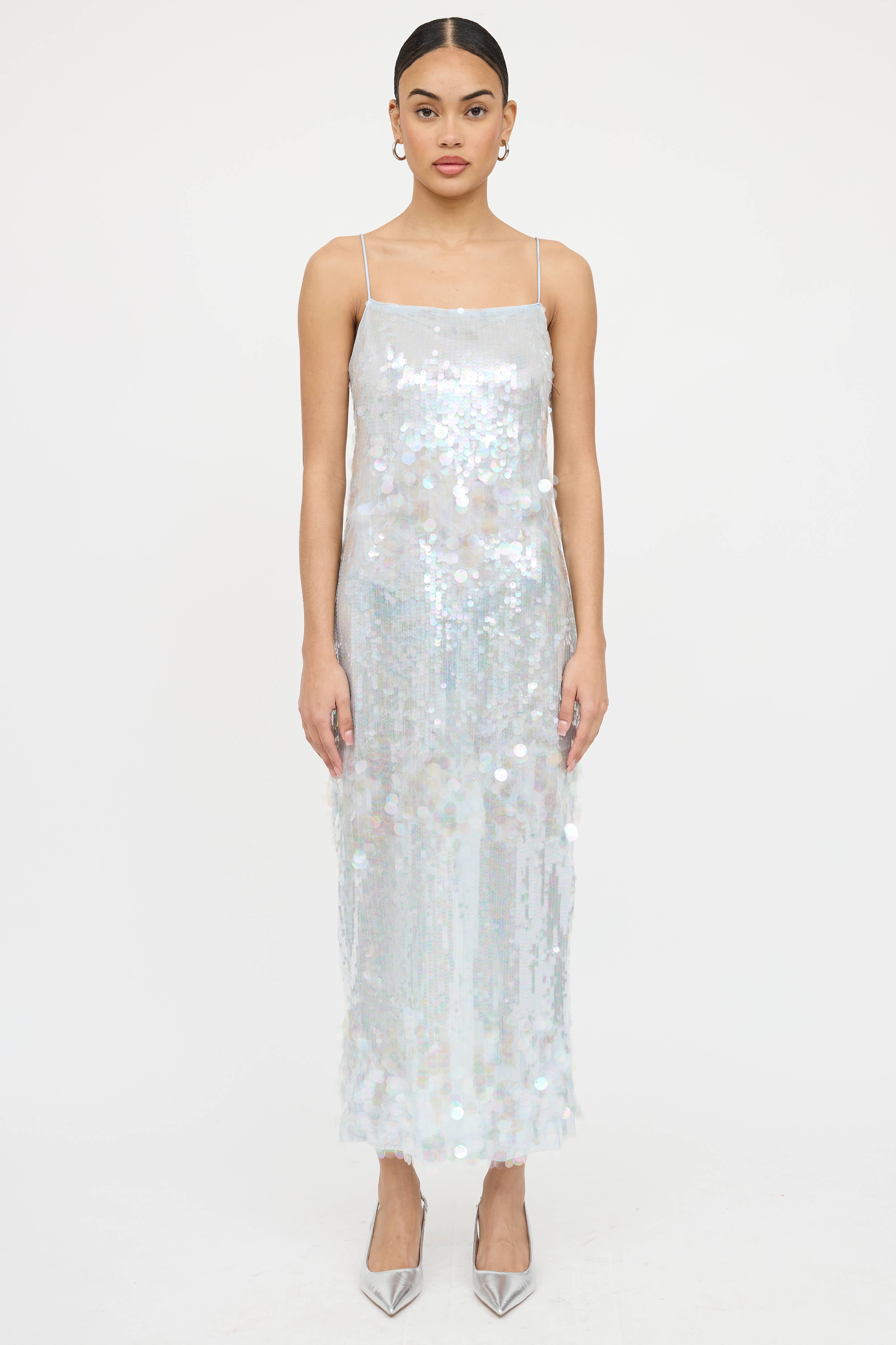 Pre-owned Retrofête blue Mai dress featuring sequin detailing, straight across neckline, sleeveless styling, and zip at back with hook and eye closure. Lined.