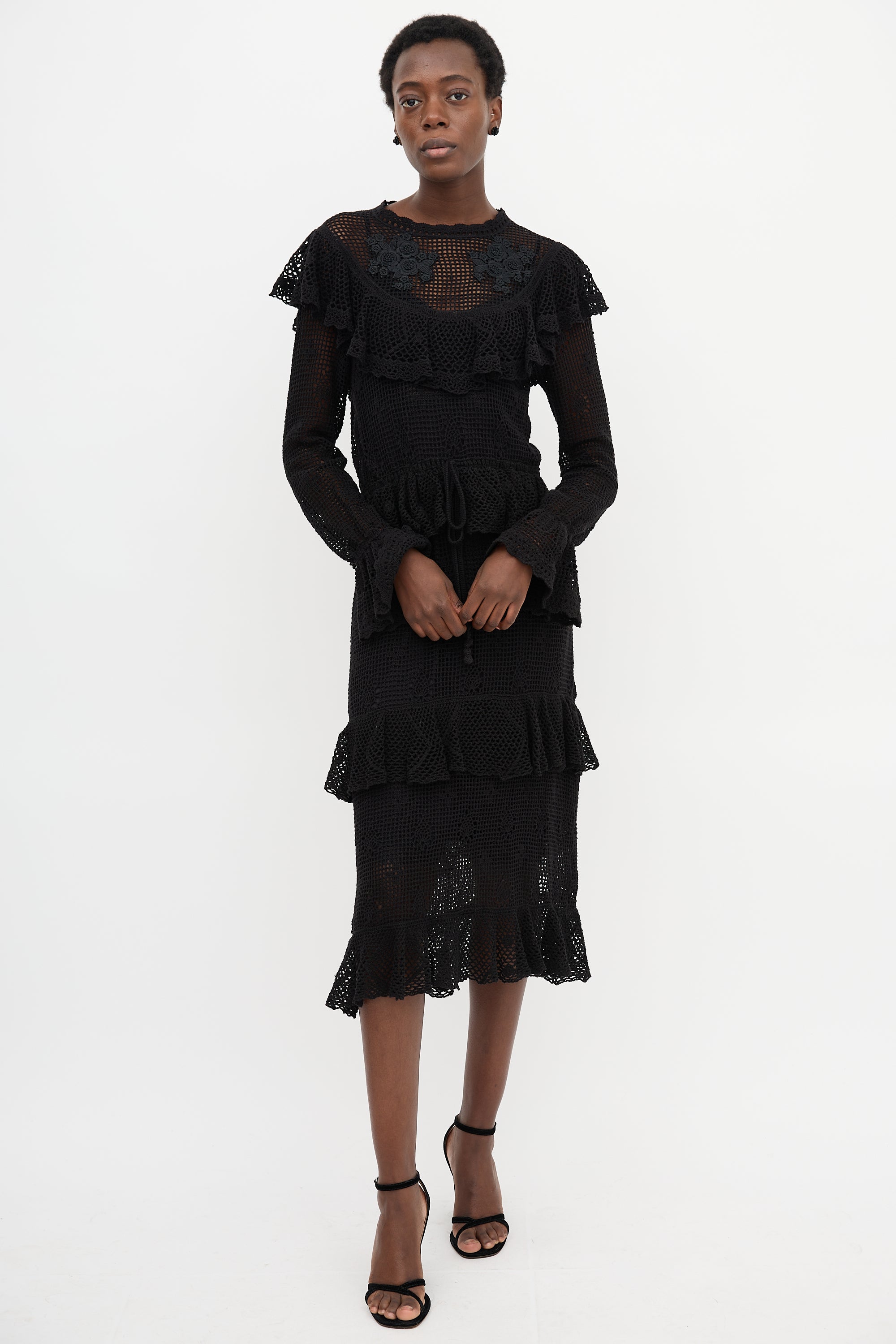 Pre-owned Zimmermann X Barneys New York black crochet midi dress featuring trimmed collar, floral applique, ruffle tiers, drawstring waist, button up back, and frill cuffs. Comes with slip.