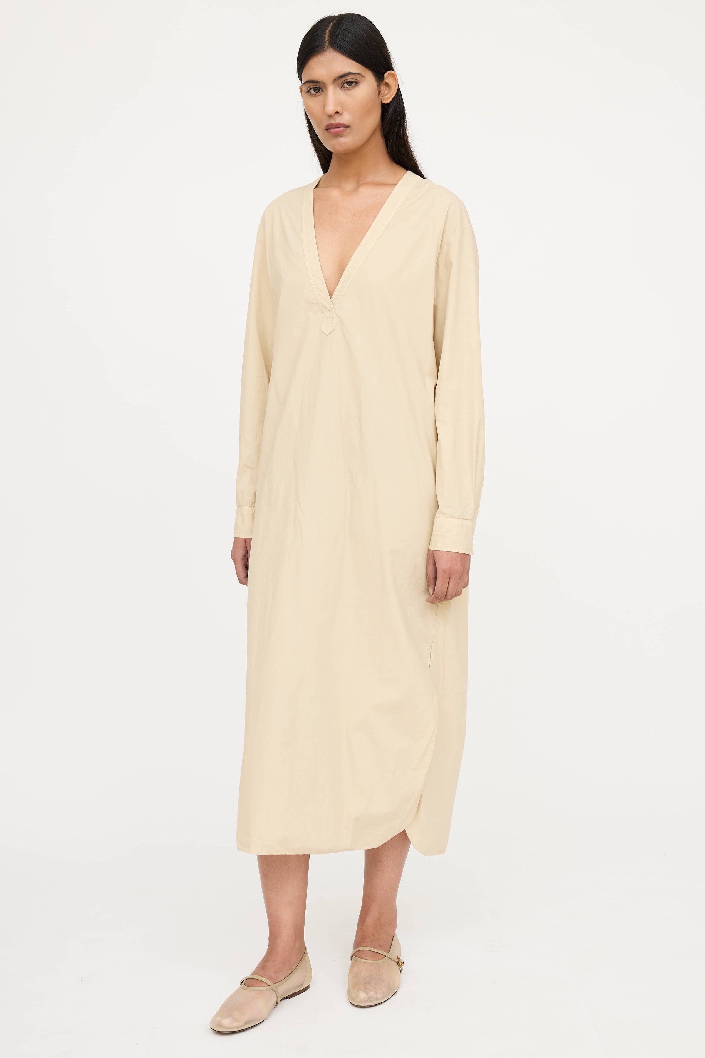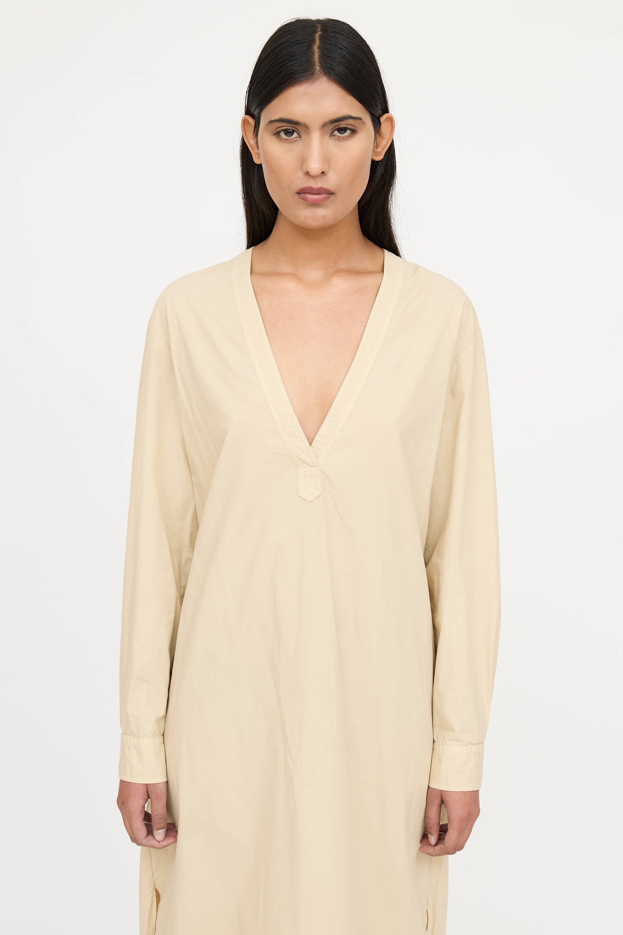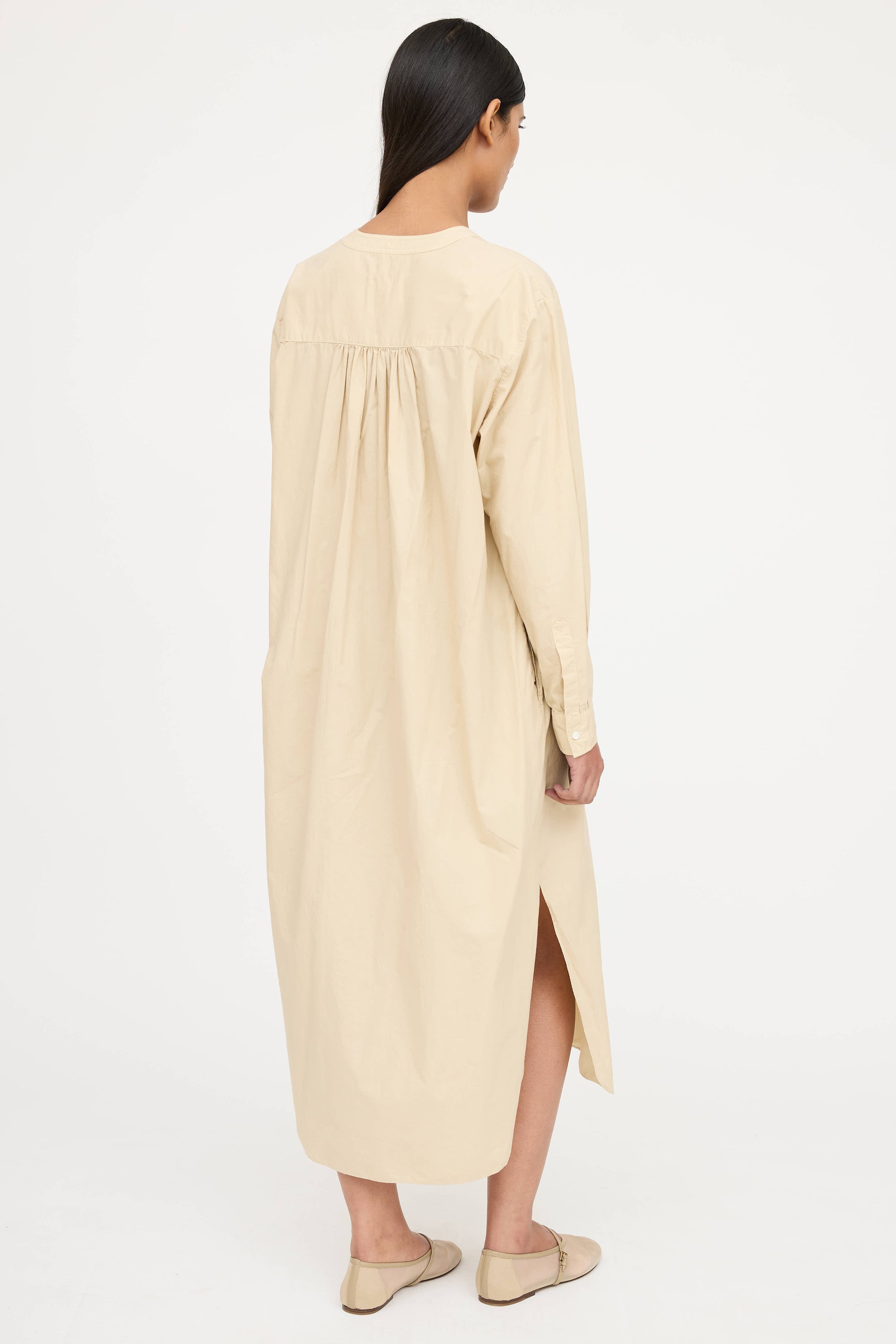 Pre-owned Nili Lotan beige long sleeve dress featuring a v-neckline, gathering at back, pocket at waist, and slit at sides.