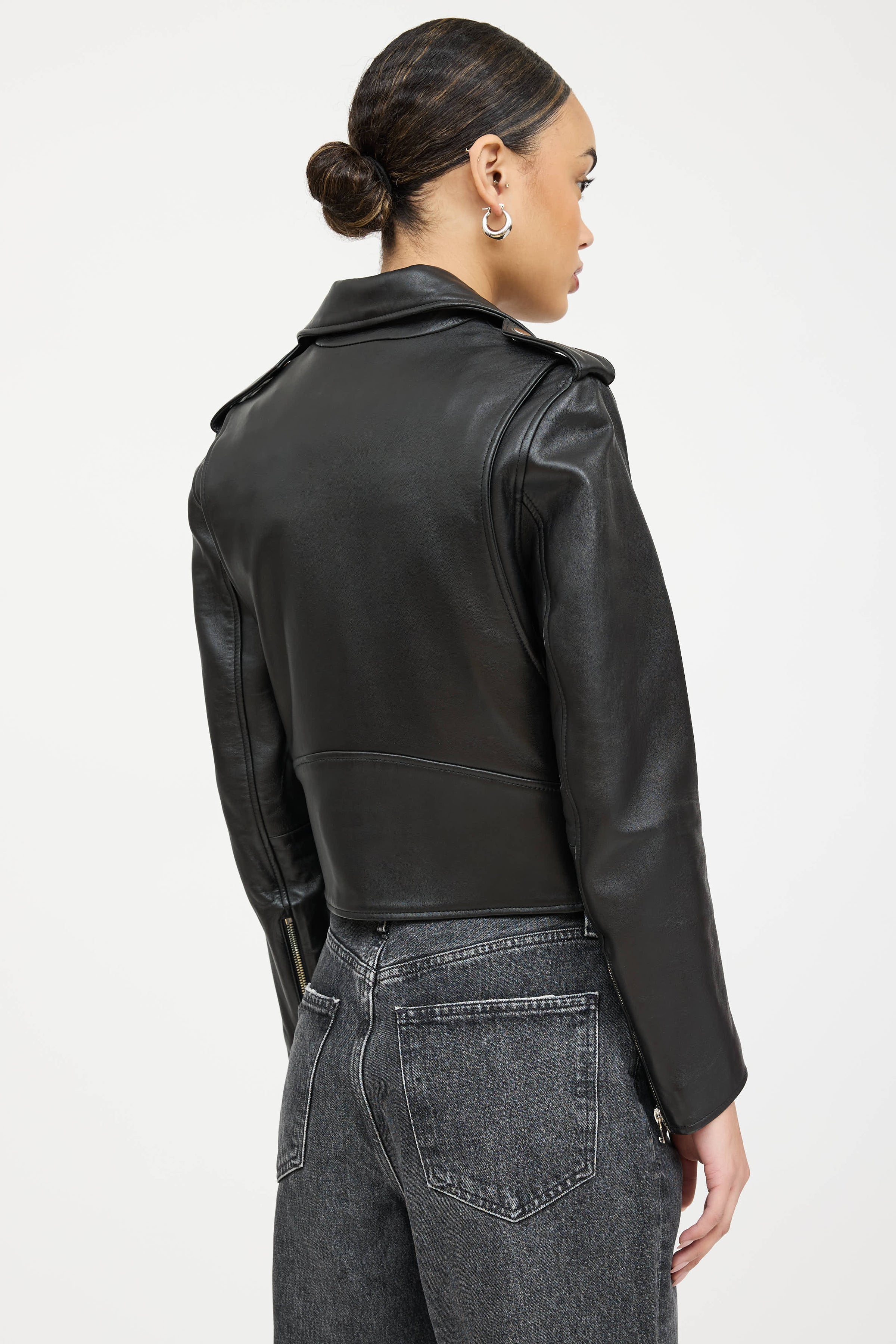 Pre-owned Sandro black leather rider jacket featuring a pointed collar, shoulder epaulets, long sleeves with zipped cuffs, zip detail at waist, and zip closure. Lined.