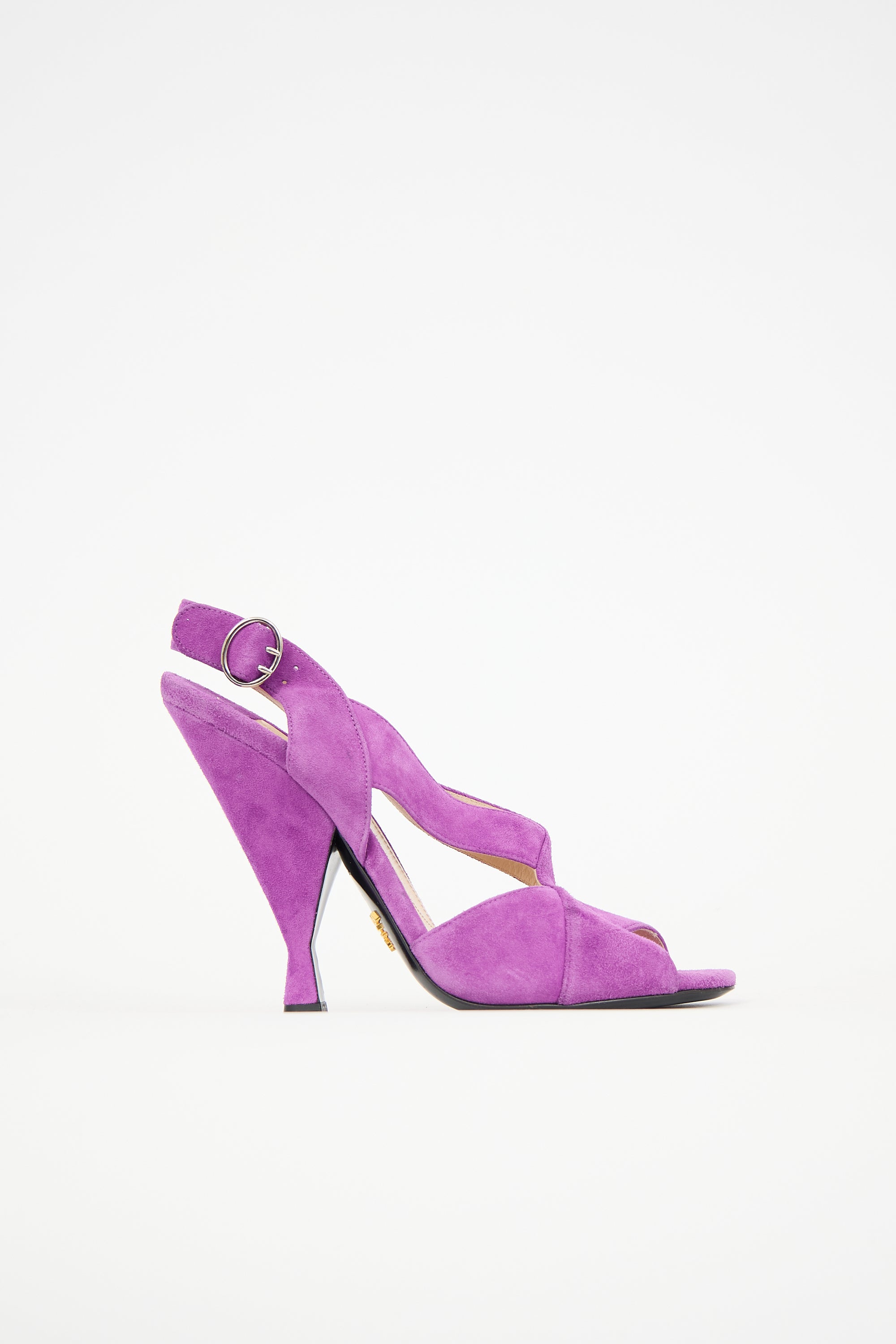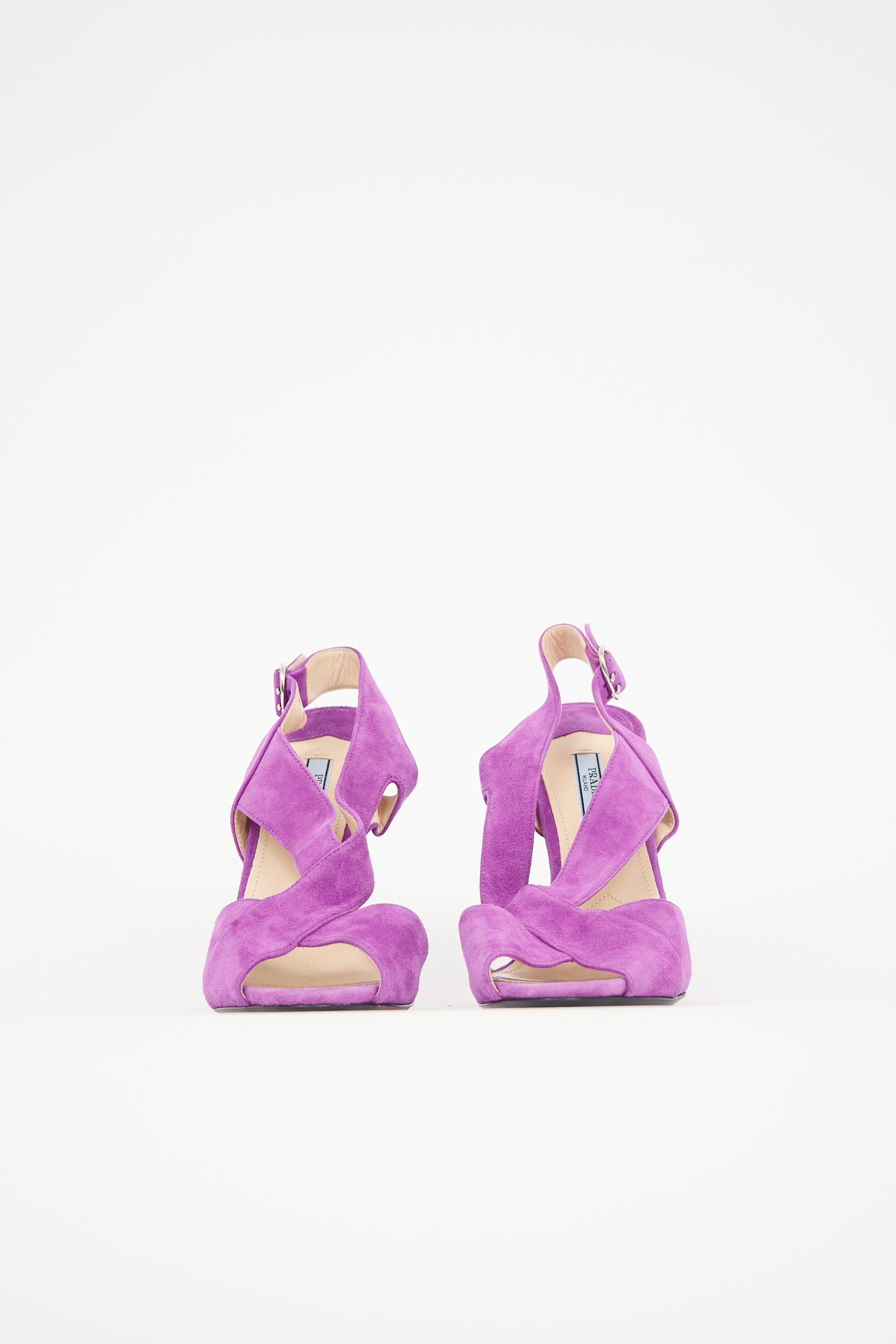 Pre-owned Prada purple suede heels featuring almond peep toe, criss cross upper, adjustable slingback strap, and covered cone heel.
