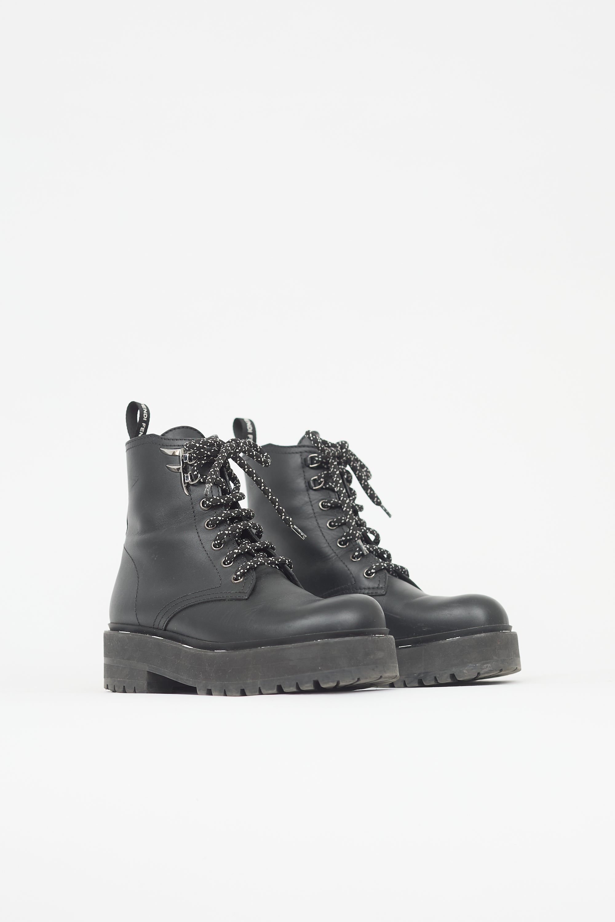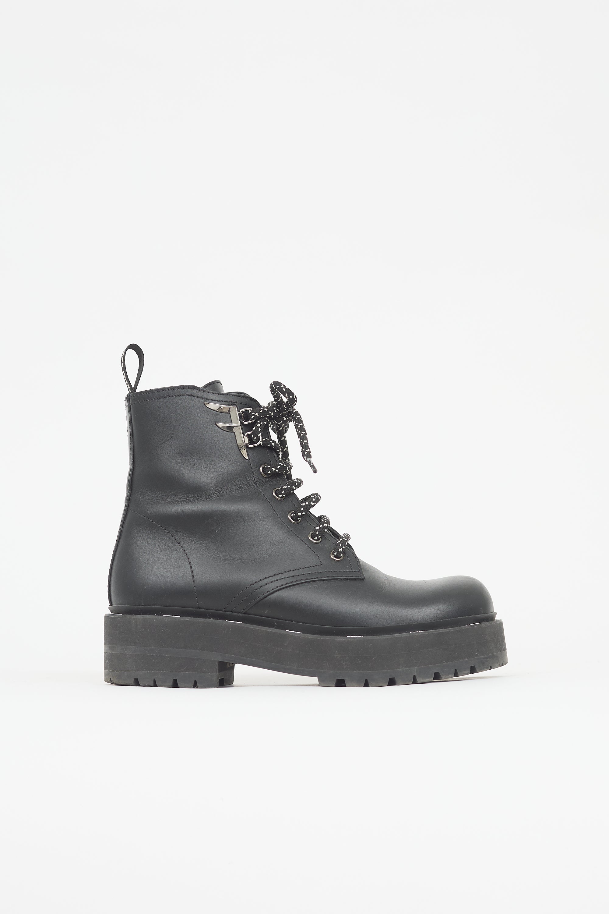 Pre-owned Fendi black leather FFreedom biker boots featuring rounded toe, lace up front, logo pull tab at counter, and treaded rubber platform and block heel with logo trim. Comes with original dust bag.