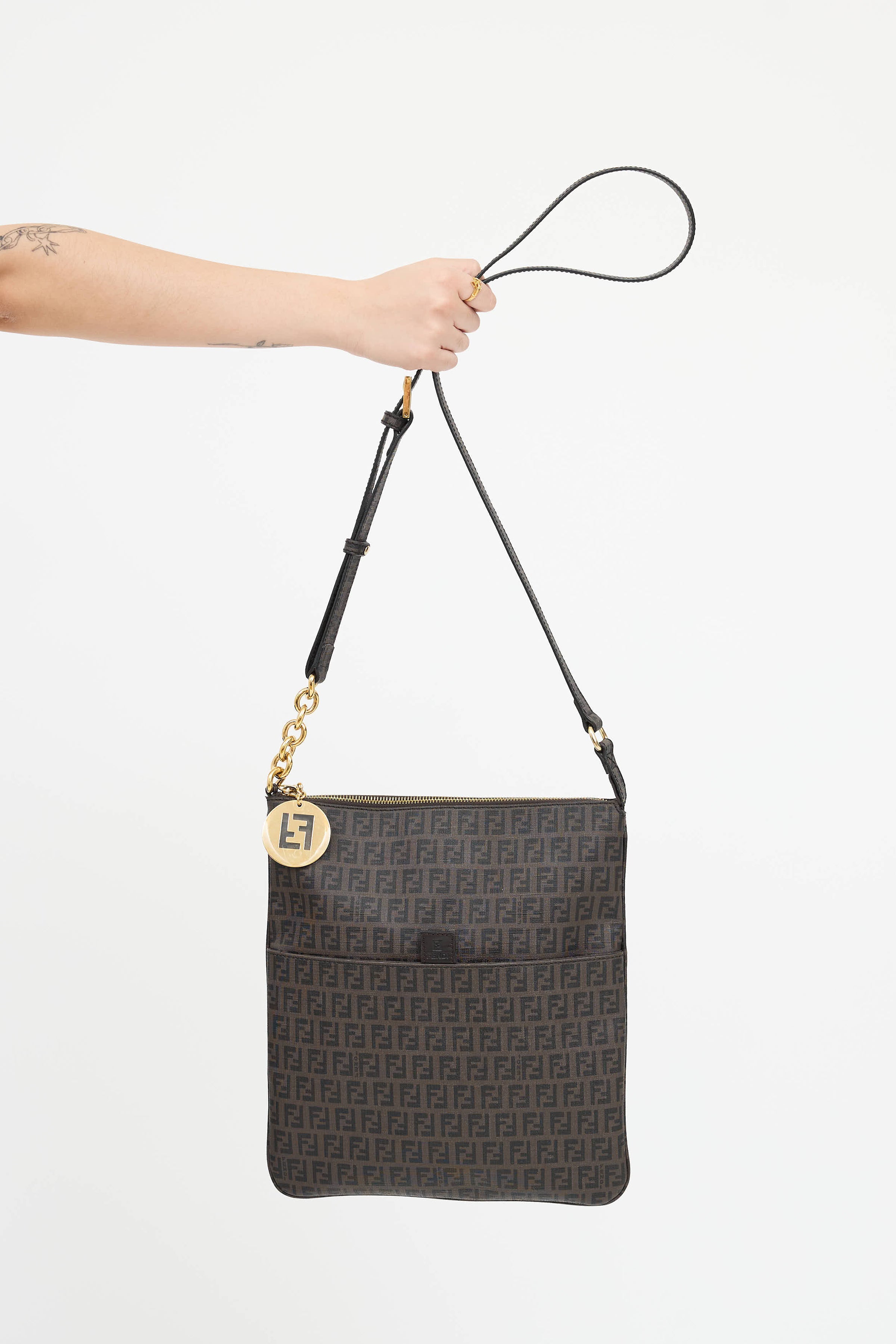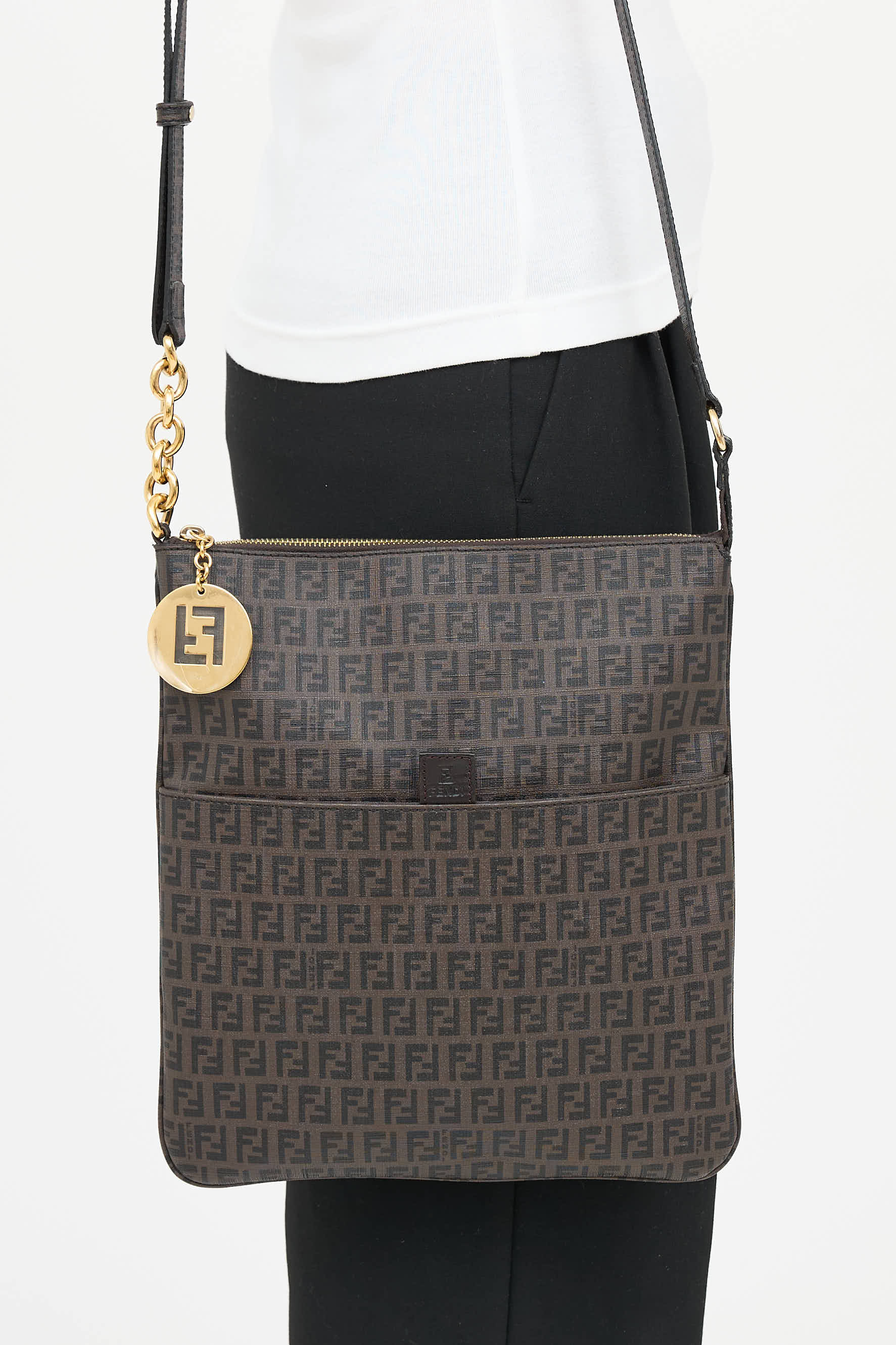 Pre-owned Fendi brown Zucchino crossbody bag featuring monogram coated canvas, adjustable crossbody strap, gold tone hardware, slip pocket at front, top zip with logo charm, and one main compartment with slip pocket.