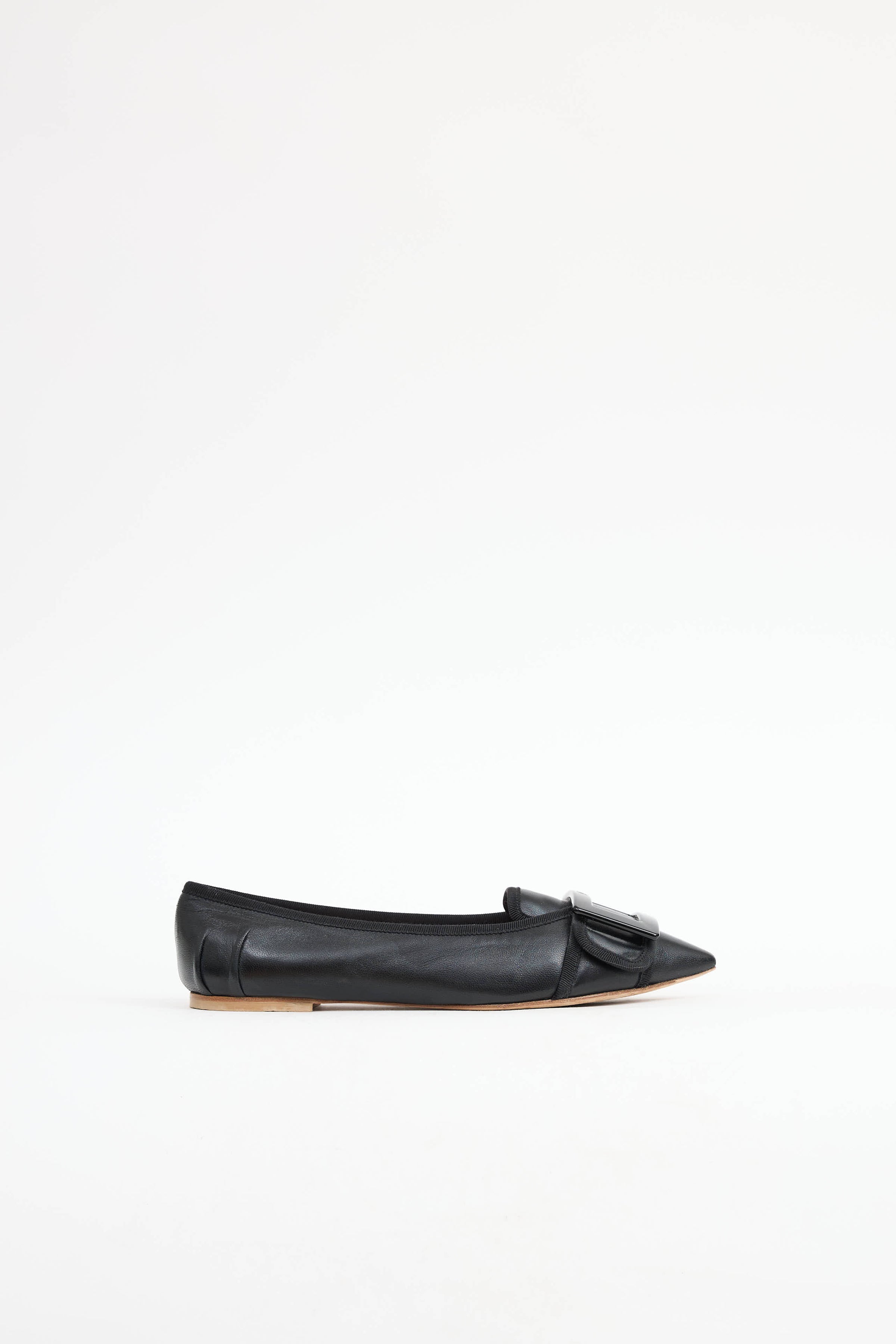 Pre-owned Roger Vivier black Gommettine leather flats featuring a pointed toe, tonal buckle at vamp, pleating at heel and slip on entry. Comes with original dust bag.