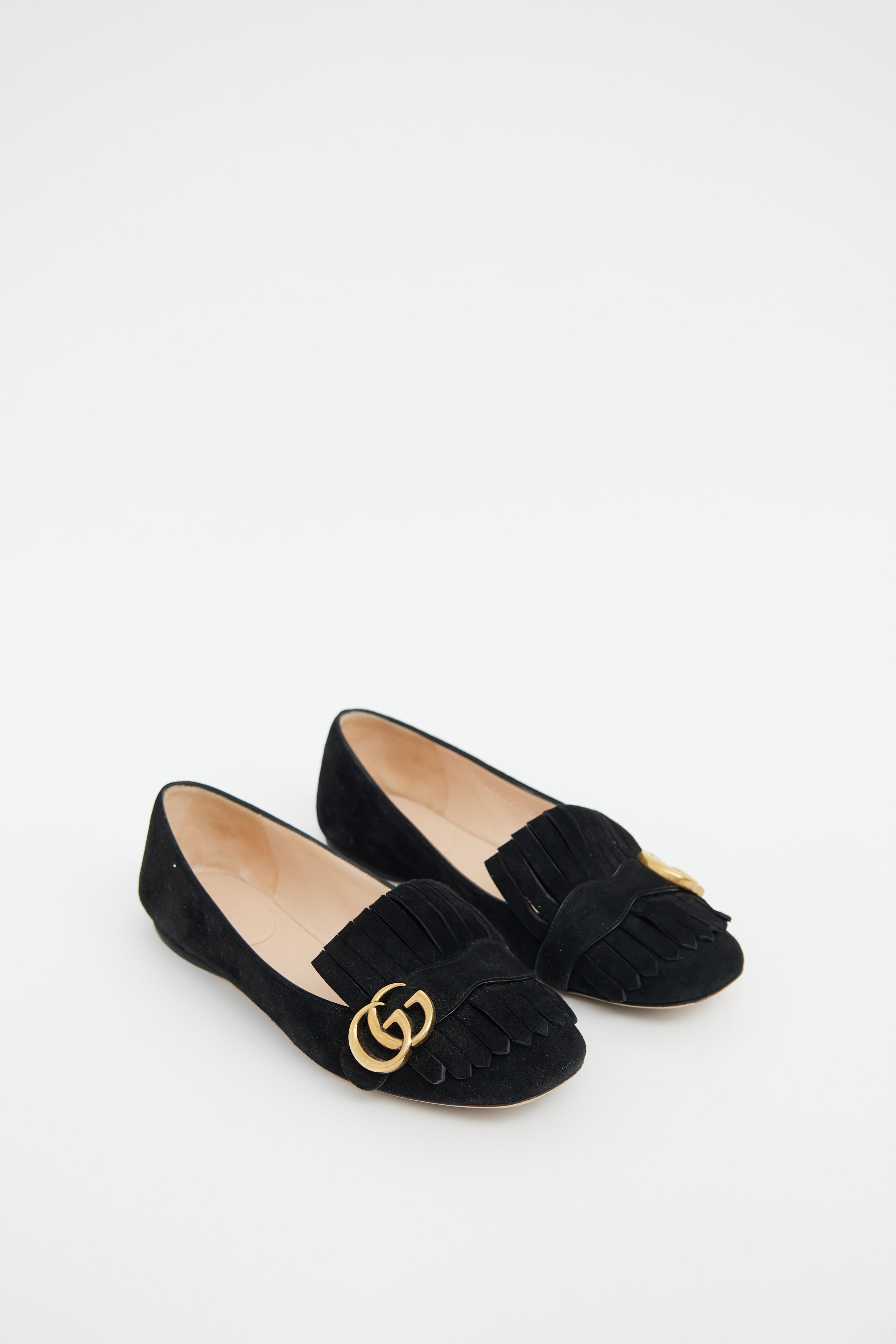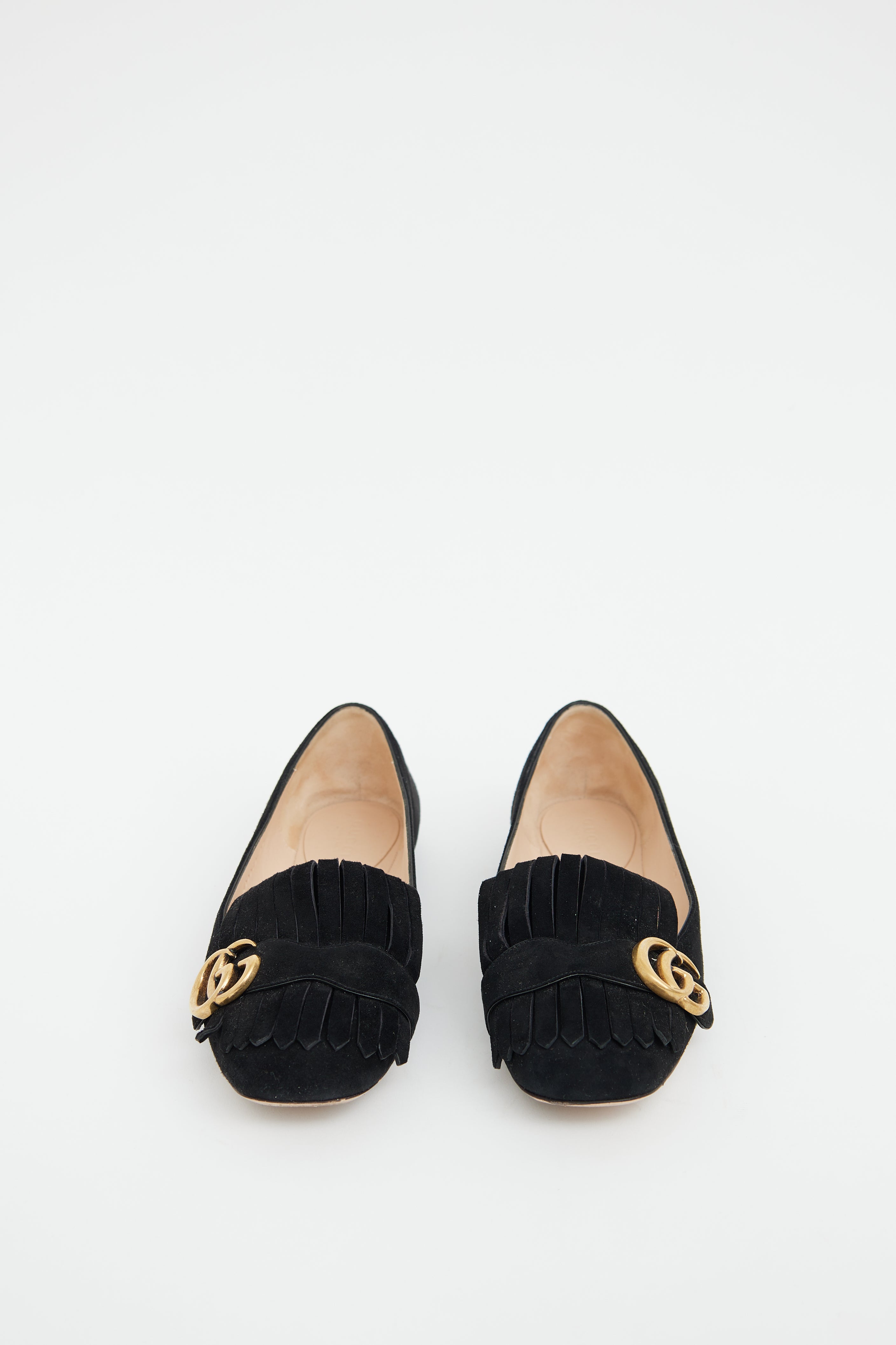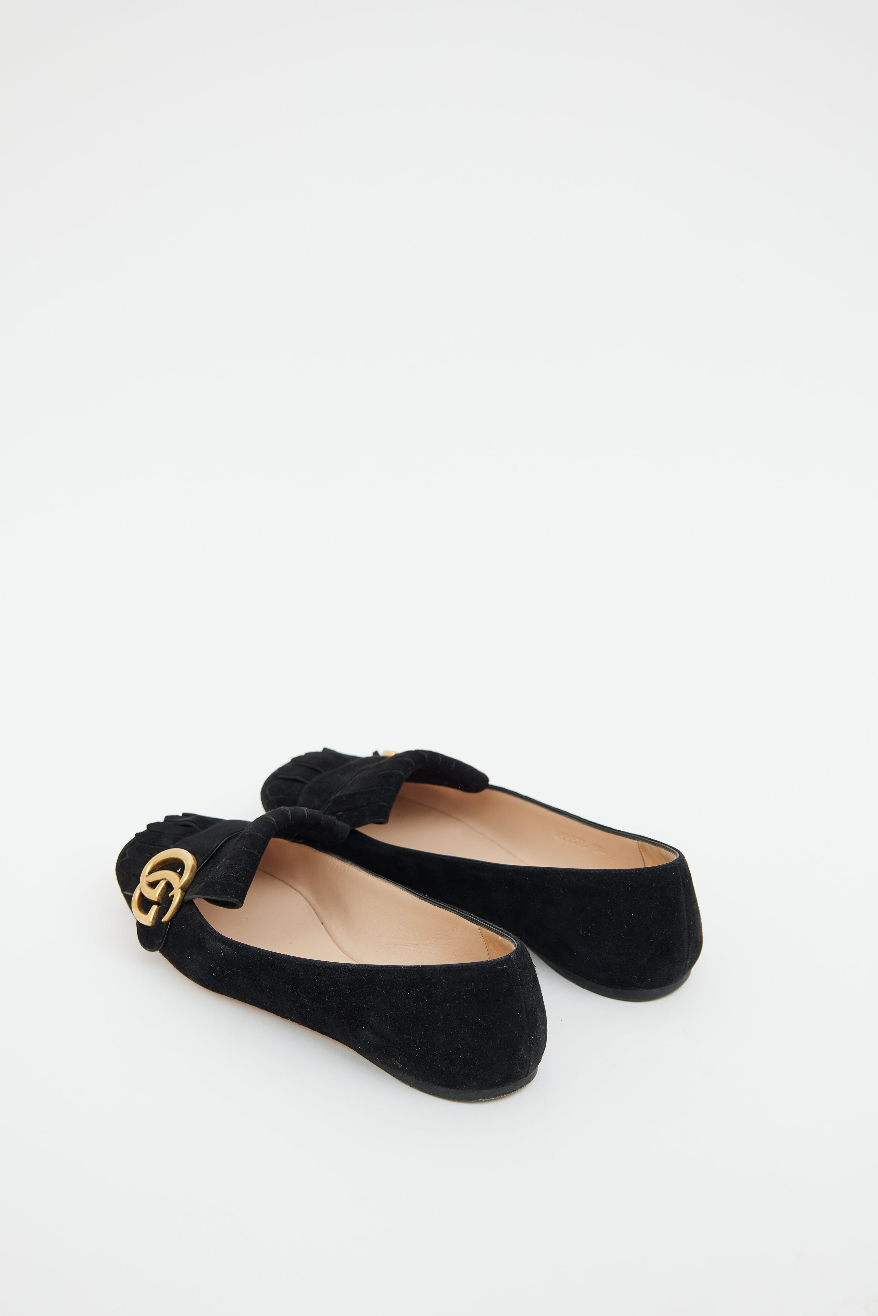 Pre-owned Gucci black suede flats featuring round toe, fringe on upper and trap with gold tone GG hardware.