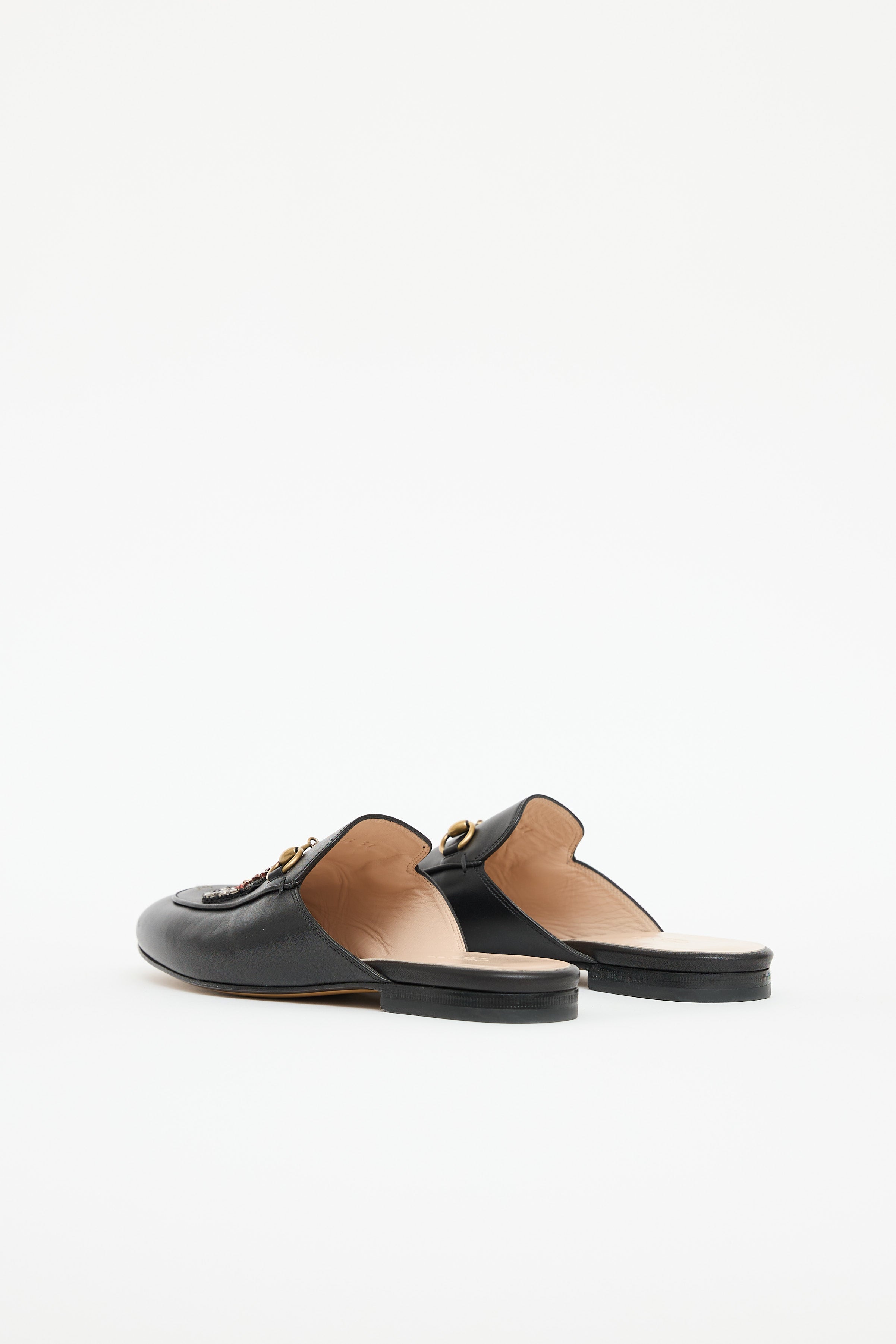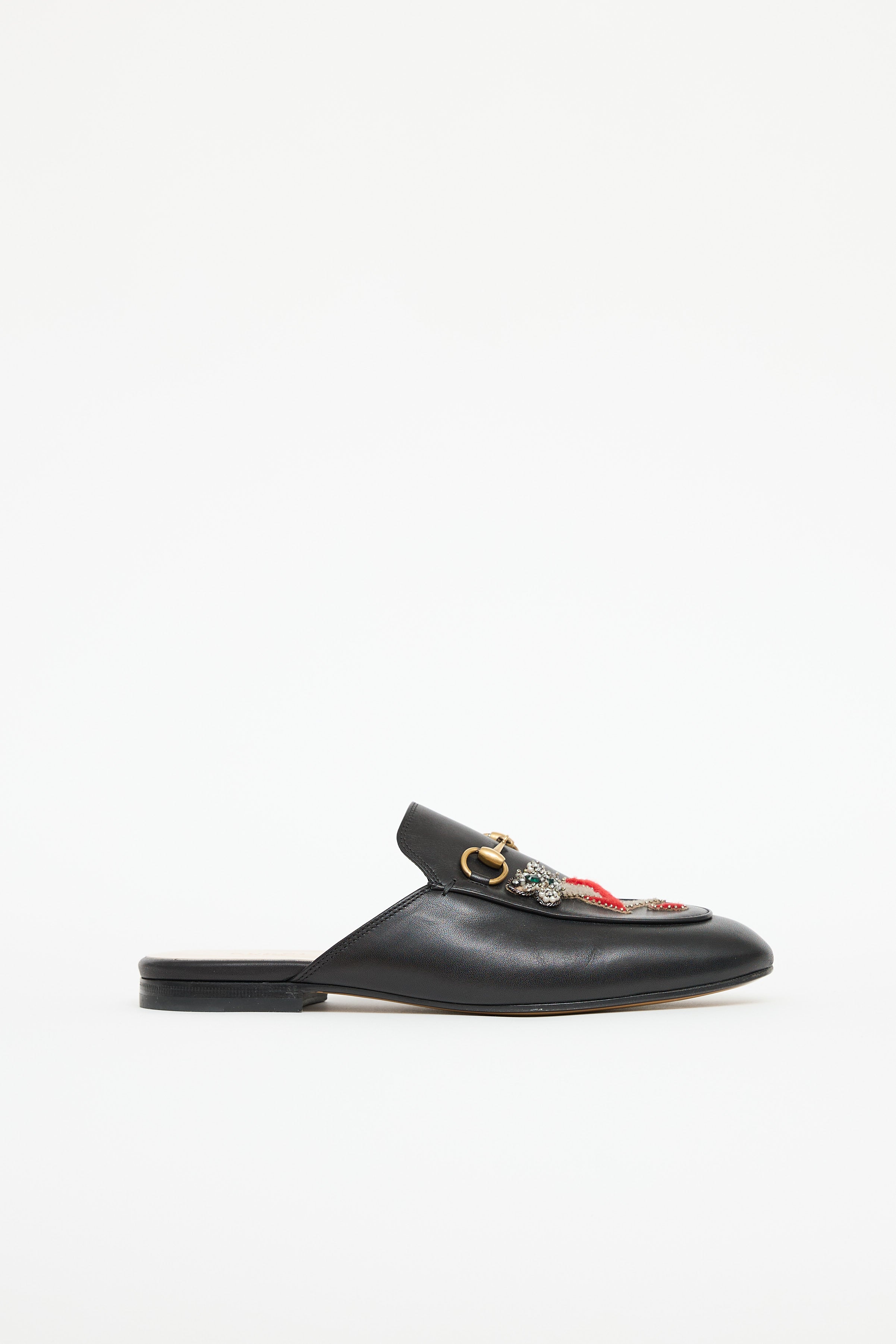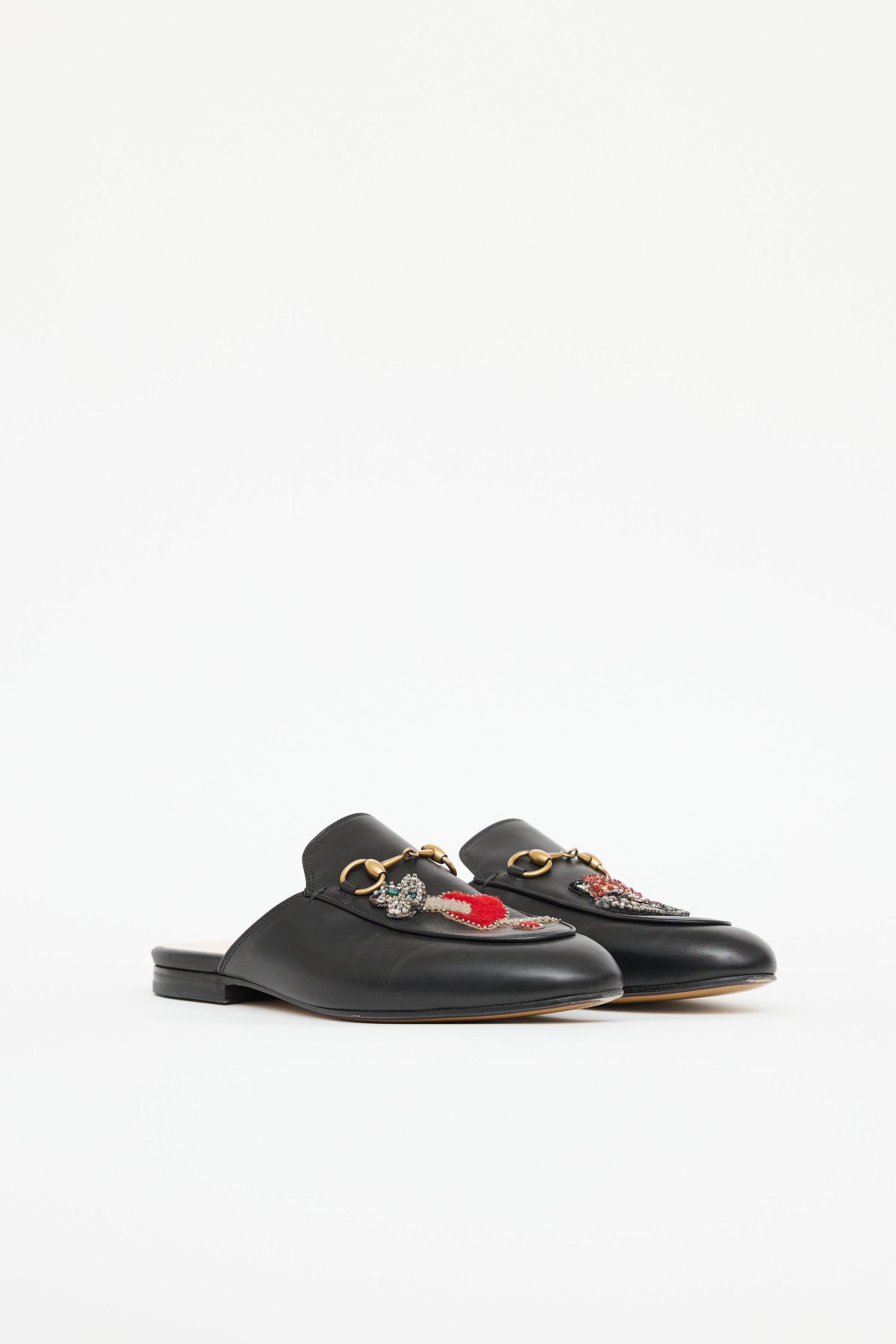 Pre-owned Gucci black Princetown leather mules featuring an almond toe, gold tone Horsebit hardware and multicolour heart and tiger patches at vamp with beaded embellishments.