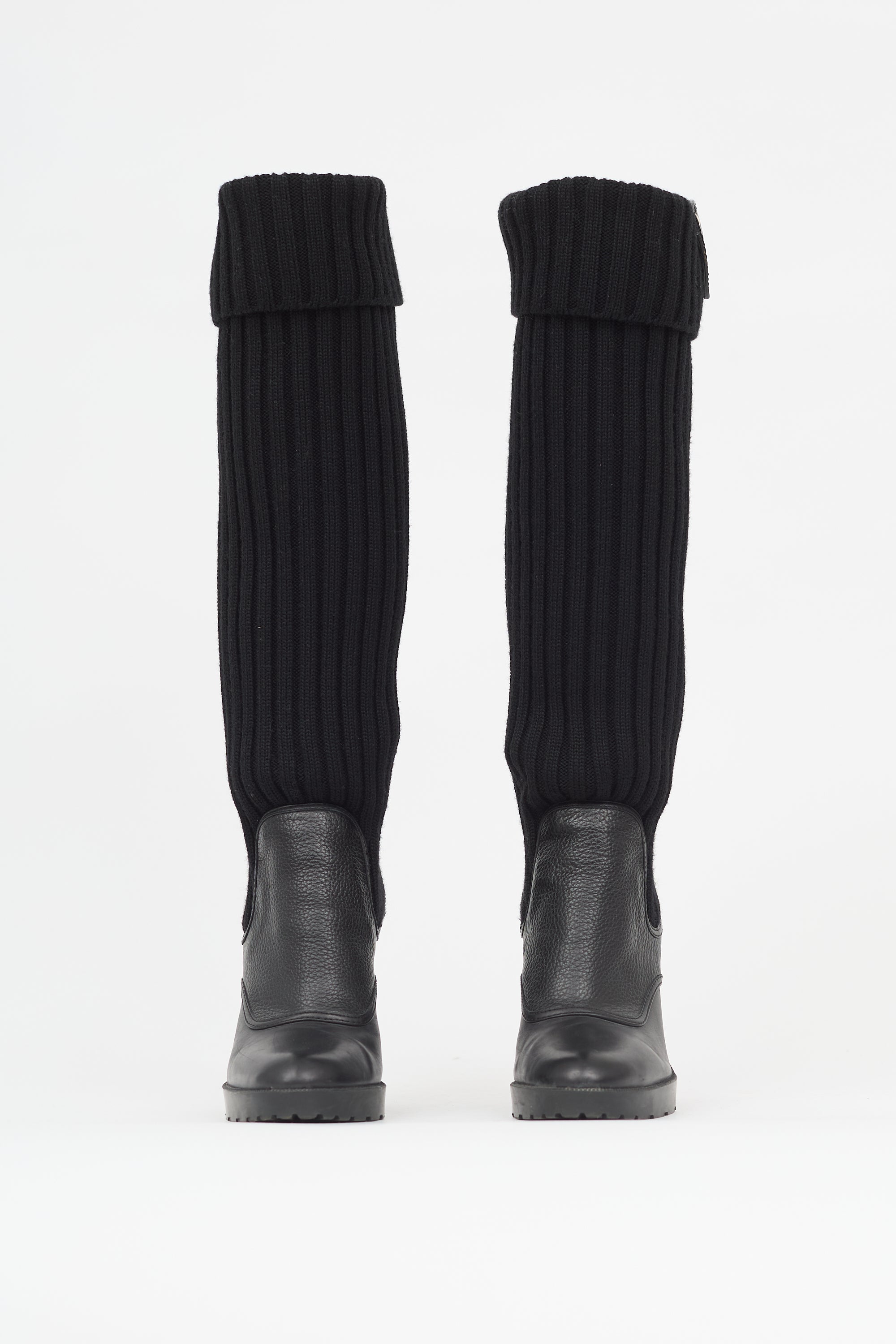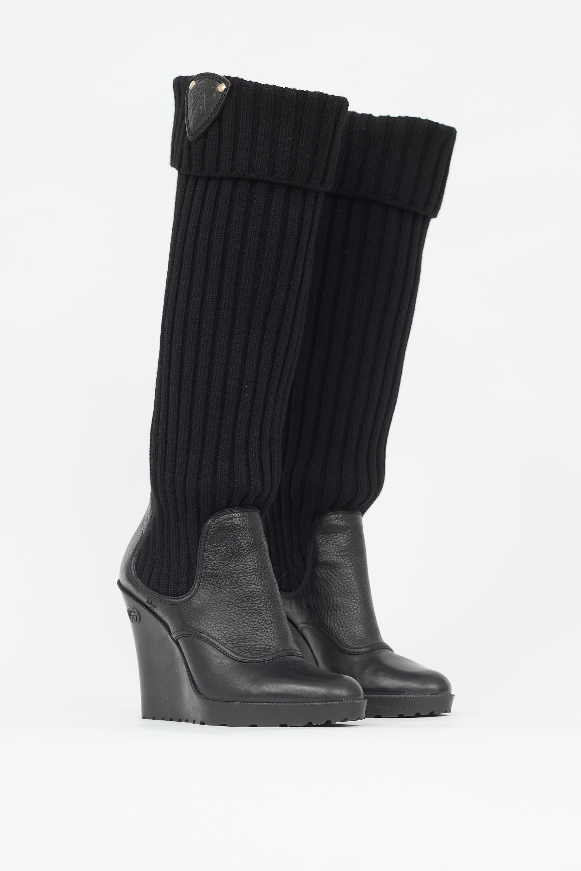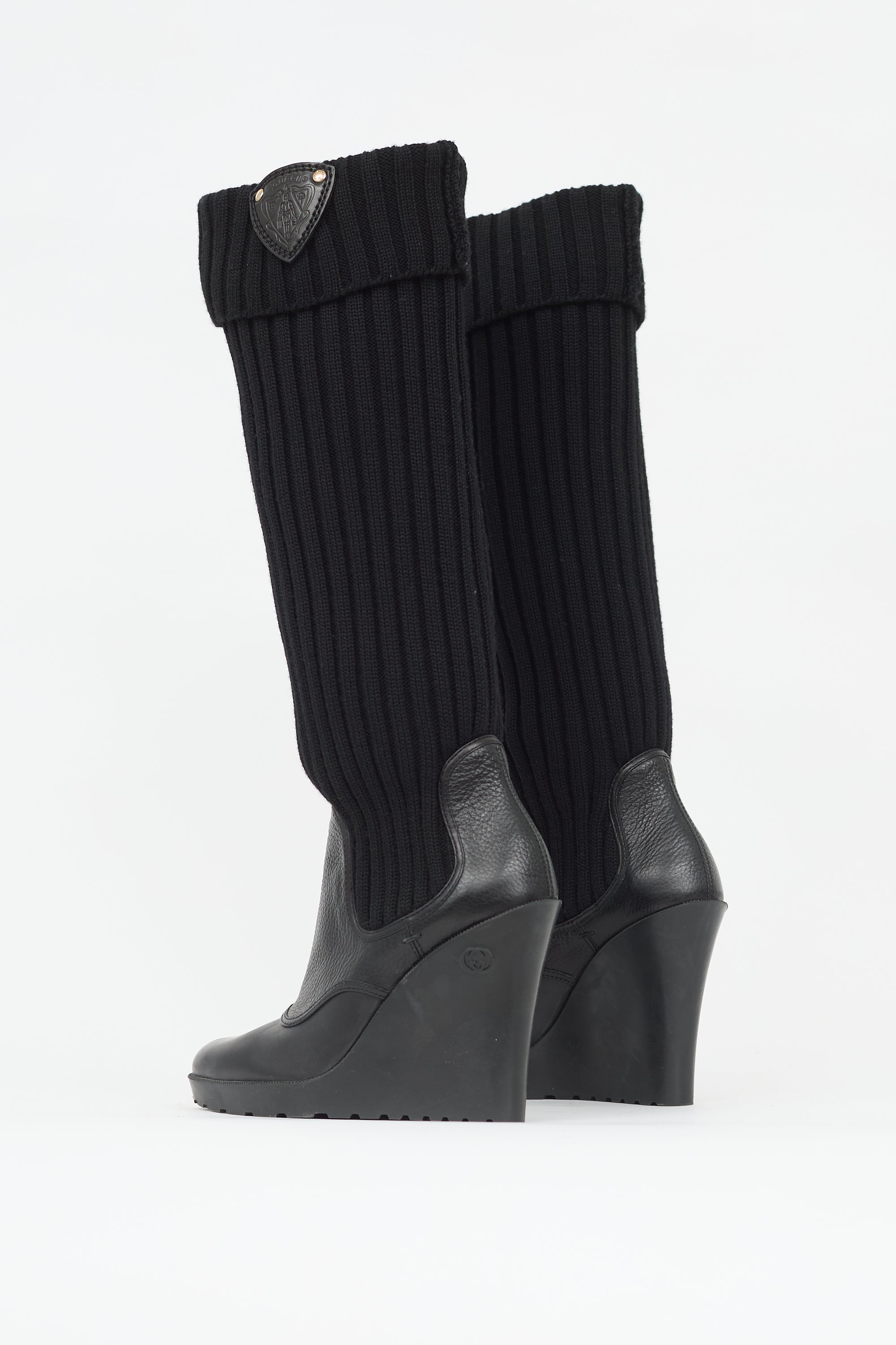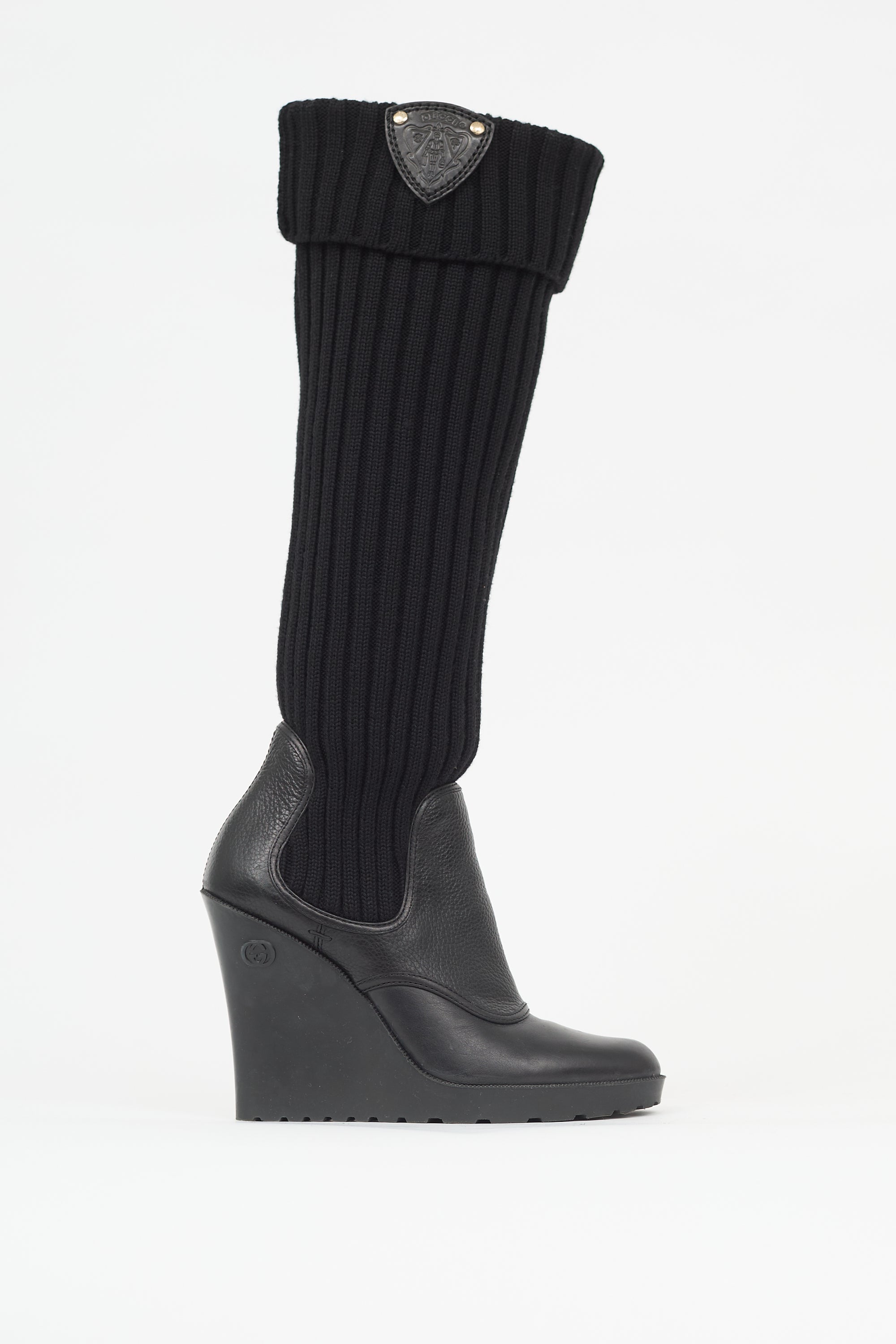 Pre-owned Gucci black leather boots featuring rounded toe, ribbed knit shaft with crest logo at back, and wedge heel with interlocking GG logo at side.