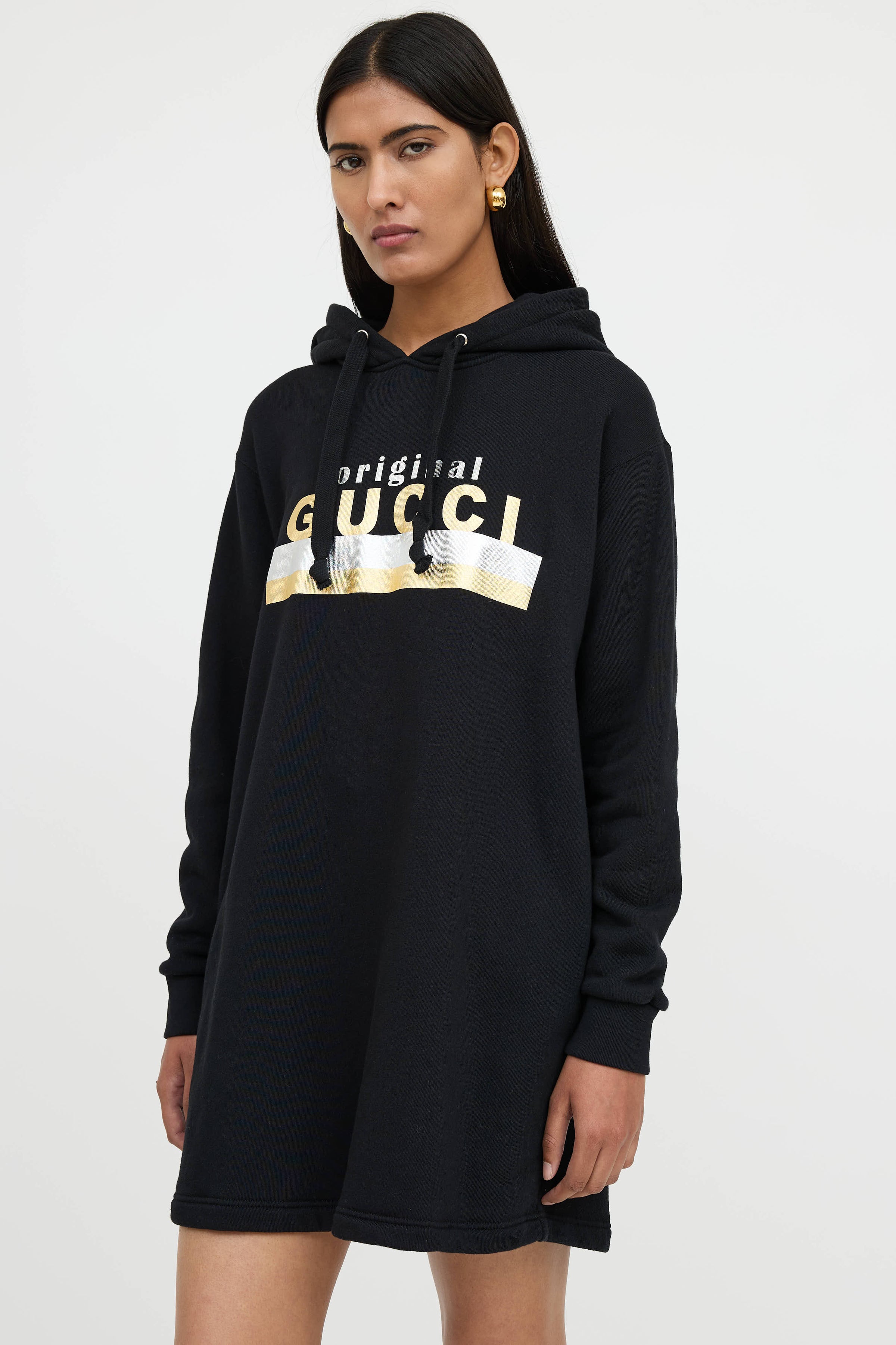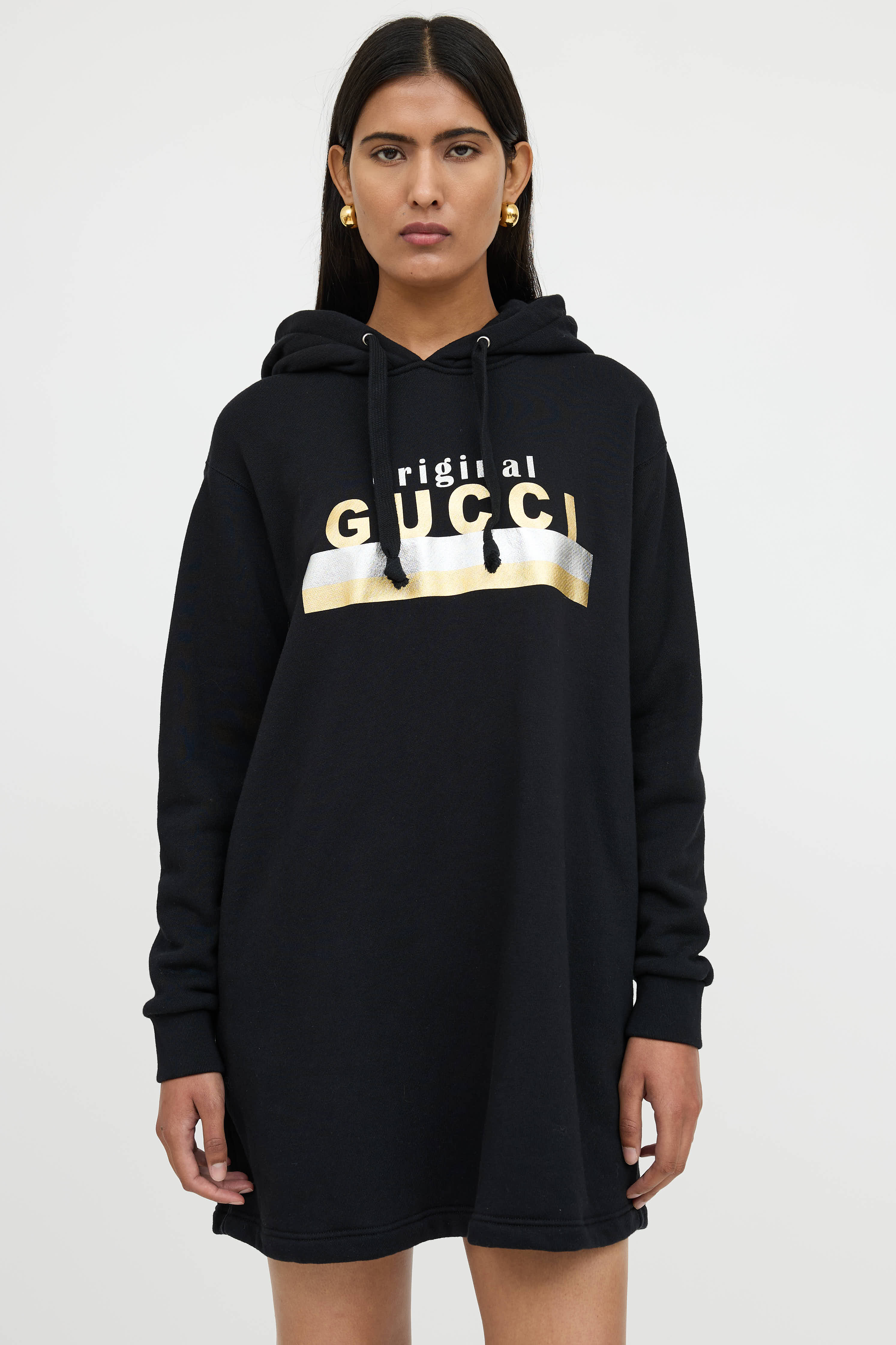 Pre-owned Gucci black sweater dress featuring a metallic original Gucci logo print at chest, drawstring hood, long sleeves, and two slip pockets at hip.