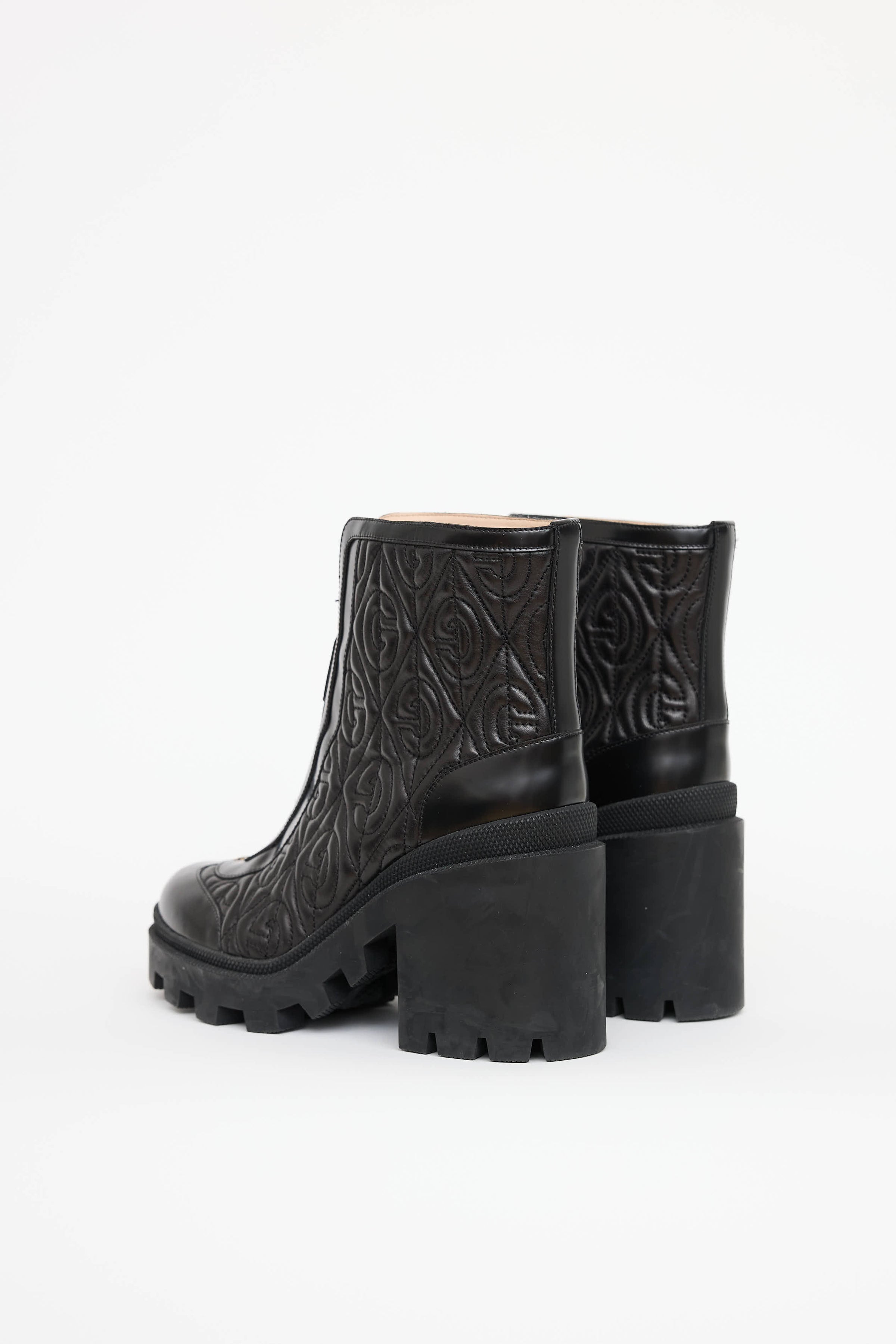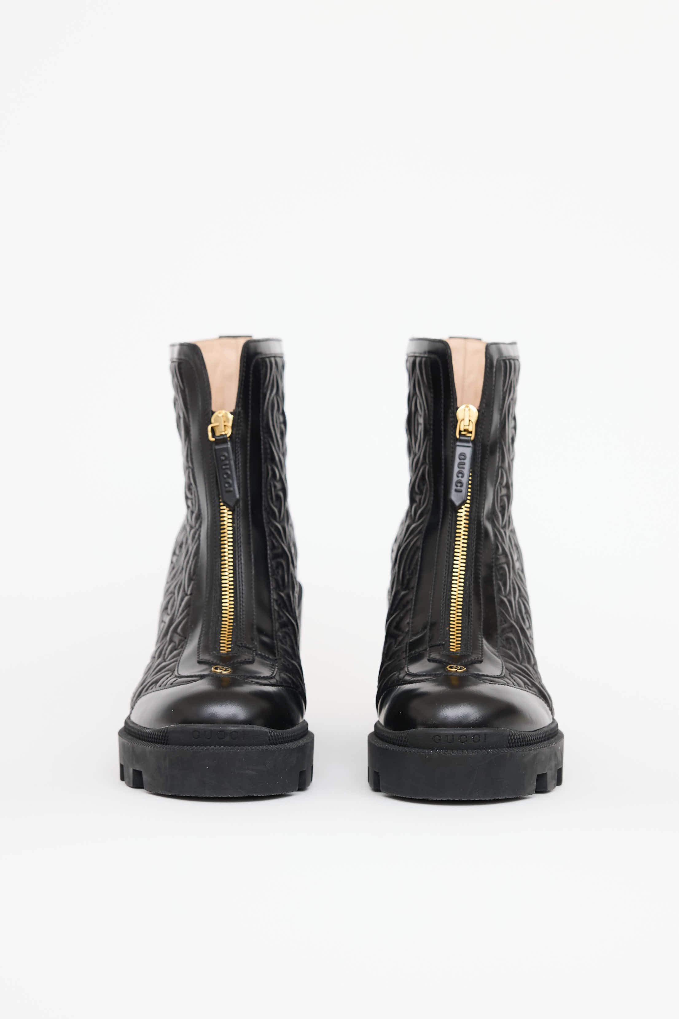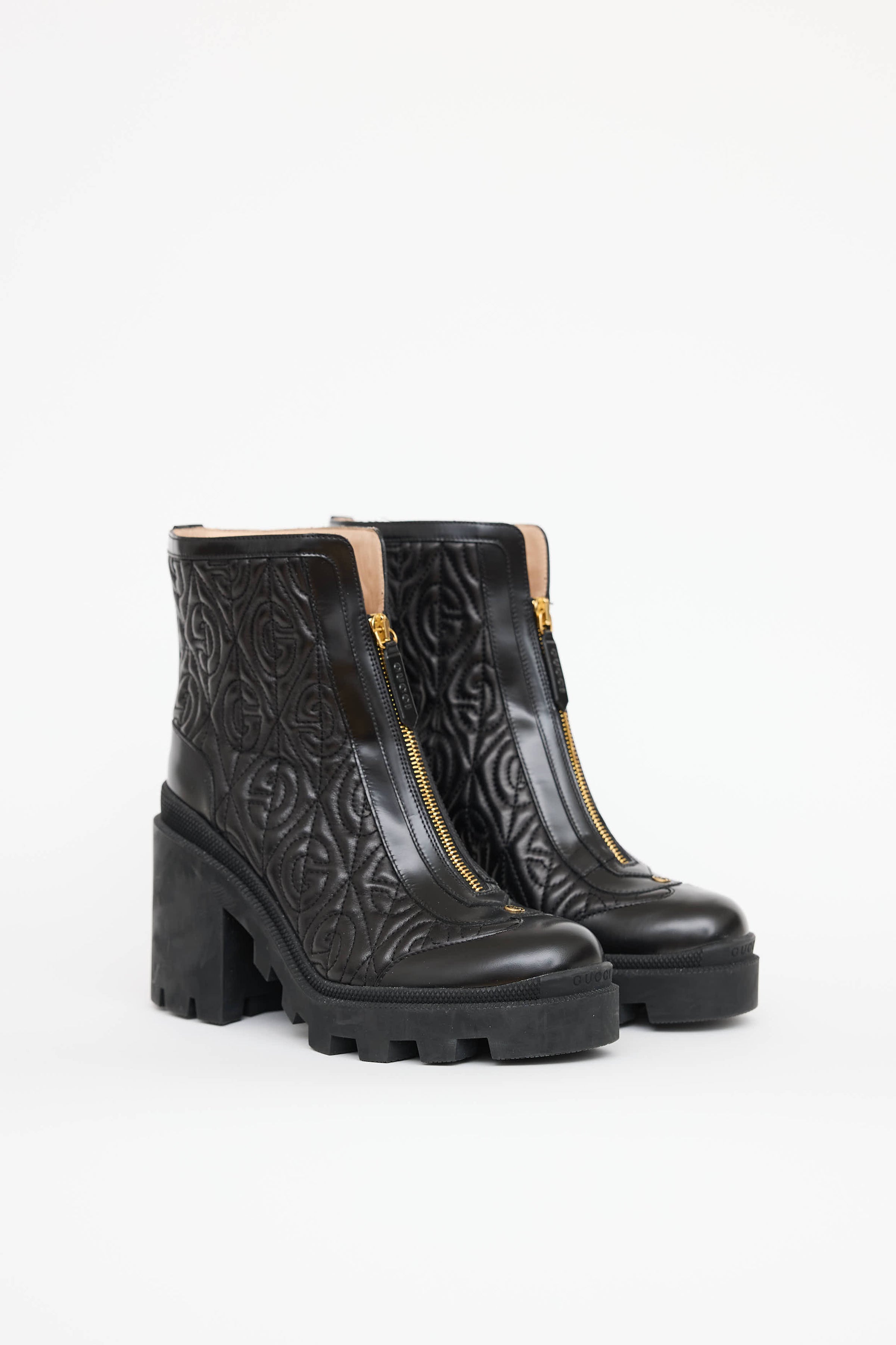 Pre-owned Gucci black leather boot featuring round toe, gold tone GG logo at vamp, quilted logo upper, zip closure at front with embossed logo pull tab, platform heel, and treaded sole.