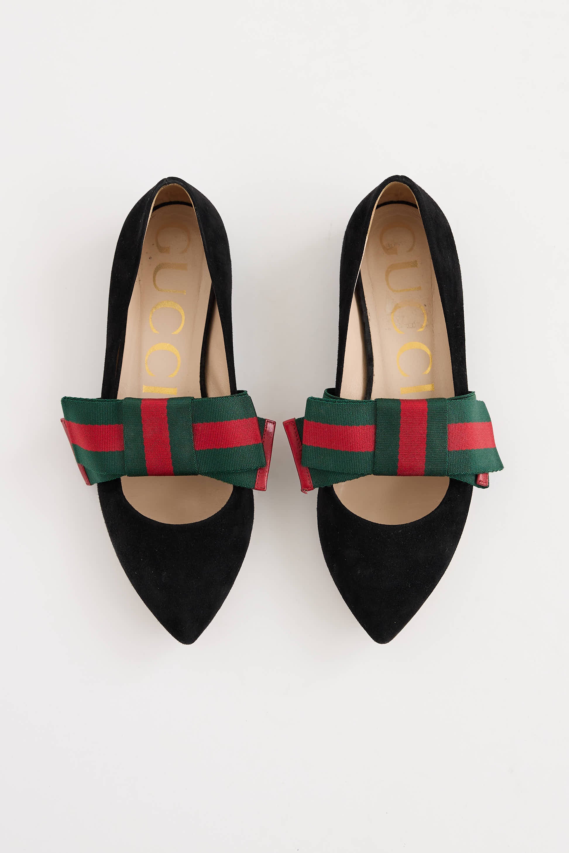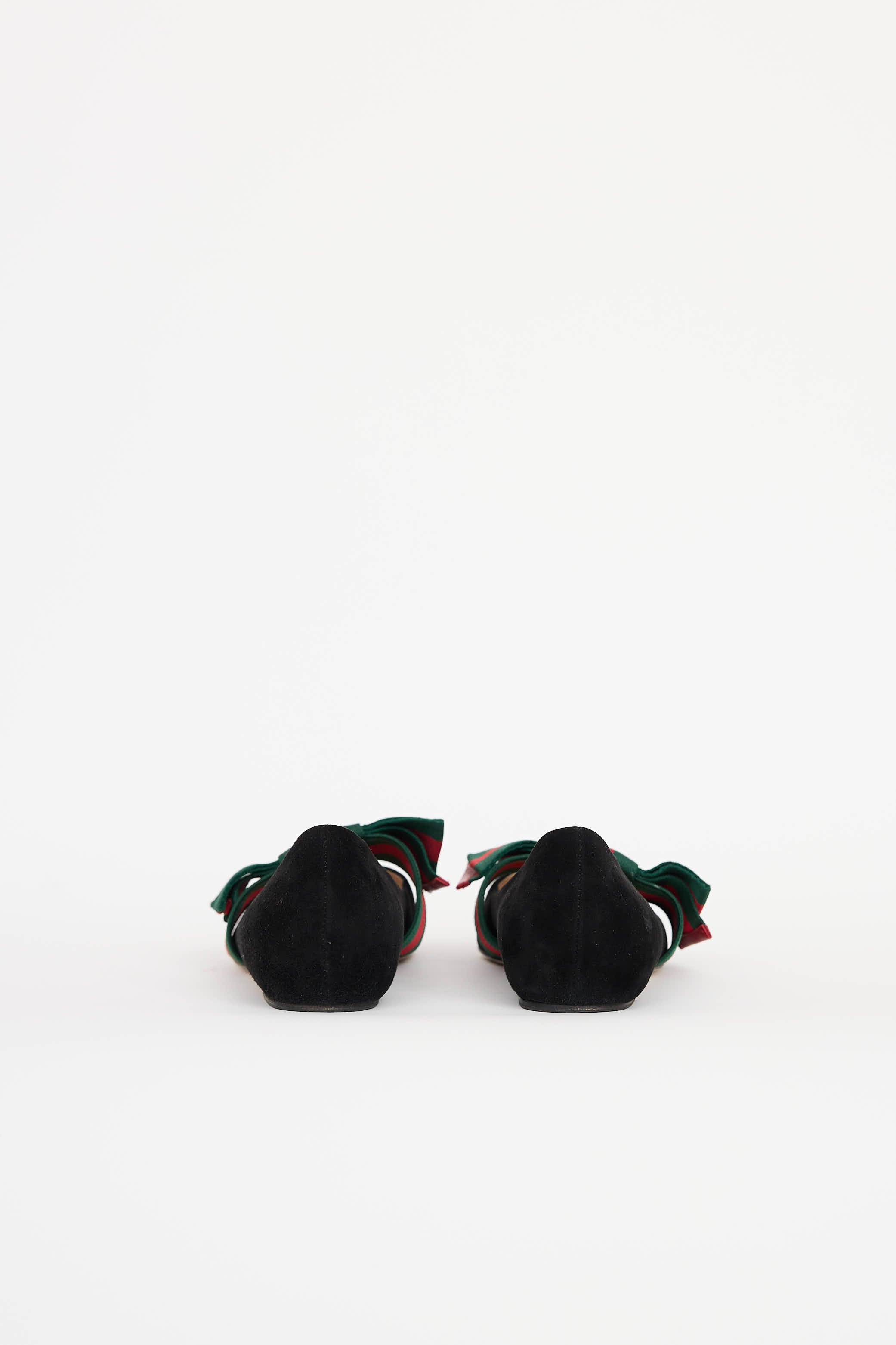 Pre-owned Gucci black flats featuring a pointed toe, slip on entry, suede upper and a green and red webbed bow with elastic strap.