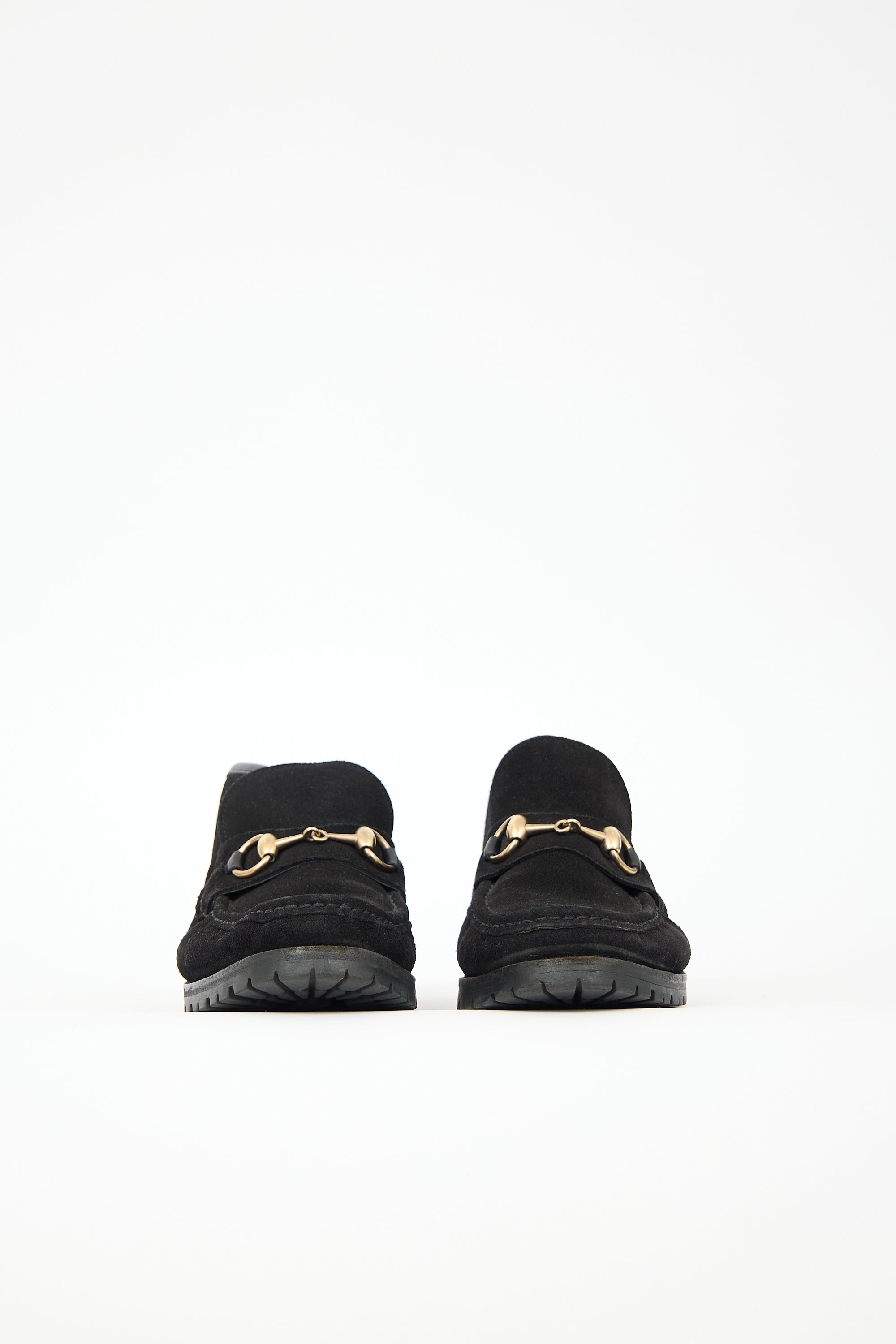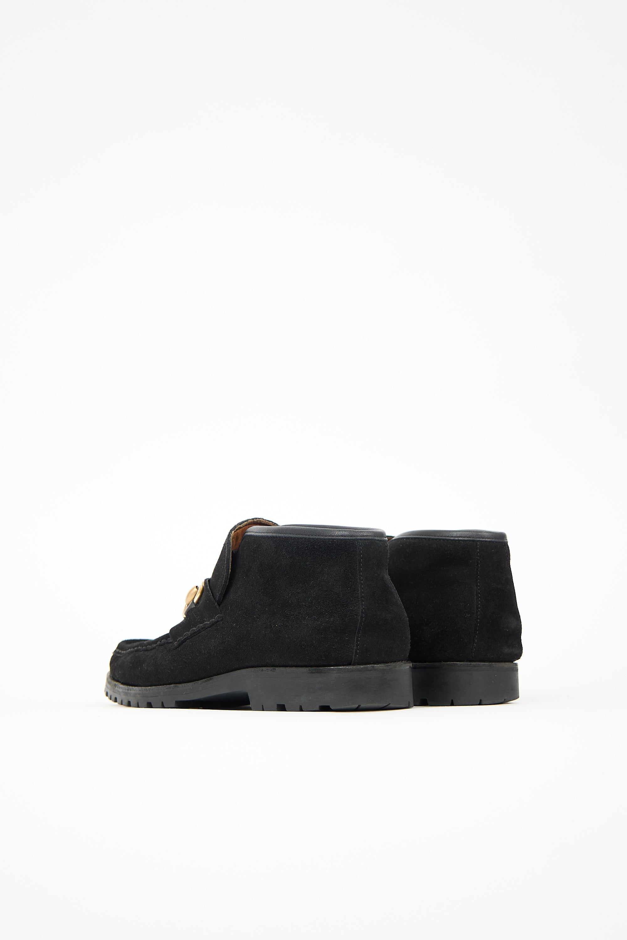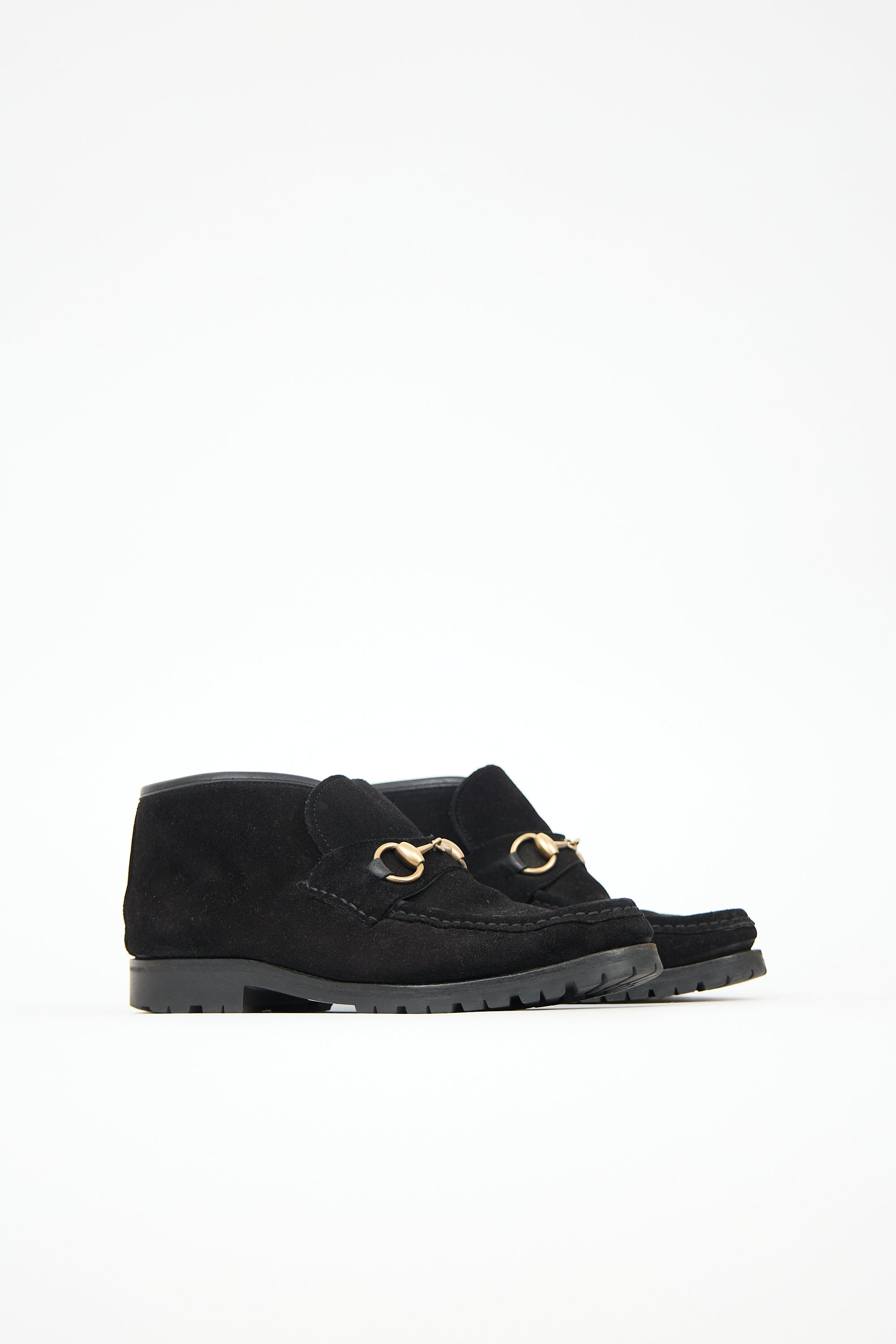 Pre-owned Gucci black suede Sylke boots featuring rounded toe, gold tone Horsebit instep embellishment and treaded rubber sole.