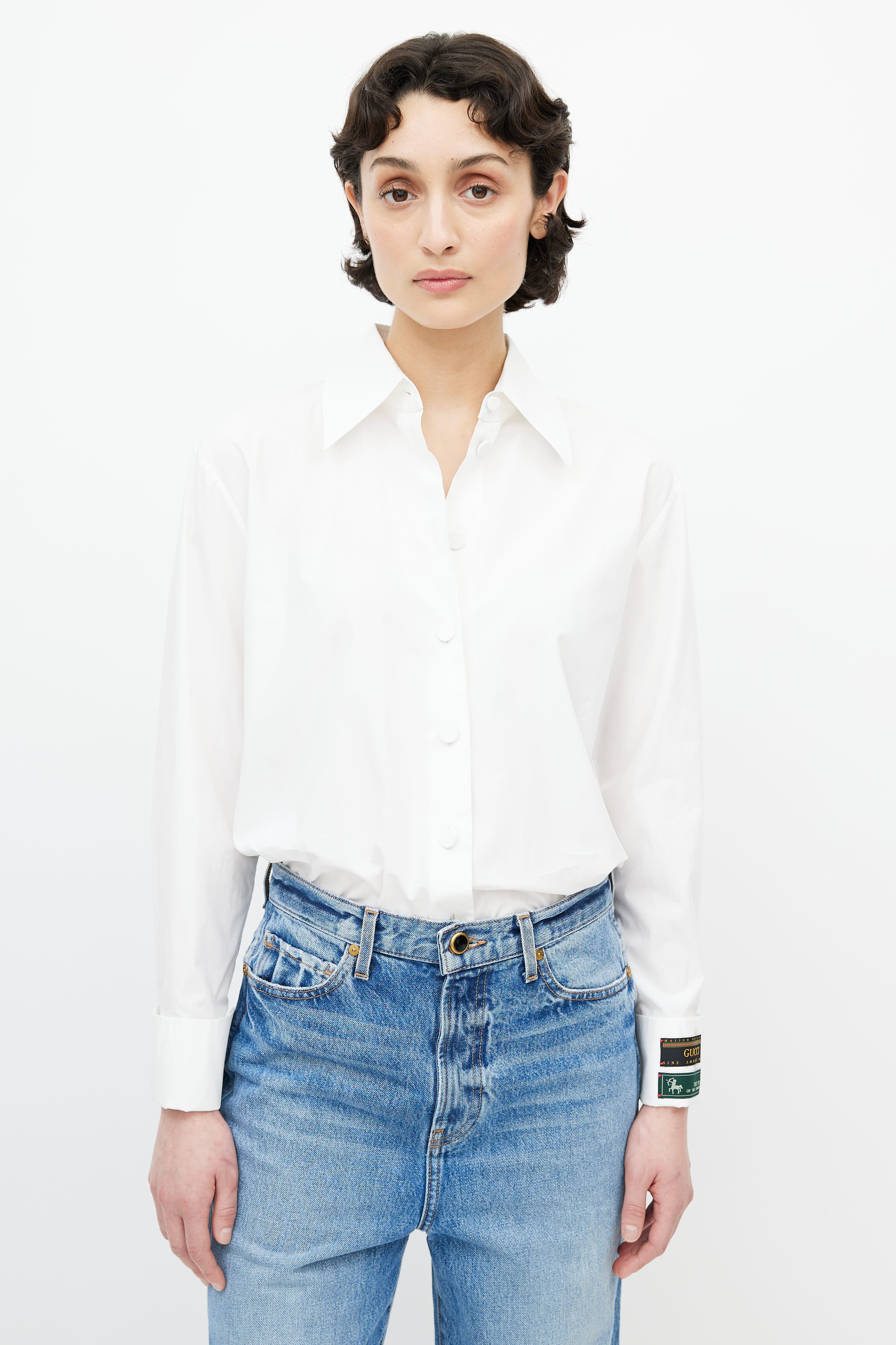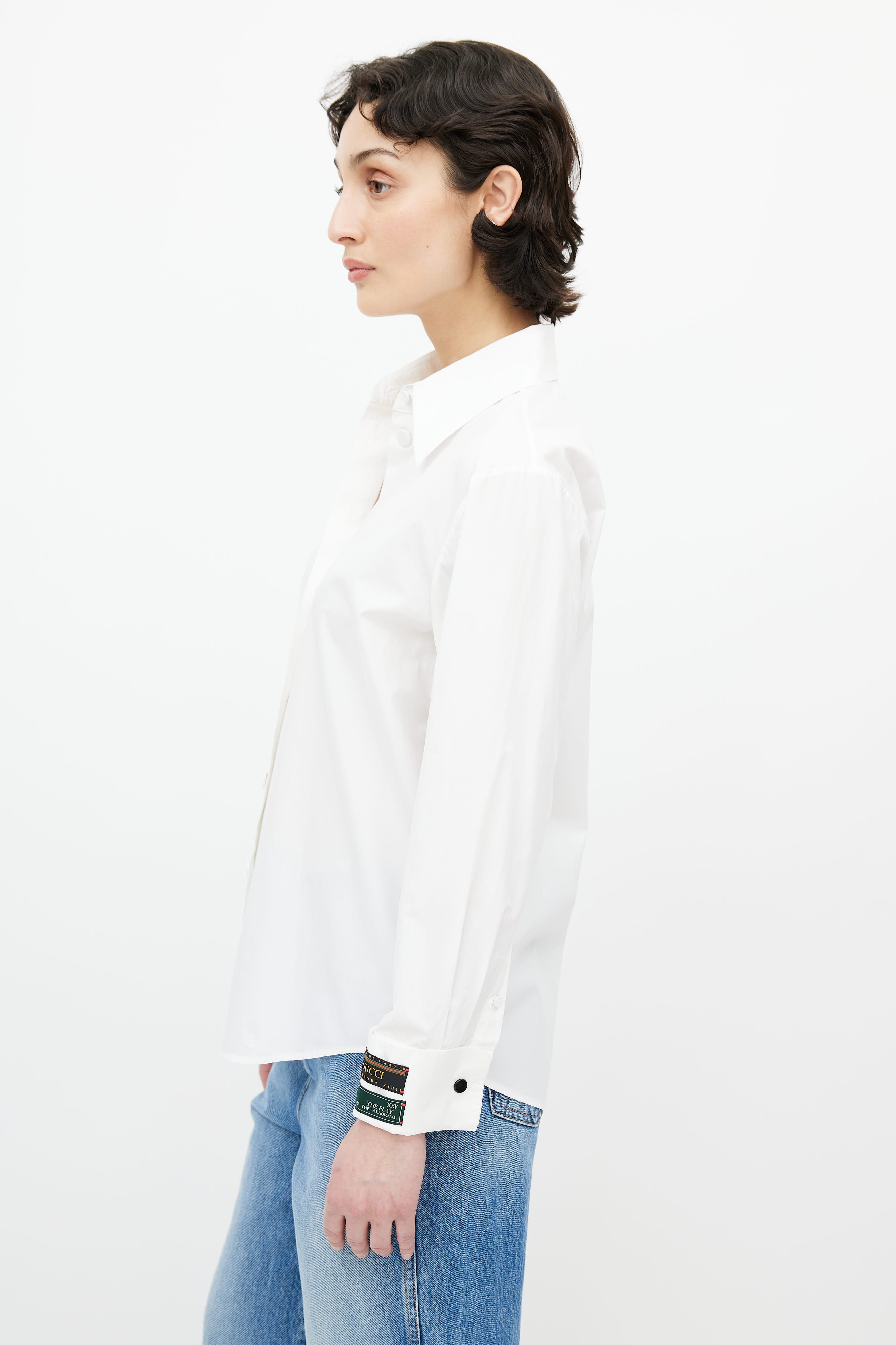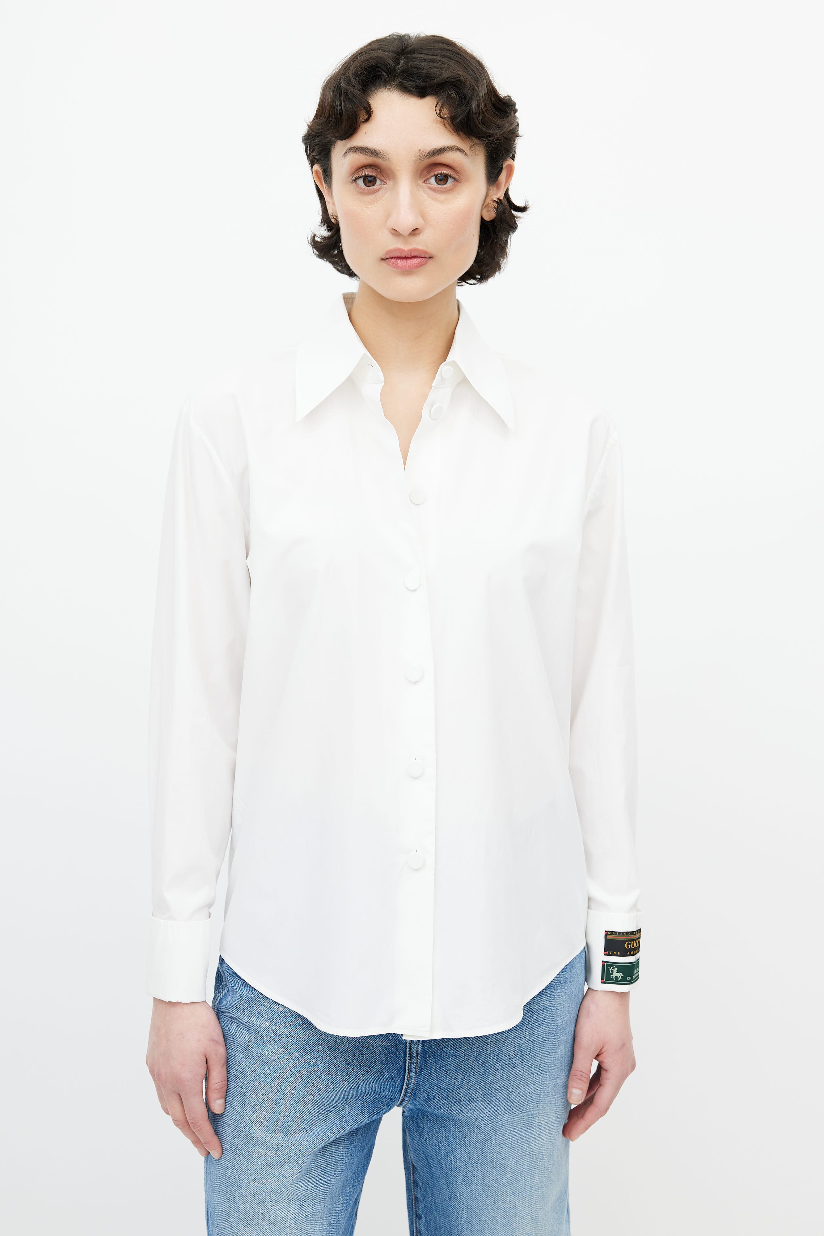 Pre-owned Gucci white cotton shirt featuring pointed collar, long sleeves with french cuffs featuring embroidered patches, and button closure at front.