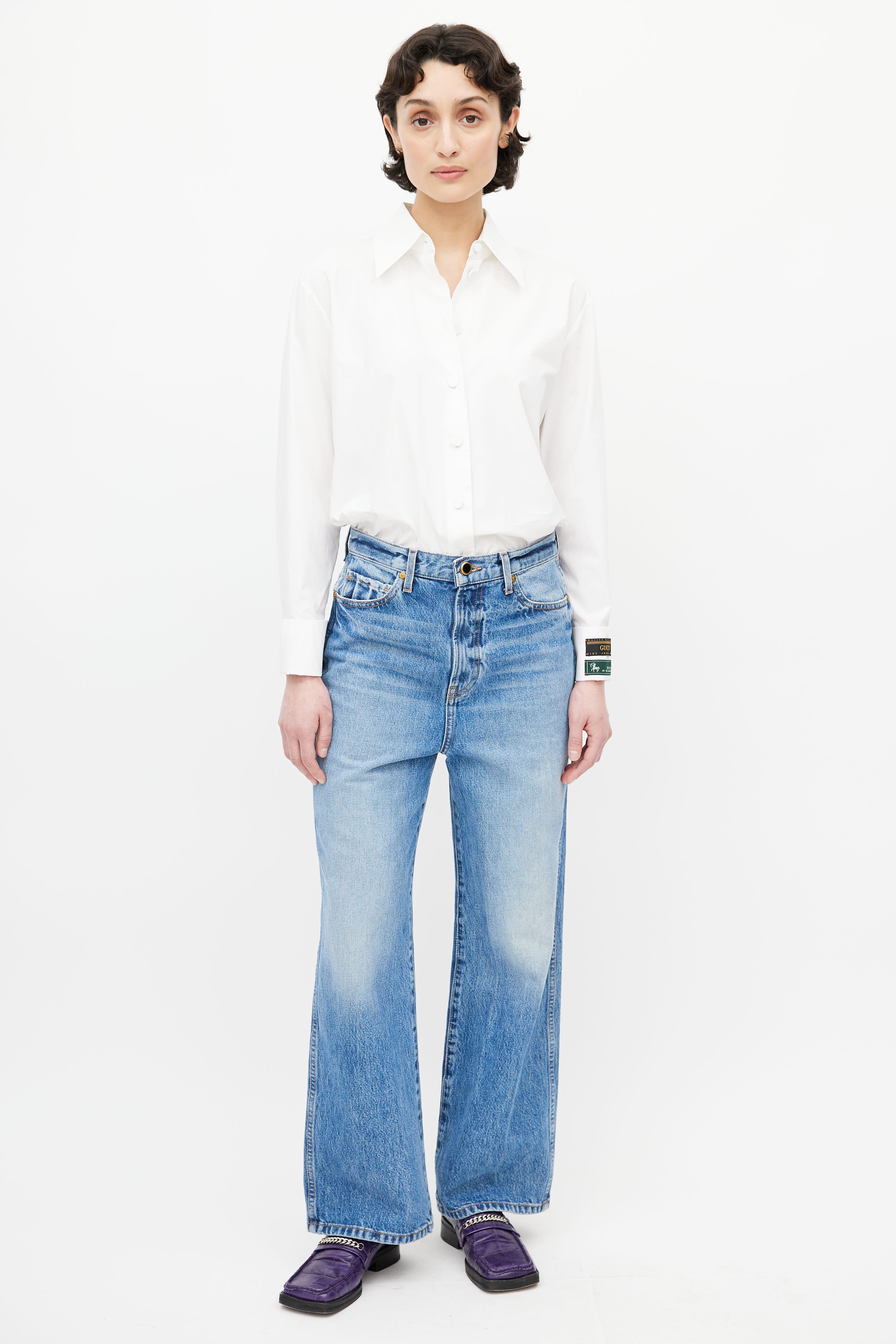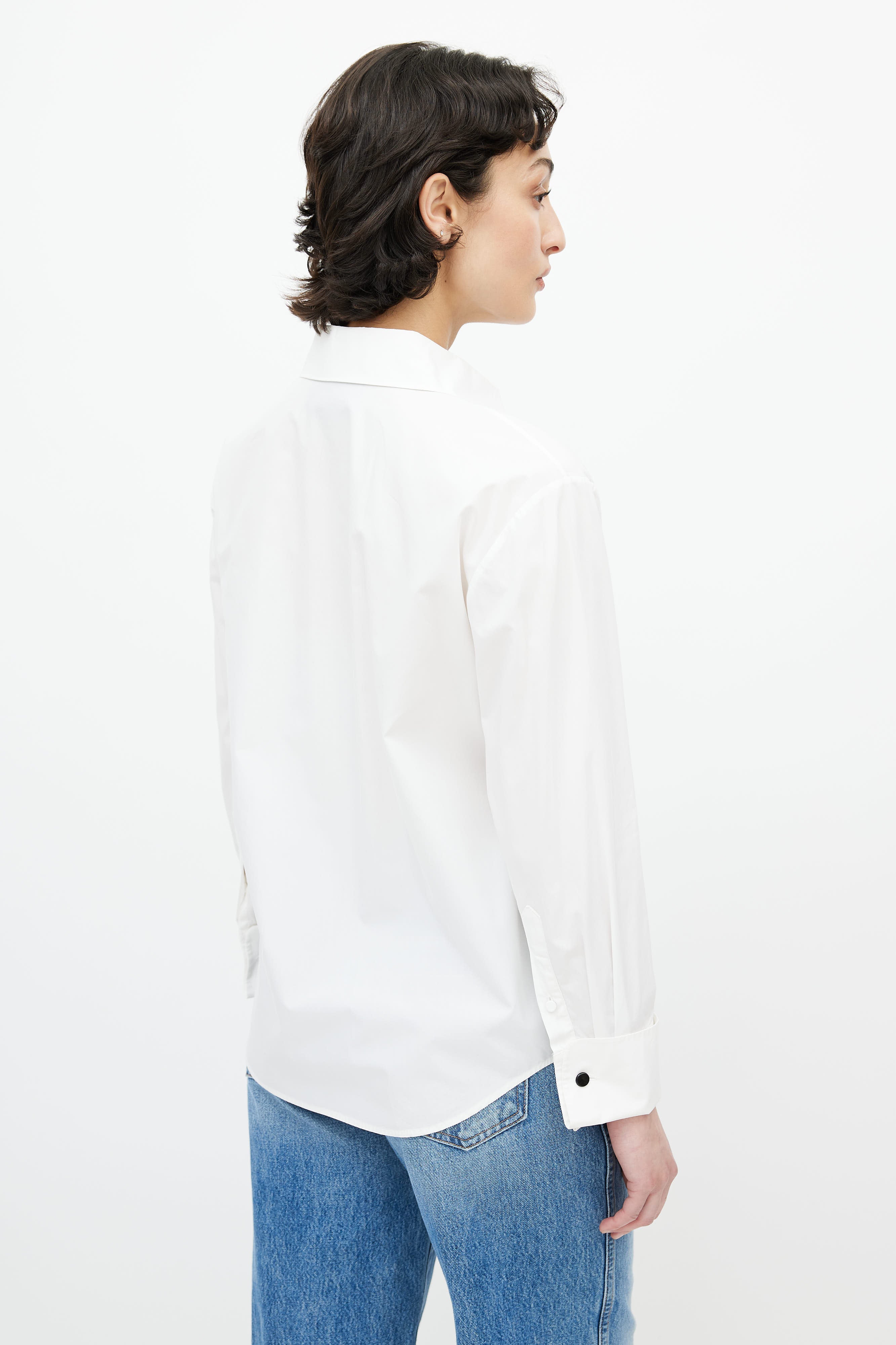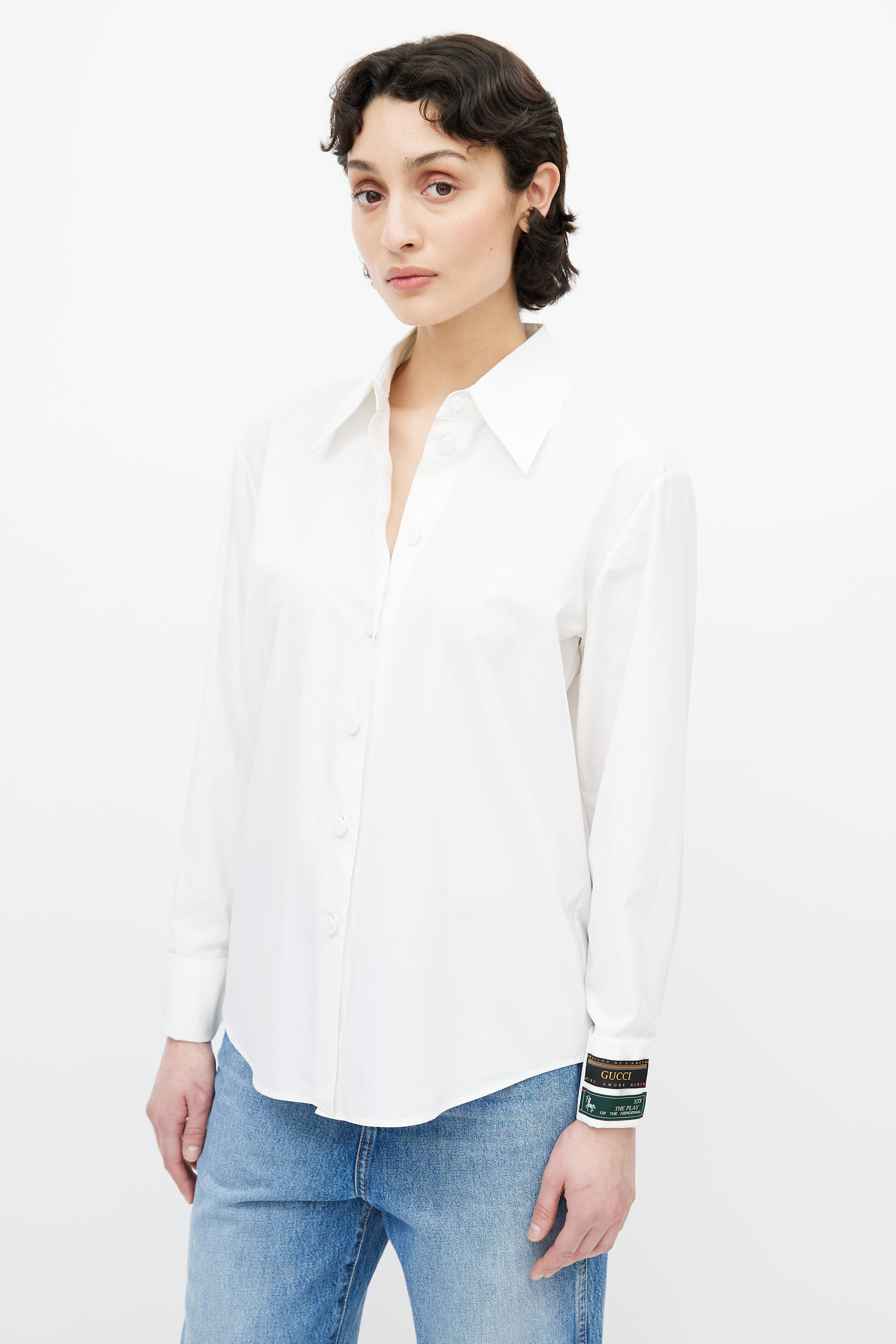 Pre-owned Gucci white cotton shirt featuring pointed collar, long sleeves with french cuffs featuring embroidered patches, and button closure at front.