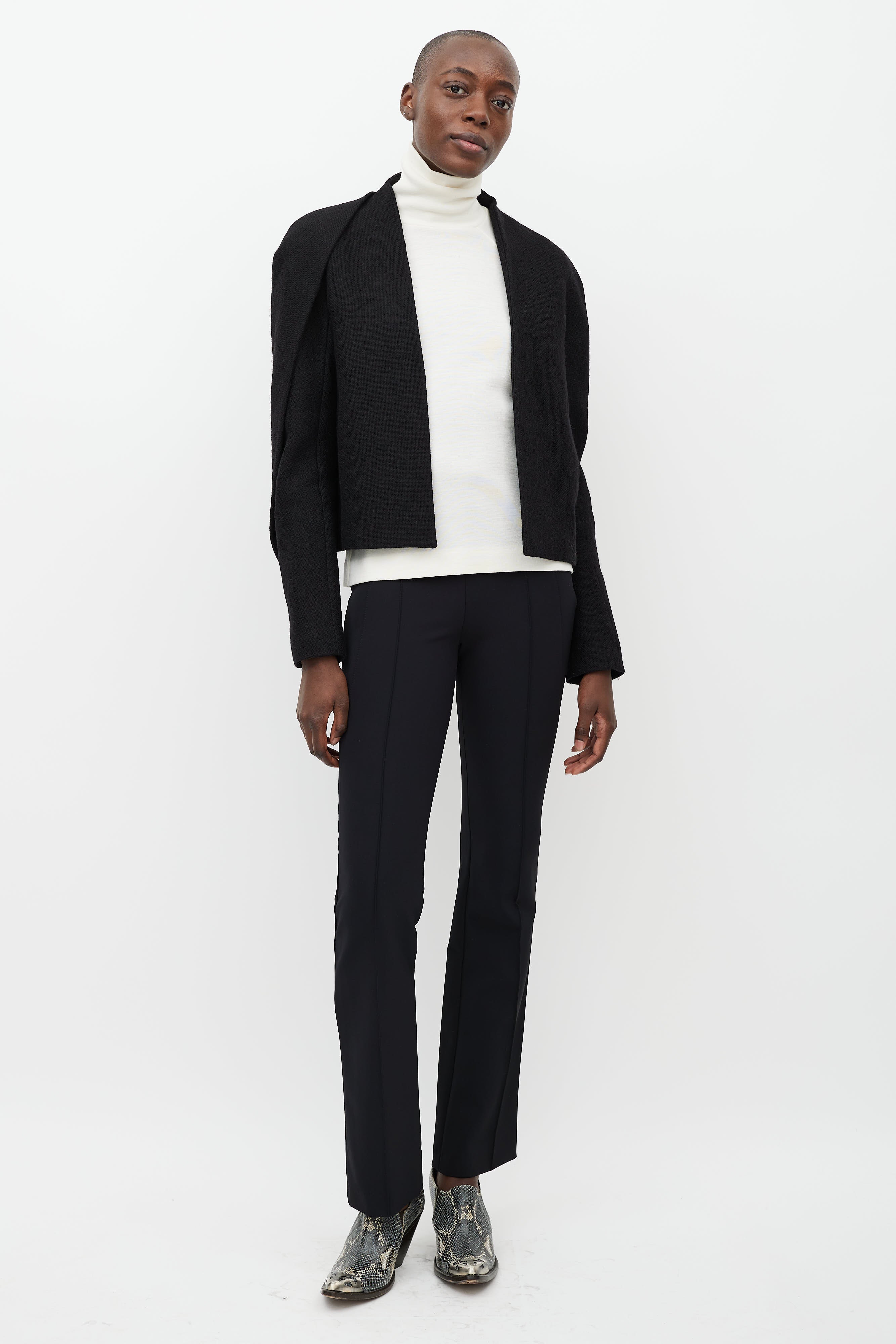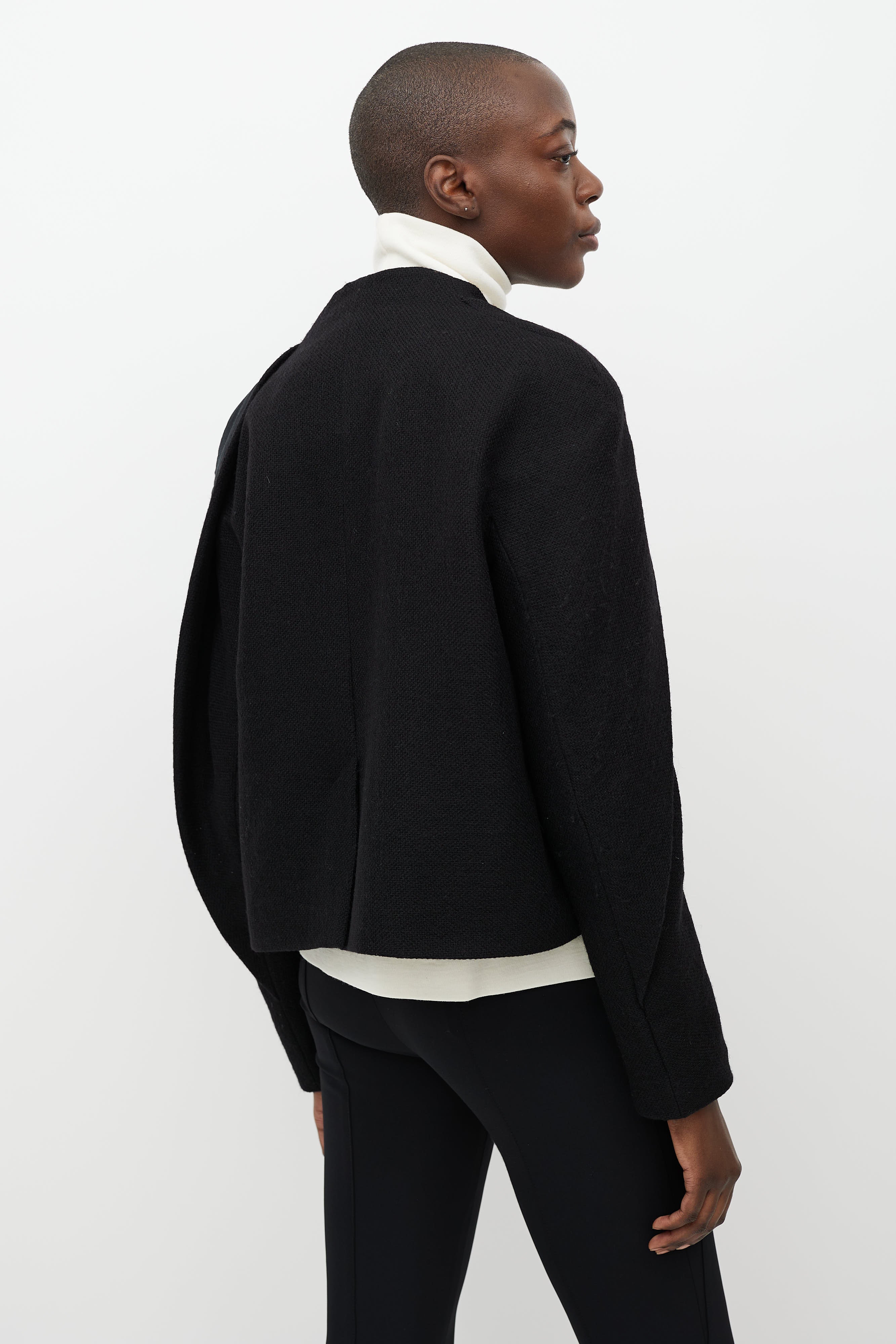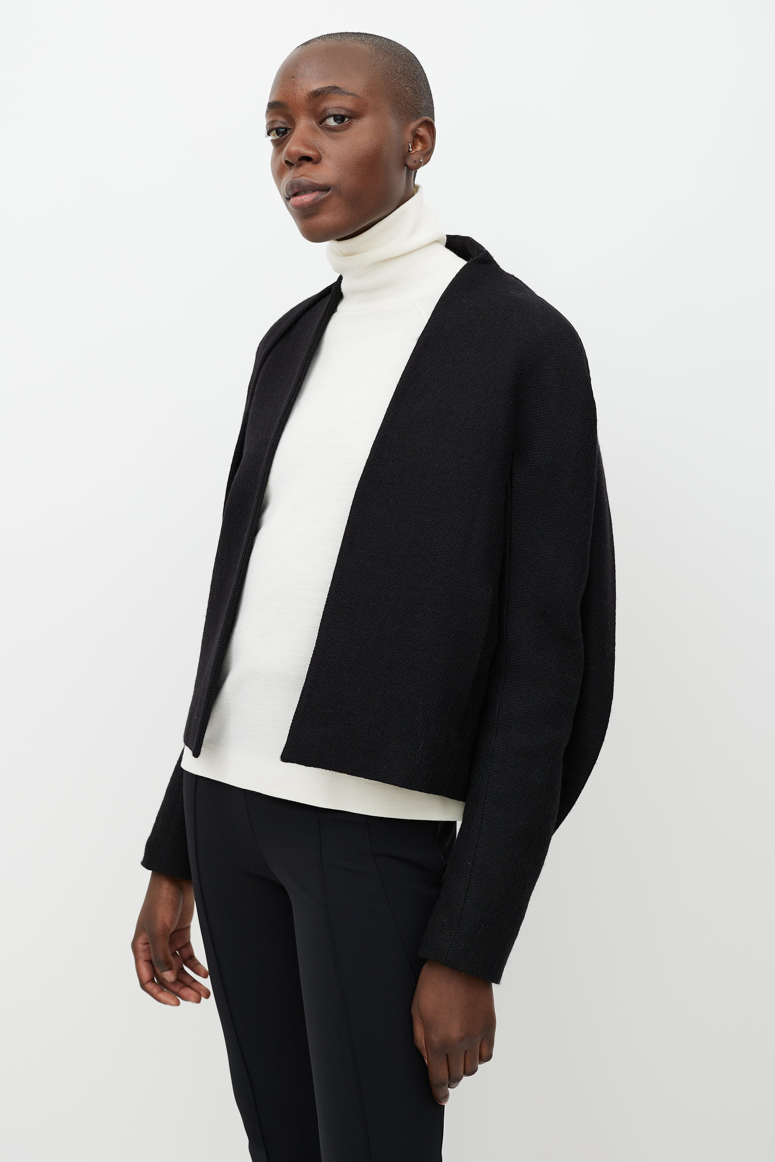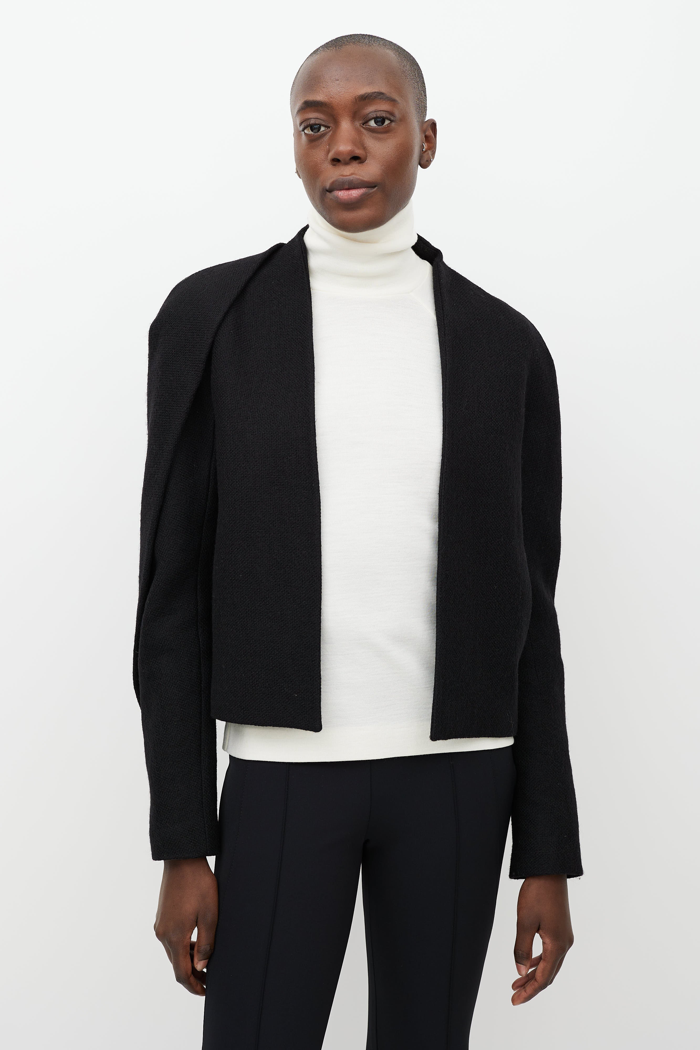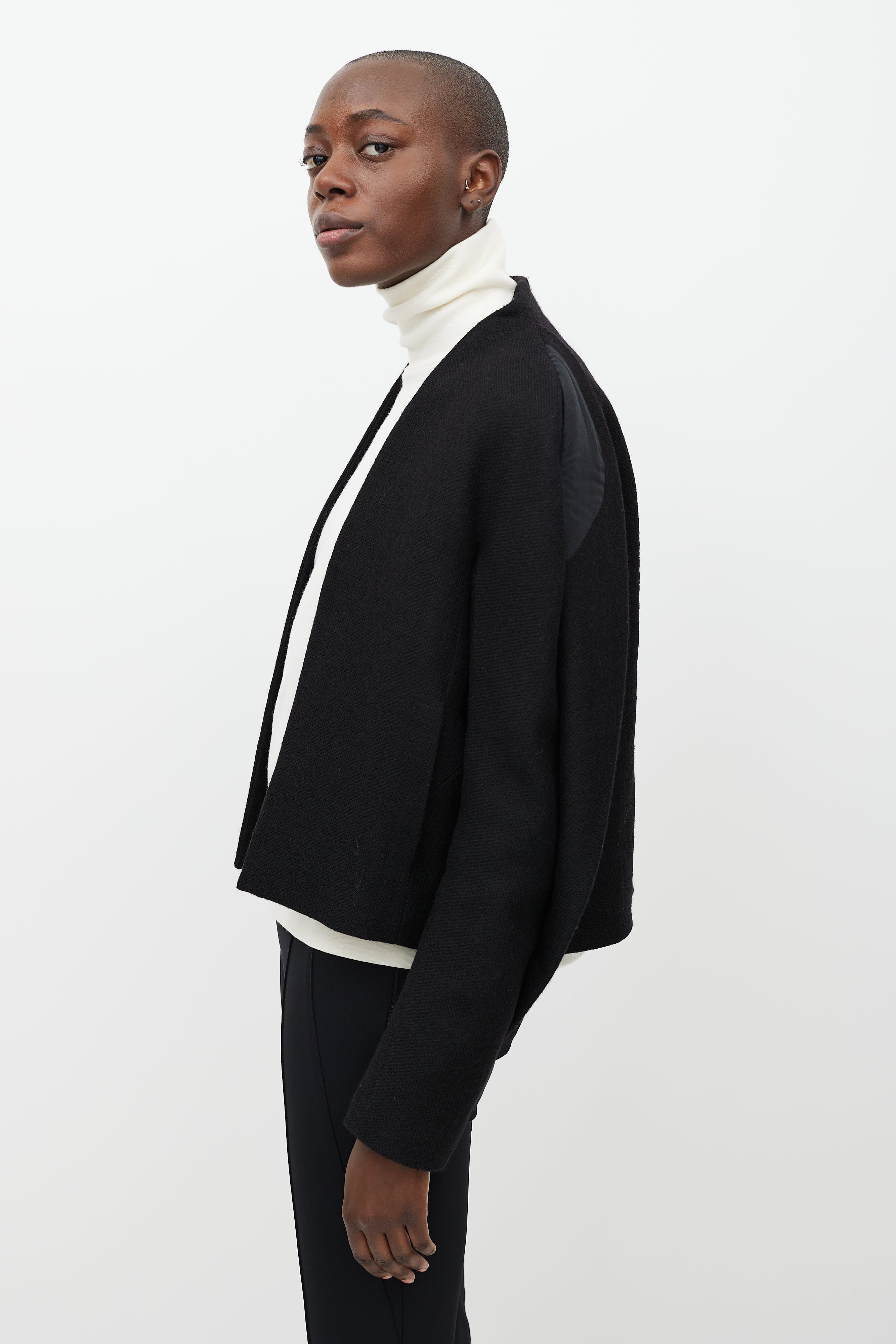 Pre-owned Haider Ackermann black wool jacket featuring a V-neckline, long sleeves, two slip pockets at hip, and open front. Lined.