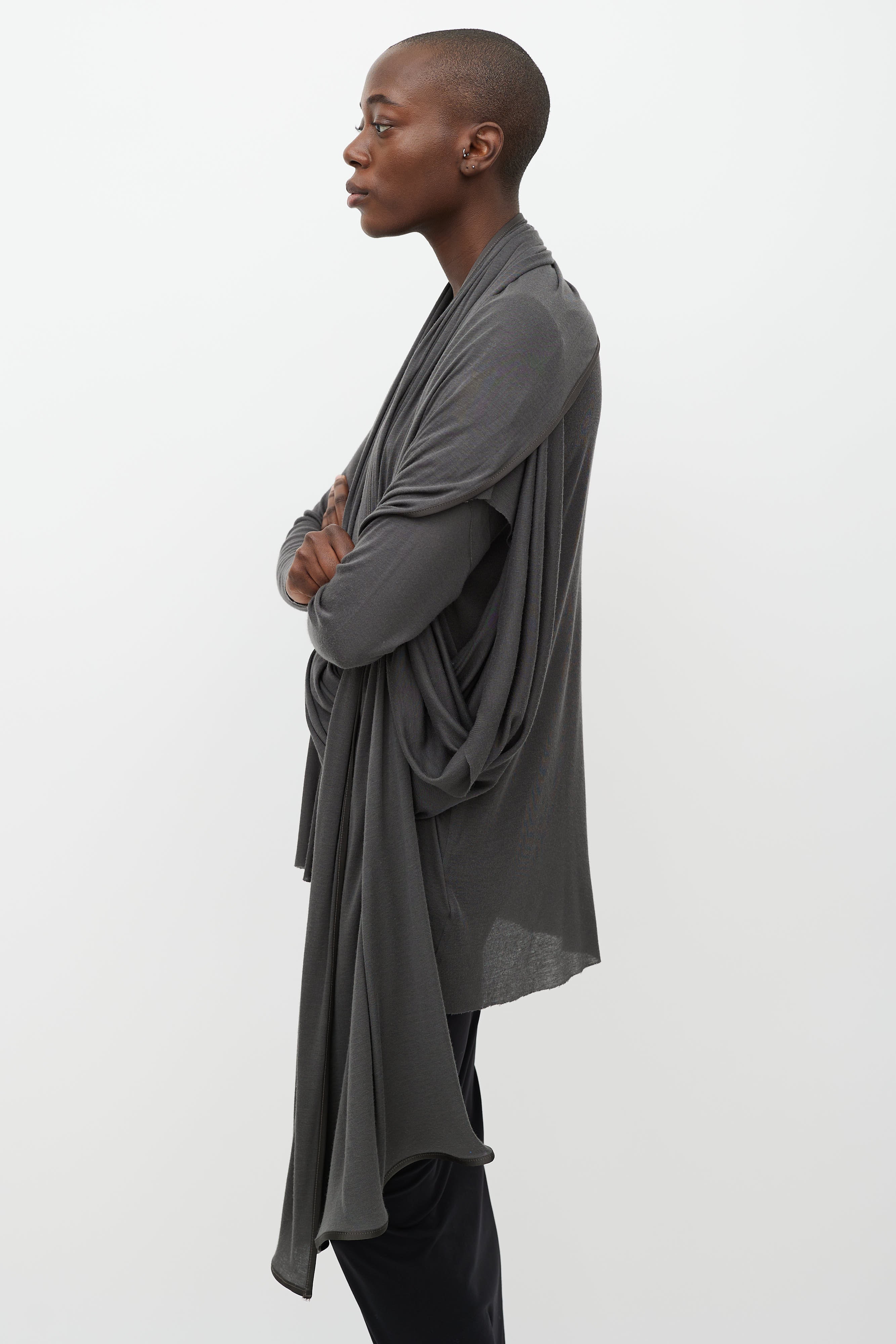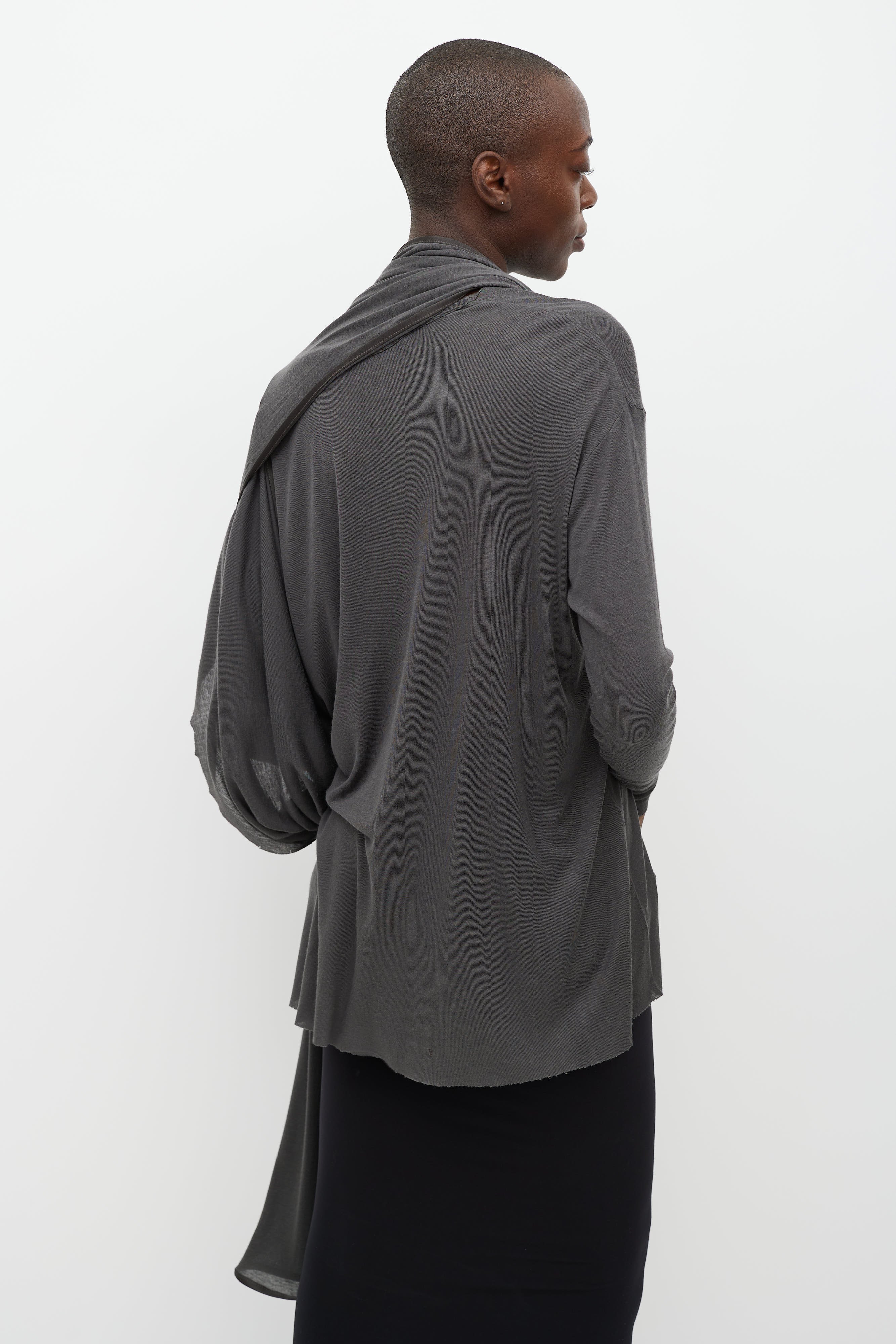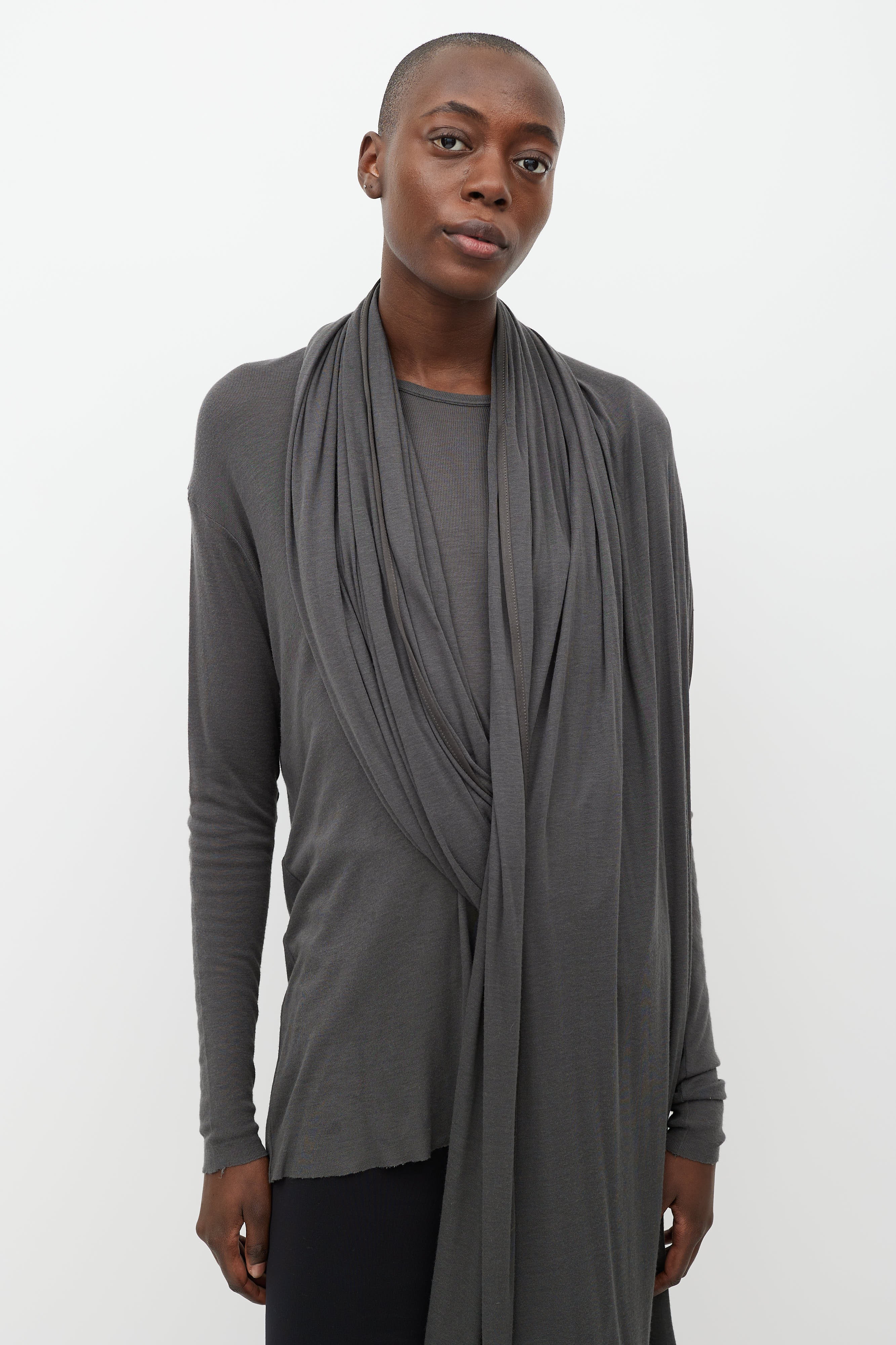 Pre-owned Haider Ackermann grey top featuring a round neckline, and long sleeves with drop shoulder. Matching scarf features an arm hole, and draped detailing.