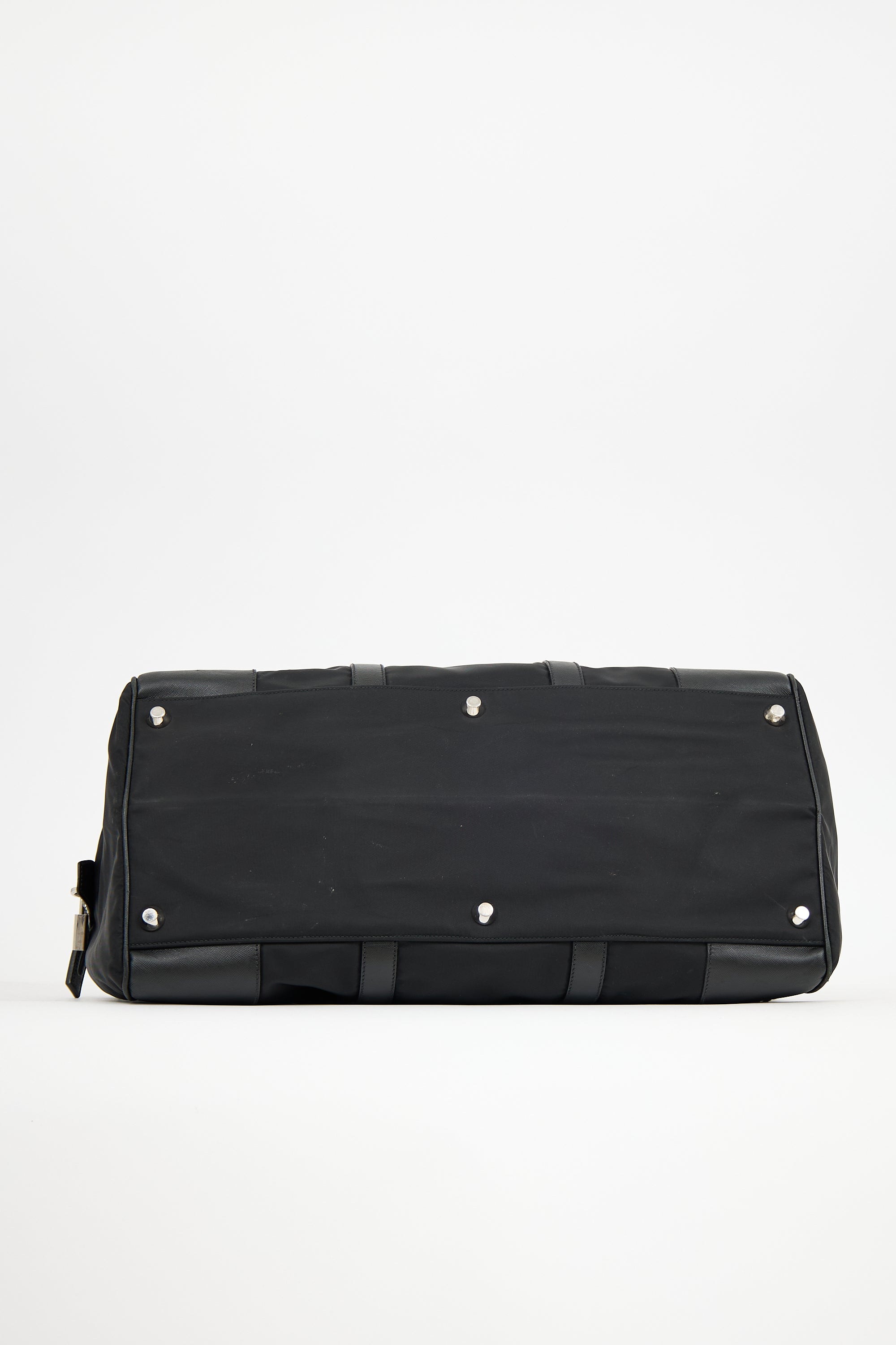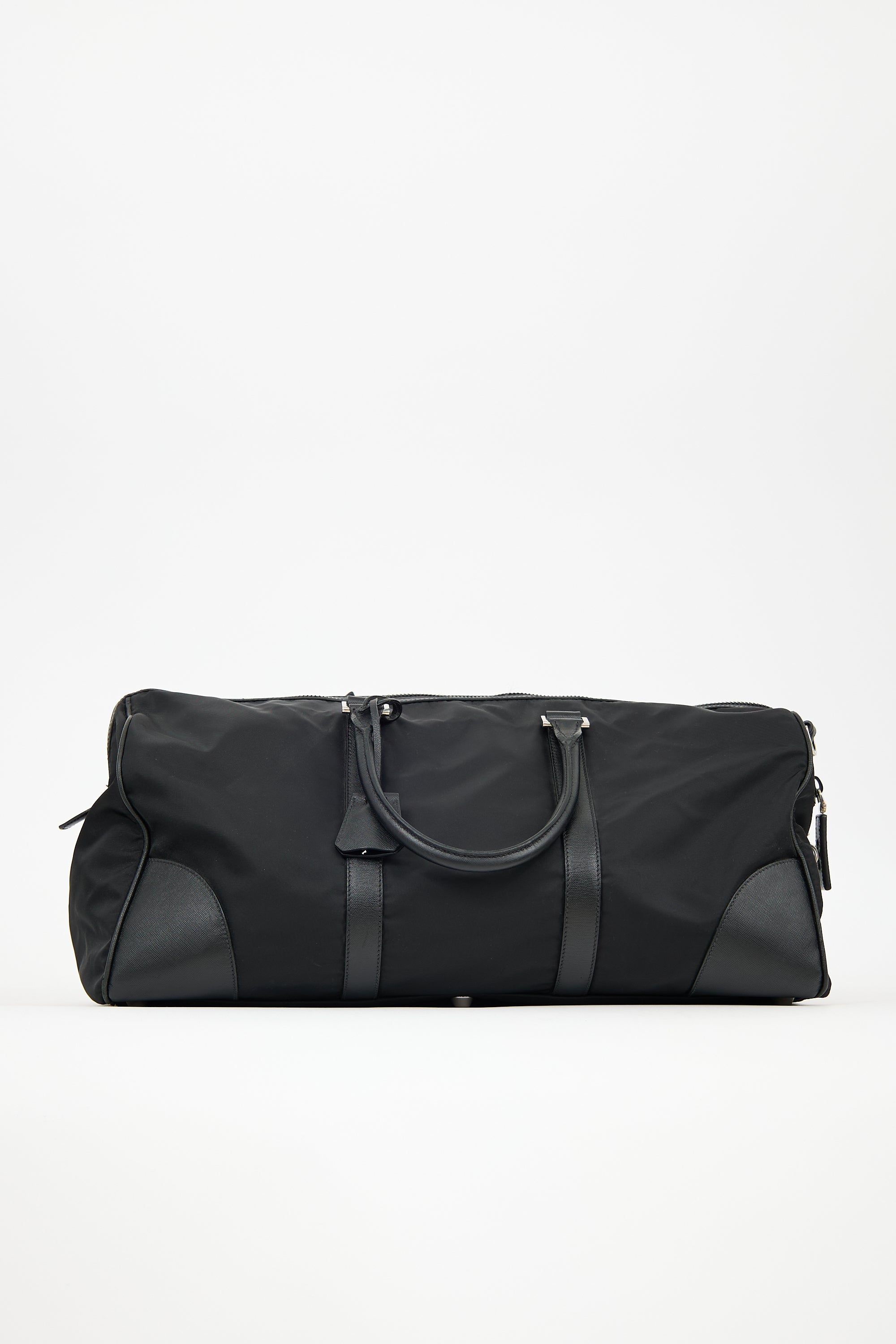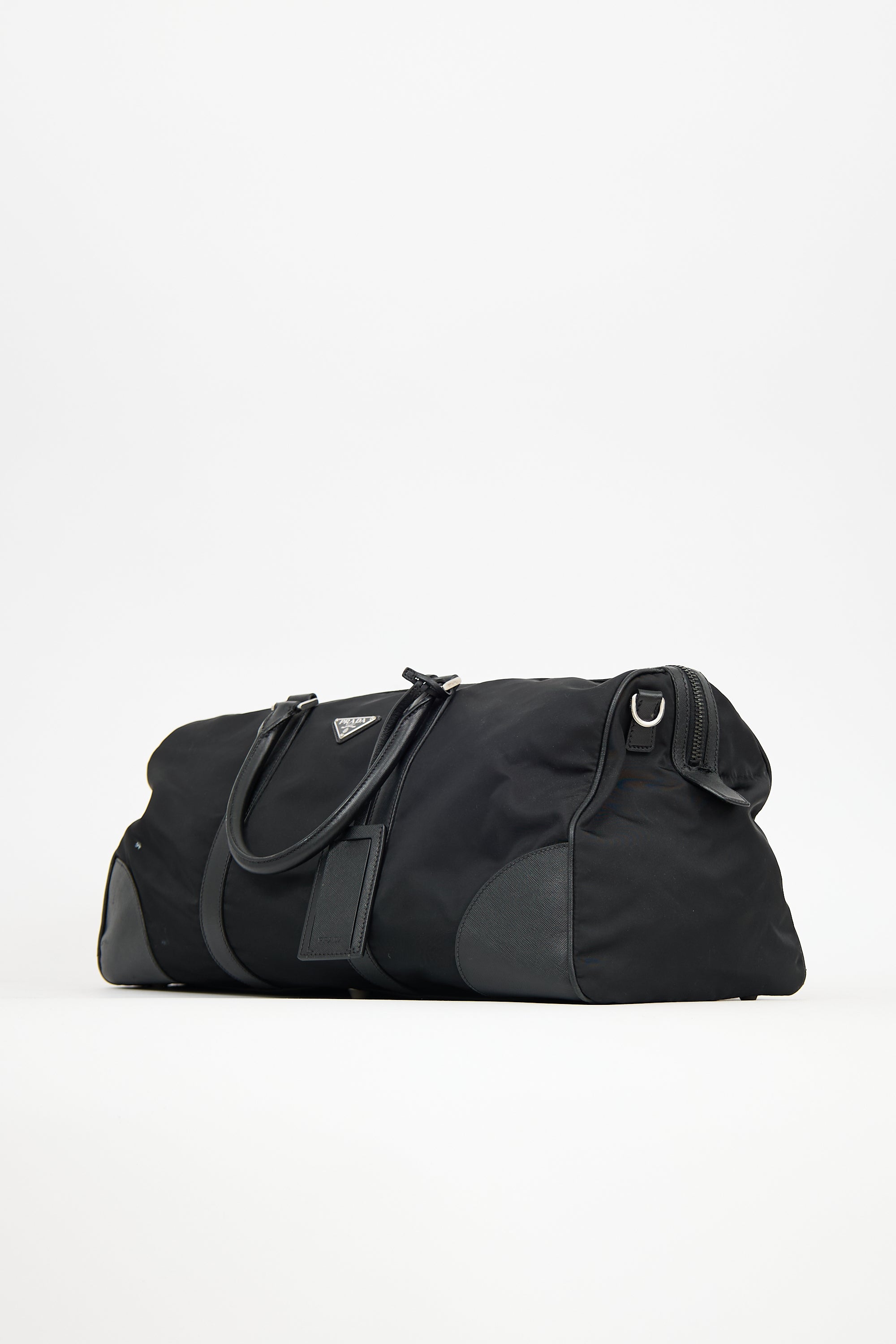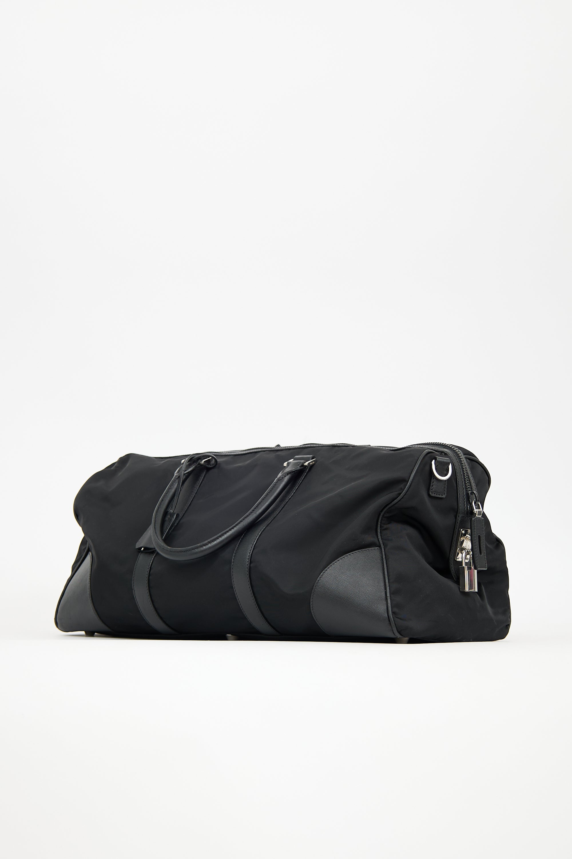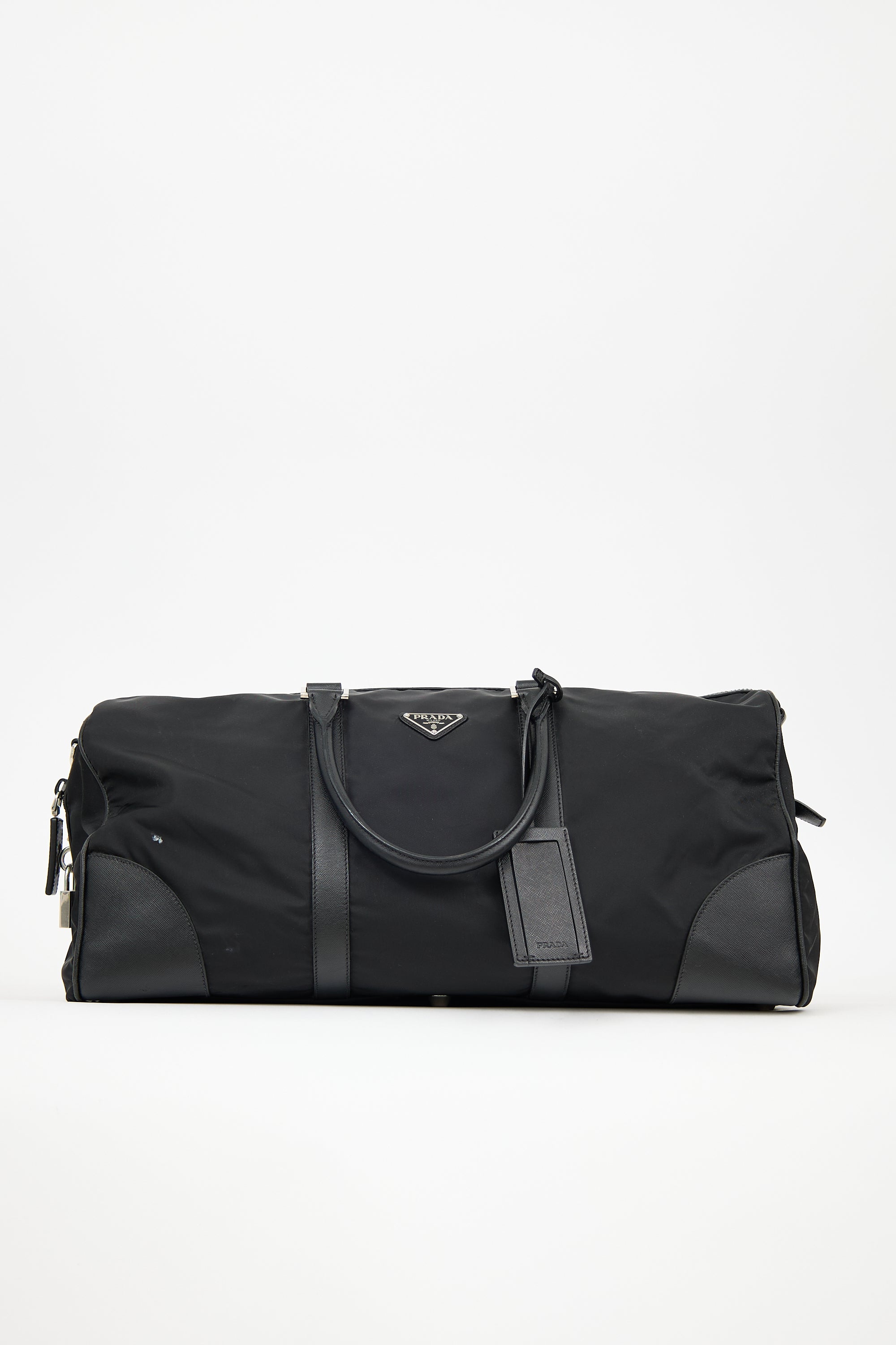 Pre-owned Prada black Re-Nylon duffle bag featuring Saffiano leather trim, six feet, signature triangle logo plaque at front, dual rolled top handles, removable luggage tag and clochette at handles, top zip closure with padlock at one side, and one lined main compartment with two slip pockets. Comes with original dust bag.