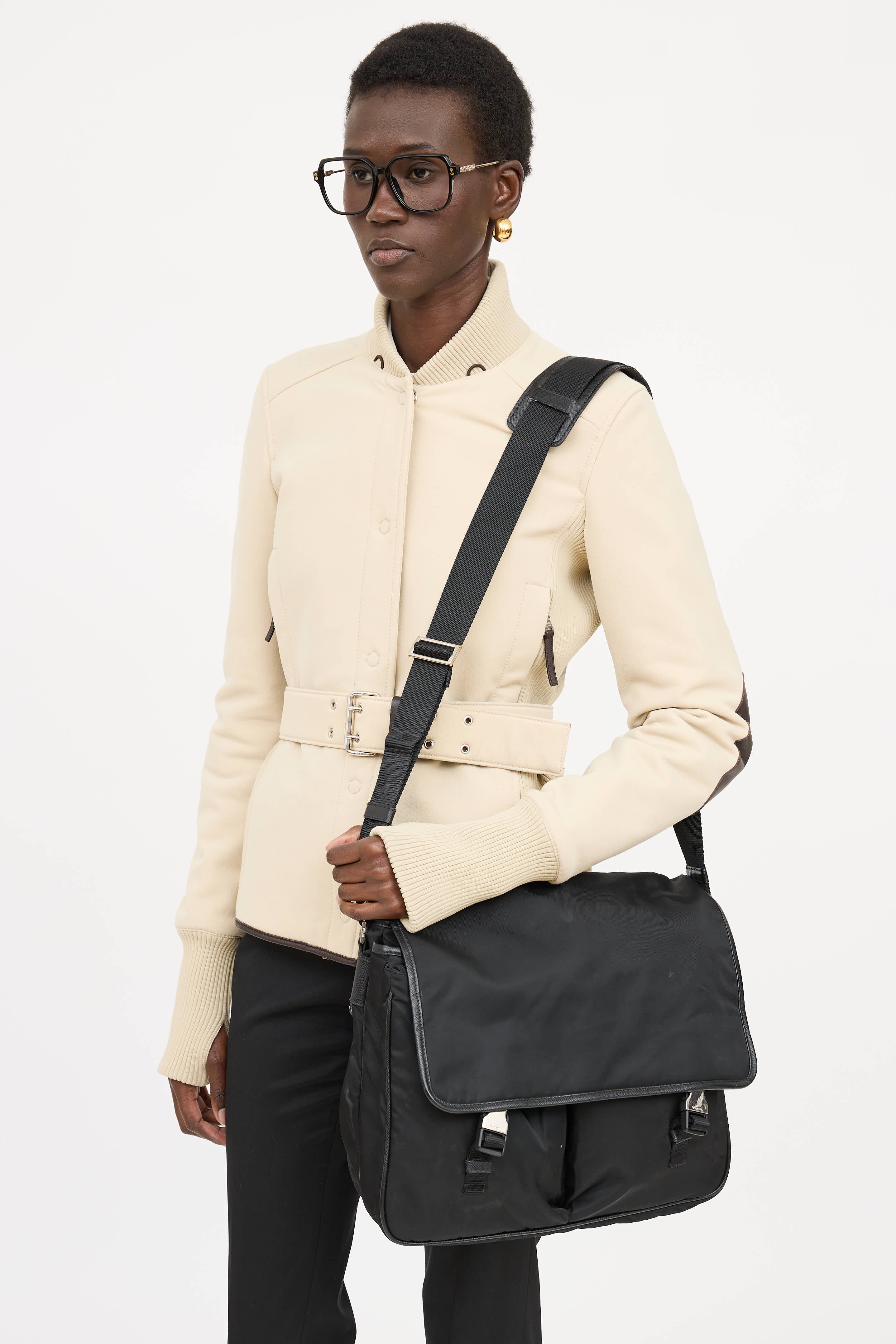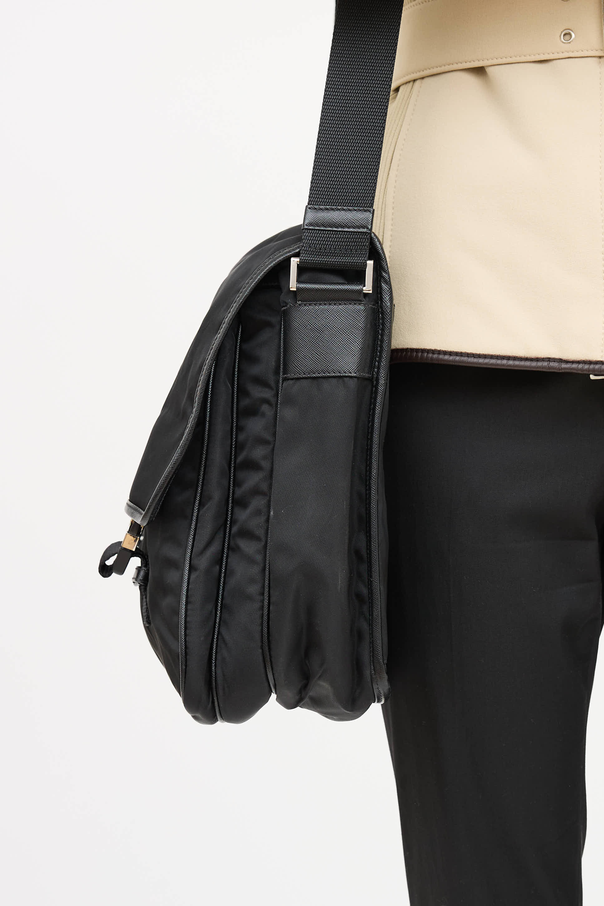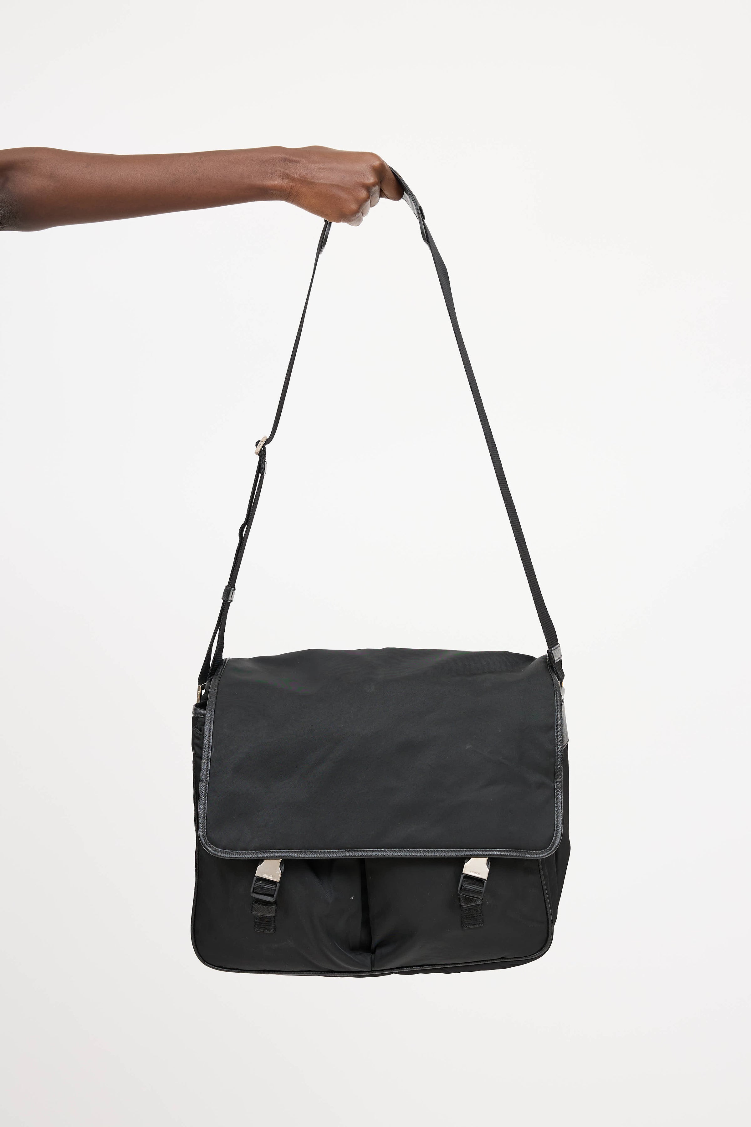 Pre-loved Prada black nylon messenger bag featuring front flap, two silver tone buckles with adjustable nylon tape straps, leather trims, two front zippered pocket with leather zipper pulls, back slip and zipper pocket. Interior features two main pockets with additional zip pockets and stationary compartments, wide woven adjustable shoulder shoulder strap and triangle logo at side.