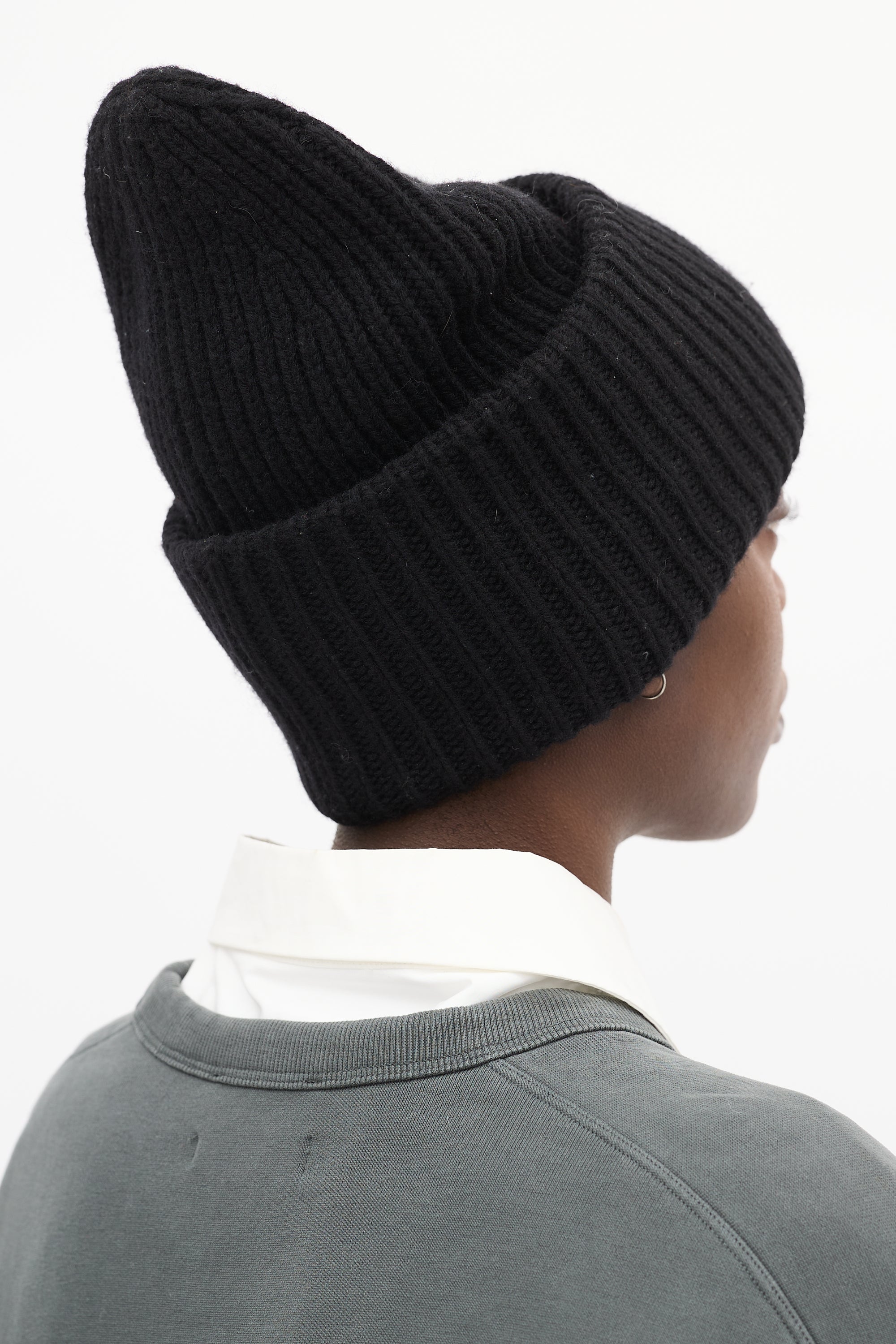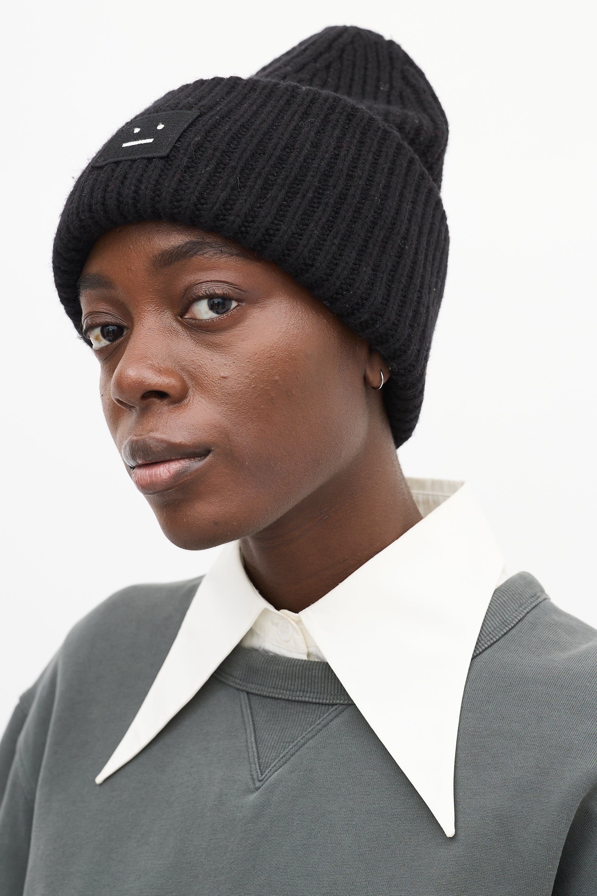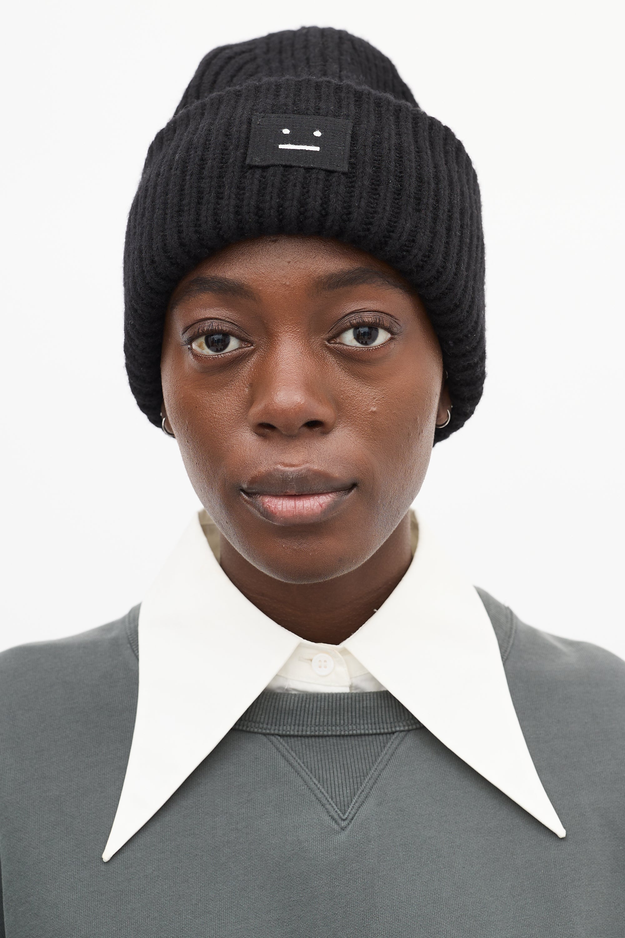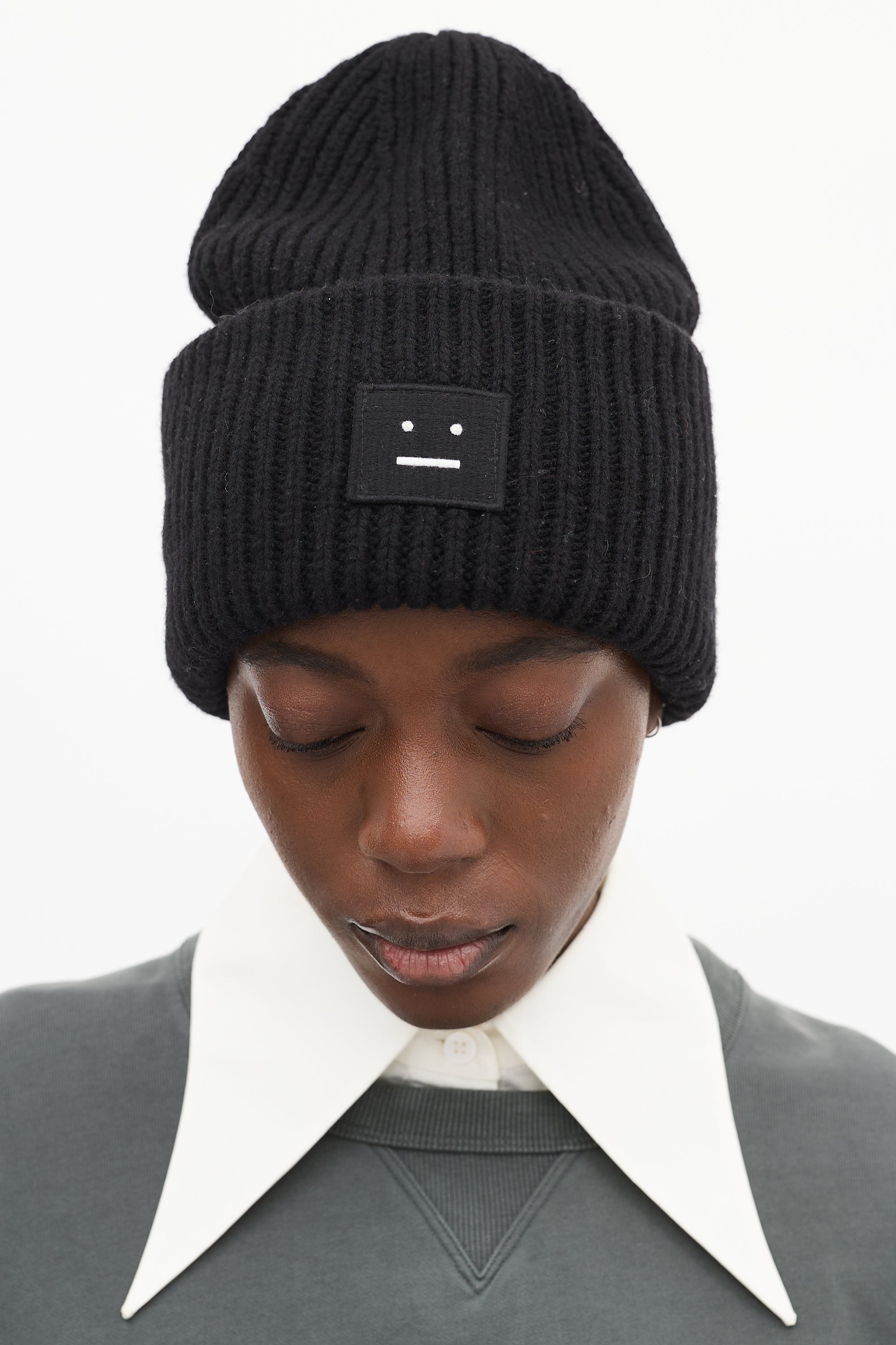 Pre-owned Acne Studios black beanie featuring ribbed knit, tonal face patch at front, and cuffed hem.