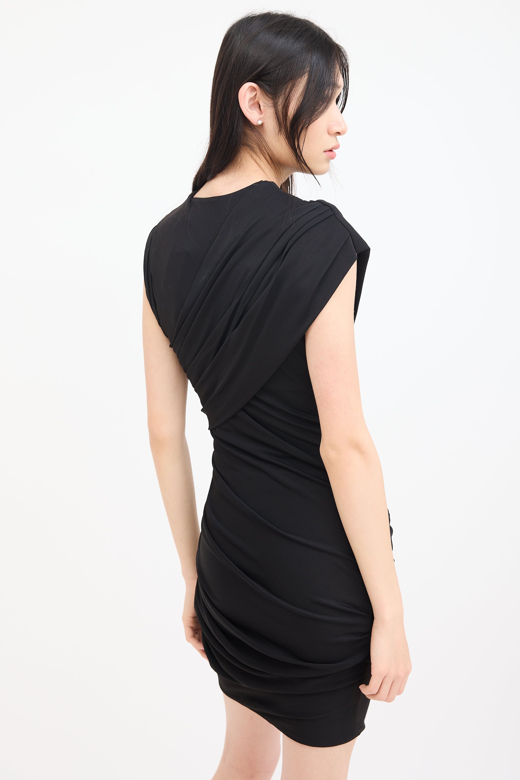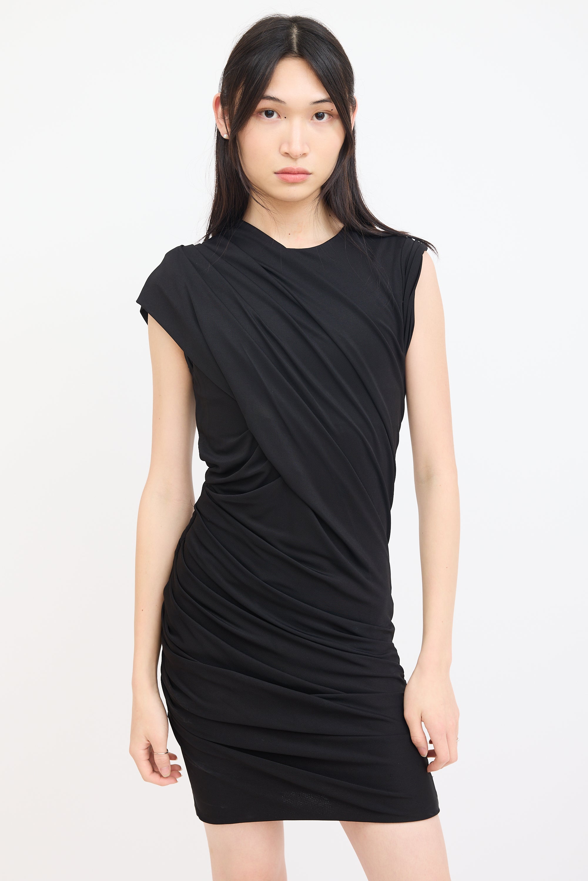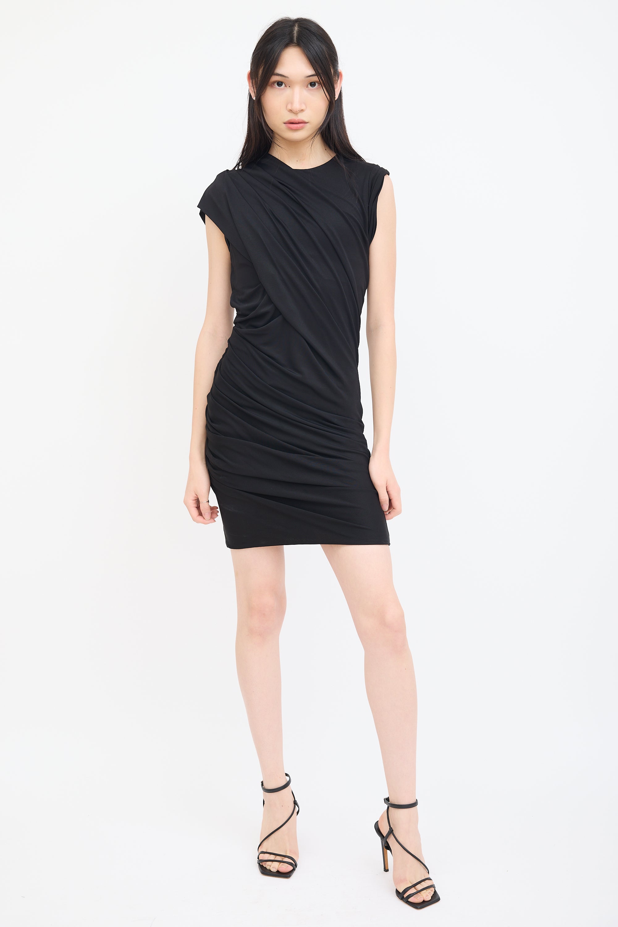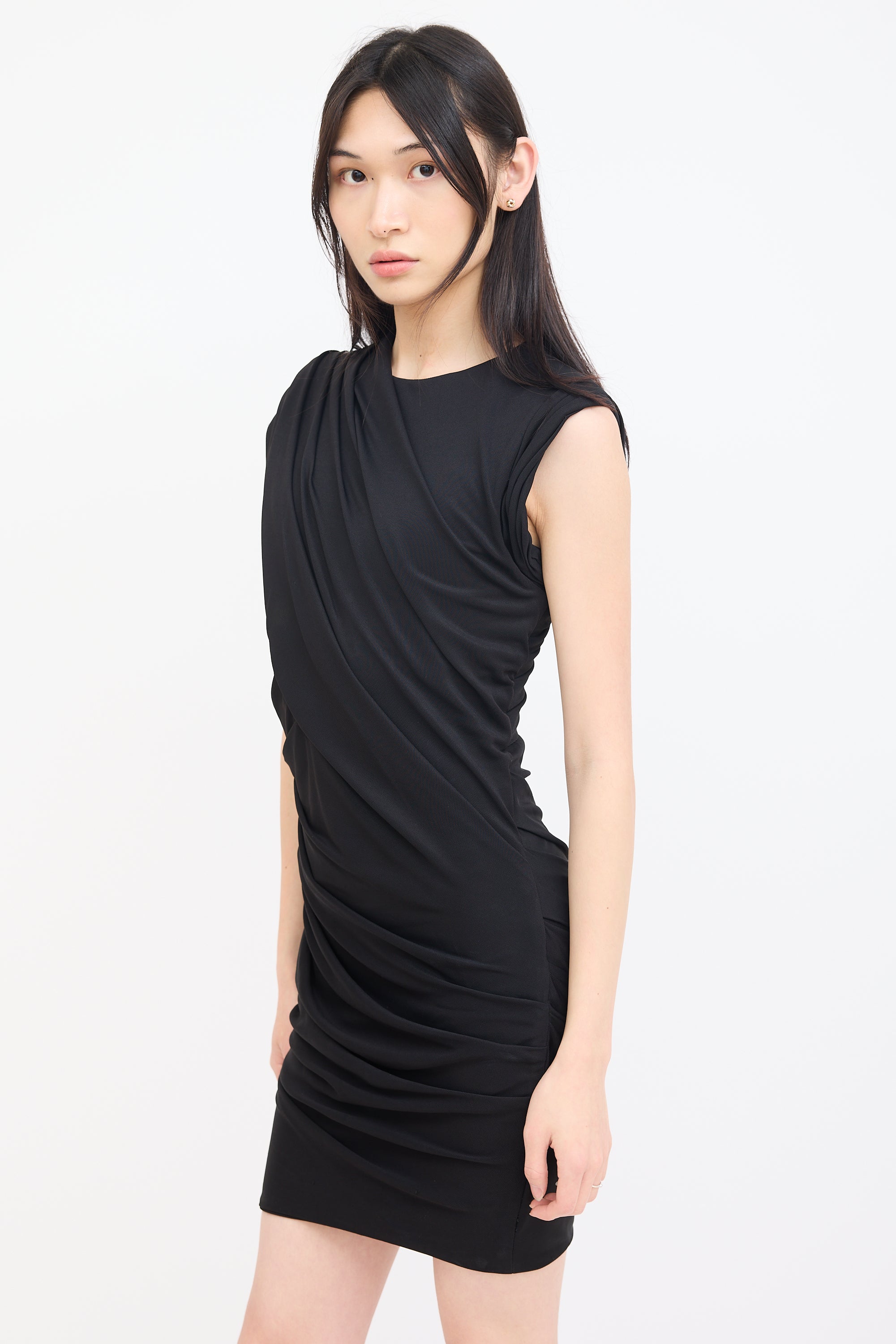 Pre-owned Alexander Wang black gathered midi dress featuring round neckline, asymmetrical gathered shoulders and sides, back drape, and asymmetrical back zip closure.