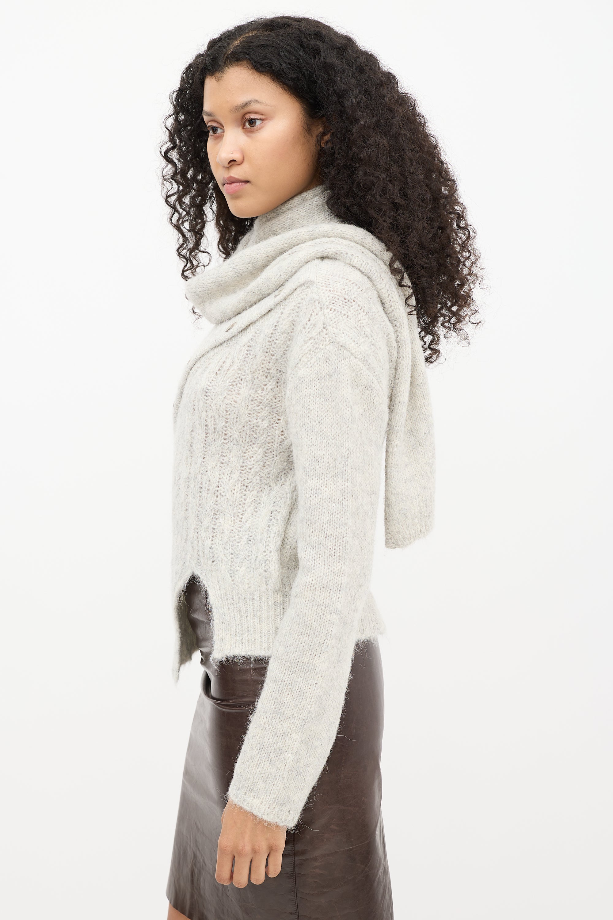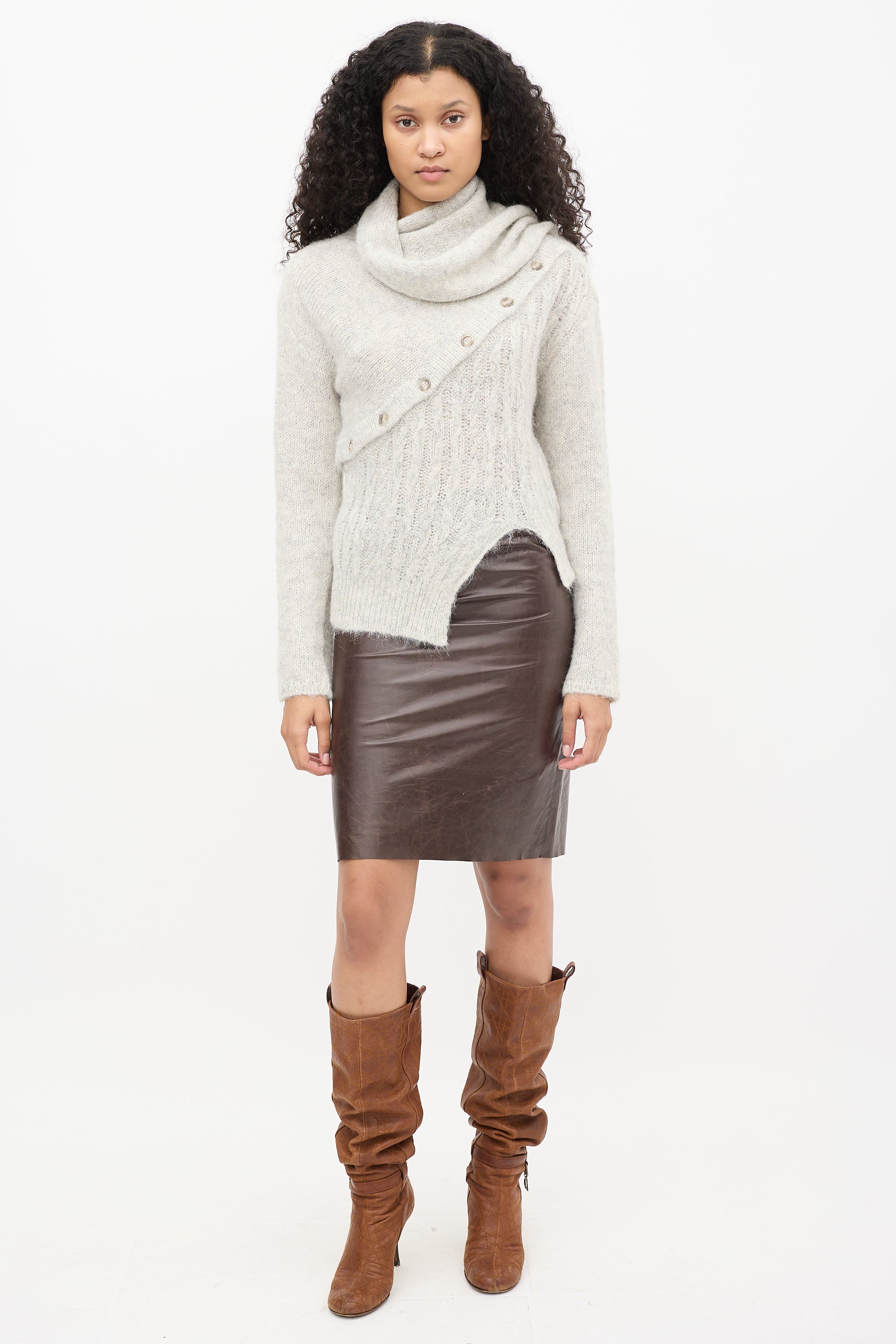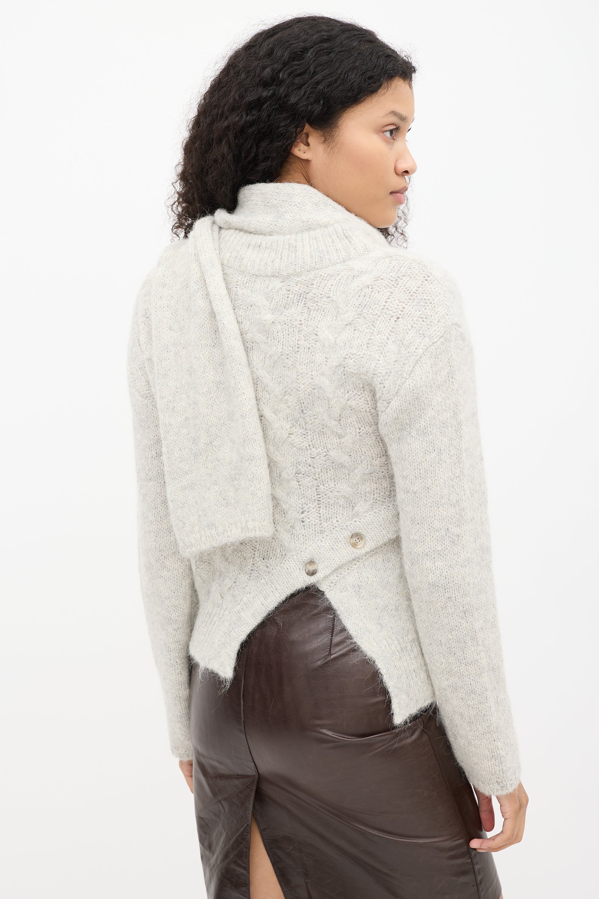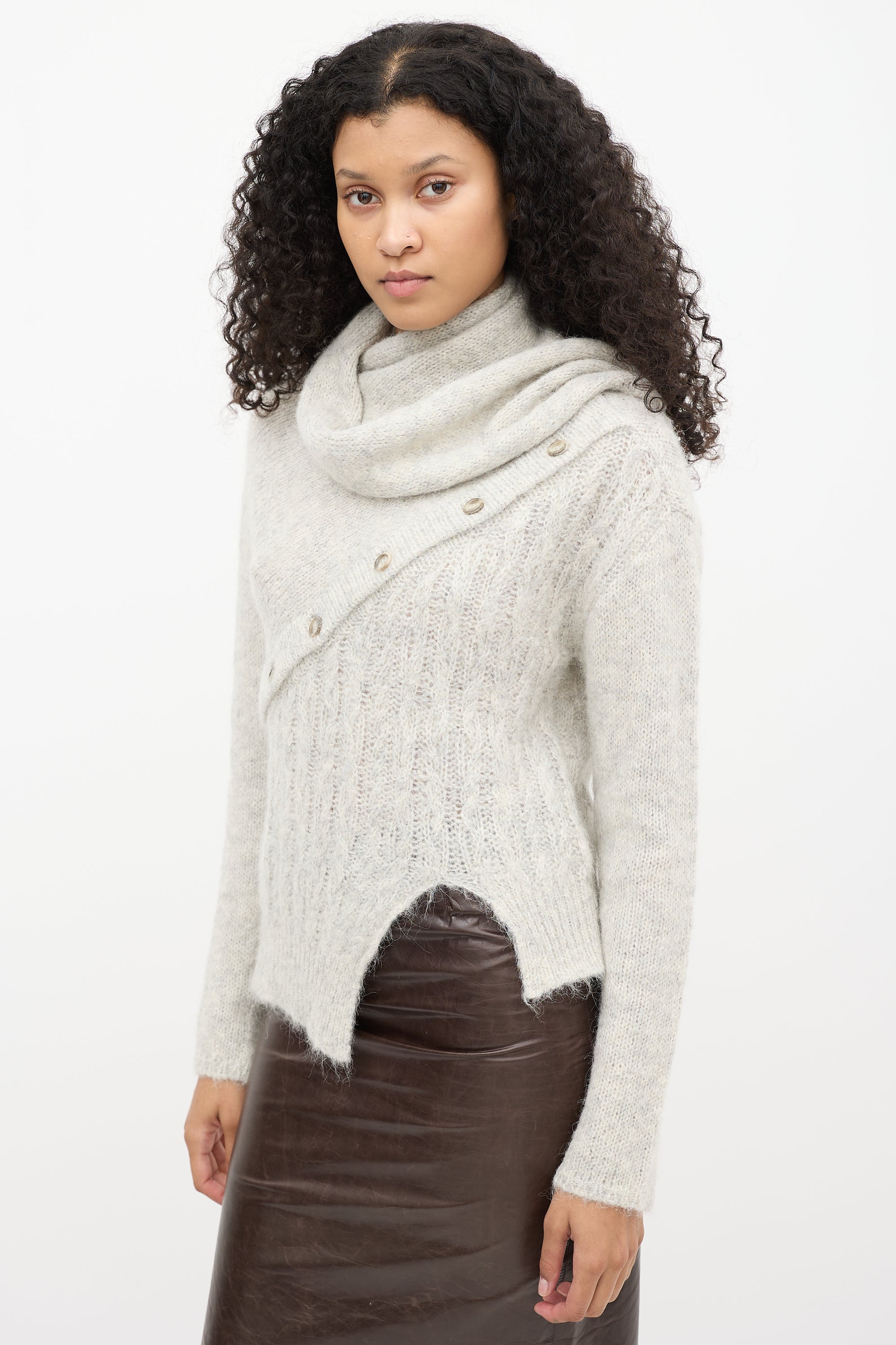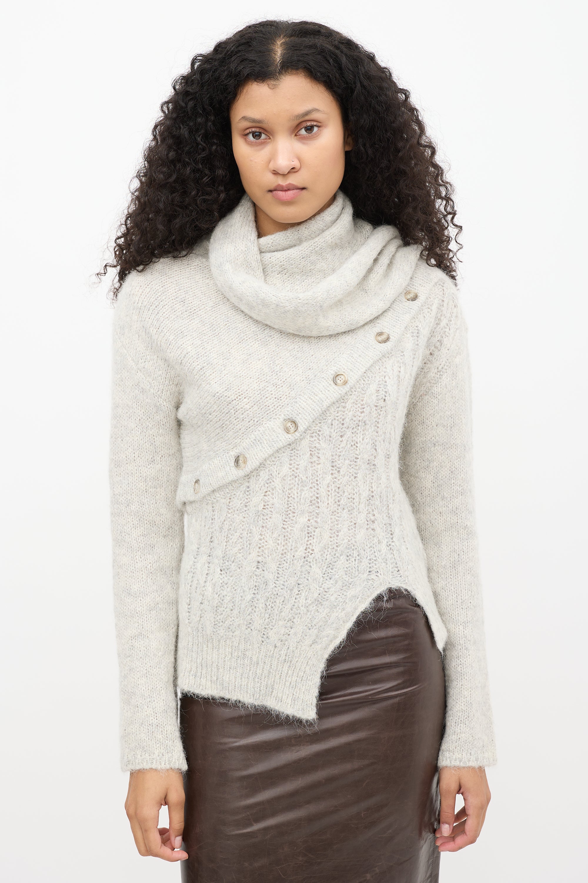 Pre-owned Andersson Bell grey heather sweater featuring round neckline with attached wraparound scarf, long sleeves, diagonal button up, and asymmetrical ribbed and notched hem.