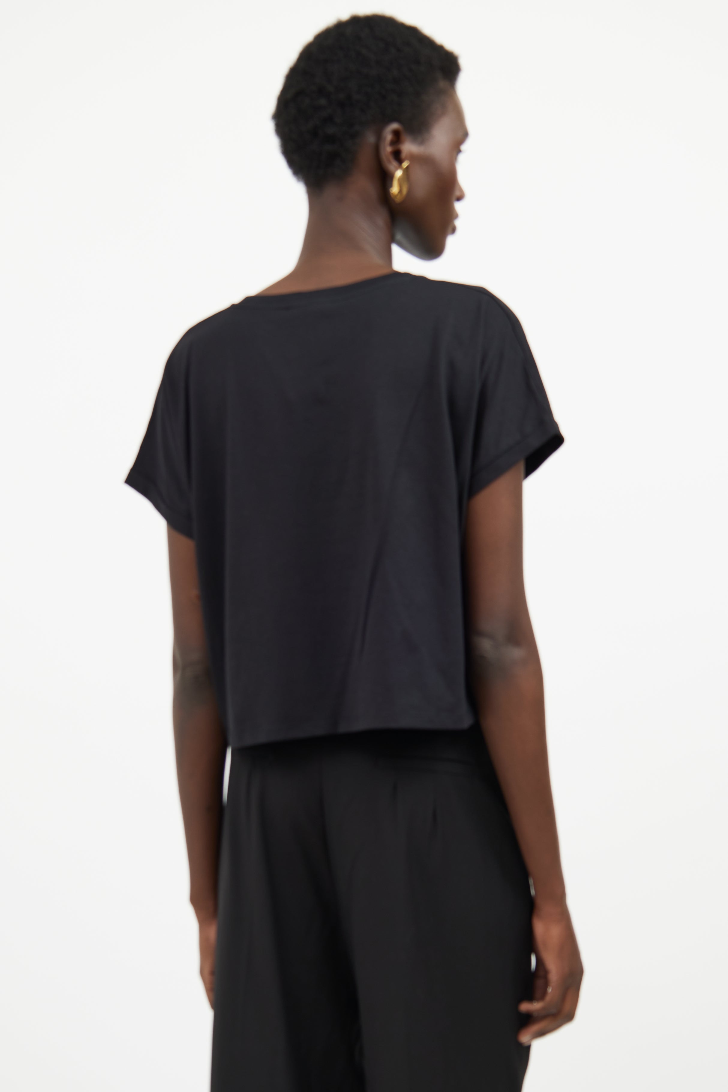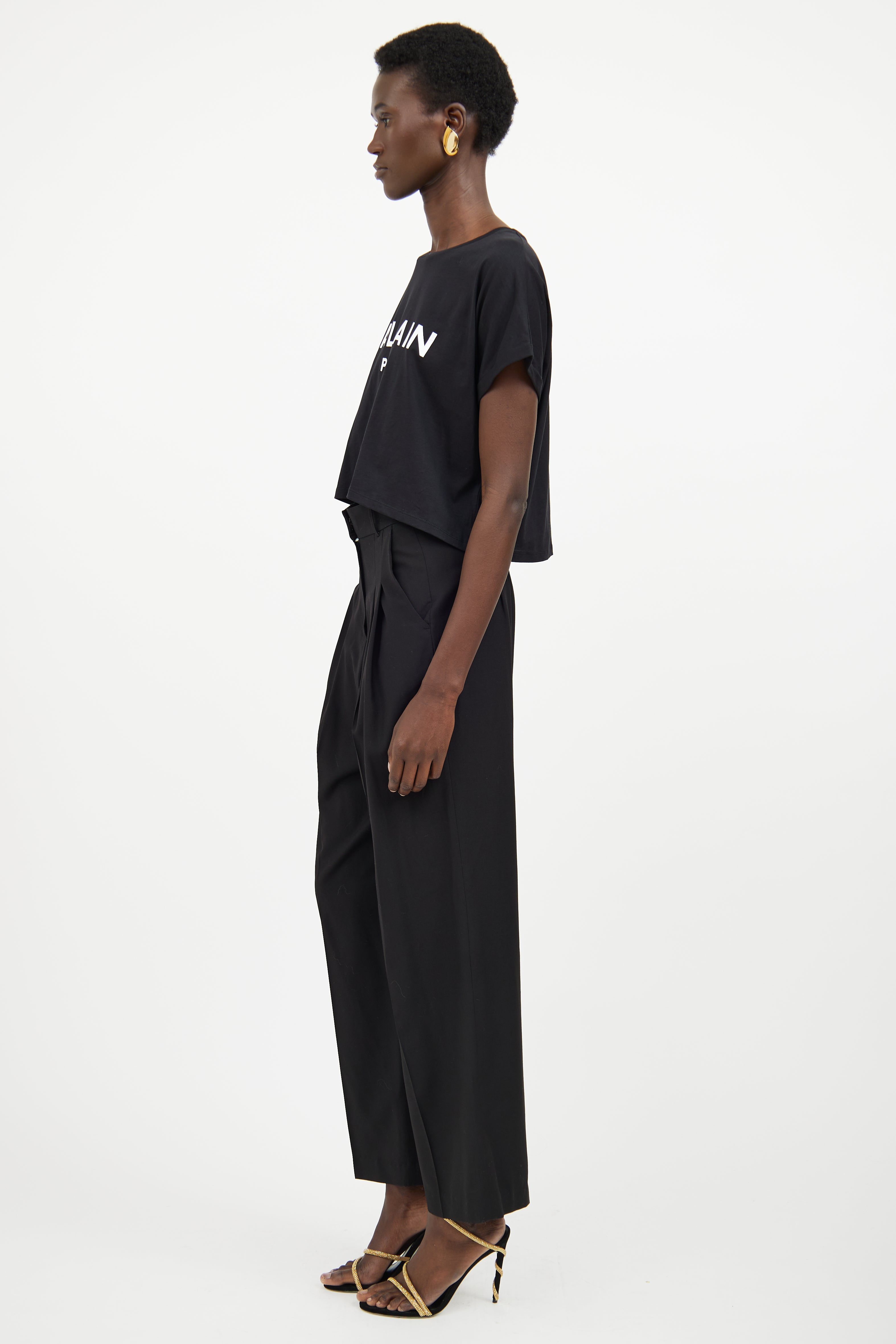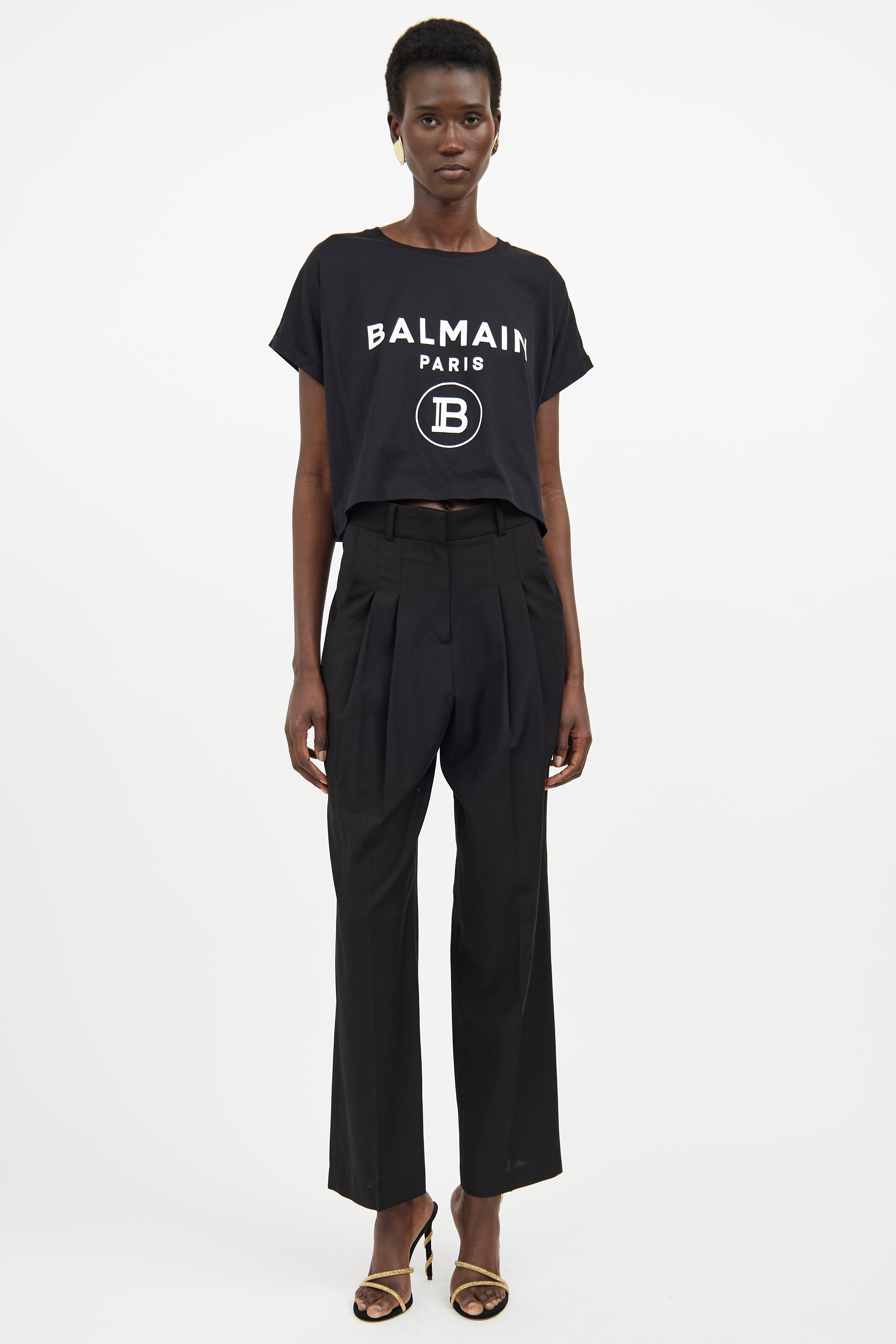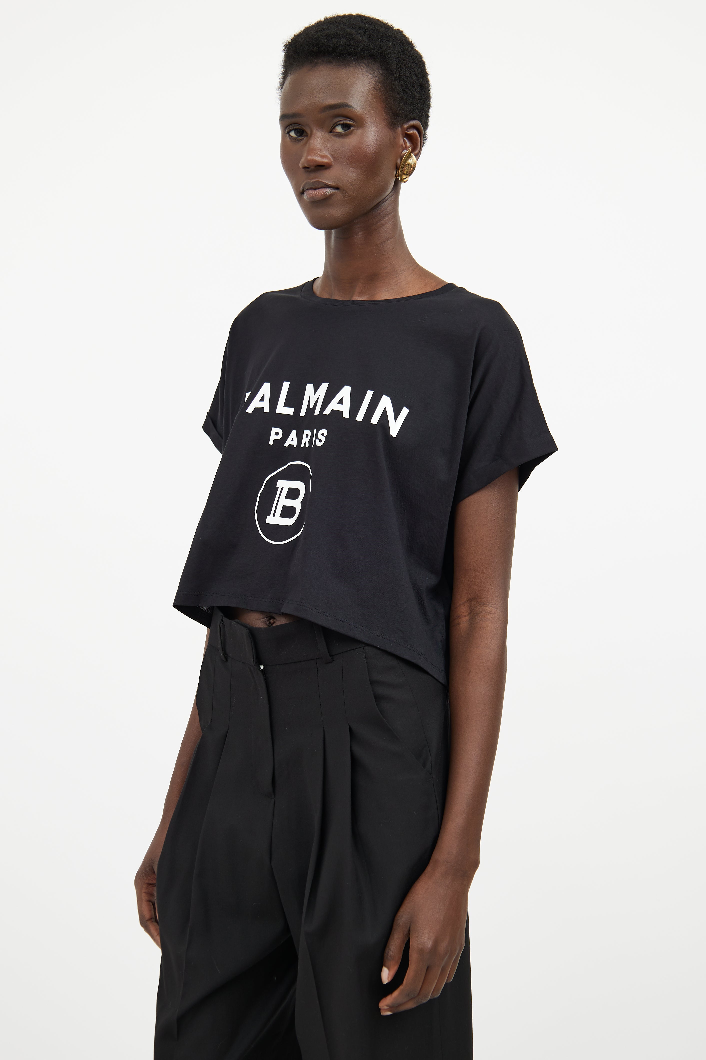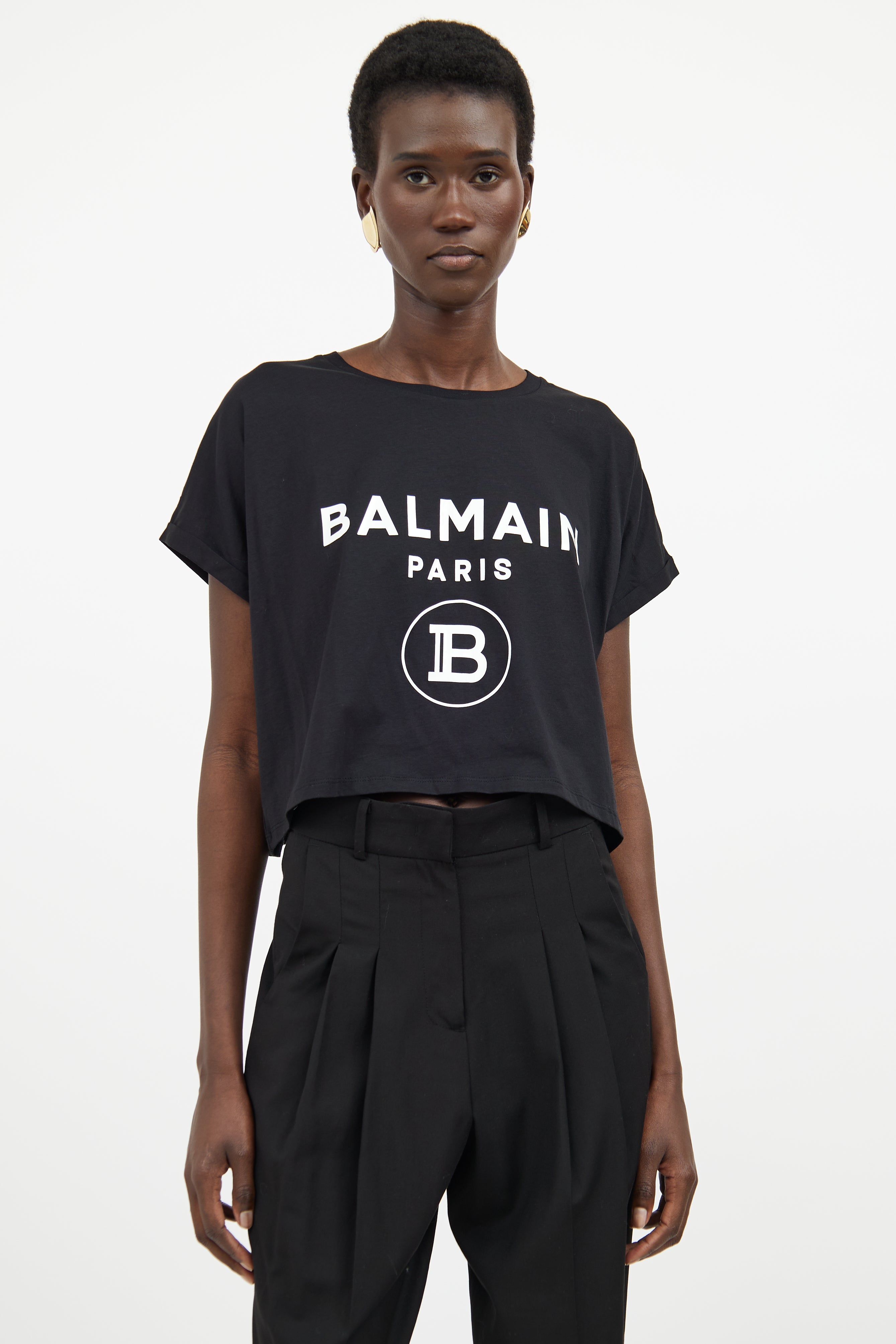 Pre-owned Balmain black and white short sleeve crop top featuring round neck, logo text across chest and cuffed sleeves.