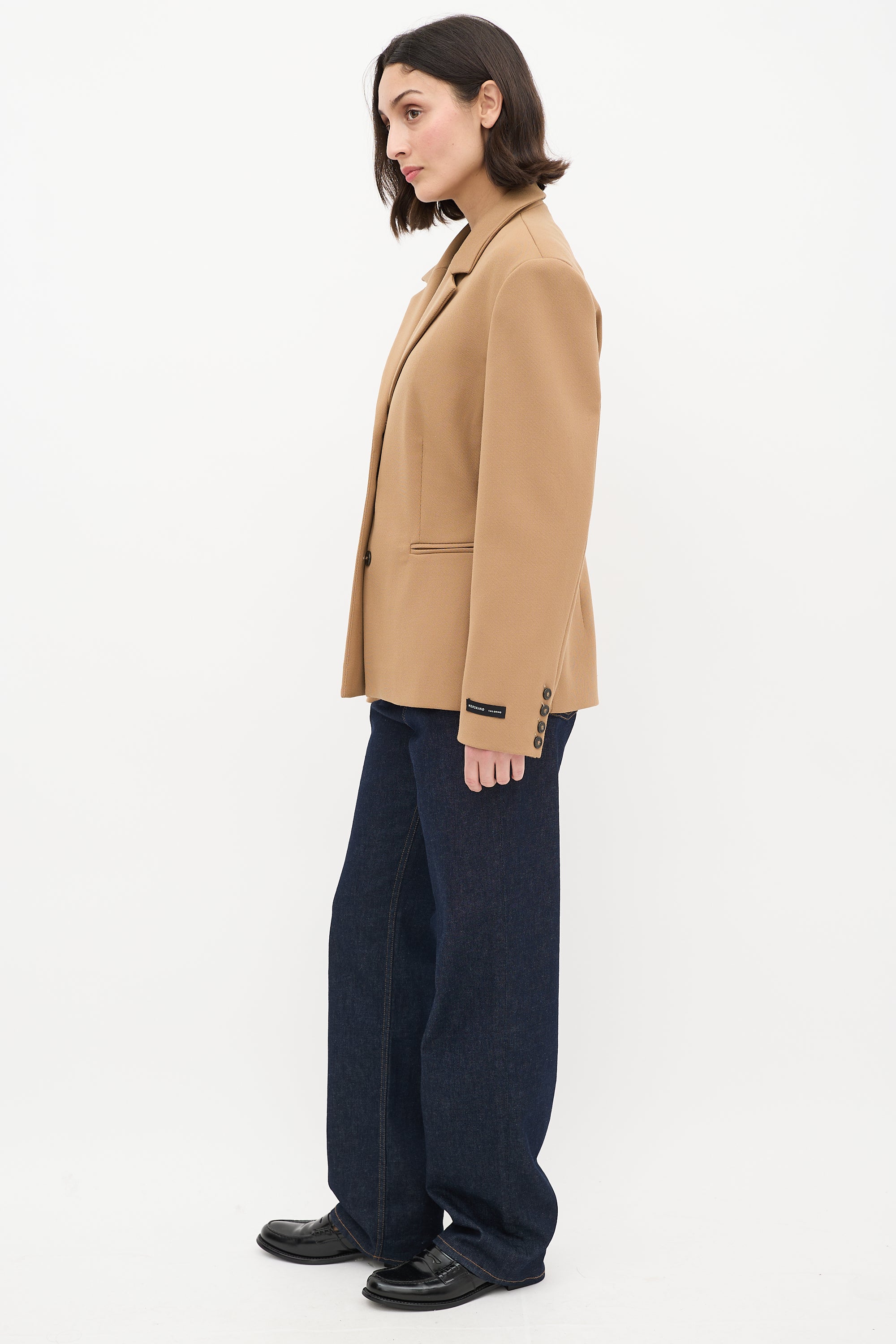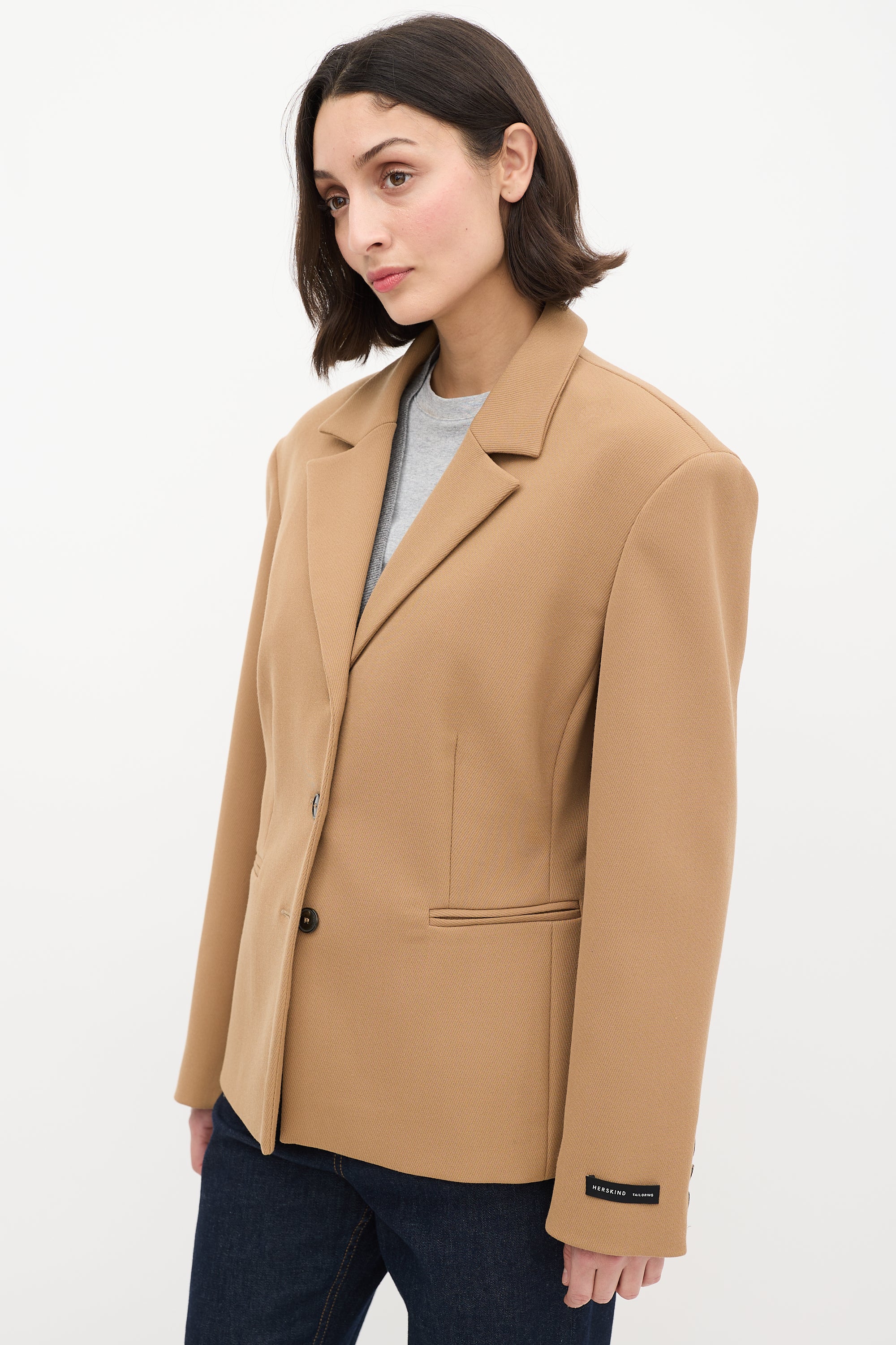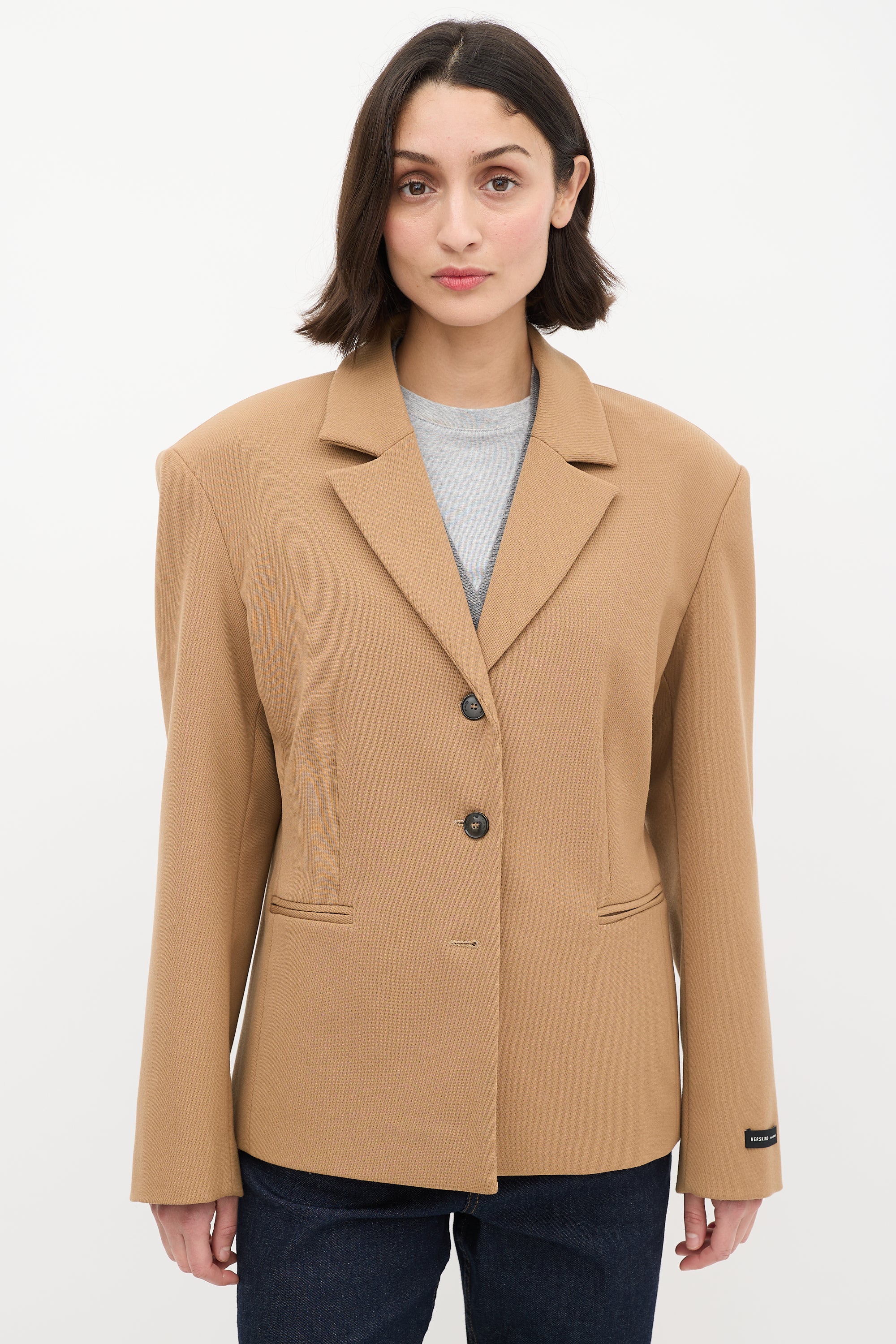 Pre-owned Herskind brown wool blend stretch blazer featuring a notched collar, button up front closure, two welt pockets at front waist, padded shoulders, and long sleeves with buttoned cuffs. Lined.