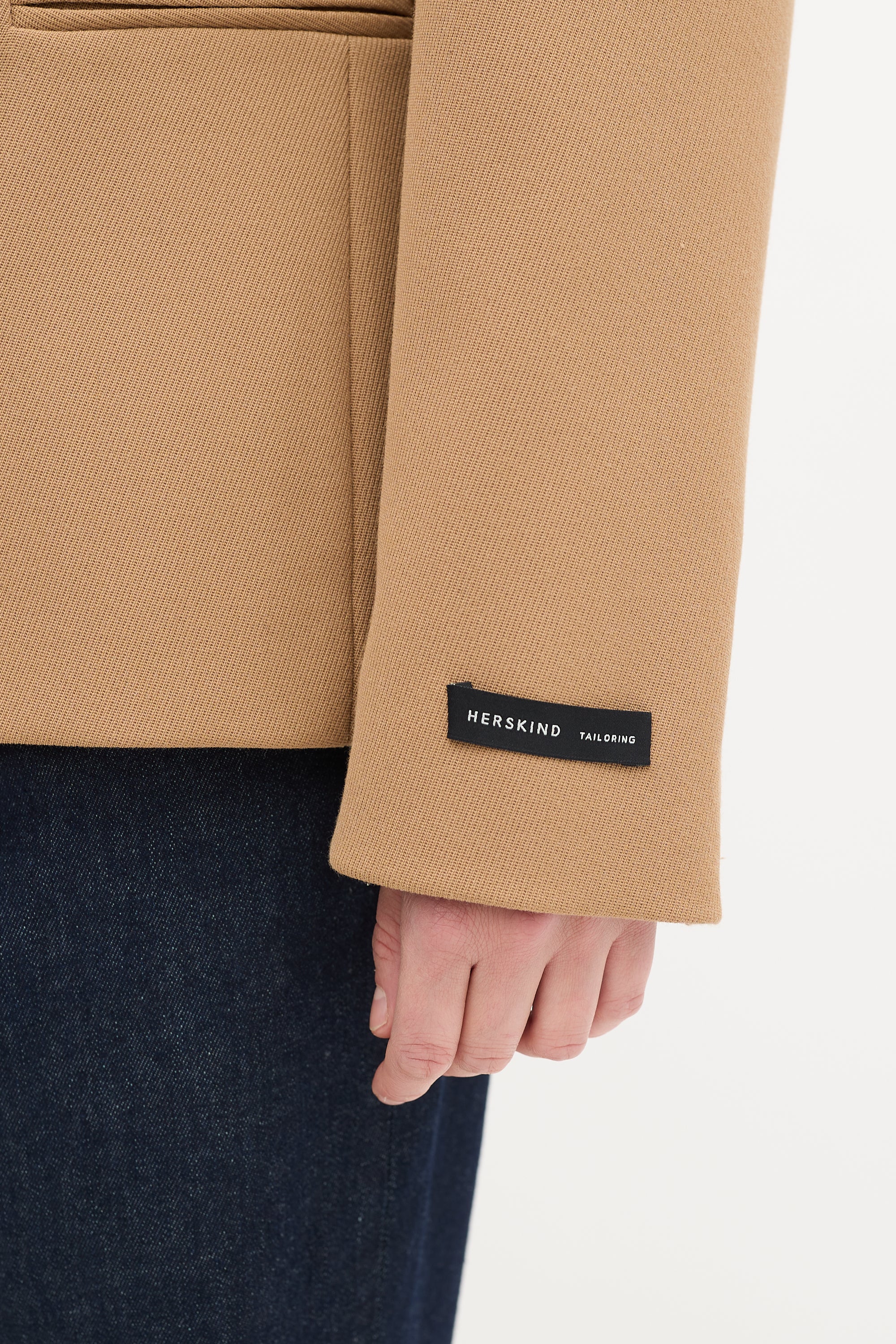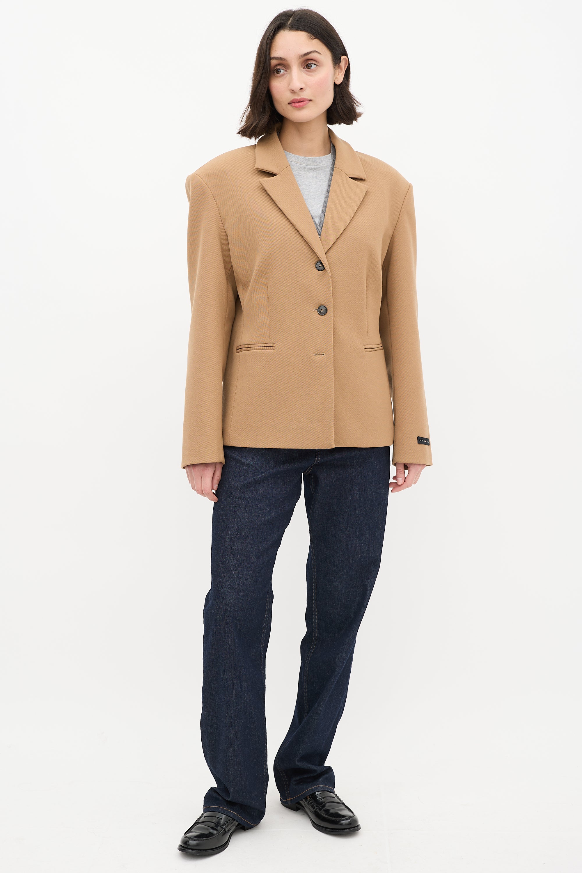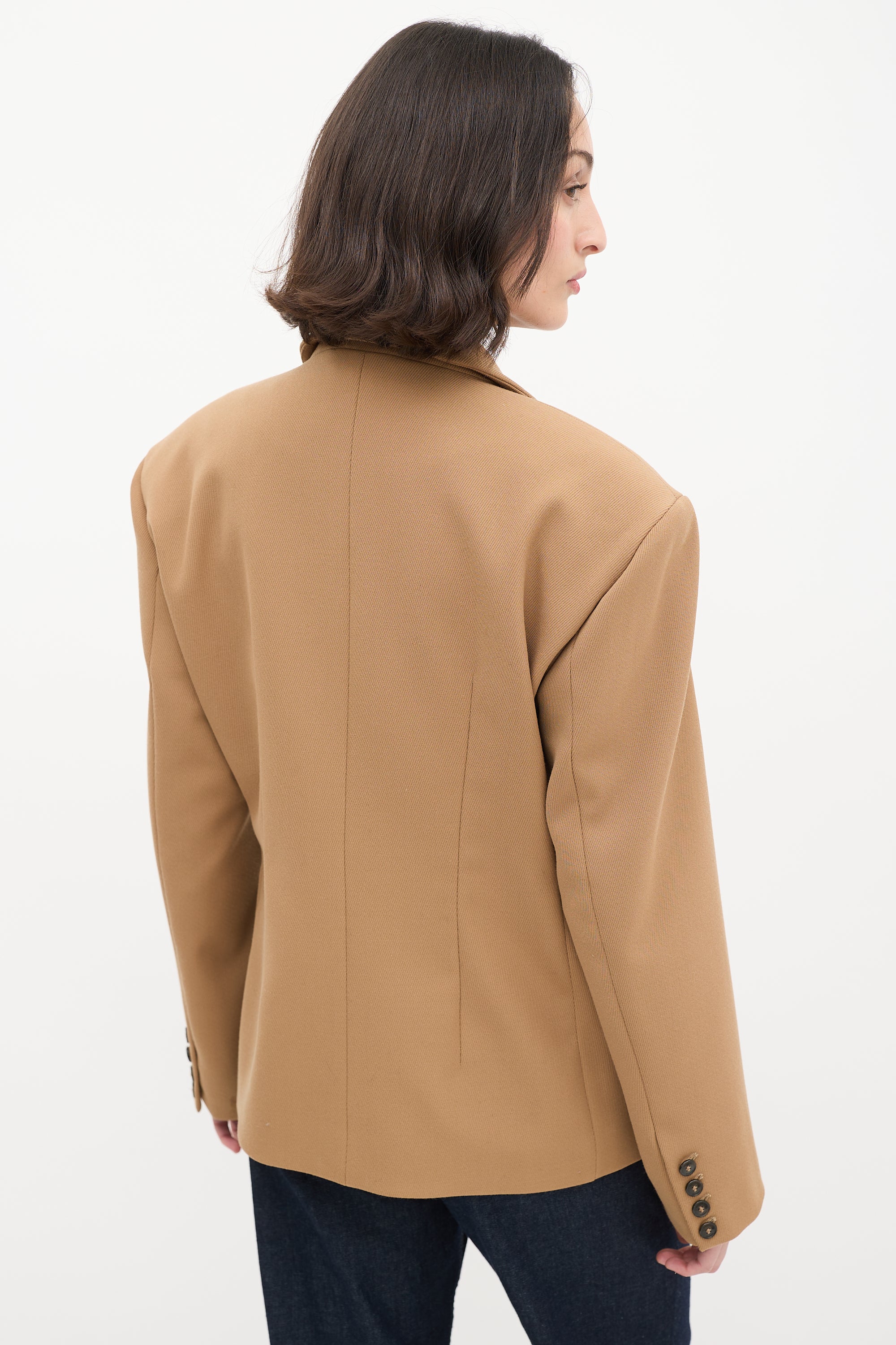 Pre-owned Herskind brown wool blend stretch blazer featuring a notched collar, button up front closure, two welt pockets at front waist, padded shoulders, and long sleeves with buttoned cuffs. Lined.