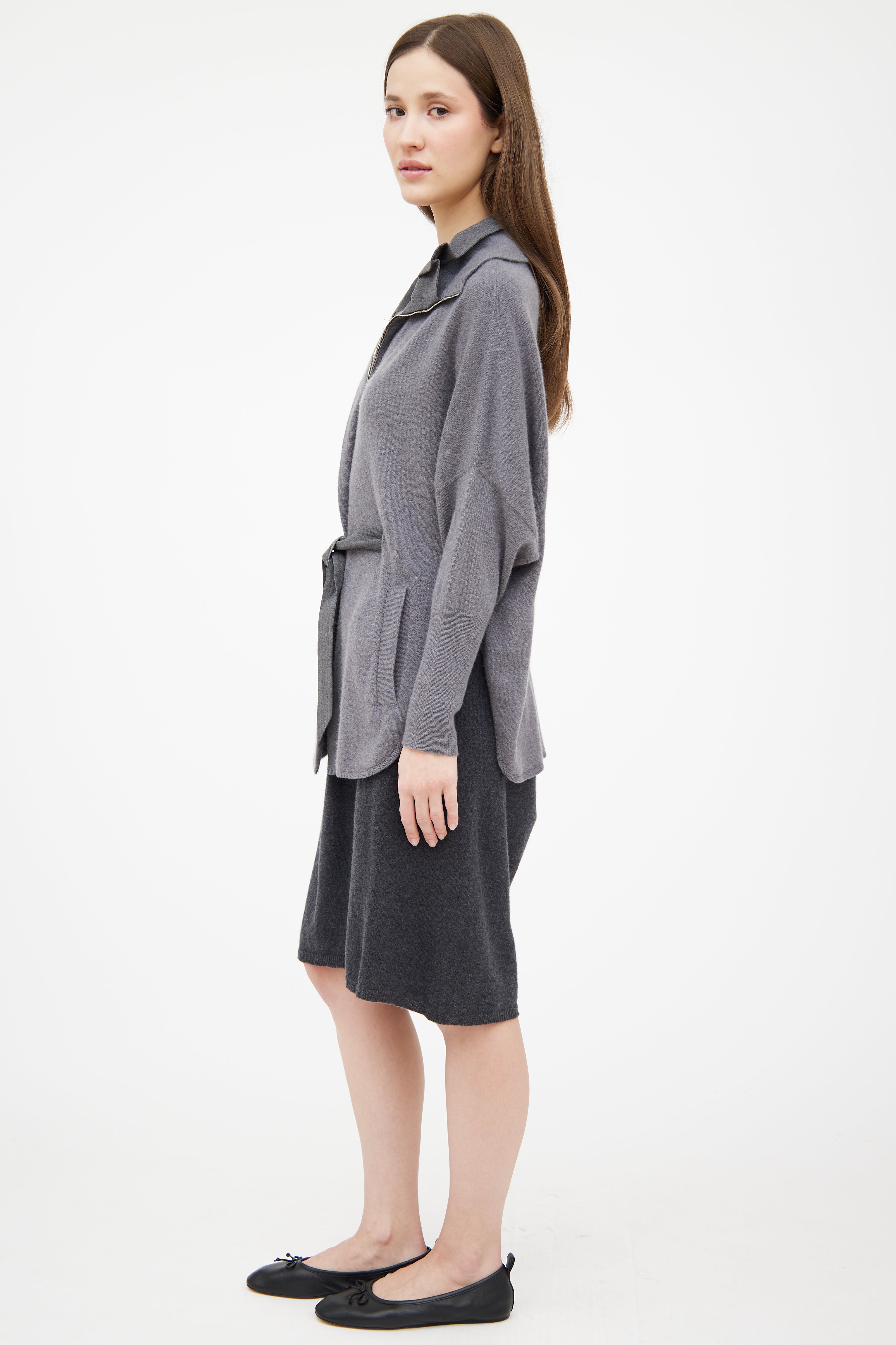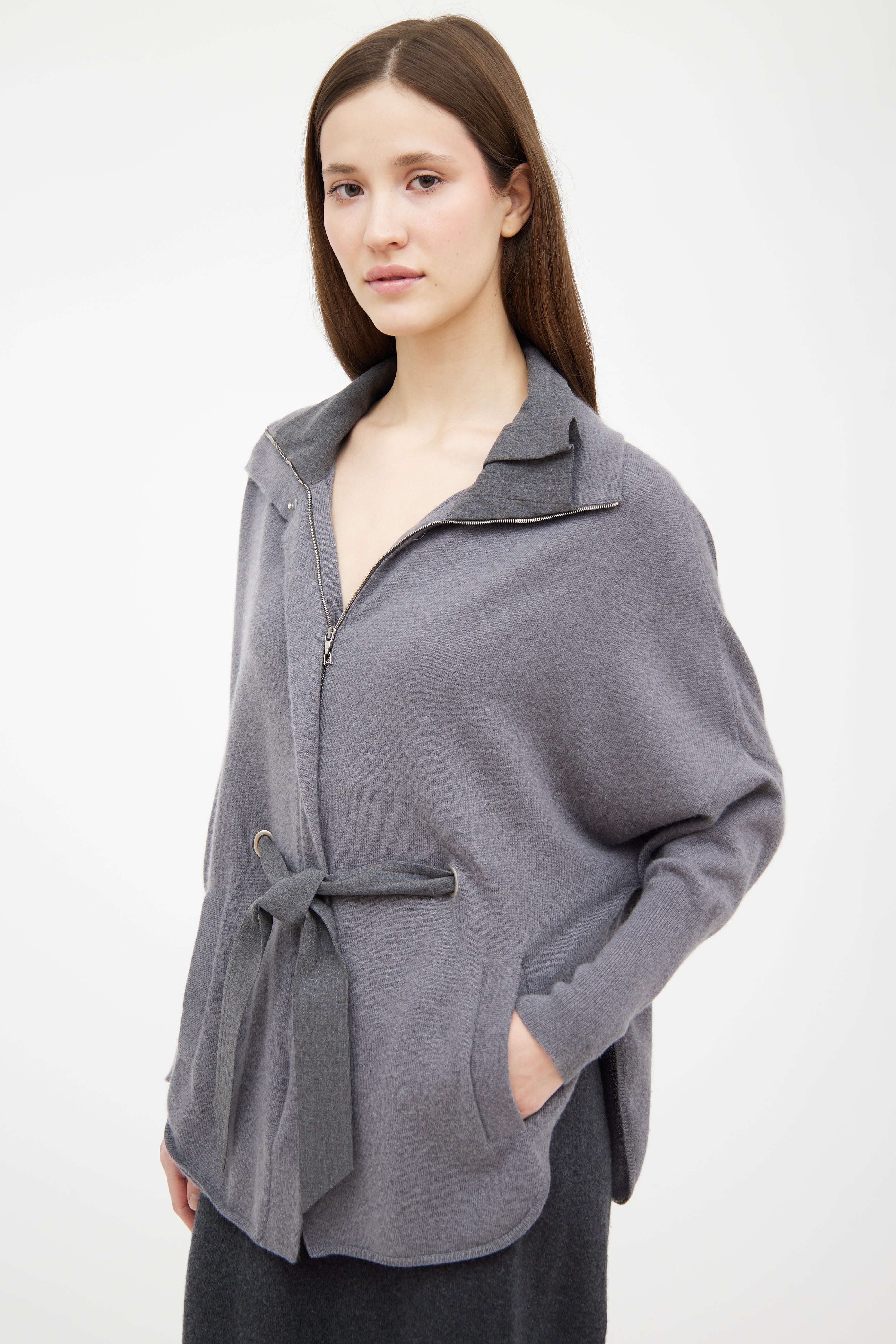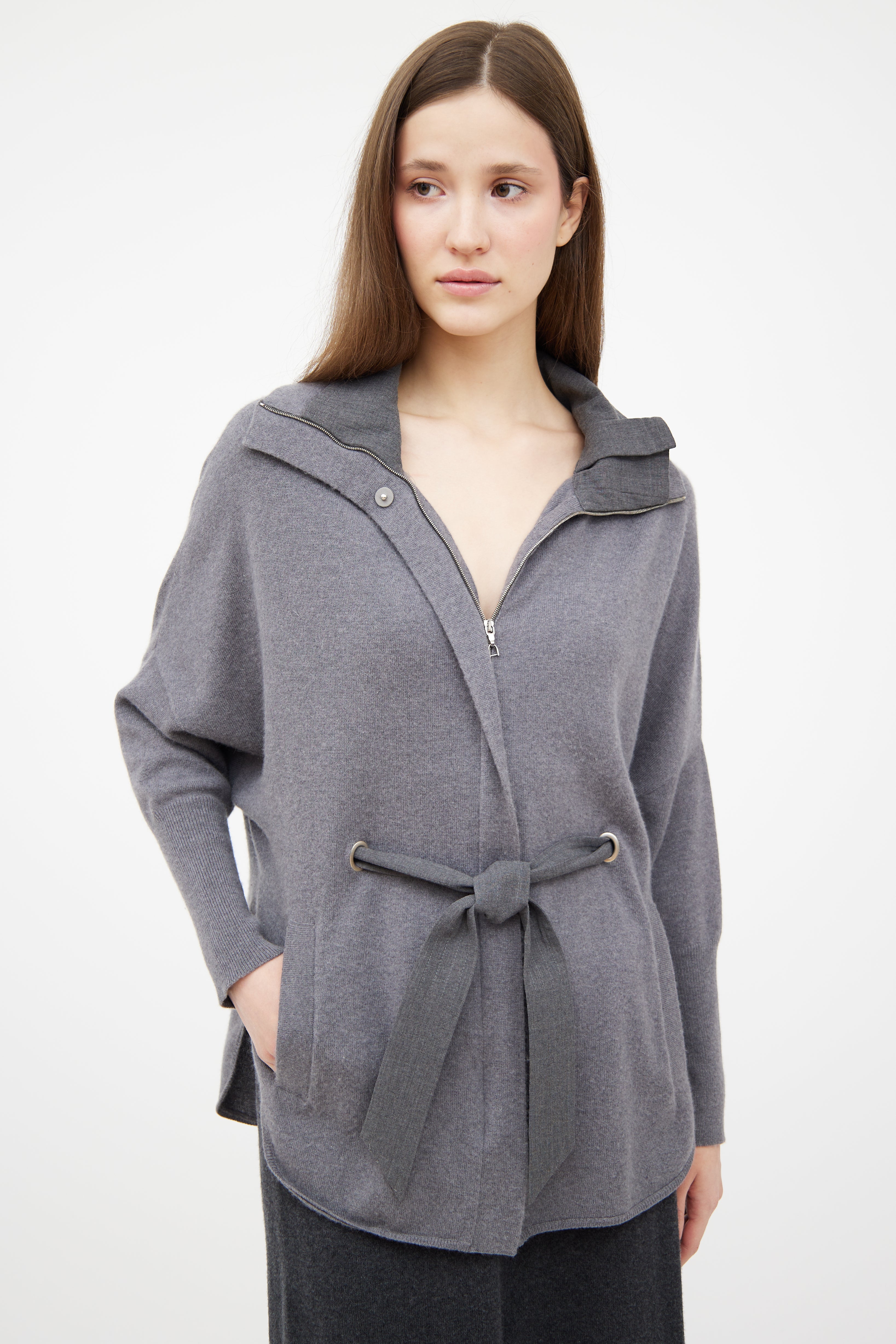 Pre-owned Brunello Cucinelli grey cashmere sweater featuring a funnel neck collar, long batwing sleeves, drawstring tie waist, curved hem, and zip closure.