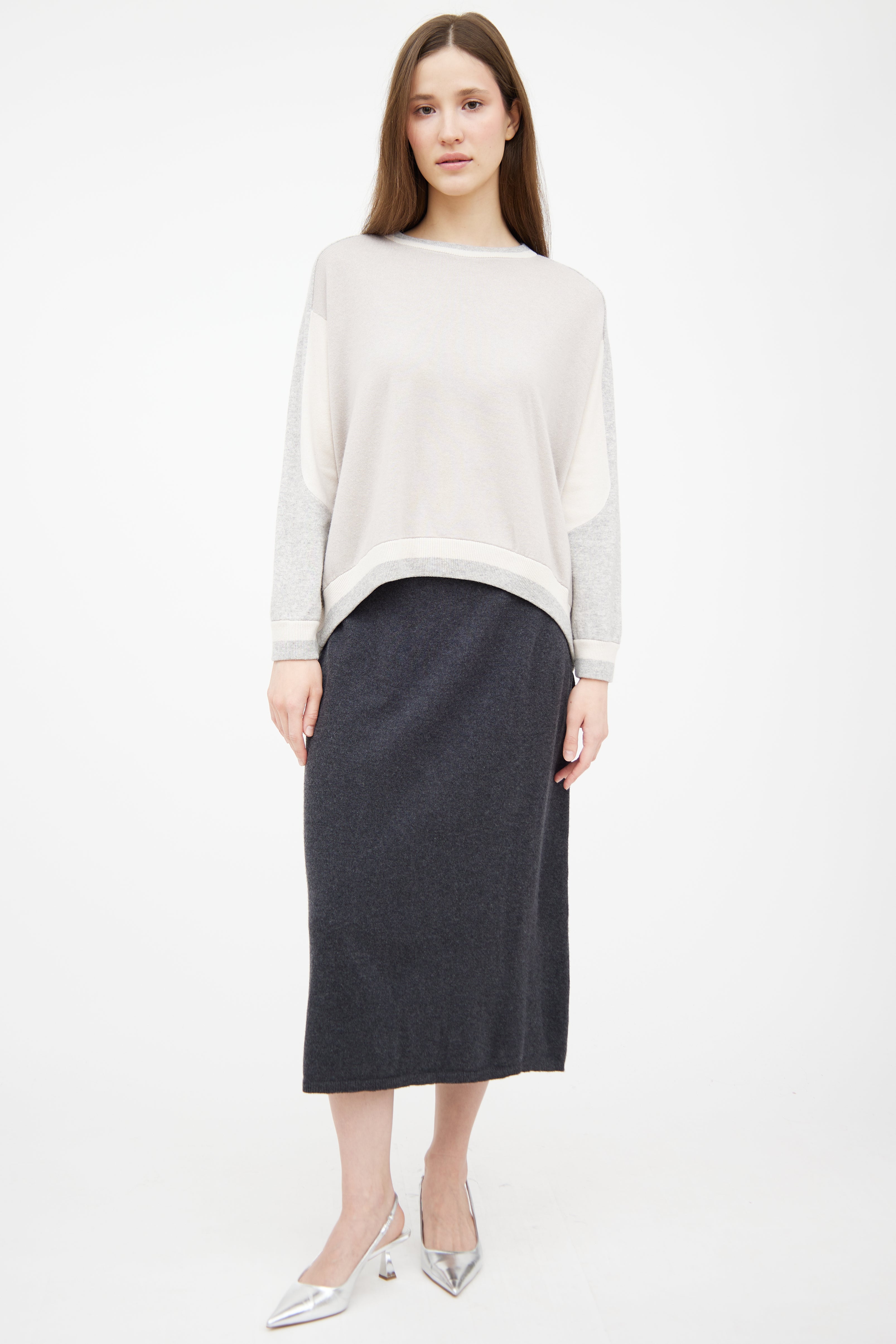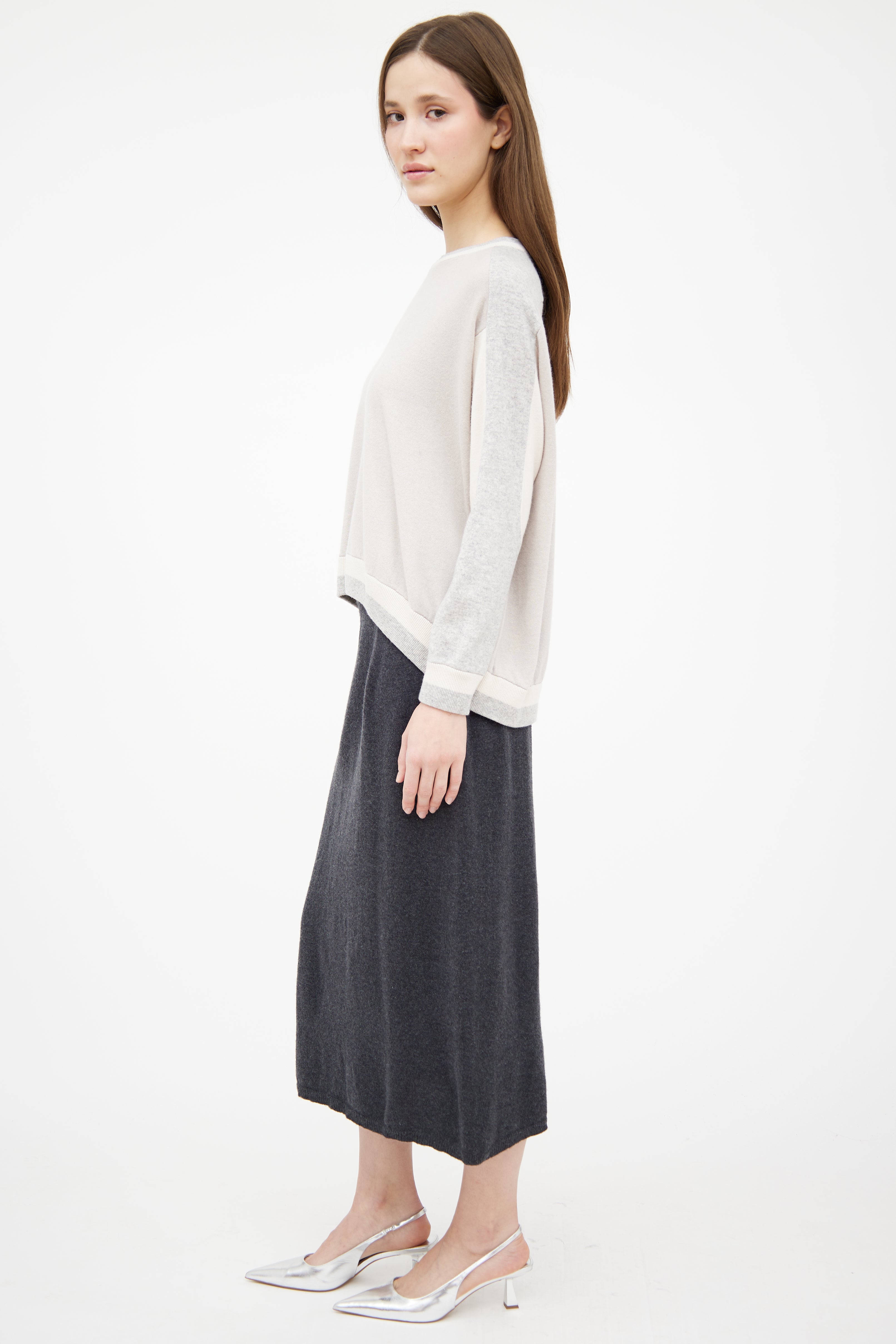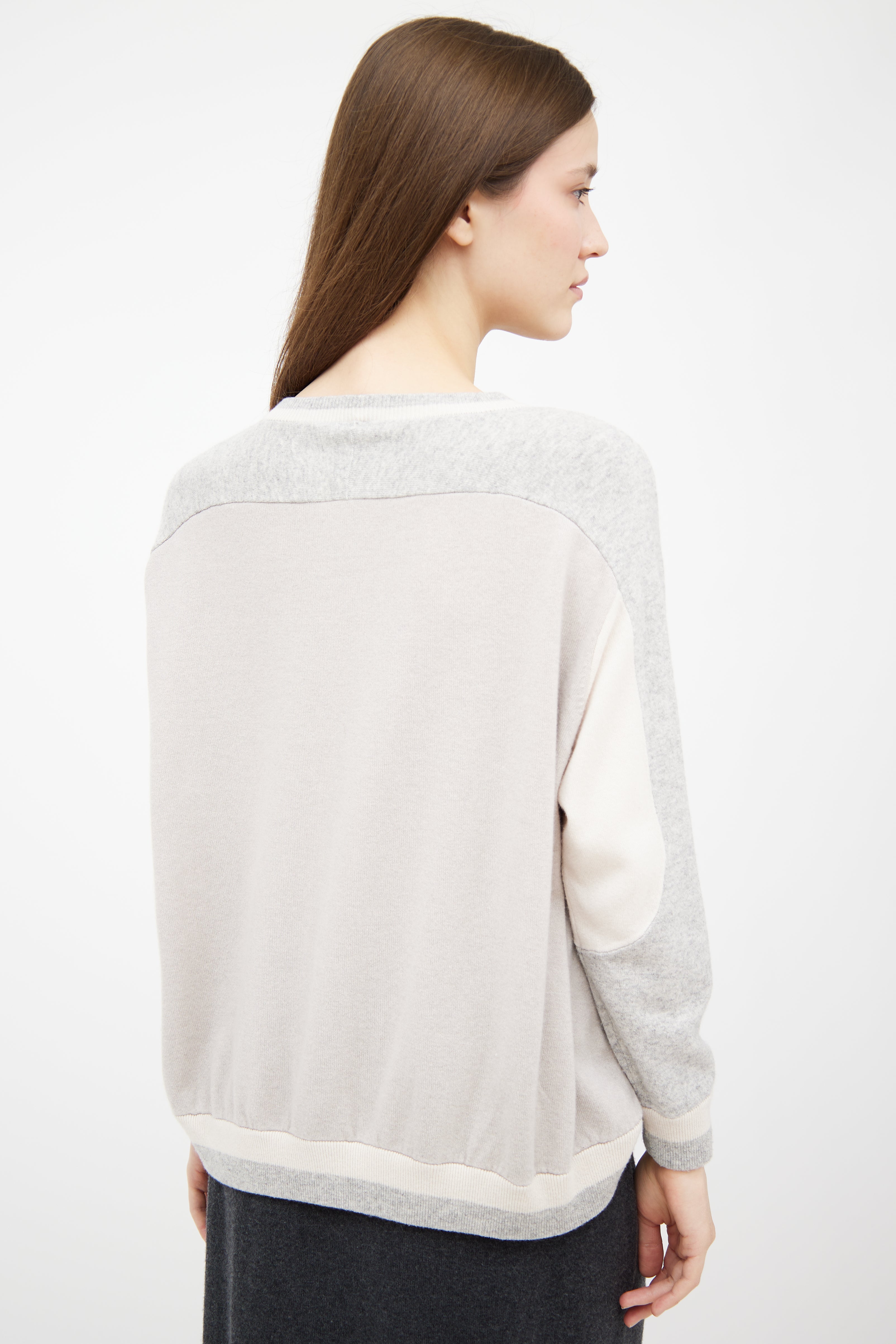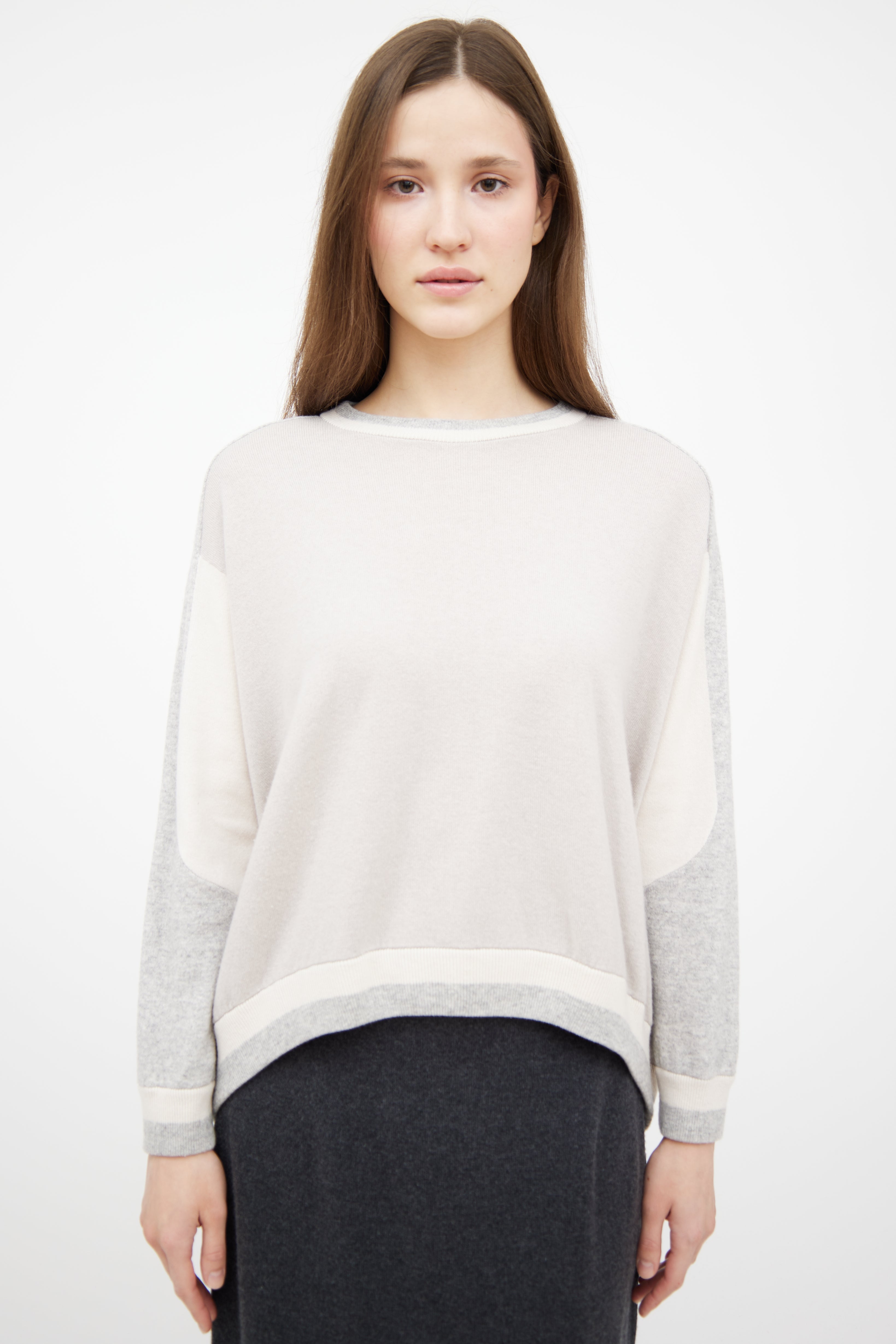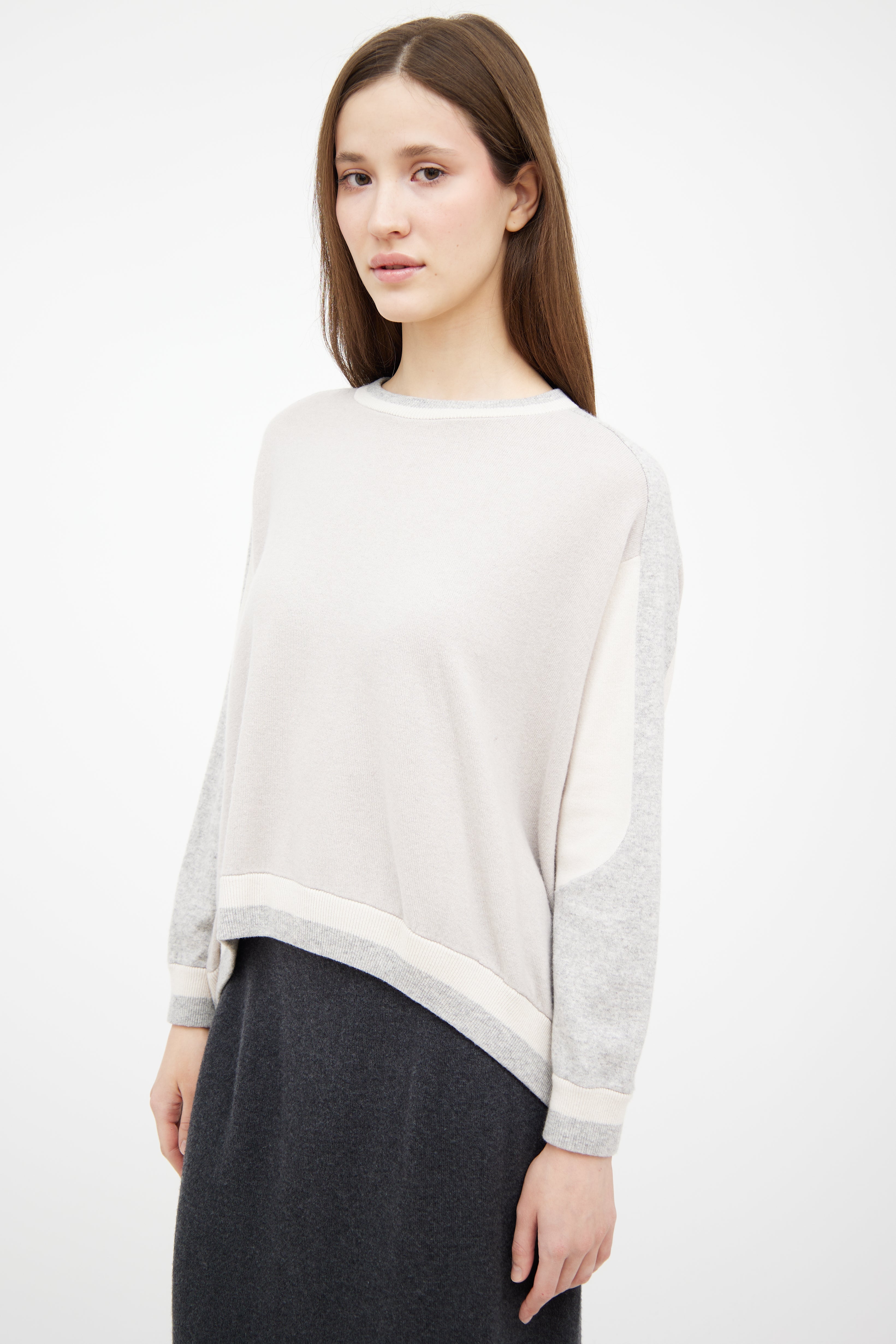 Pre-owned Brunello Cucinelli grey cashmere knit sweater featuring white paneling throughout, crewneck and high low ribbed hem.