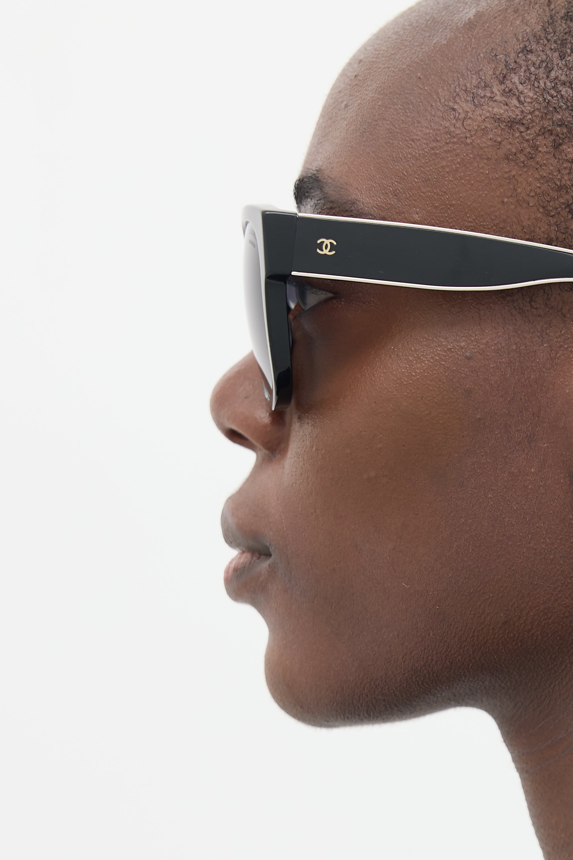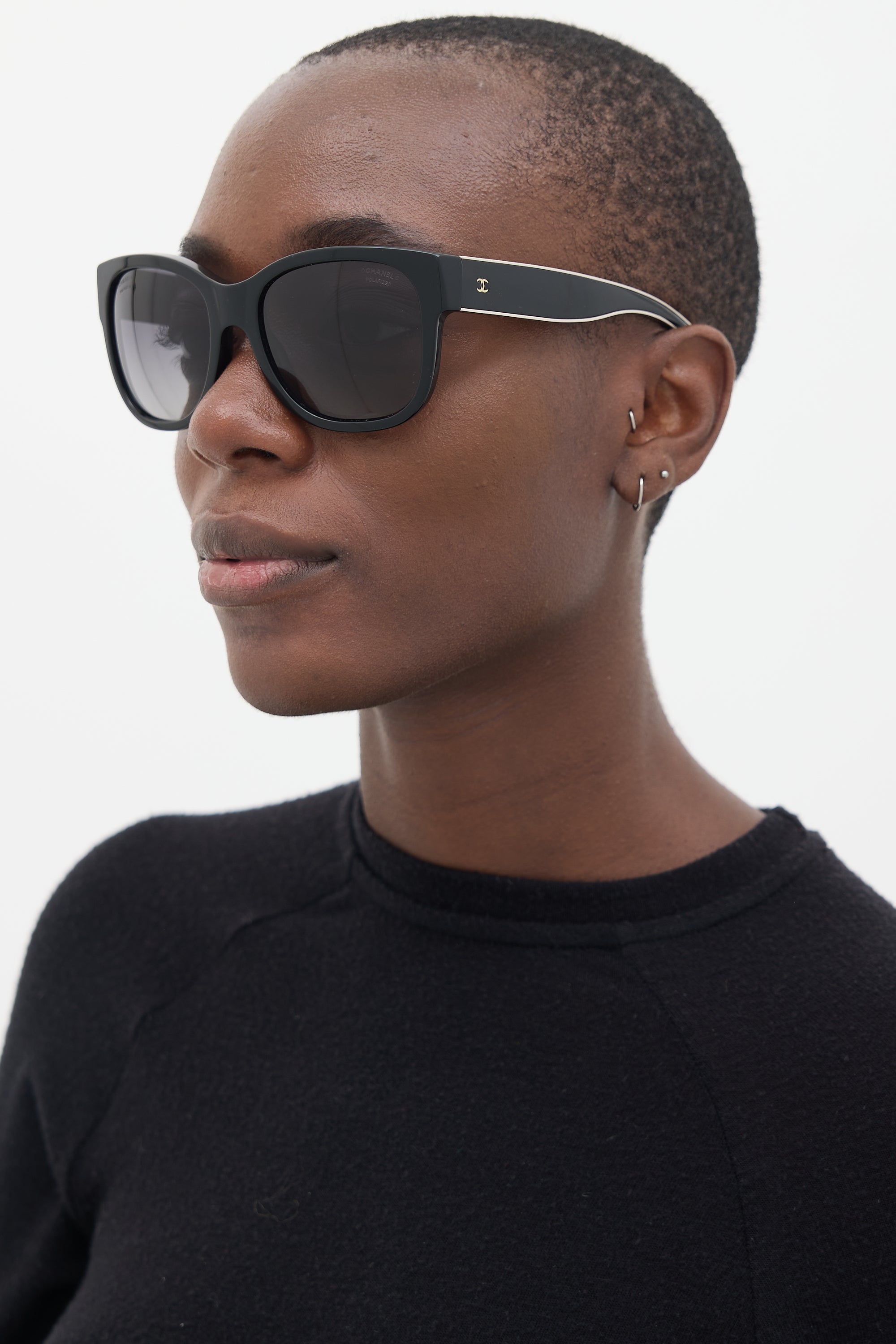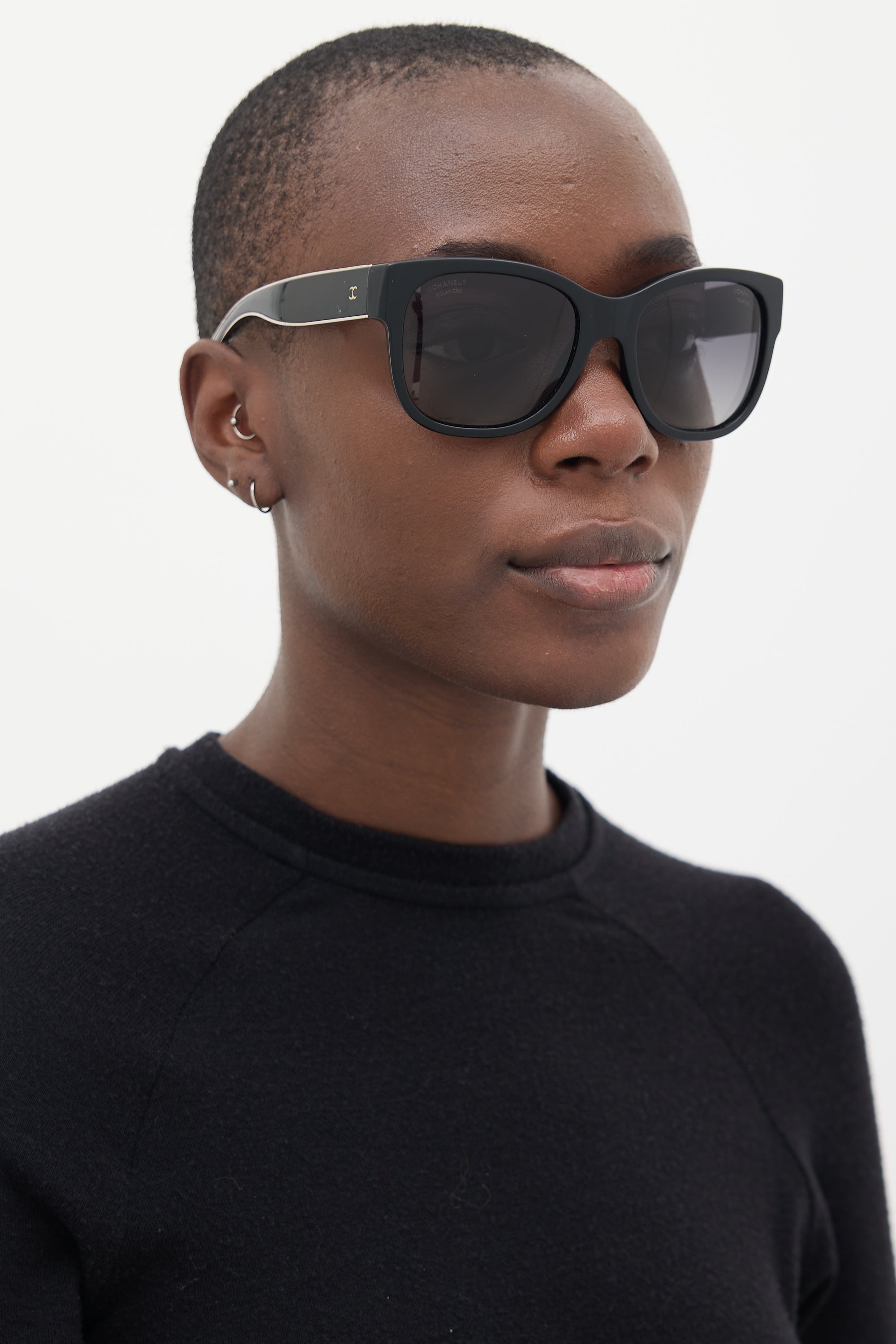 Pre-owned Chanel sunglasses featuring polarized grey gradient tinted lenses, black acetate square frame, silver tone accents at edges of arms, and inset gold tone interlocking CC logo at temples. Comes with original box, case, dust bag, and care guide.