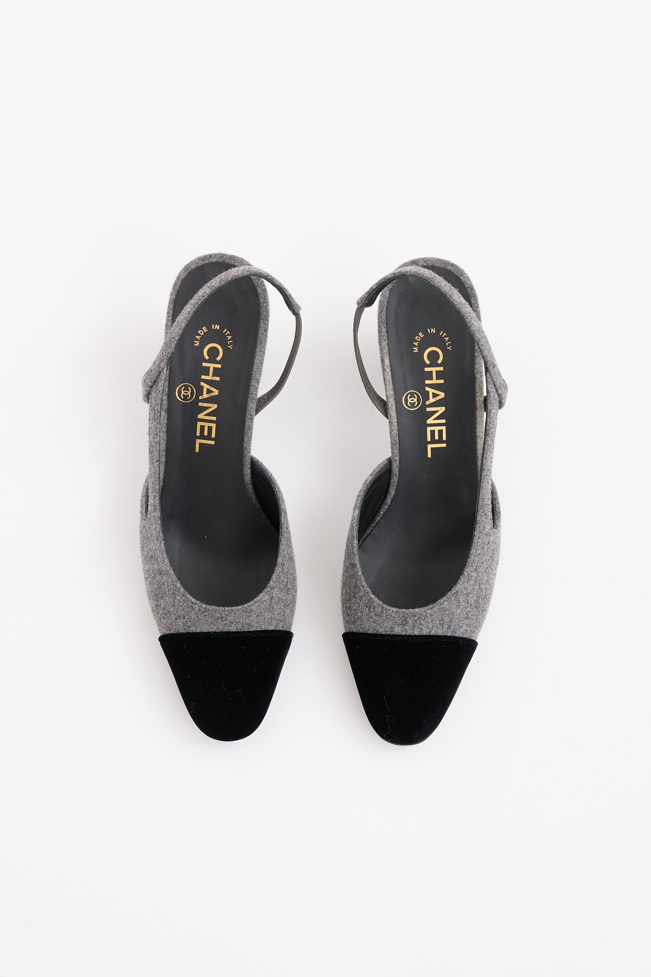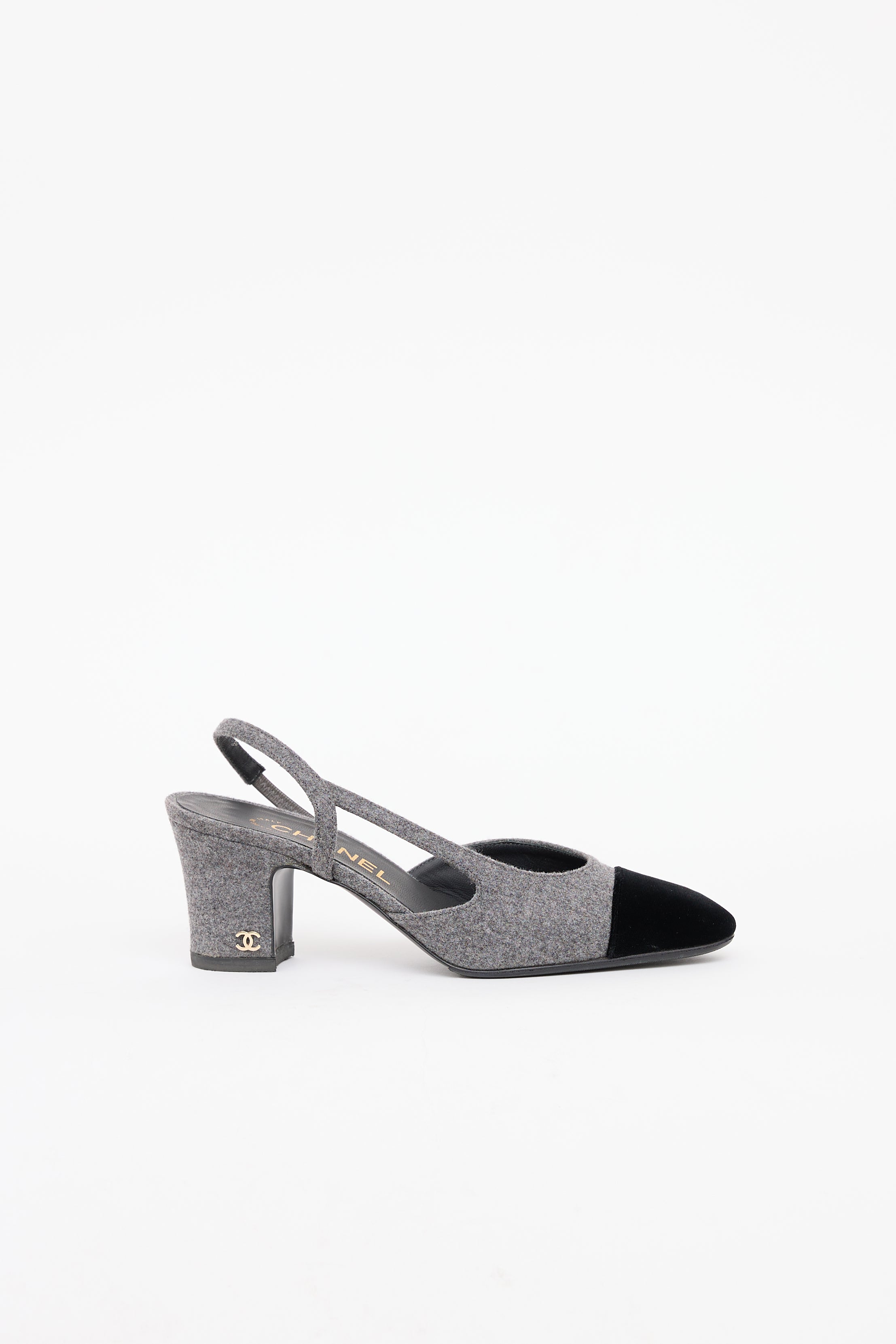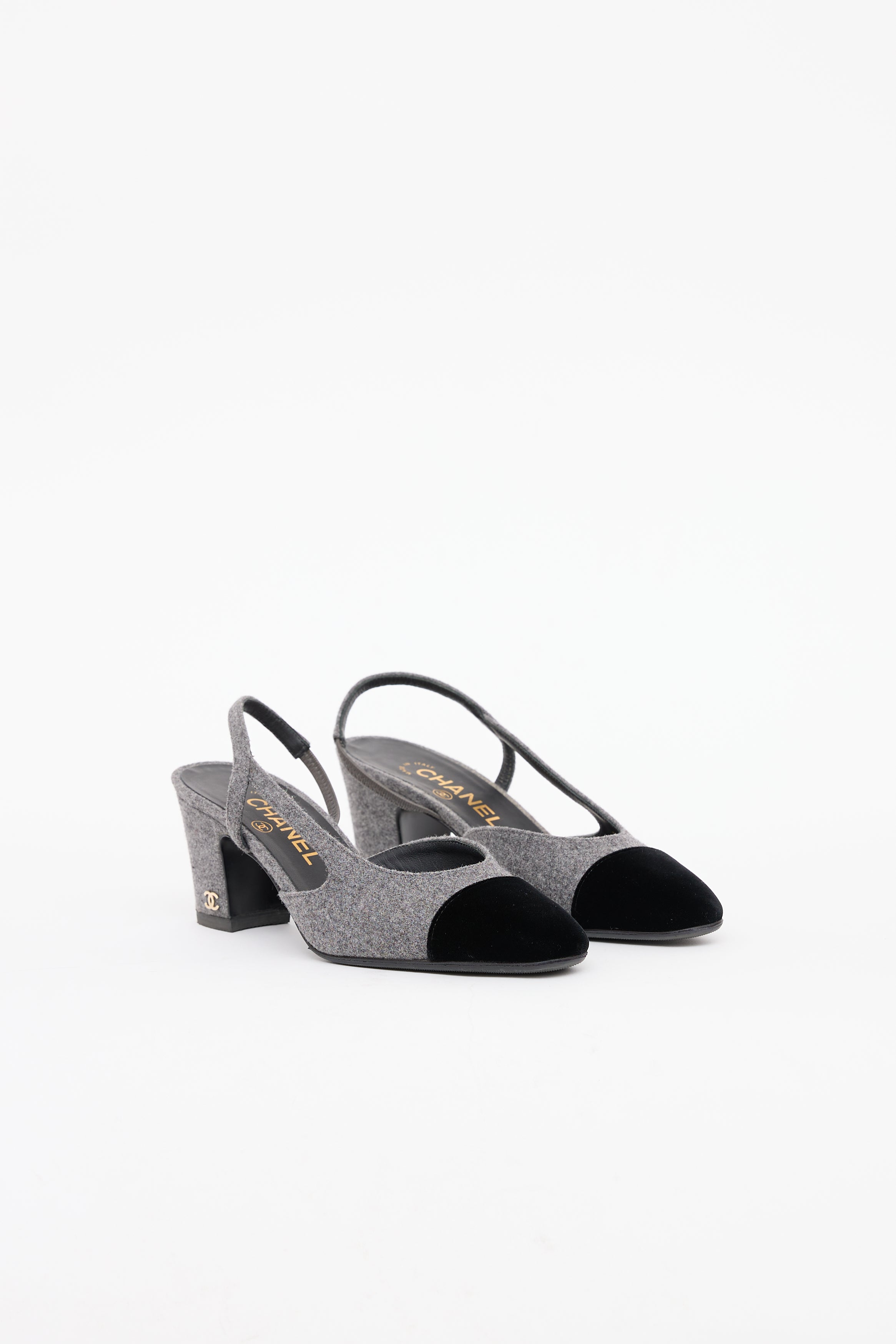 Pre-owned Chanel black and grey heels featuring round velvet cap toe, strap with cut out on side of upper, sling back and silver tone CC hardware on covered block heel.