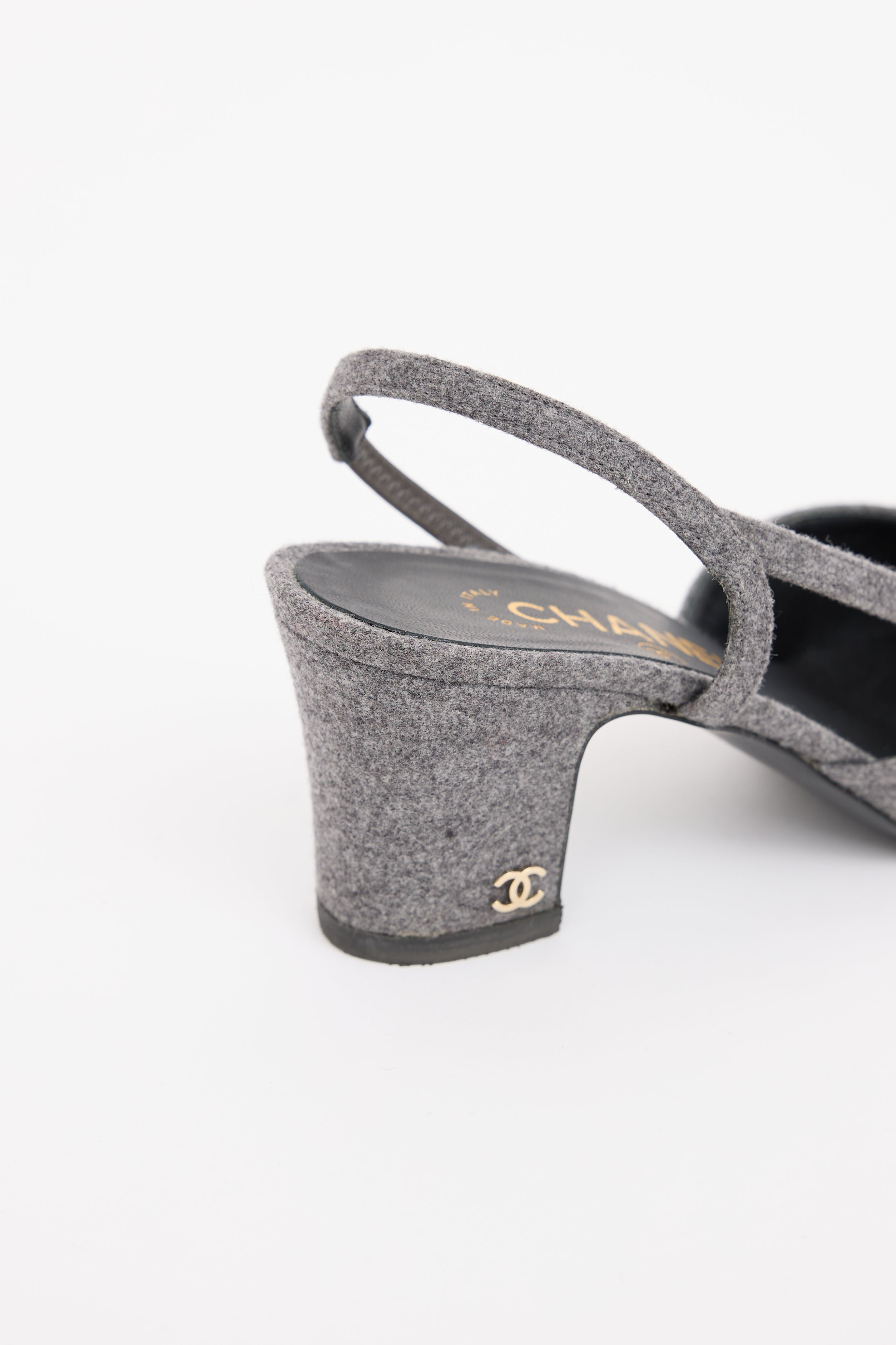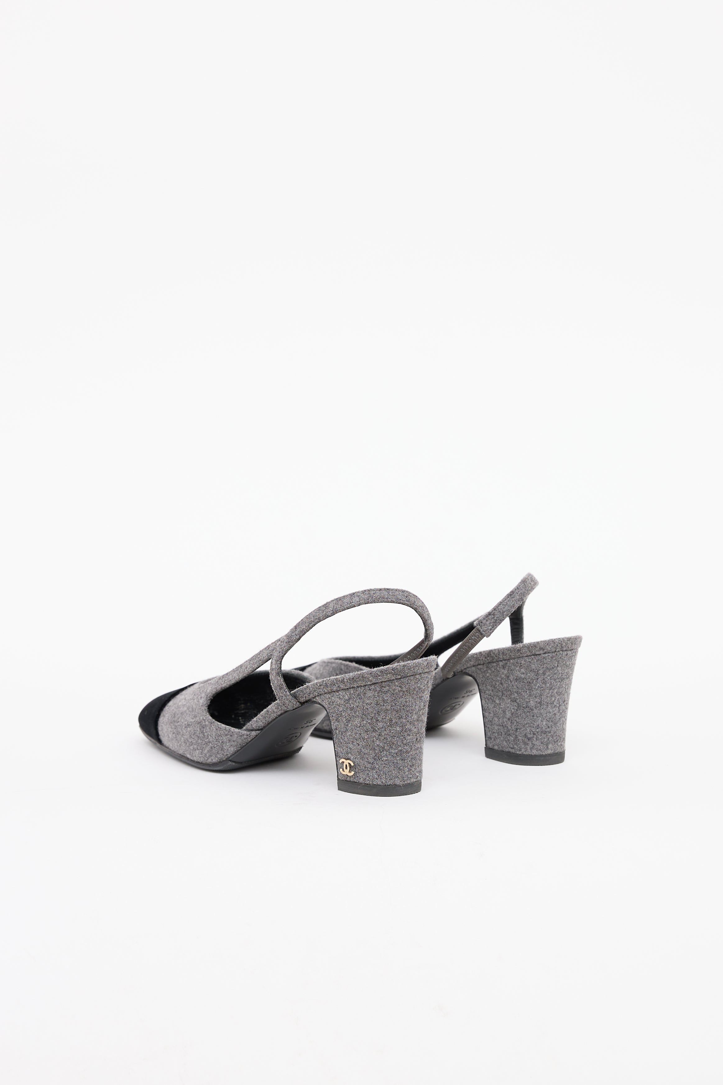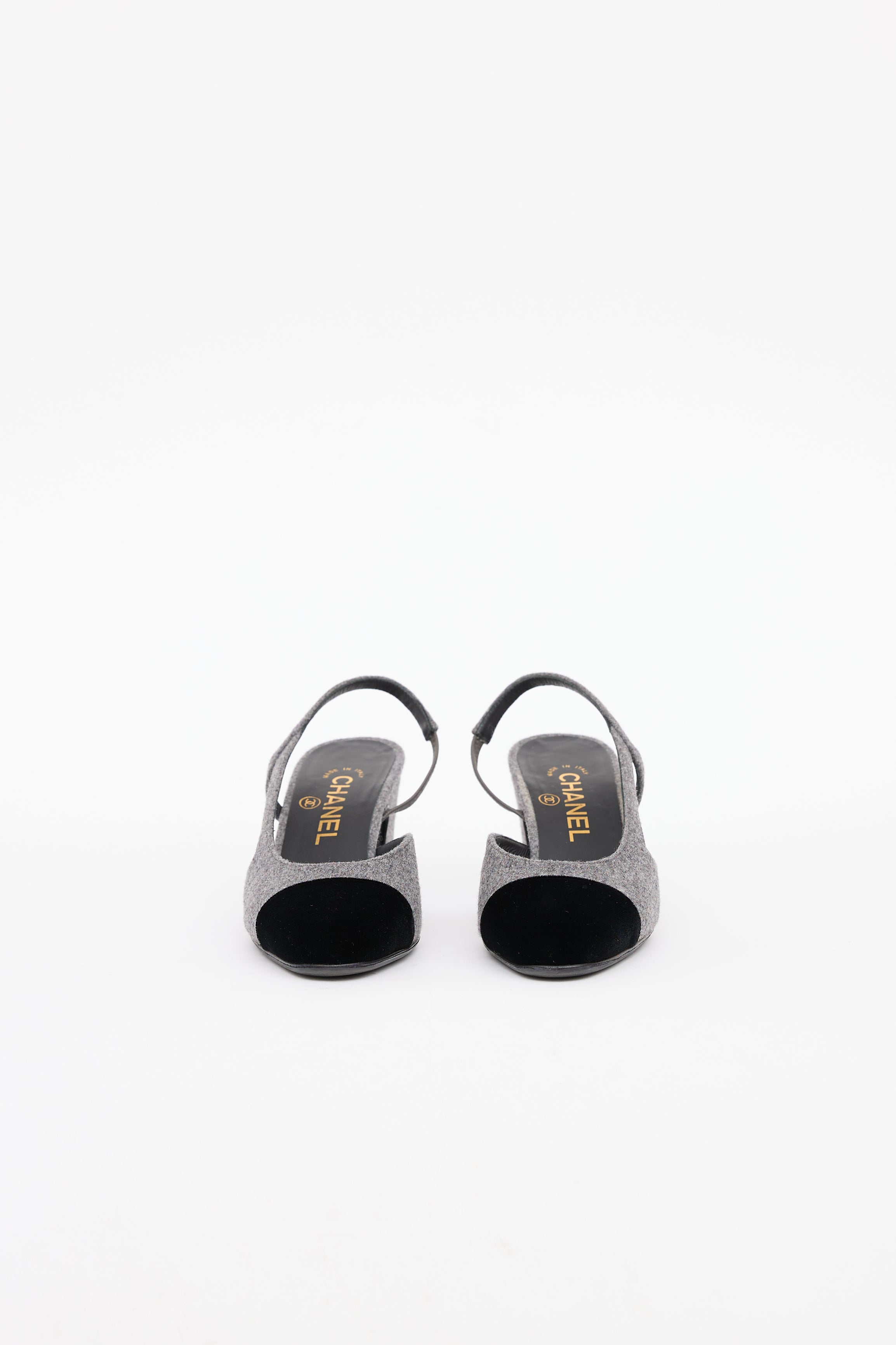 Pre-owned Chanel black and grey heels featuring round velvet cap toe, strap with cut out on side of upper, sling back and silver tone CC hardware on covered block heel.