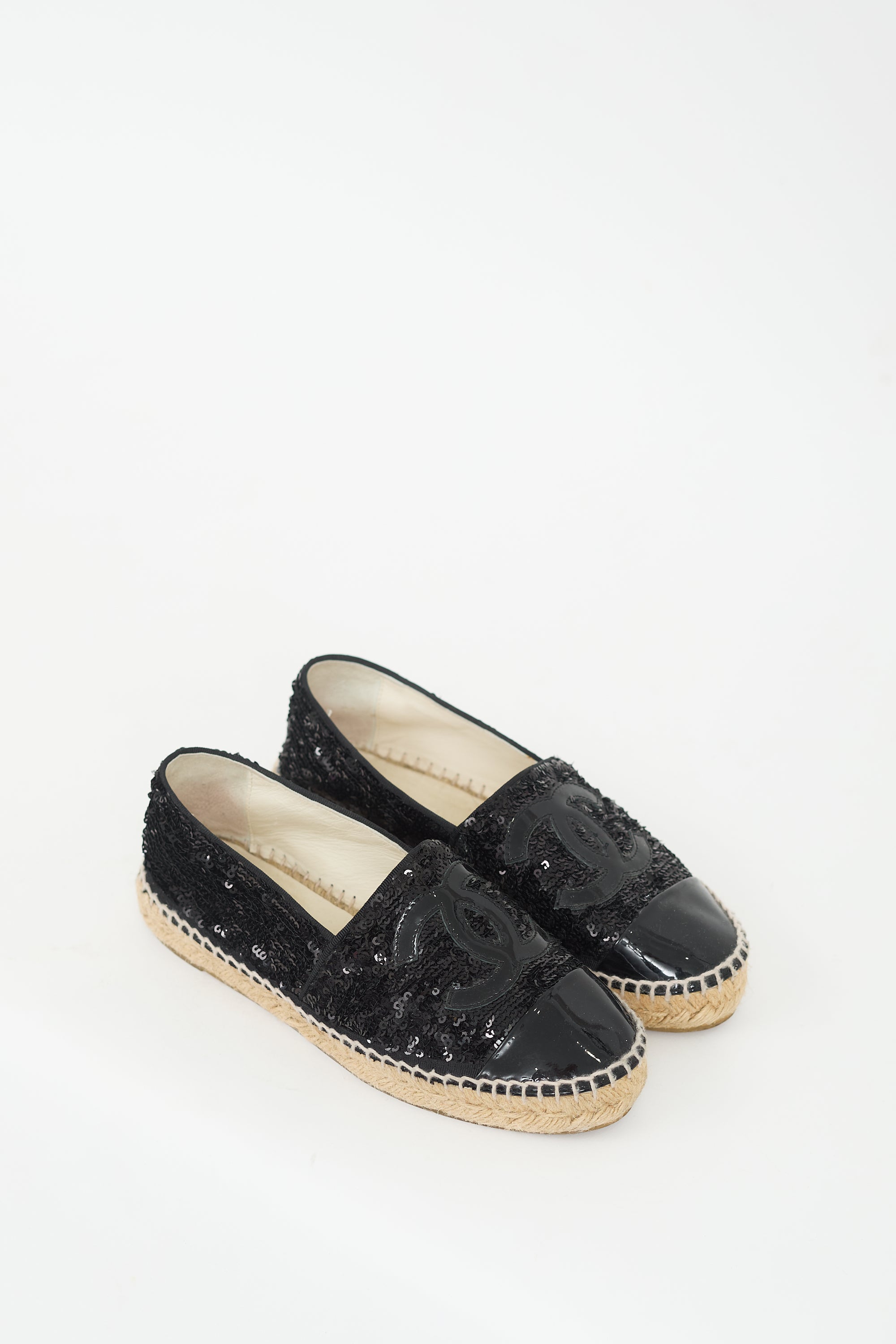 Pre-owned Chanel black sequin espadrilles featuring a rounded toe with patent leather cap, panelled construction, interlocking patent CC logo at vamp, slip on entry, leather interior, and braided jute midsole.