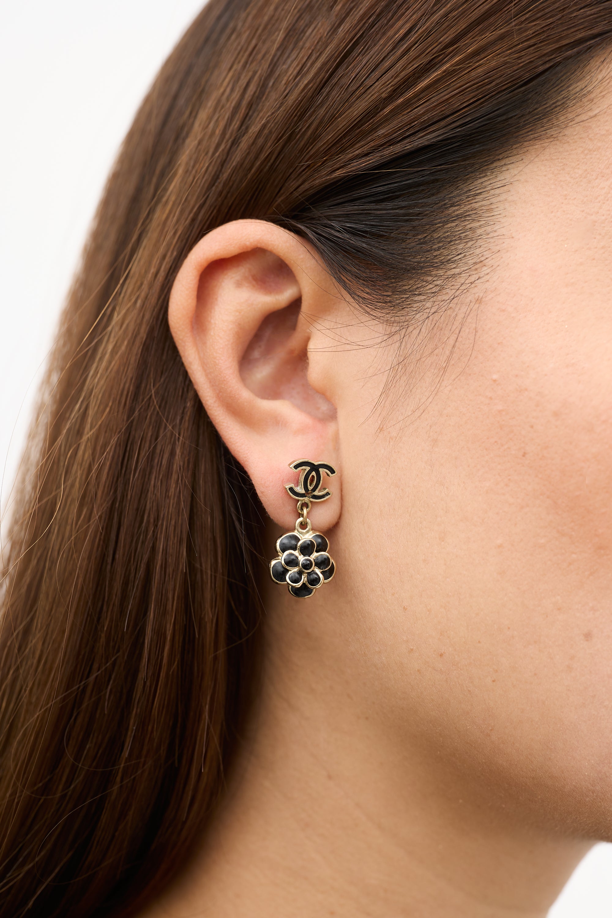 Pre-owned Chanel Spring/Summer 2009 gold tone earrings featuring black inlaid interlocking CC and camellia motif drop pendant and post back. Stamped with designer signature, "09", interlocking CC circle logo, "P", and "Made in France."