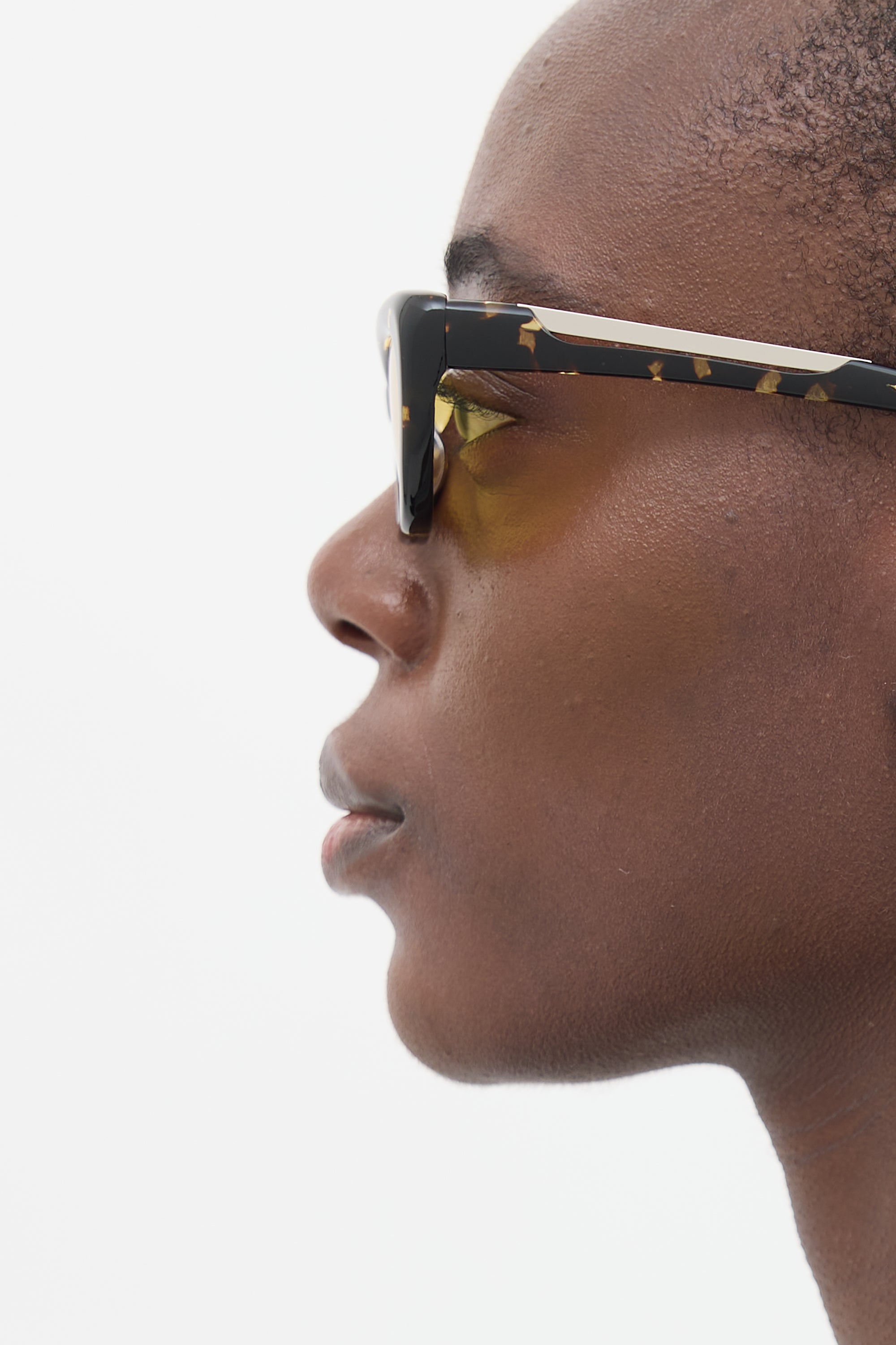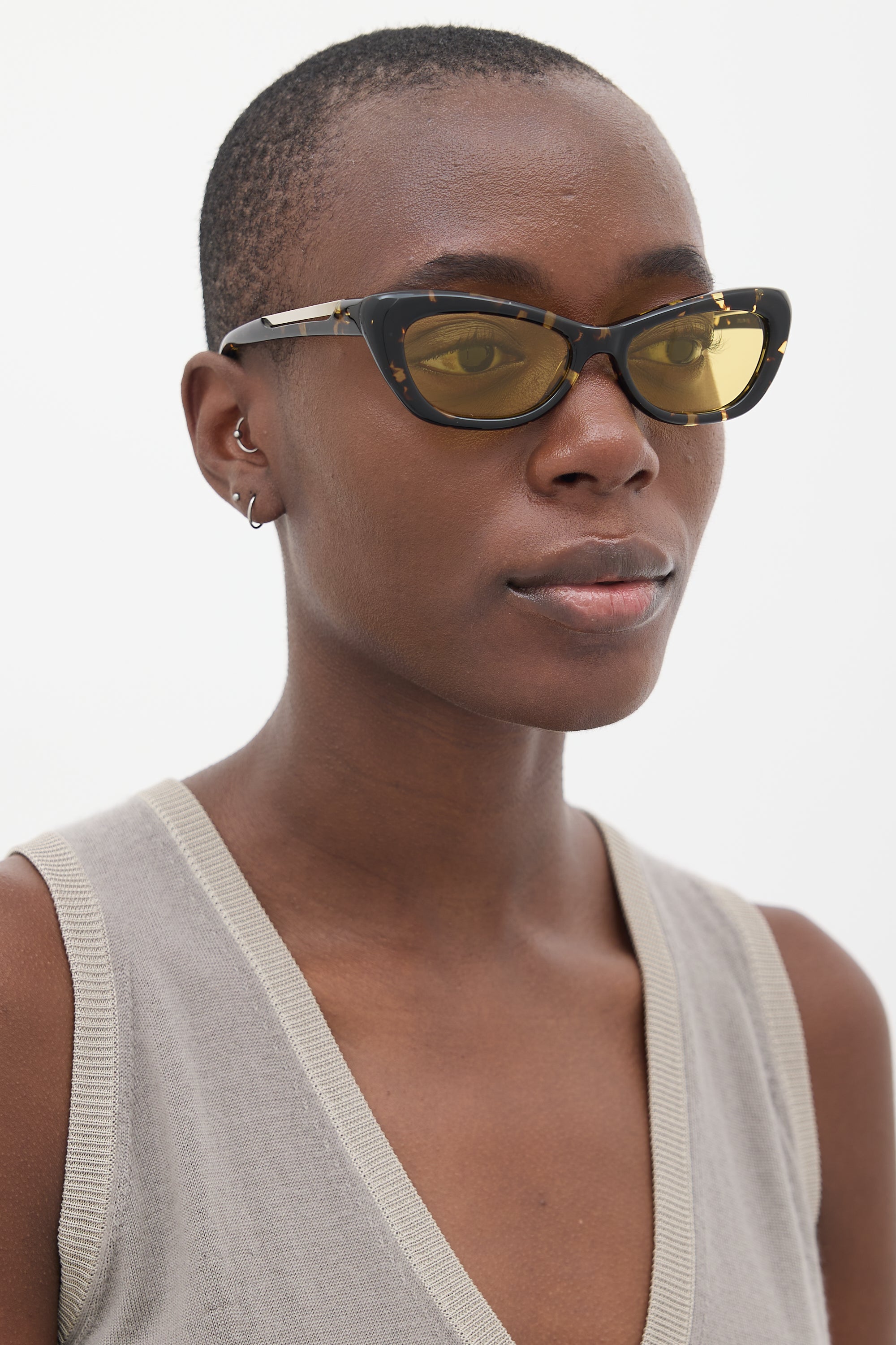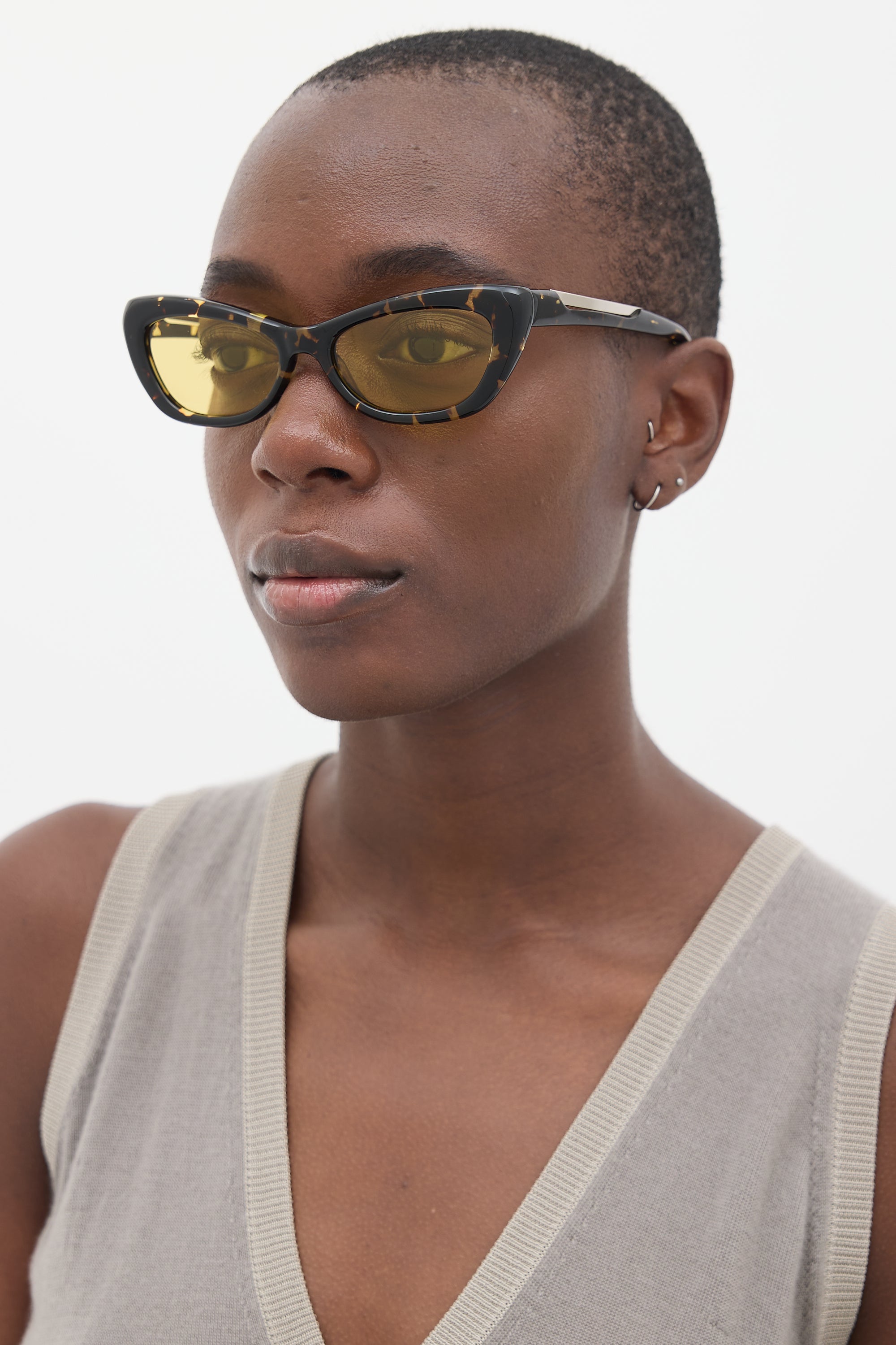 Pre-owned Christopher Esber Dillon sunglasses featuring yellow tinted lenses, yellow and brown tortoiseshell cateye frame, and silver tone hardware accent at arms. Comes with original case and wipe cloth.