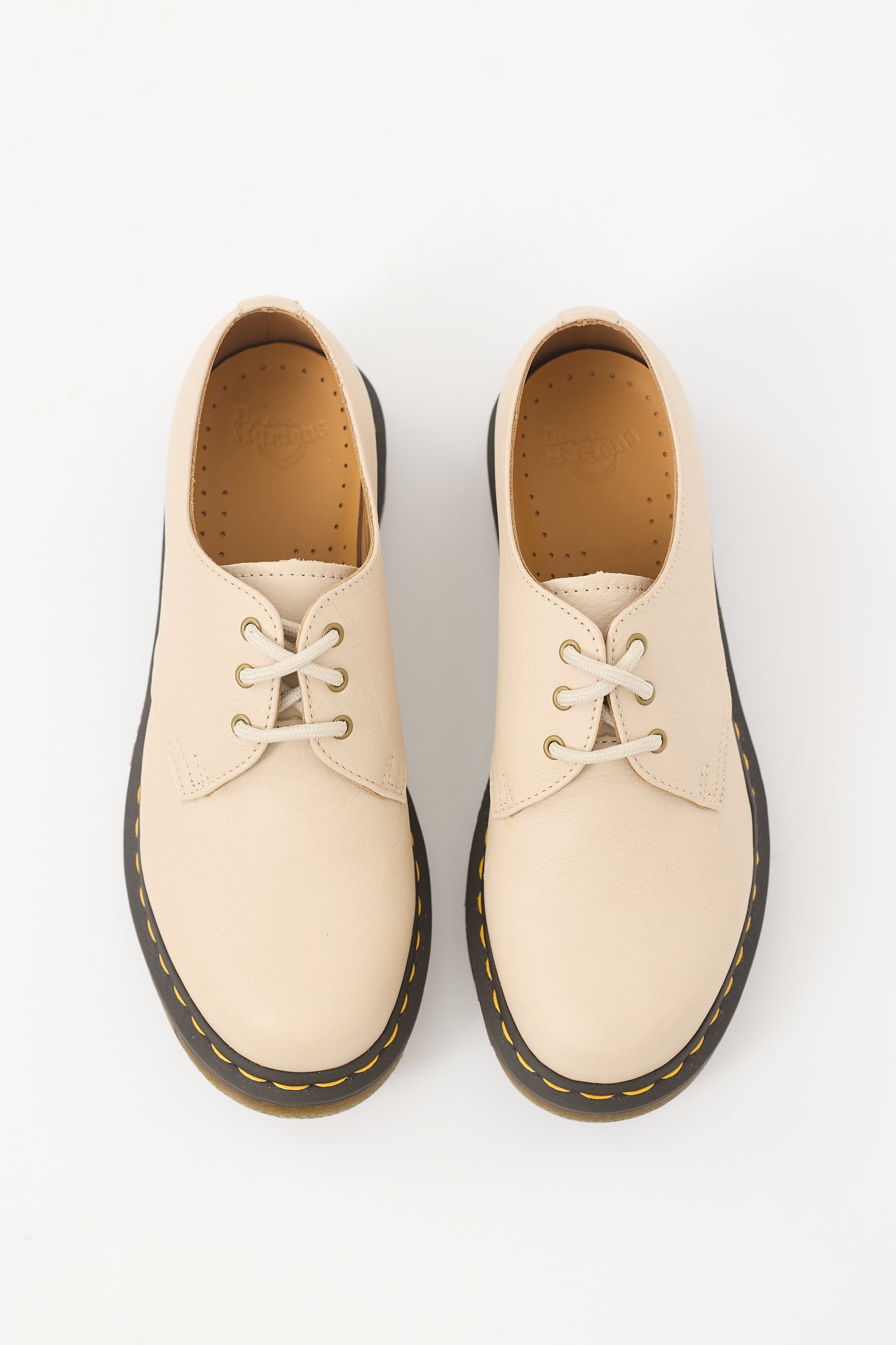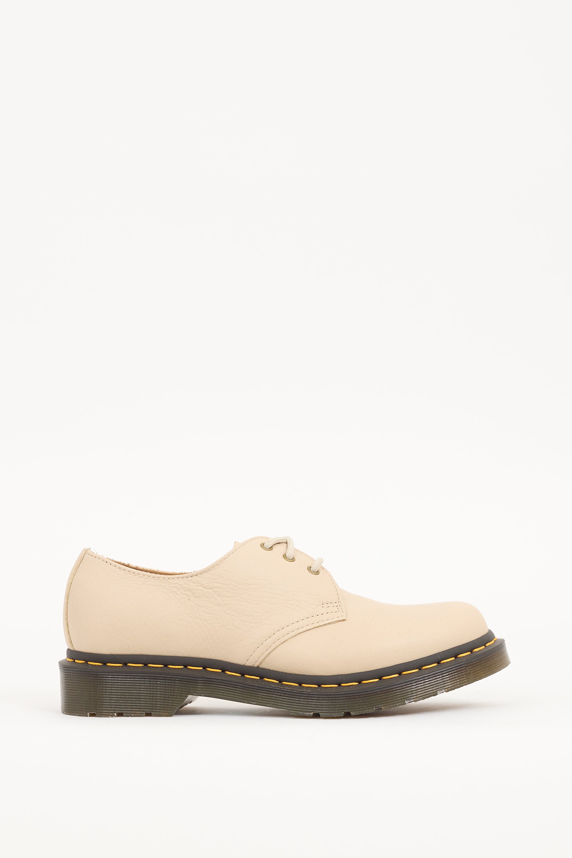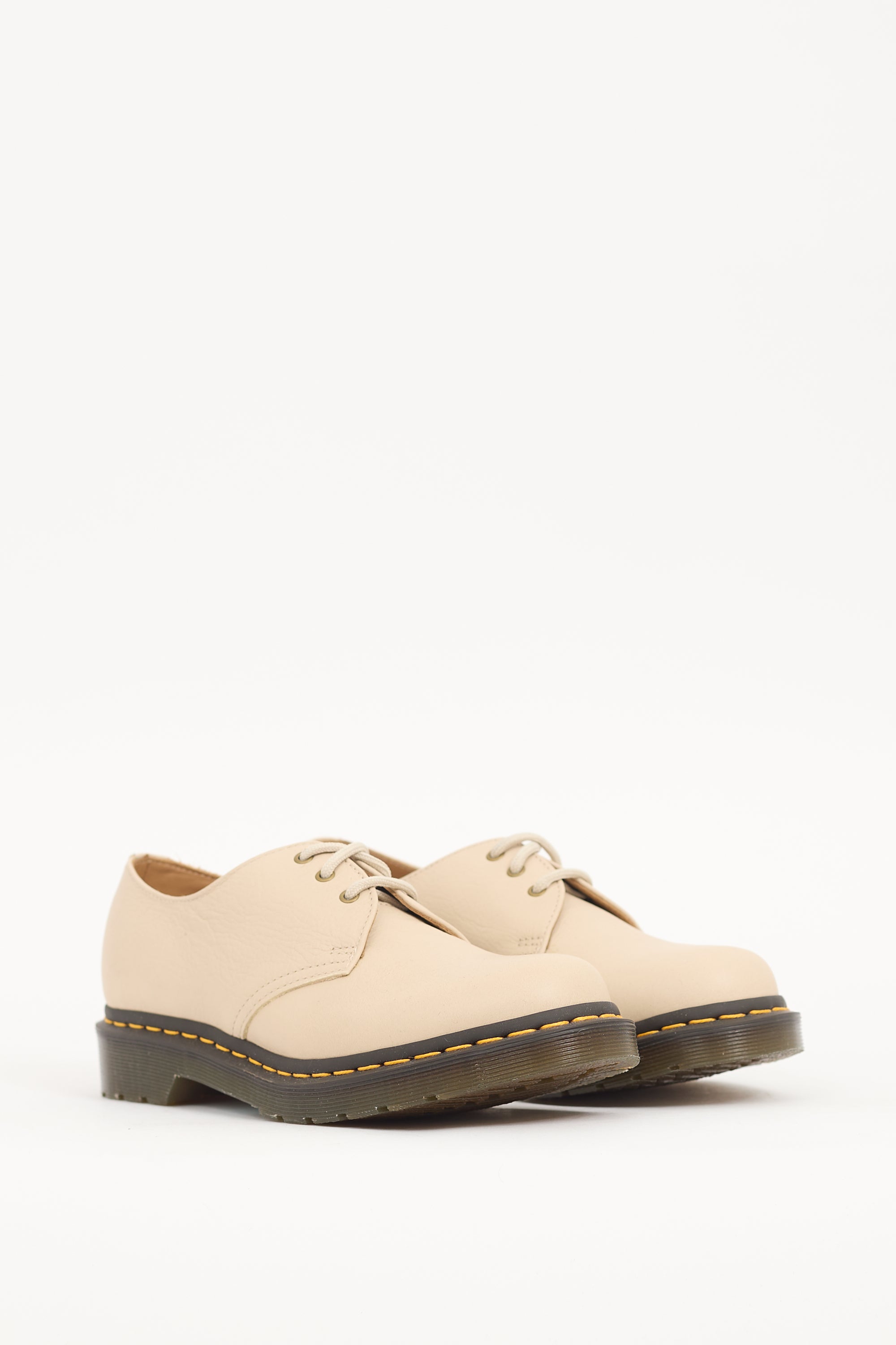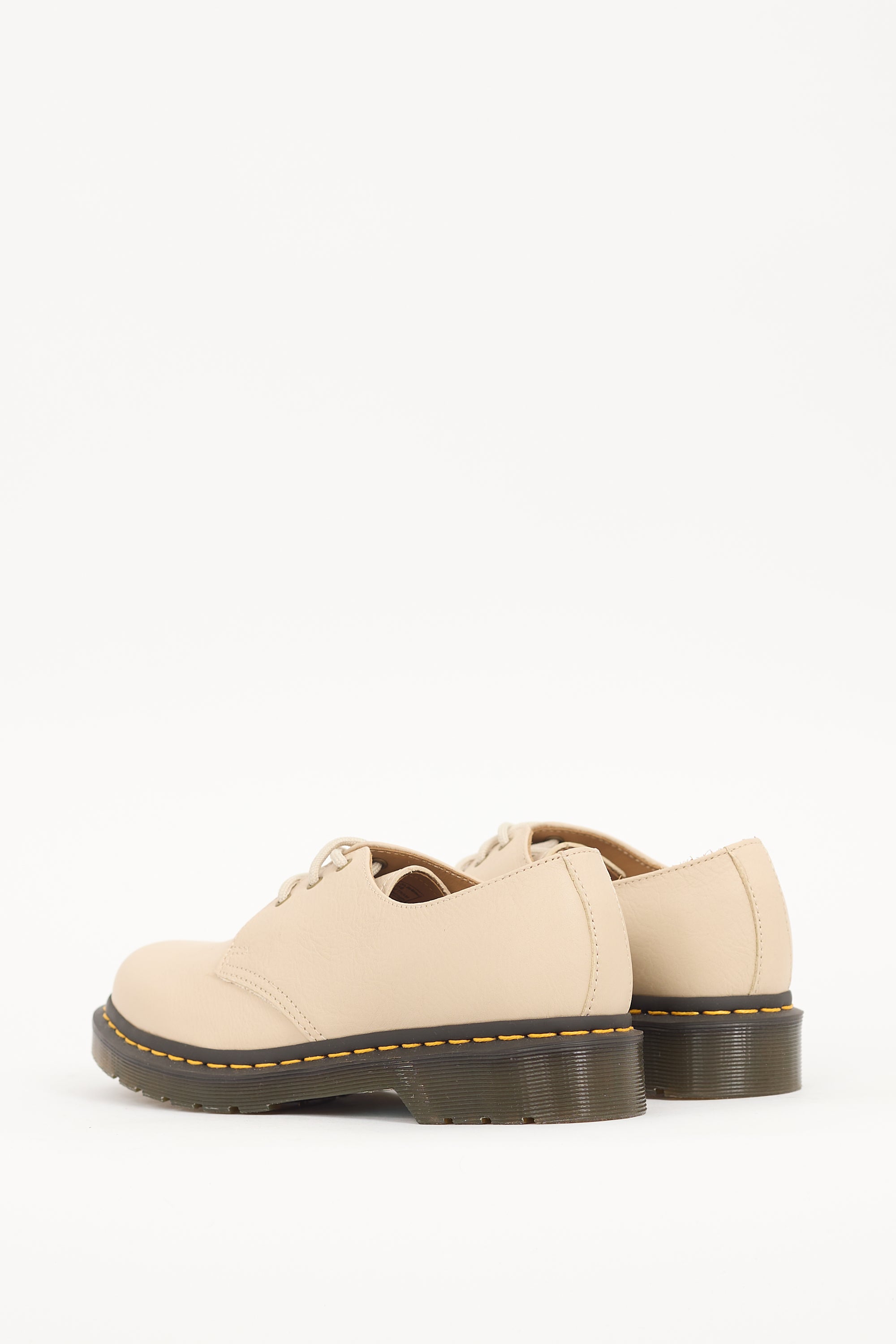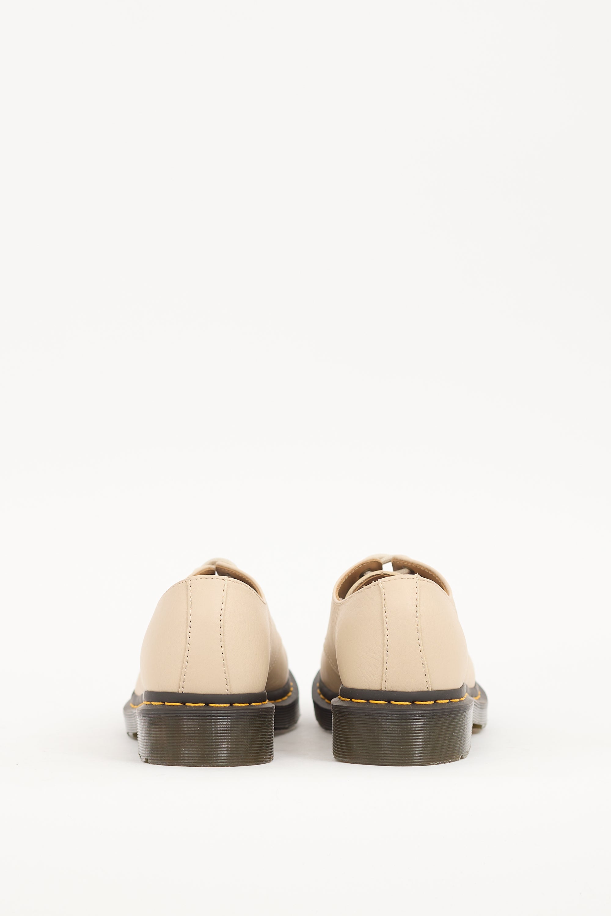 Pre-owned Dr. Martens beige leather 1461 derby shoes featuring a rounded toe, open lace up vamp, and signature treaded rubber sole with yellow top stitching.