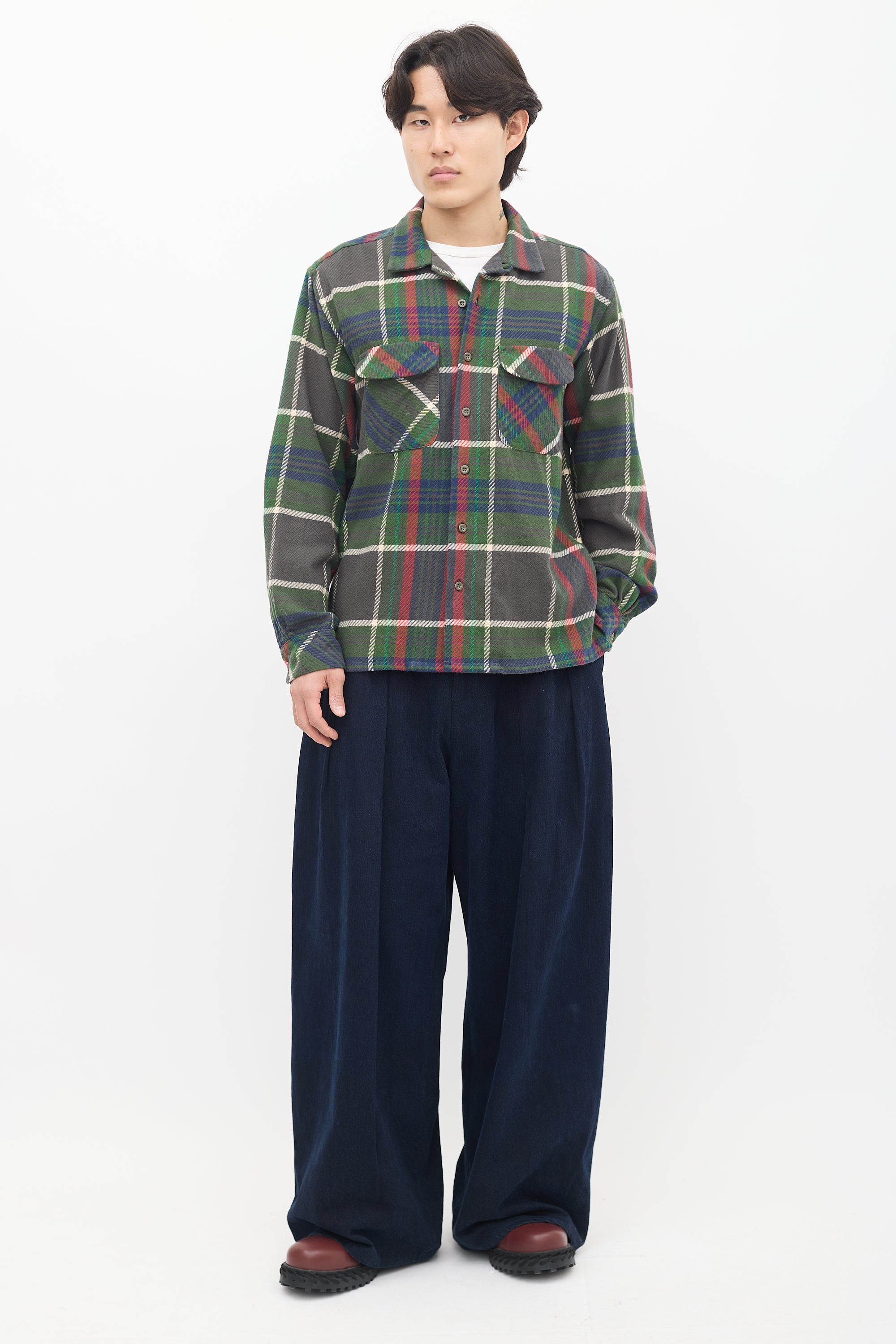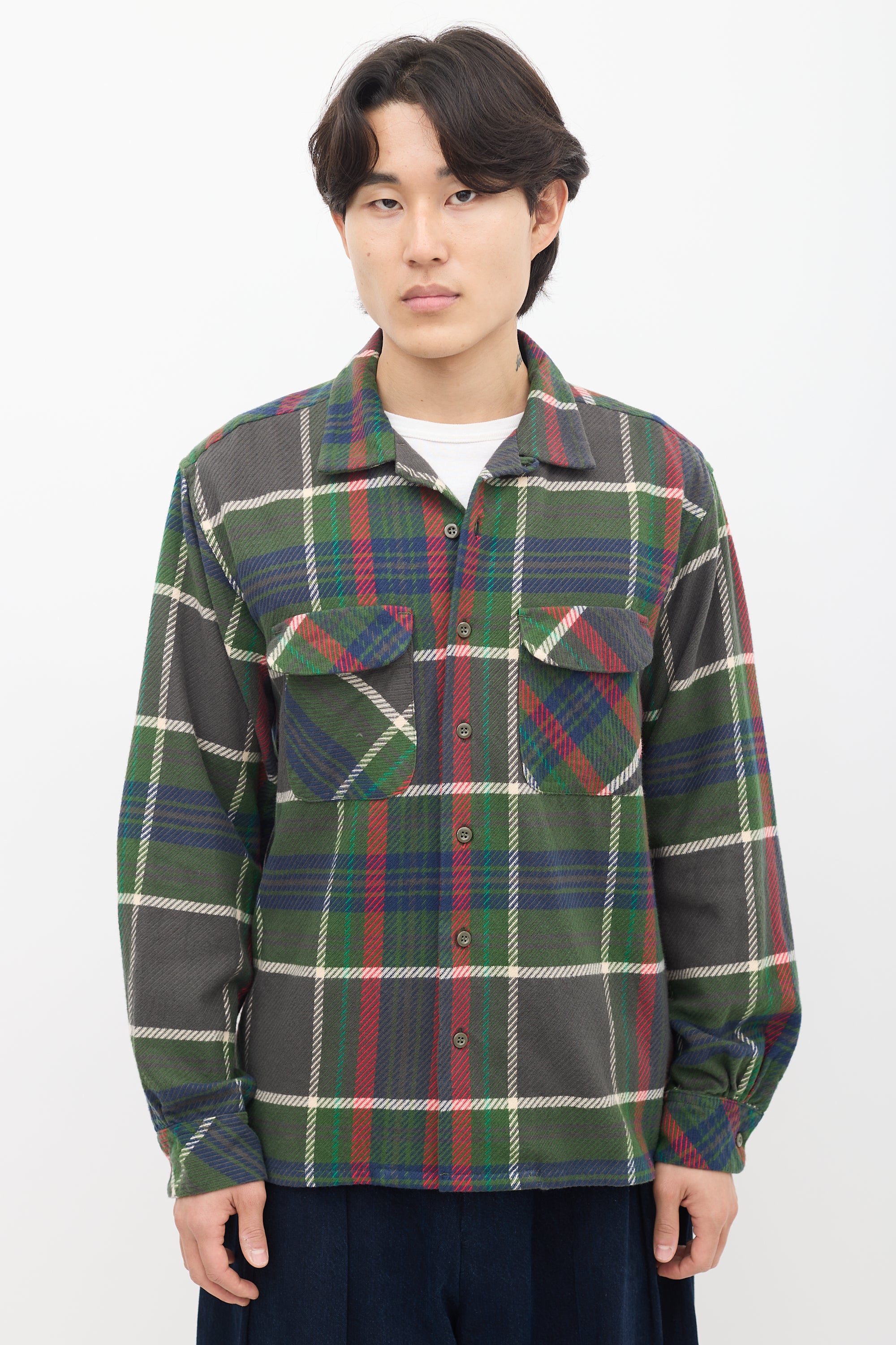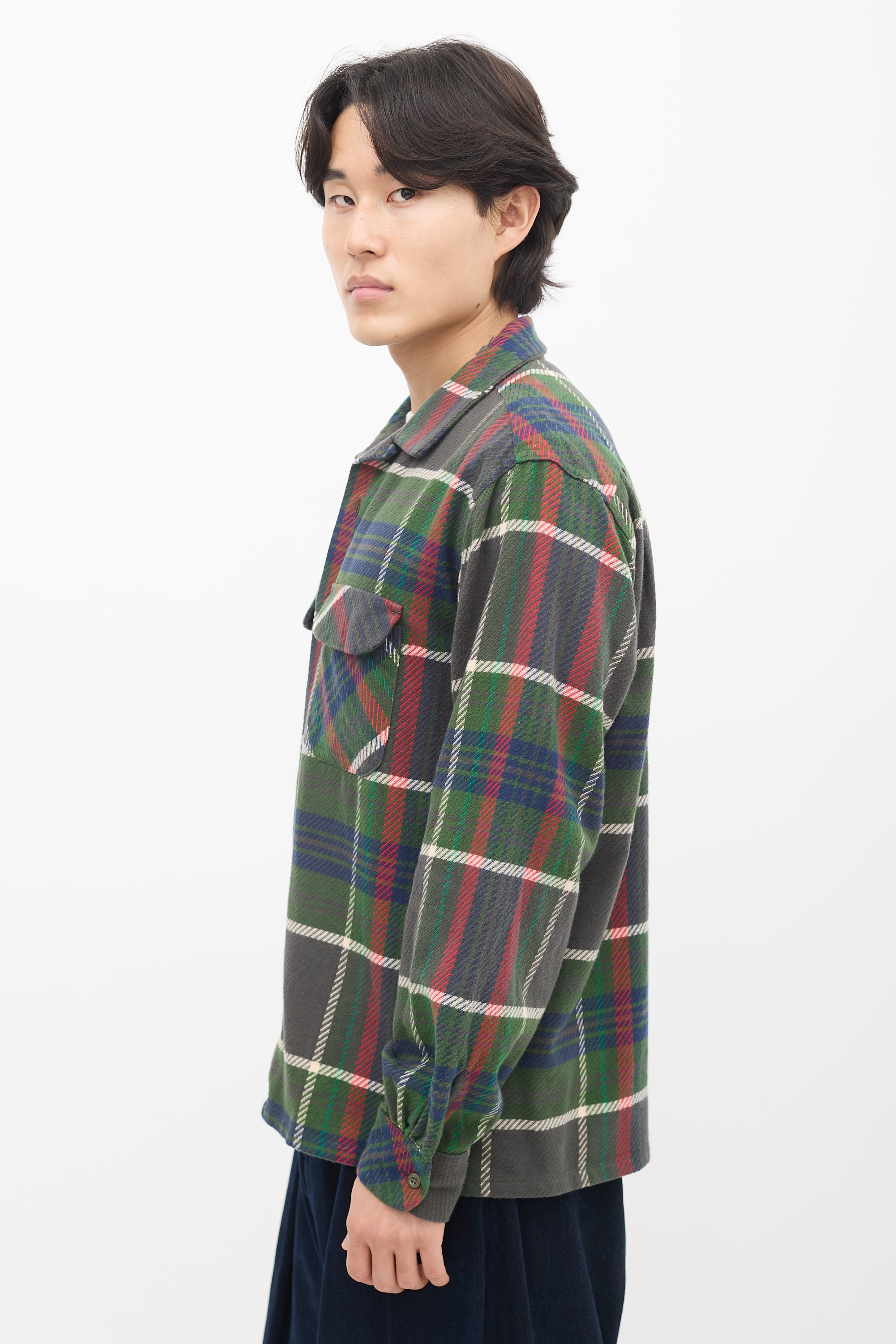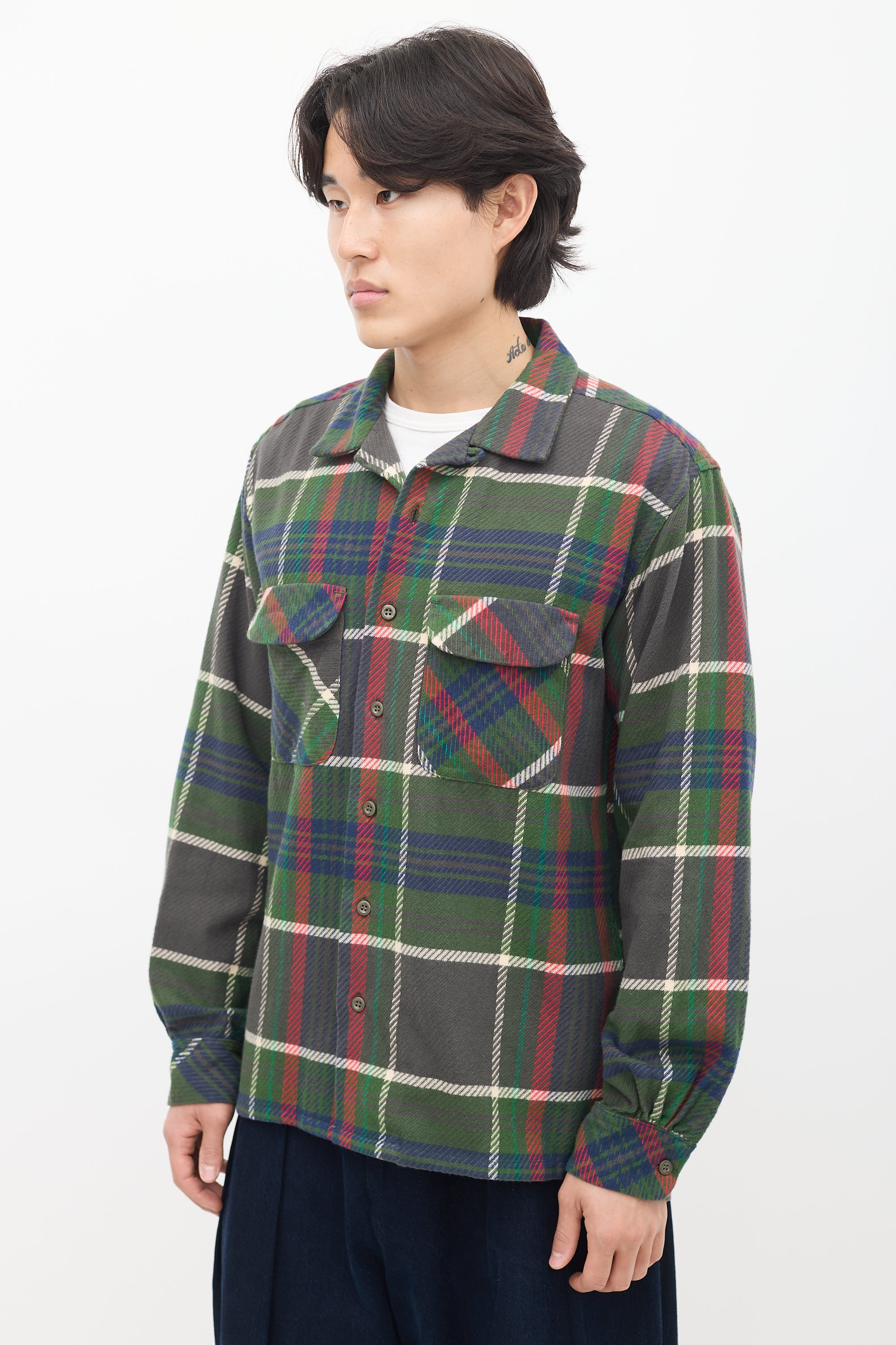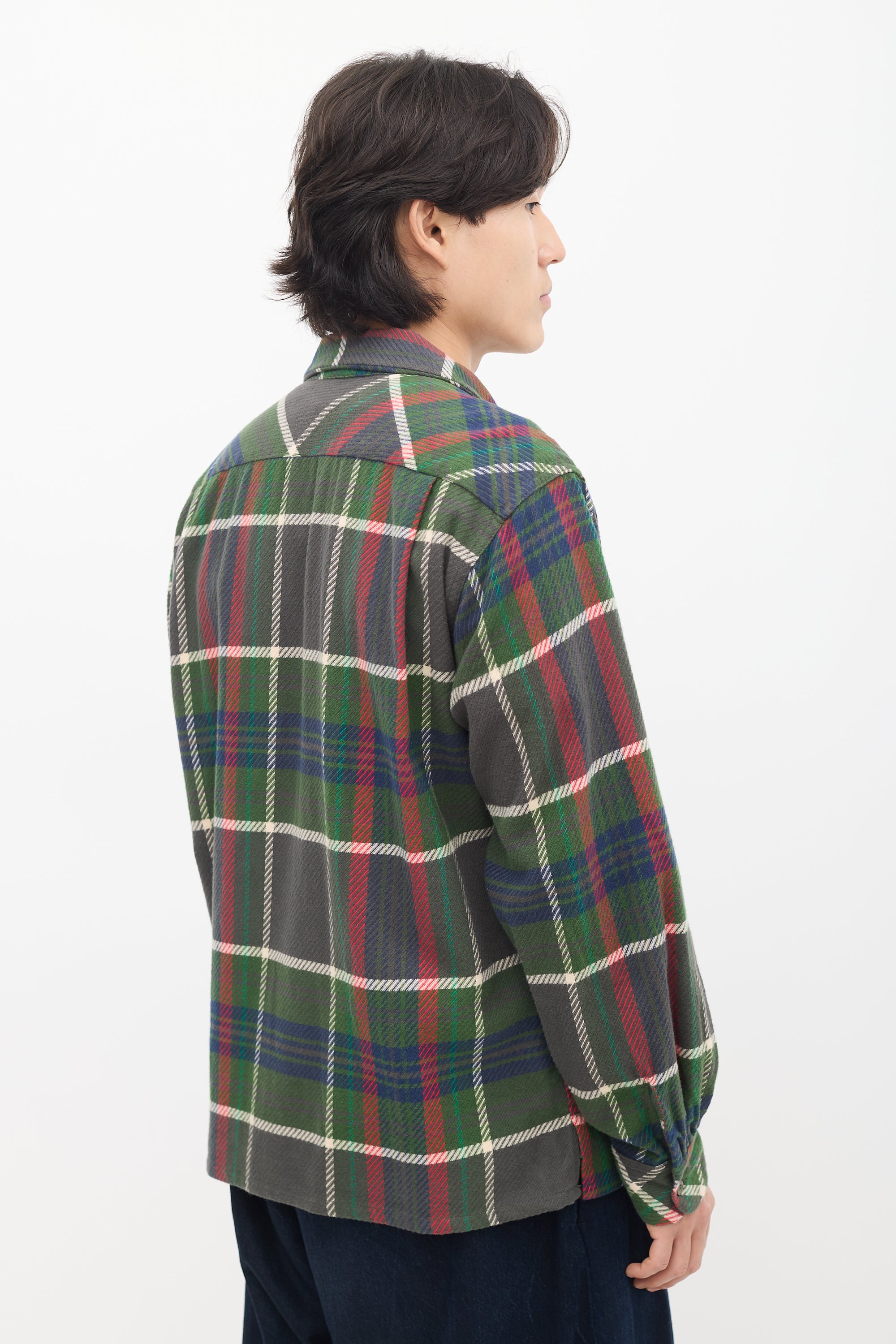 Pre-owned Engineered Garments green and multicolour plaid flannel shirt featuring a convertible collar, button up front closure, two front flap pockets, side vents, and pleated and buttoned cuffs.