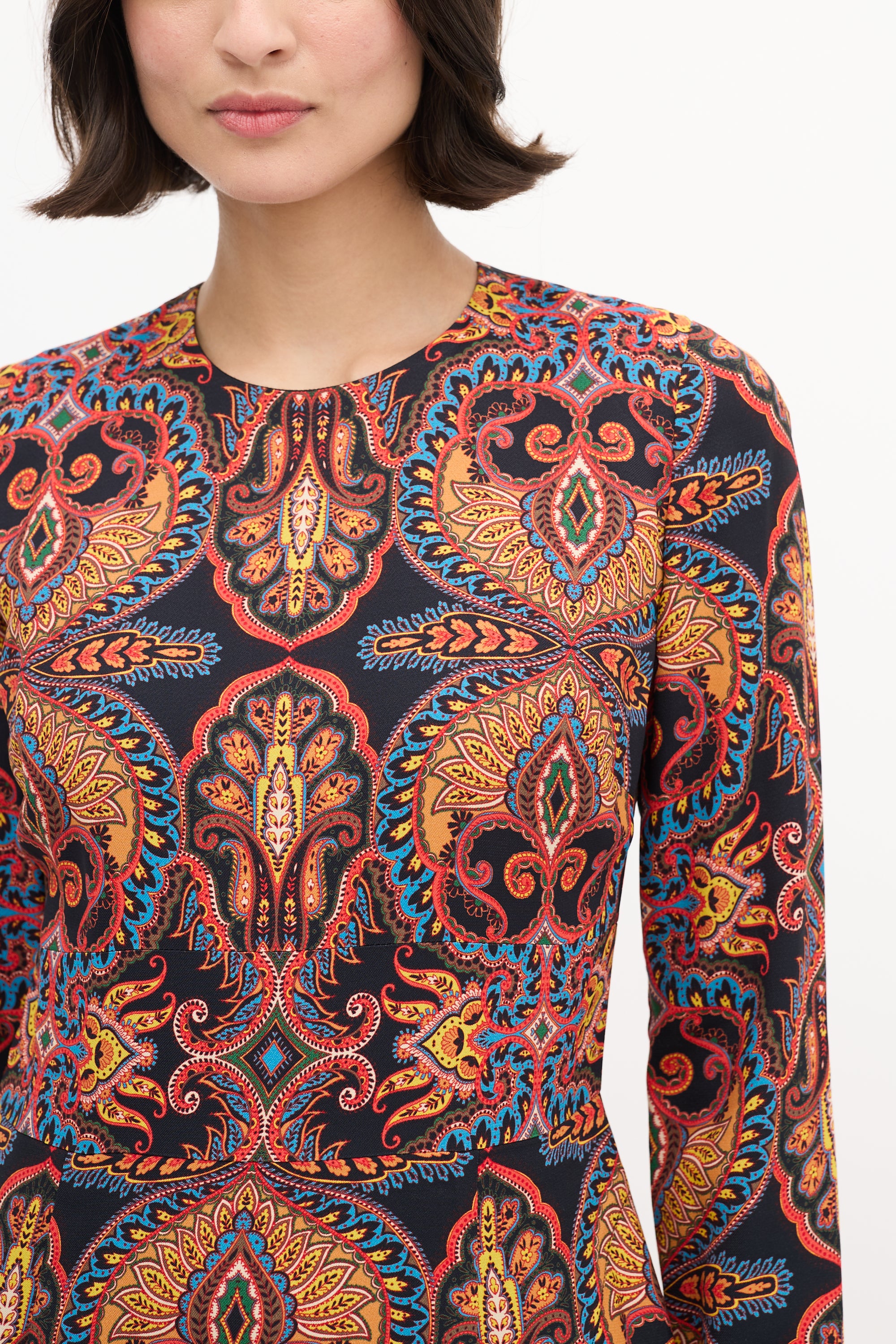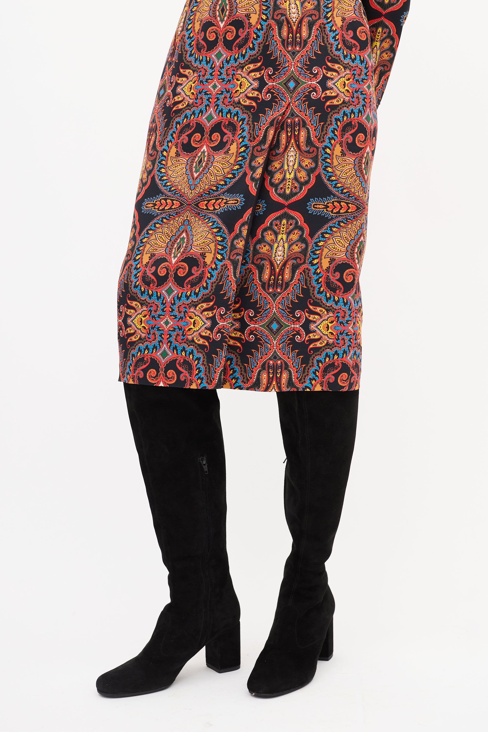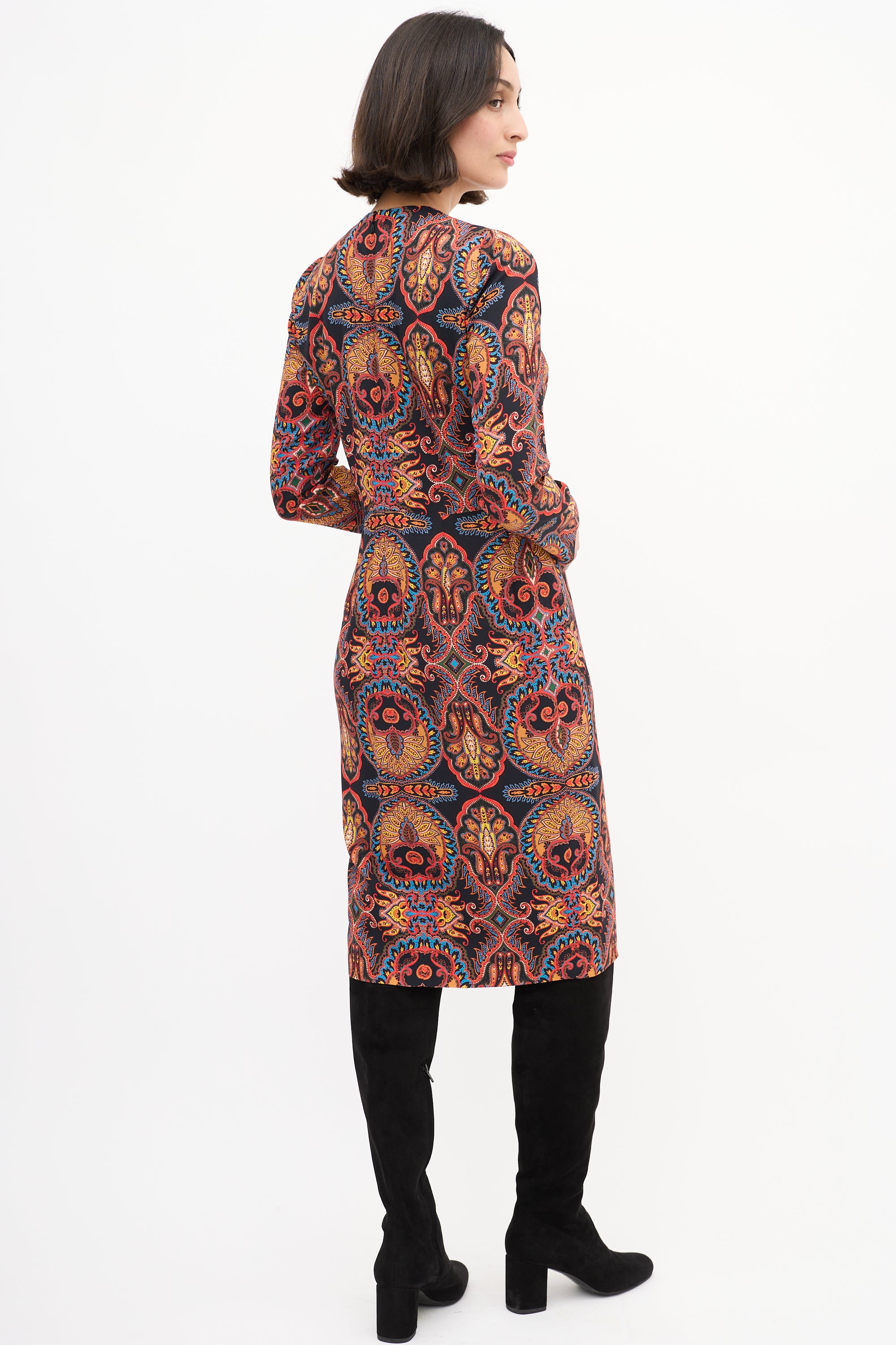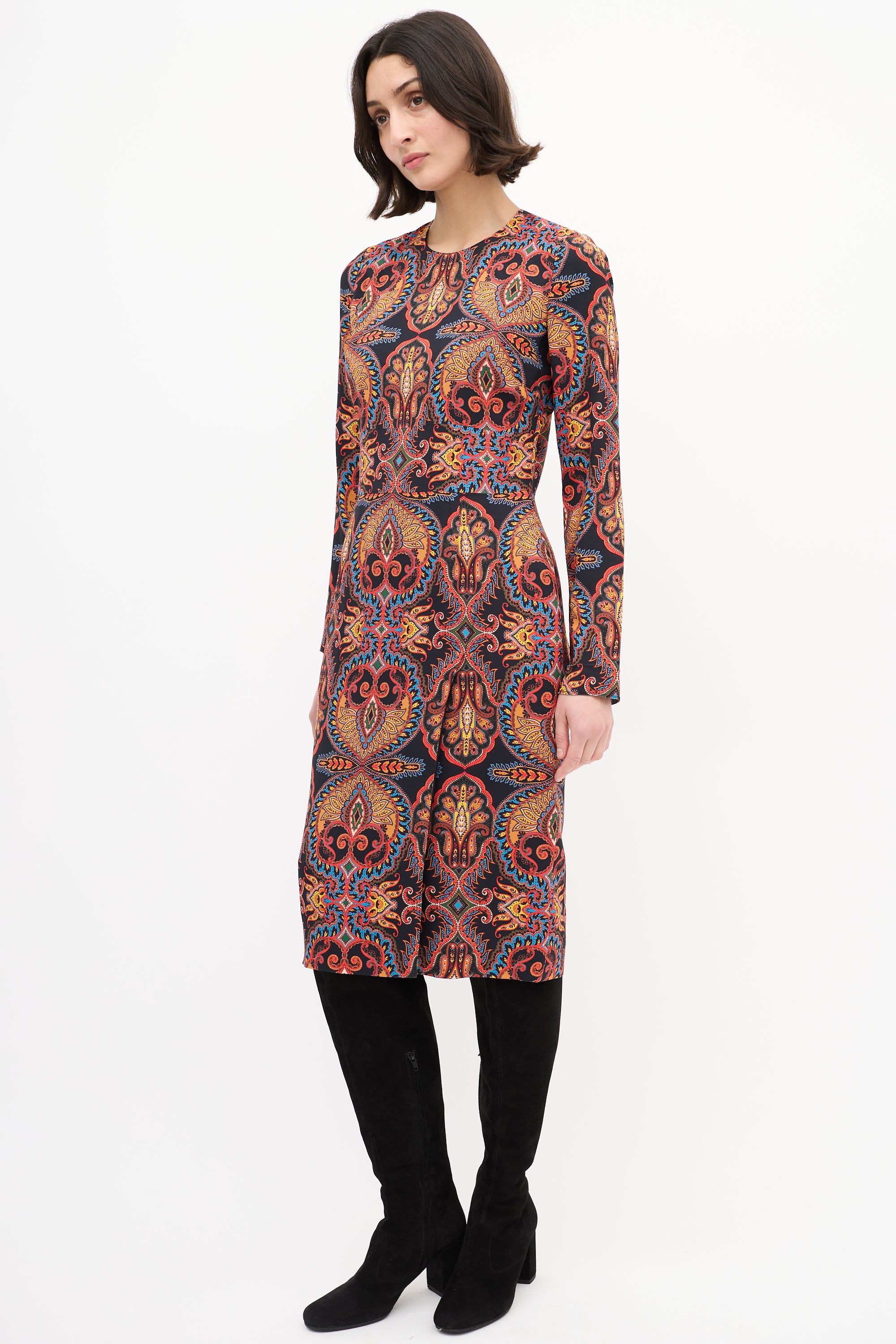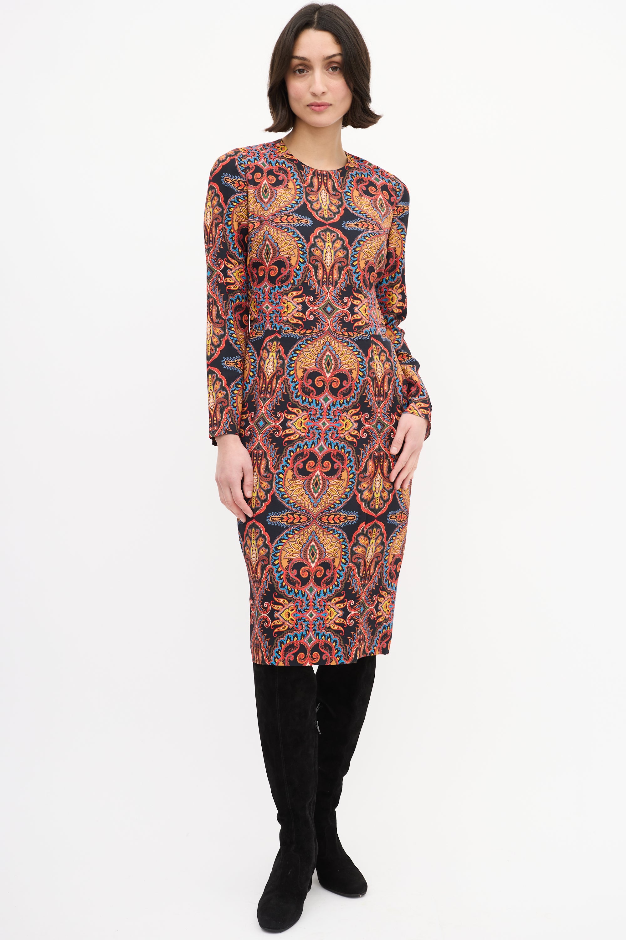 Pre-owned Etro black, orange, and multicolour midi sheath dress featuring a round neckline, faux front leg slit, long sleeves, concealed back zip closure, and ornate print throughout. Lined.