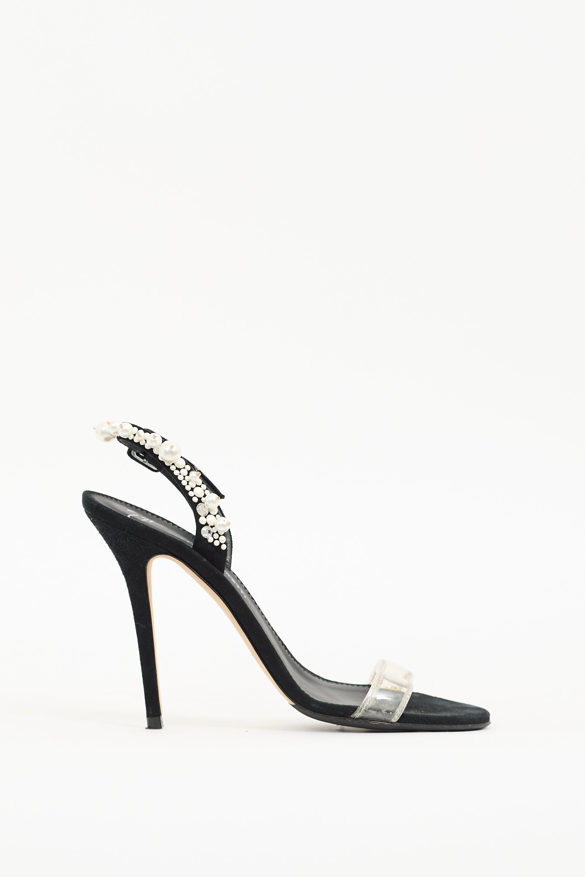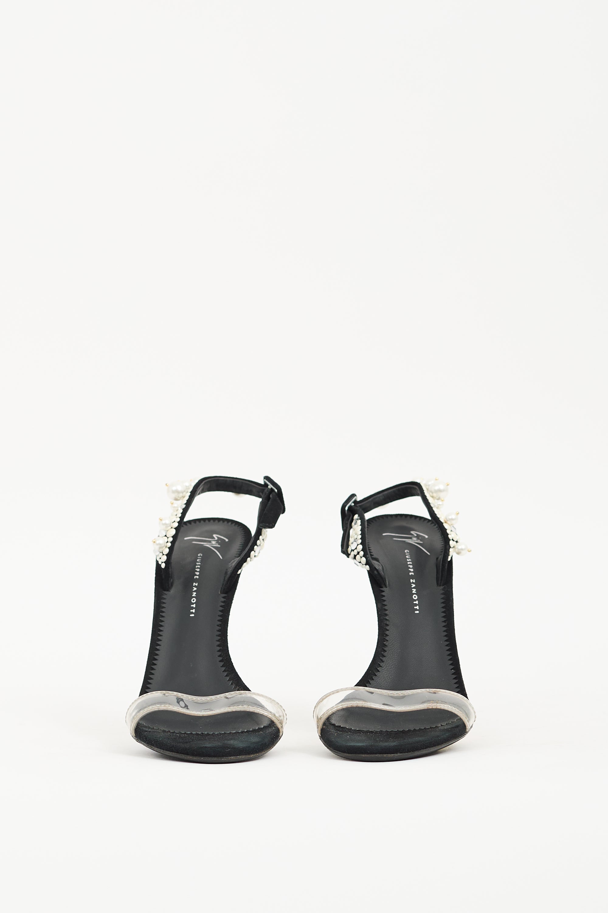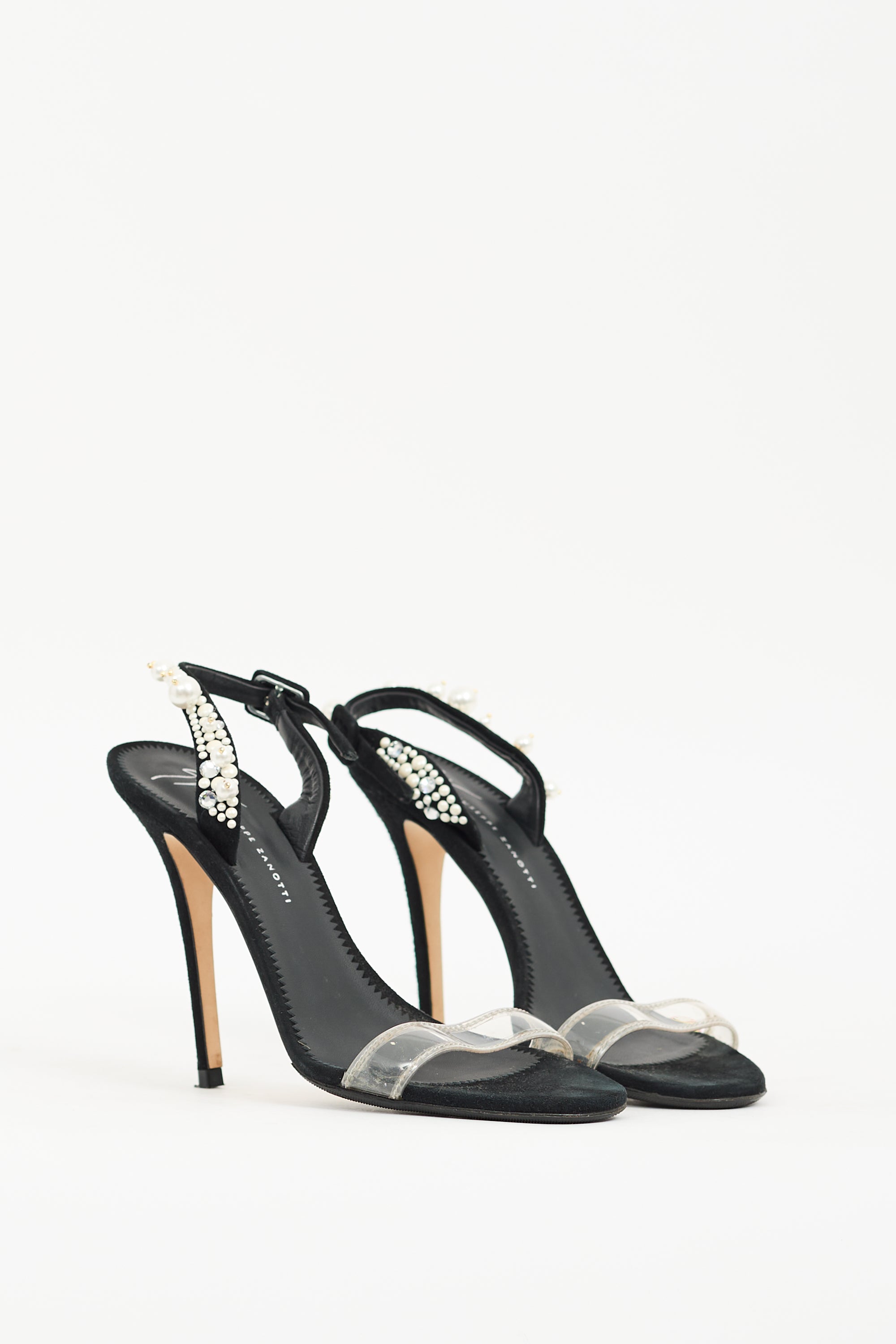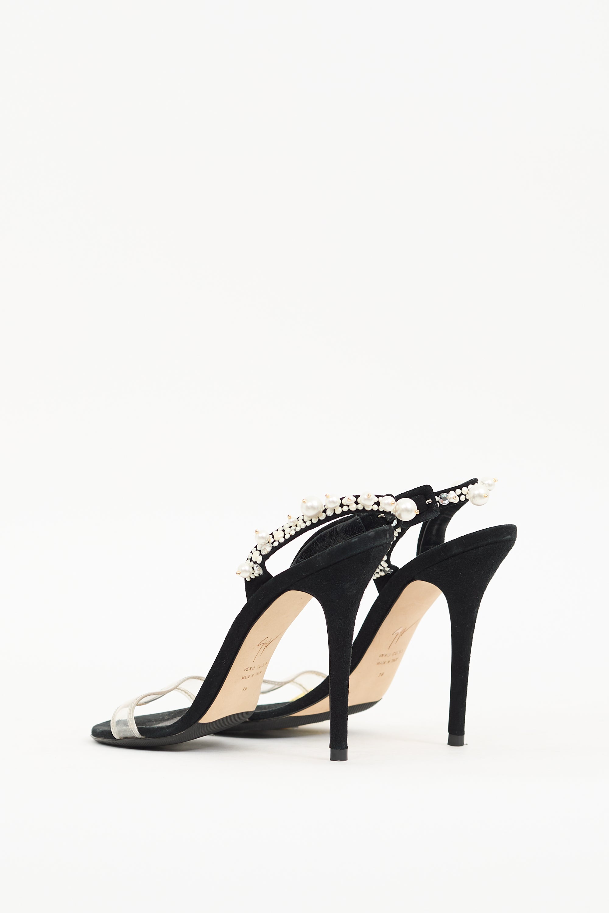 Pre-owned Giuseppe Zanotti black satin sandals featuring open rounded toe, clear PVC strap at vamp, ankle strap with buckle closure and pearl embellishment, and stiletto heel. Comes with original dust bag.